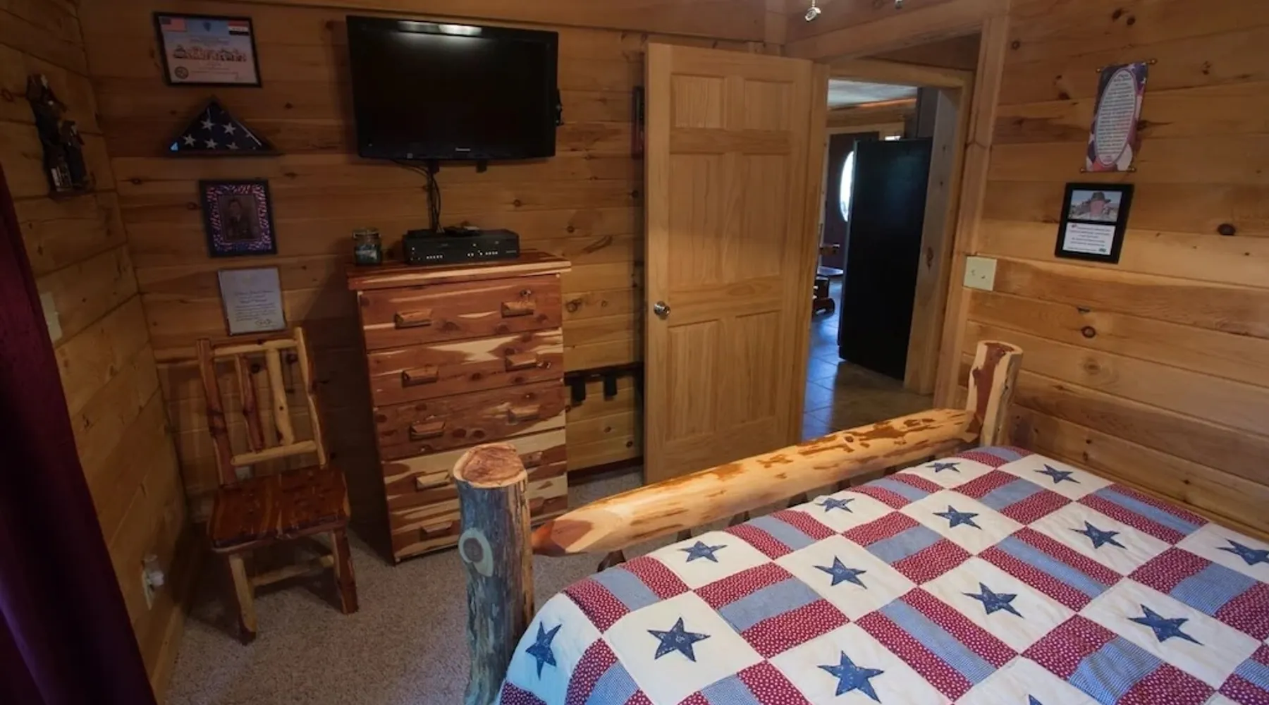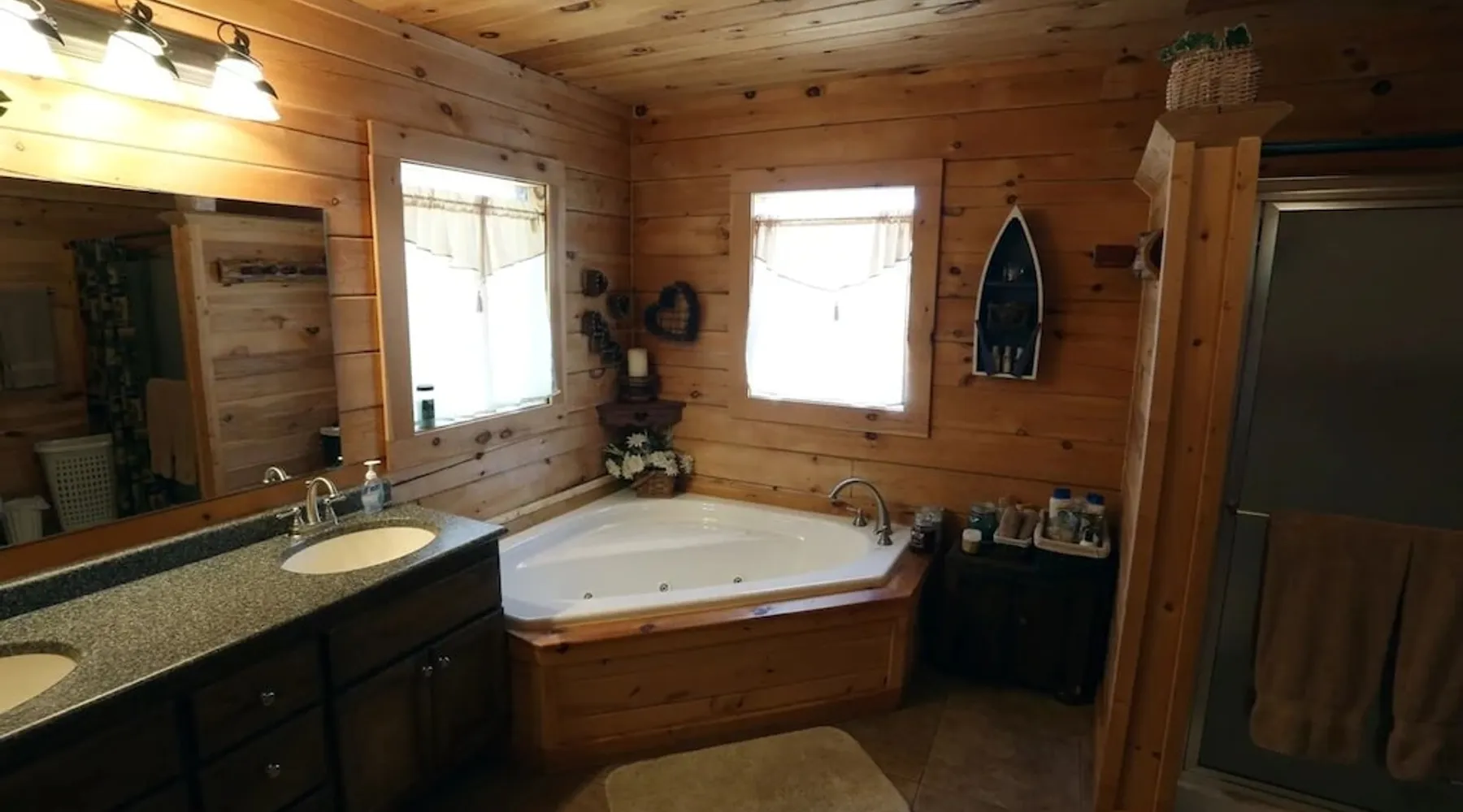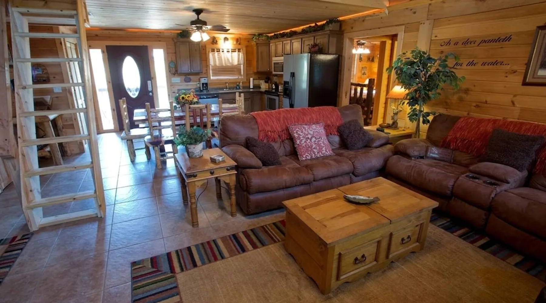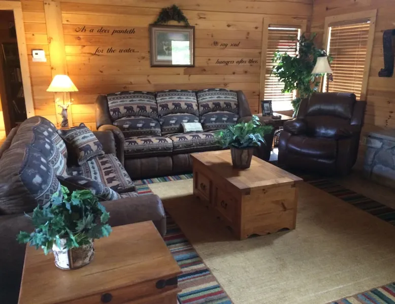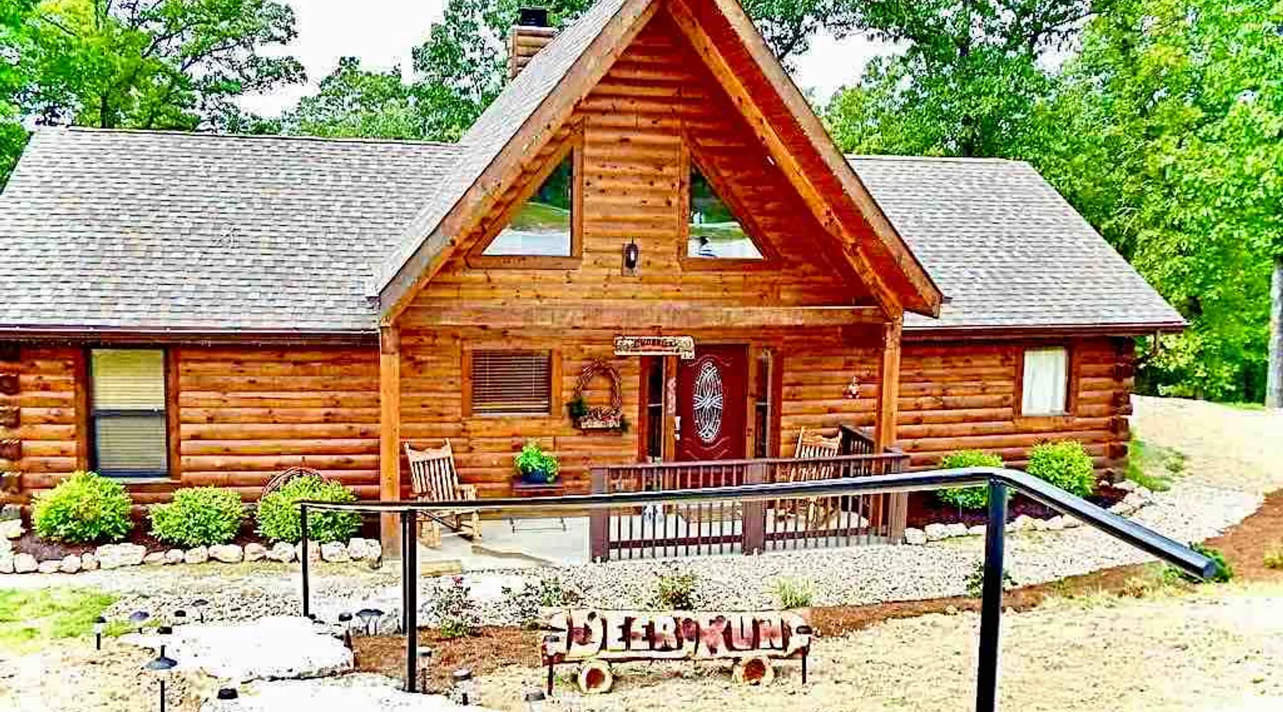 Deer Run is a beautiful log home that is located in a log home neighborhood minutes from Branson and 2 miles from Tablerock Lake. Spectacular, fully equipped Kitchen/Great Room vaulted ceilings, large wood- burning fireplace, and Comfortable living room seating. All 3 bedrooms have TV/DVDs and comfortable log beds. The loft is a favorite with an air hockey table and flat screen TV/DVD. A private 6 person hot tub is on the rear deck.