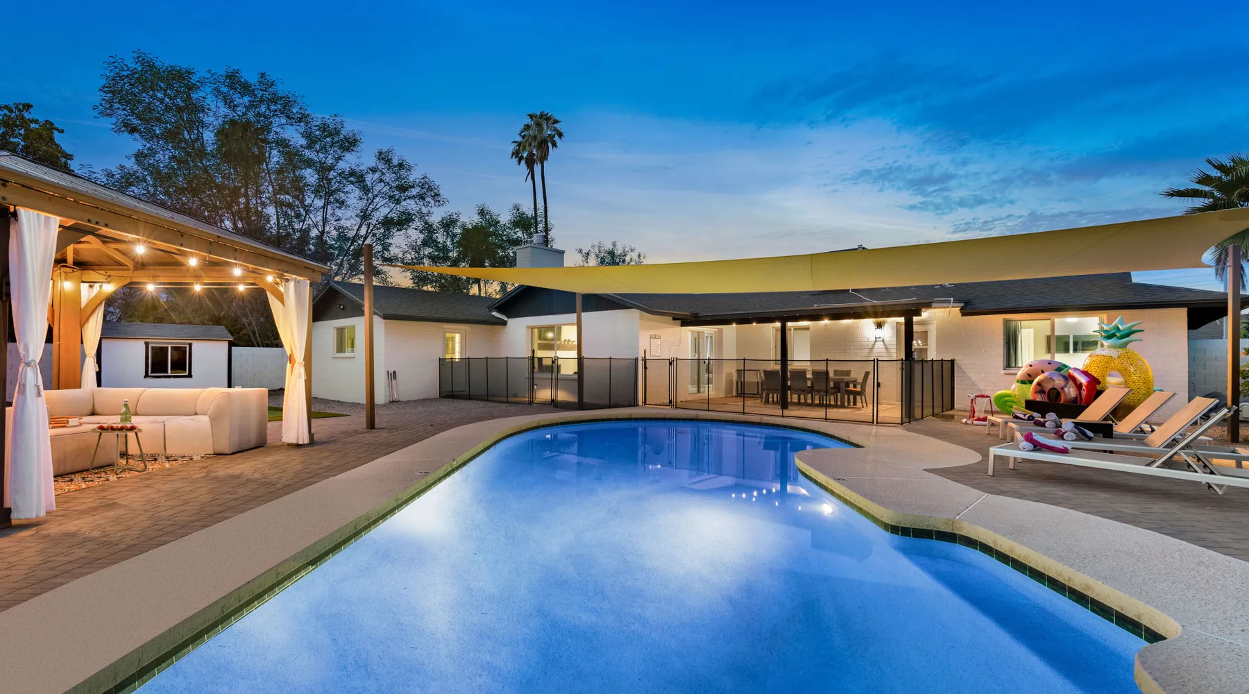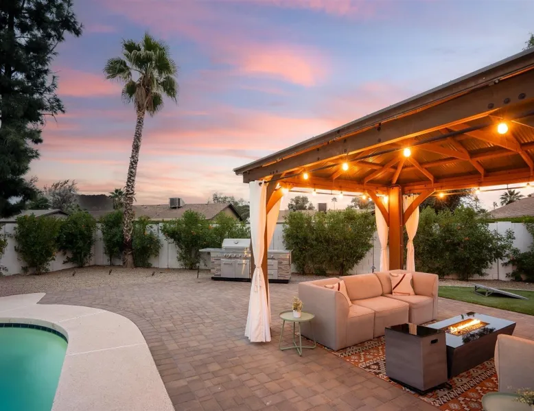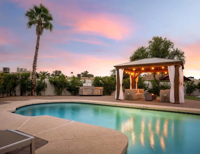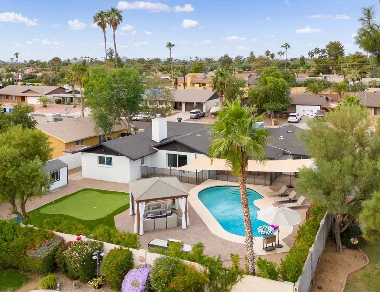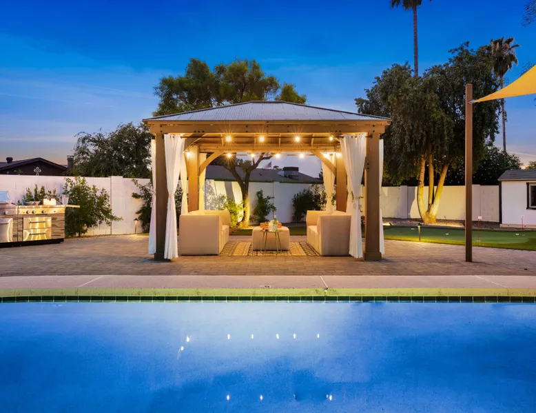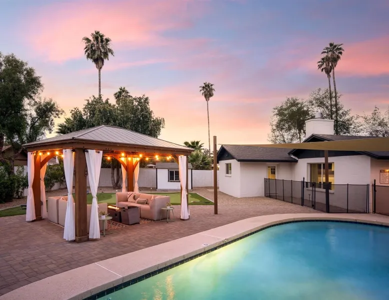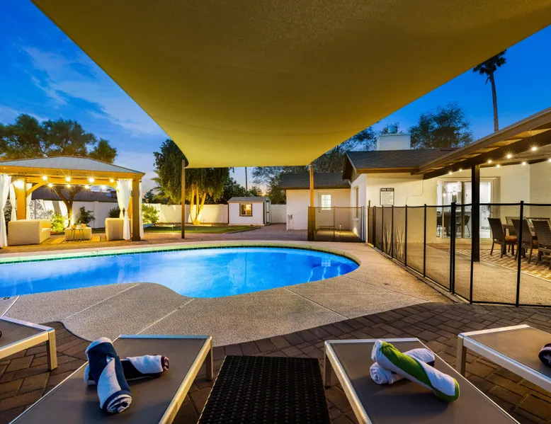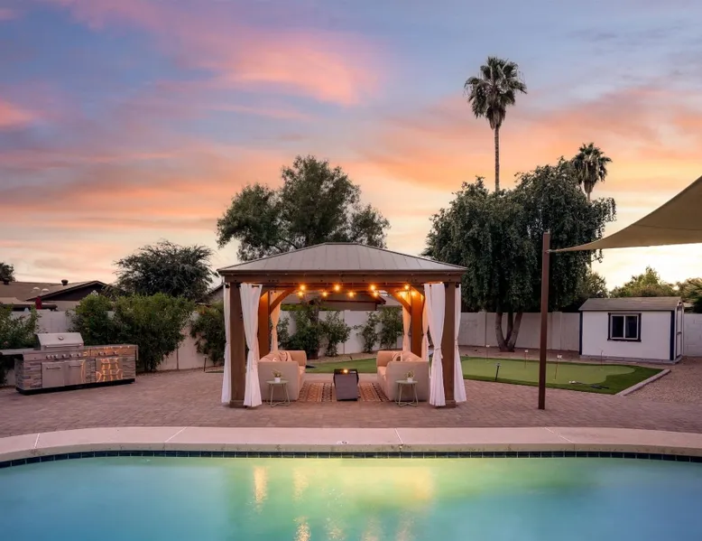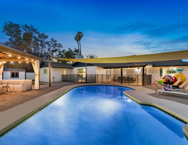 Casa Paradiso: Your Phoenix Oasis Awaits! Modern Comfort Meets Tranquility • Accommodates 10 guests • 5 Bedrooms (2 Master Suites) | 3 Bathrooms Outdoor Bliss • Sparkling Private Pool (Heating: $65/night, Oct-April) • Gazebo w/ Misters & Lighting • Putting Green & Cornhole Fun • 9-Burner BBQ & Firepit (propane provided) • Alfresco Dining under Arizona Skies Fully Equipped Inside • Chef’s Kitchen & Coffee Bar (Nespresso, Tea, Sugar) • Stocked Bar for Your Enjoyment (no alcohol) • Spacious Living Room for Relaxation Prime Location • Close to Dining, Shops, Golf, & Nature • Easy Access to Entertainment & Attractions What to Expect • High-Speed WiFi & Smart Entry System • Child Safety Pool Fence • Laundry Room & Free Parking House Rules Highlights • No parties or smoking ($500 fine applies) • Quiet hours: 10 PM - 8 AM • Registered guests only (max 10) Book Your Slice of Paradise Today! Relax, unwind, and create unforgettable memories at Casa Paradiso!
