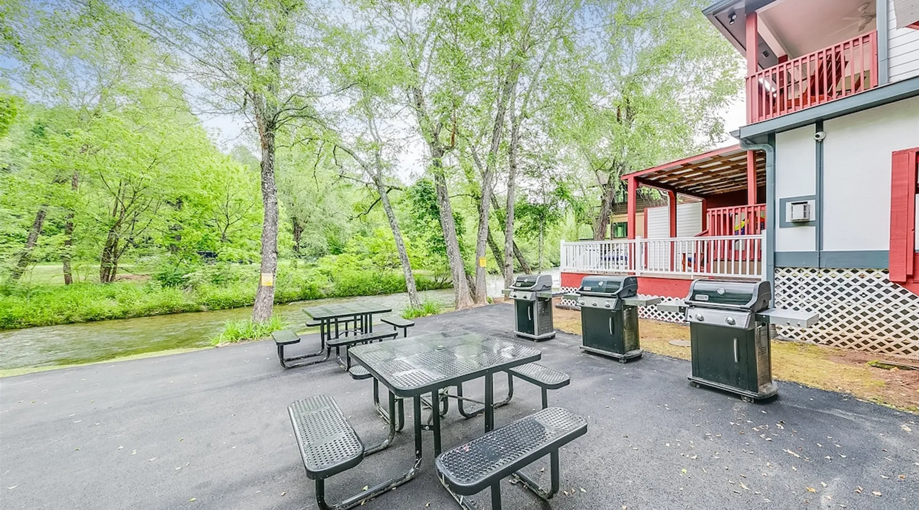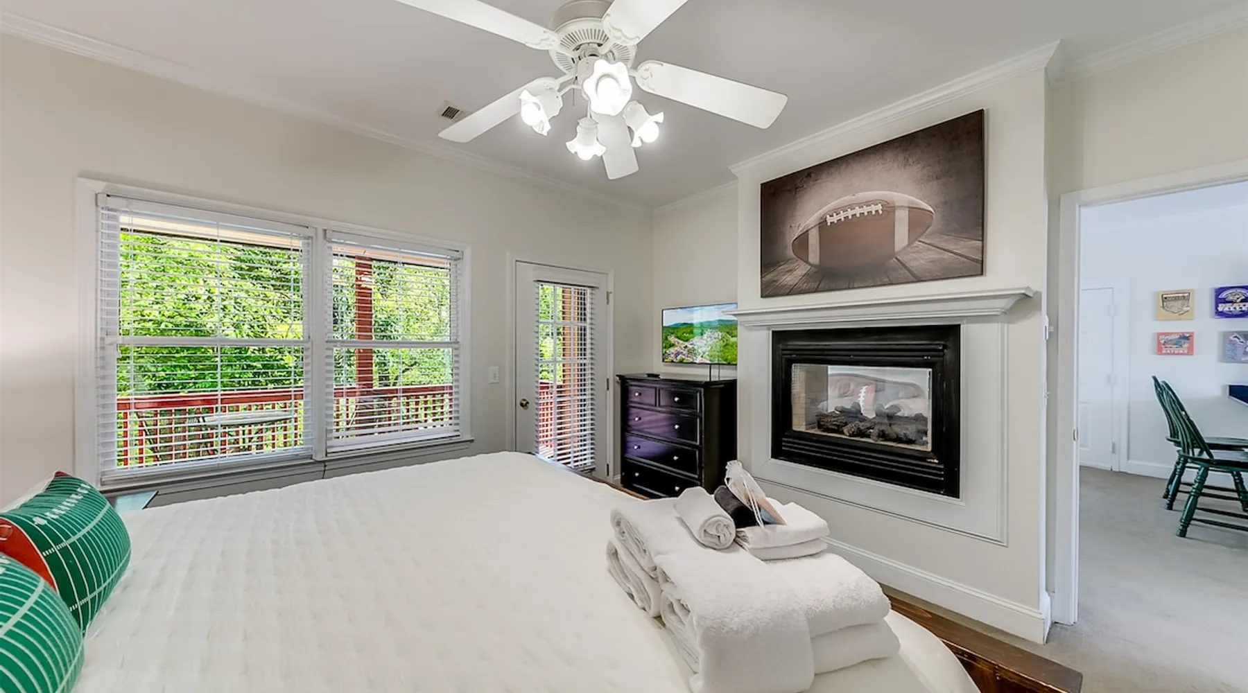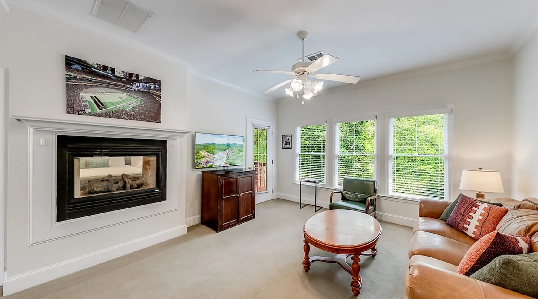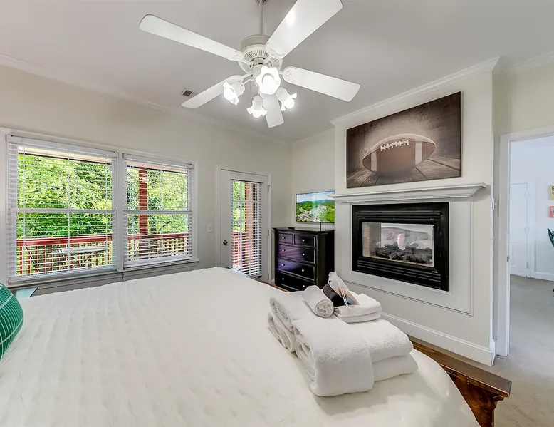 Enjoy this cozy riverside condo minutes away from everything Helen has to offer. You are in the heart of all Helen has to offer. In the summer, you can walk to the access location for the Chattahoochee River Tubing. When you get back from tubing, grab a bite at the North Georgia BBQ on your way back to the condo, or choose from one of the many other restaurants nearby. The space This is it: your perfect Helen vacation spot! Cozy SEC Football themed condo located near downtown Helen overlooking the beautiful Chattahoochee River, you are close to everything at this condo. You can easily walk to Downtown Helen as it's about 1 mile. You are in the heart of all Helen has to offer. In the summer, you can walk to the access location for the Chattahoochee River Tubing. When you get back from tubing, grab a bite at the North Georgia BBQ on your way back to the condo, or choose from one of the many other restaurants nearby. Sit out on the deck and enjoy the peacefulness as you watch the river flowing by. Grill out on the provided grill while you enjoy a glass of wine from one of our local wineries. There is so much to see and do in Helen. For the kids (and adults), there is the Alpine Coaster and several locations to play mini golf. Enjoy strolling the streets of Helen - whatever the season - and do some shopping or grab a funnel cake. Helen is a great location for family fun anytime of year. Come & visit during Oktoberfest where you can try German foods & beer, listen to authentic German music, and have the time of your life. If you prefer to enjoy nature and the more serene side of the area, there are some amazing hiking trails around Helen and outstanding waterfalls: Anna Ruby Falls near Unicoi State Park, Duke Creek Falls, or Raven Cliff Falls. There is something for everyone in Helen; make it your next vacation! Living Room - Double-Sided Fireplace with Gas Logs - Smart TV with Streaming Capability (sign-in with your own accounts) - Leather Couch - Recliner - Views of Chattahoochee River - Easy Access to Deck Kitchen & Dining Area - Essentials Provided - Refrigerator & Freezer - Microwave - Stove & Oven - Dishwasher - Drip Coffee Maker - Coffee Mugs - Glasses - Silverware - Dishware - Toaster - Dining Table Bedroom - King Bed - Double-Sided Fireplace with Gas Logs - Smart TV with Streaming Capability (sign-in with your own accounts) - Dresser - Easy Access to Deck Bathroom - En Suite - Essentials Provided - Stand In Shower - Stacked Washer / Dryer Deck - Overlooks Chattahoochee River - Patio Table - BBQ Grill (shared at the common area by the river) Guest access Guest has access to the entirety of the suite. Other things to note 25+ age requirement for lead guest. No exceptions. This property is not pet-friendly. No exceptions. Digital rental agreement will be required to sign and complete after property is booked. This is a 2nd-level unit. Parking available for 2 vehicles.