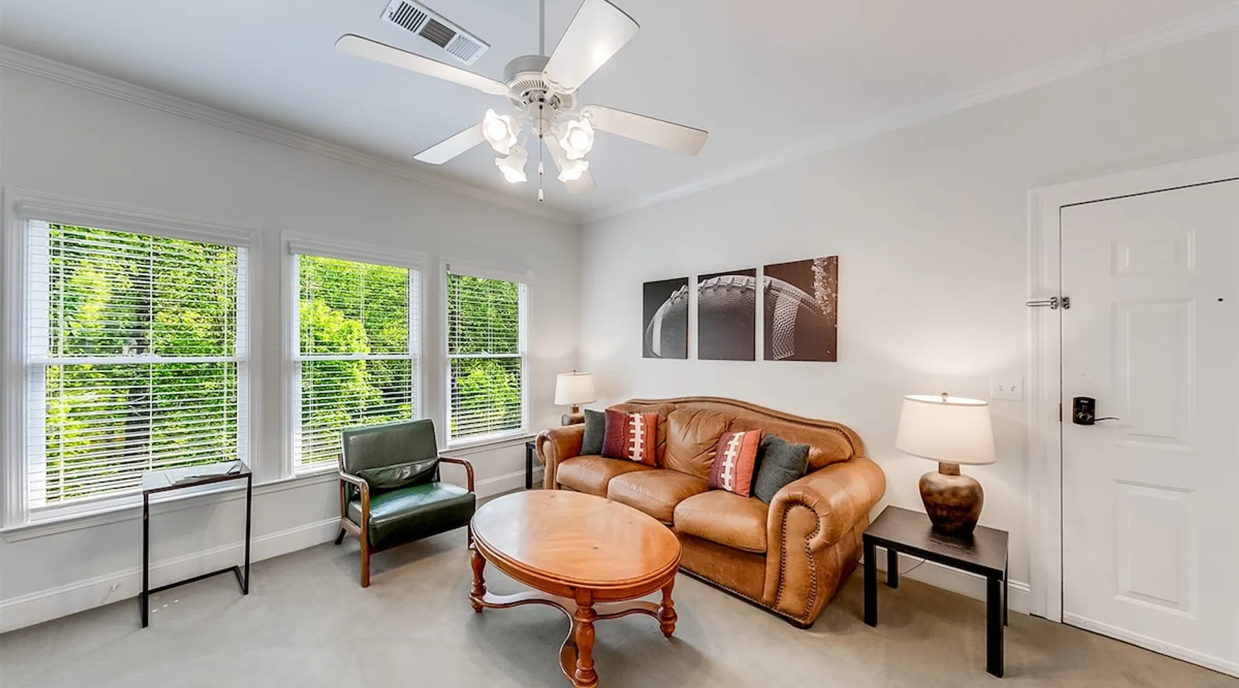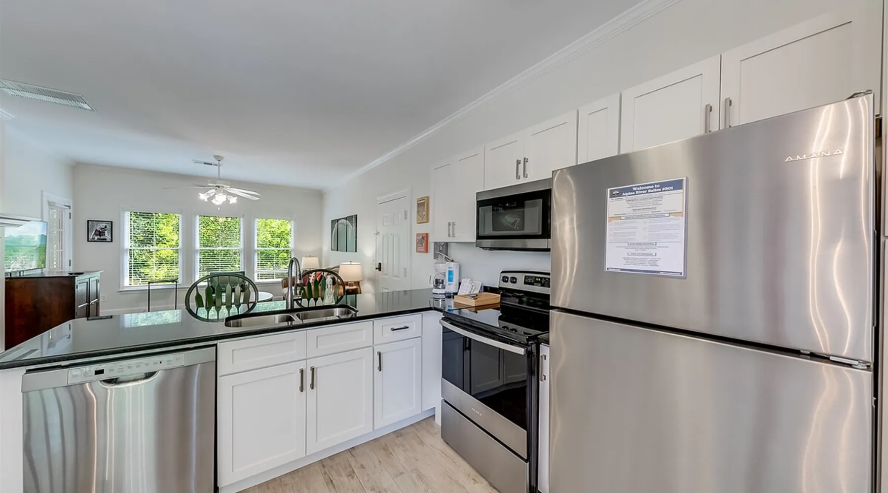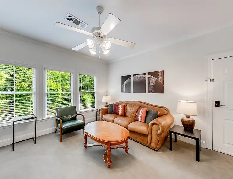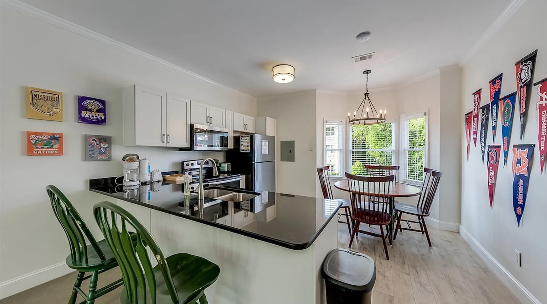Enjoy this cozy riverside condo minutes away from everything Helen has to offer. You are in the heart of all Helen has to offer. In the summer, you can walk to the access location for the Chattahoochee River Tubing. When you get back from tubing, grab a bite at the North Georgia BBQ on your way back to the condo, or choose from one of the many other restaurants nearby. The space This is it: your perfect Helen vacation spot! Cozy SEC Football themed condo located near downtown Helen overlooking the beautiful Chattahoochee River, you are close to everything at this condo. You can easily walk to Downtown Helen as it's about 1 mile. You are in the heart of all Helen has to offer. In the summer, you can walk to the access location for the Chattahoochee River Tubing. When you get back from tubing, grab a bite at the North Georgia BBQ on your way back to the condo, or choose from one of the many other restaurants nearby. Sit out on the deck and enjoy the peacefulness as you watch the river flowing by. Grill out on the provided grill while you enjoy a glass of wine from one of our local wineries. There is so much to see and do in Helen. For the kids (and adults), there is the Alpine Coaster and several locations to play mini golf. Enjoy strolling the streets of Helen - whatever the season - and do some shopping or grab a funnel cake. Helen is a great location for family fun anytime of year. Come & visit during Oktoberfest where you can try German foods & beer, listen to authentic German music, and have the time of your life. If you prefer to enjoy nature and the more serene side of the area, there are some amazing hiking trails around Helen and outstanding waterfalls: Anna Ruby Falls near Unicoi State Park, Duke Creek Falls, or Raven Cliff Falls. There is something for everyone in Helen; make it your next vacation! Living Room - Double-Sided Fireplace with Gas Logs - Smart TV with Streaming Capability (sign-in with your own accounts) - Leather Couch - Recliner - Views of Chattahoochee River - Easy Access to Deck Kitchen & Dining Area - Essentials Provided - Refrigerator & Freezer - Microwave - Stove & Oven - Dishwasher - Drip Coffee Maker - Coffee Mugs - Glasses - Silverware - Dishware - Toaster - Dining Table Bedroom - King Bed - Double-Sided Fireplace with Gas Logs - Smart TV with Streaming Capability (sign-in with your own accounts) - Dresser - Easy Access to Deck Bathroom - En Suite - Essentials Provided - Stand In Shower - Stacked Washer / Dryer Deck - Overlooks Chattahoochee River - Patio Table - BBQ Grill (shared at the common area by the river) Guest access Guest has access to the entirety of the suite. Other things to note 25+ age requirement for lead guest. No exceptions. This property is not pet-friendly. No exceptions. Digital rental agreement will be required to sign and complete after property is booked. This is a 2nd-level unit. Parking available for 2 vehicles.