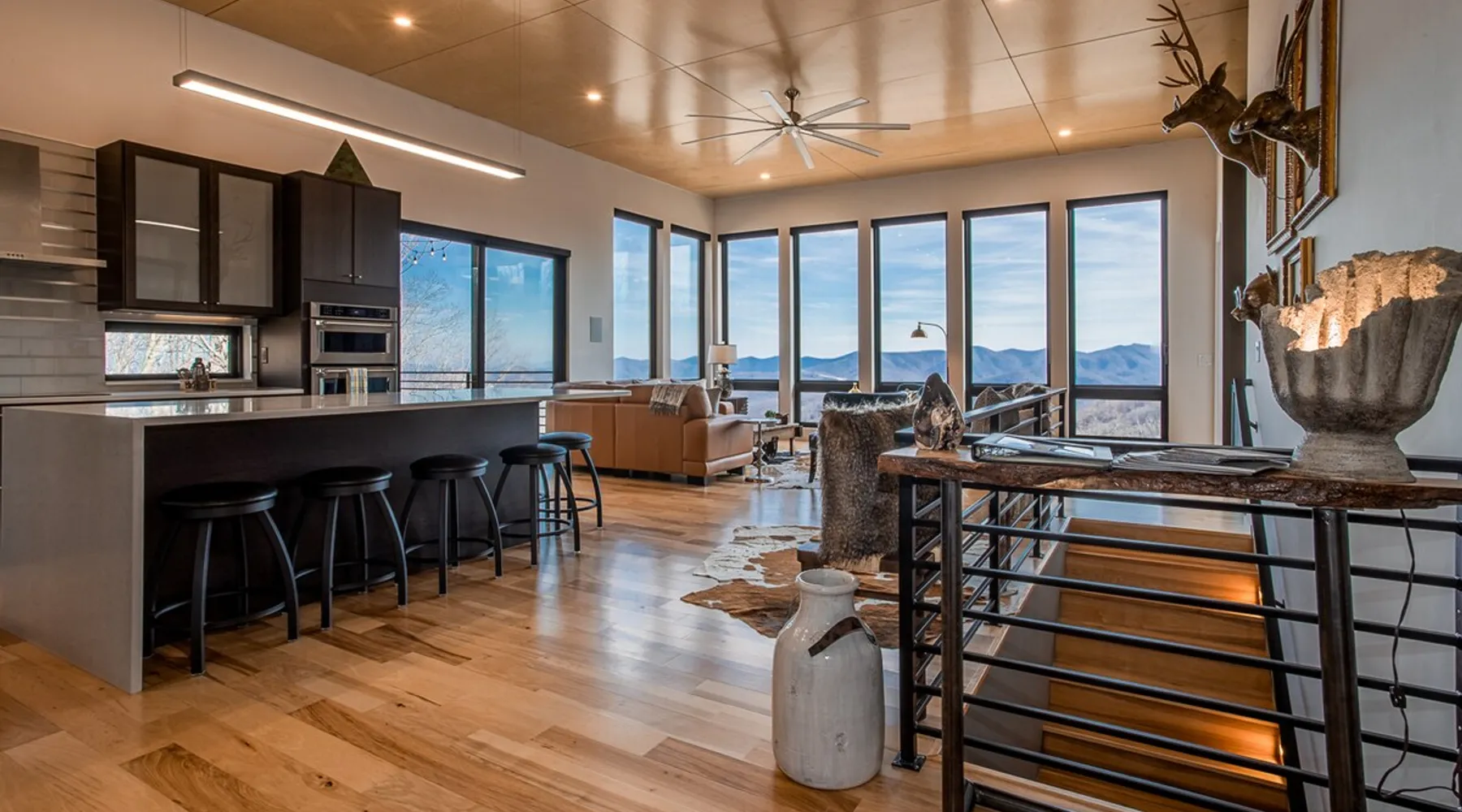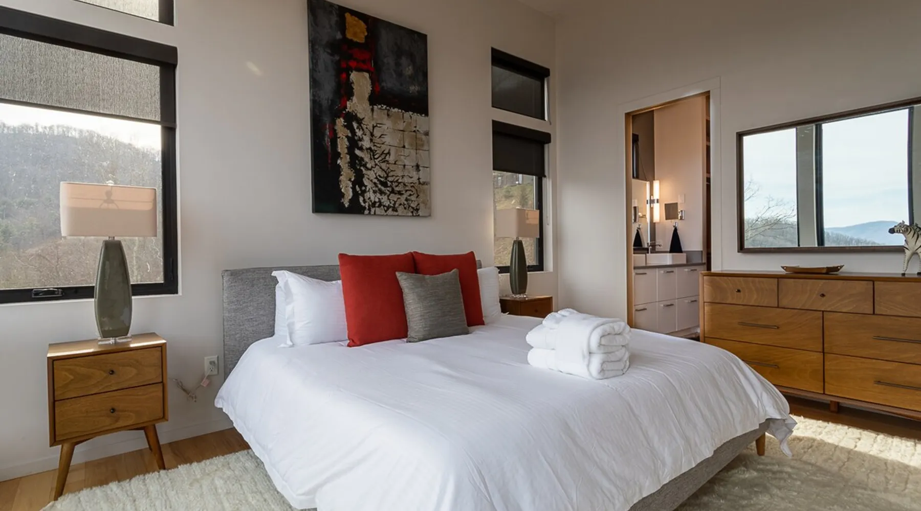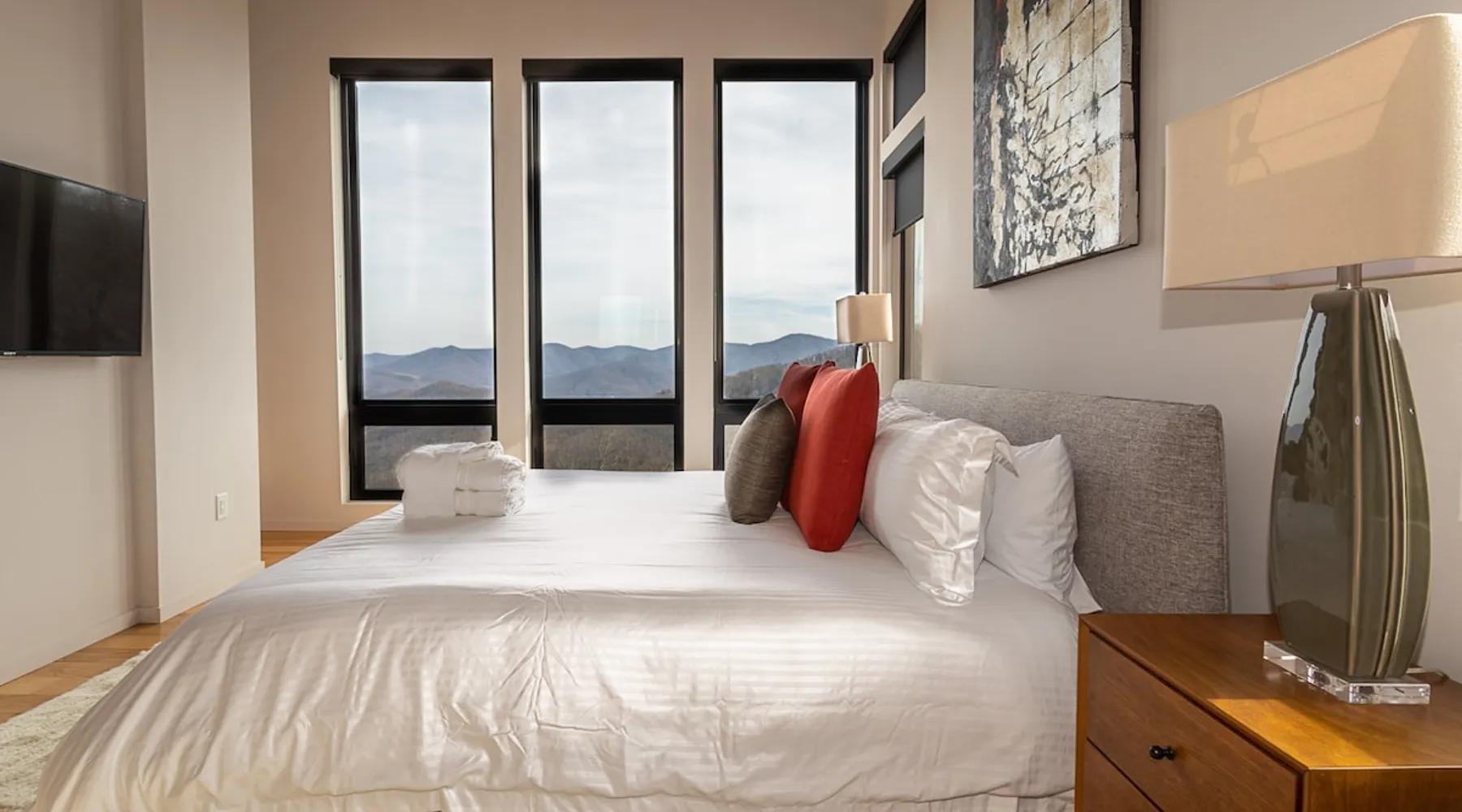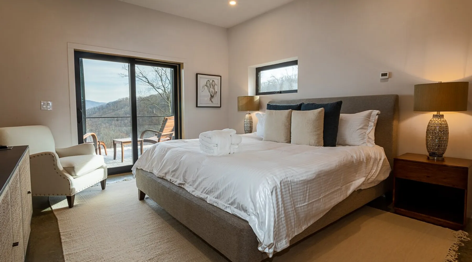 Introducing Blissful Bluff! This home is pristine and exudes modern architectural beauty. From the moment you walk in, the openness and the breathtaking mountain views will have you in awe! And it’s located only about 15 minutes from West Asheville! The space The beautiful wood floors and a kitchen equipped with high end finishes will have you wanting for nothing as you prepare your favorite dishes. With interiors that were decorated and designed by an internationally published designer Anil Kakar of Kakar House of Design , the main level living room is open and comfortable with a large TV and Wi-Fi throughout. Relax on the patio lounge area where you can relax and soak in the ever-changing views. With a main level ensuite bedroom and 2 more guest rooms on the lower level, you’ll have plenty of room for everyone. Each bedroom feels like a luxury hotel suite. You’ll wake up with breathtaking views each morning. And there’s plenty of outdoor dining and relaxing on two separate large outdoor balconies where you can sit and lounge, have your morning coffee or your evening cocktails while enjoying the magnificent view of the Blue Ridge Mountains. In addition to the rejuvenating privacy at Blissful Bluff, you're an easy drive to many popular activities and destinations: Rivers Arts District - The Asheville breweries, restaurants and the vibrant art scene Blue Ridge Parkway - Take a relaxing car ride on and pull off on one of the many trailheads for a hike on the mountain to sea trail Pisgah Inn - While on the Blue Ridge Parkway, you're only a couple of miles away from a fabulous spot for lunch Zen Tubing - Have a lazy float down the magnificent French Broad River in the summer Bent Creek Experimental Forest - For miles and miles of hiking or biking on single track or service road options with a pristine mountain lake to cool off in and is connected to the NC Arboretum Dupont Recreational State Forest - Multiple waterfalls that are enjoyed by an easy hike This home has significant privacy if you are looking for tranquility while sitting on your deck and taking in the amazing views, look no further! Exclusive Special: When you book Blissful Bluff you will receive a special code for discounted tickets to the Biltmore Estate! Contact us for more info. Home Truths: - Sleeps in beds: 6 - Max Occupancy: 8 - 2 Covered Parking spaces and room for 3 additional spaces - We provide linens for all beds; other occupancy will require guests providing their own linens - Internet Speed: Download - 25 Mbps, Upload - 3 Mbps - A full house generator for piece of mind We openly share our Cleaning Fees in a manner of full disclosure, as we think this is the most honest and forthright approach with respect to our guests. Our Cleaning Fees are backed by our Clean Guarantee, which reflects the highest level of standards, pristine environments for our guests, and a level of clean that surpasses any other vacation homes; we literally guarantee it! Quiet Policy: Please note that the home/estate property is located in a very private and quiet gated community. Parties, loud noise and unruly behavior are absolutely prohibited, and guests are expected to respect the neighbors and the peace this mountain retreat area affords. Pets: This home and property are very dog-friendly, and guests are welcome to bring their "best friends" with them. There is a non-refundable Pet Fee of $130 with a limit of 2 dogs per booking party. Early check-in and/or Late check-out may be possible, depending on cleaning schedules and other reservations. If possible, an additional fee may be applicable, determined by the time you wish to check in or out and the seasonal rates. Please inquire for details regarding payment, the cancellation policy, military discounts, and trip insurance. Note: Reservations over 30 days are subject to review before acceptance. A separate rental agreement will be required for 90+ day stays. Last Minute Bookings: Reservations made within 7 days of check-in require additional documentation before confirmation.
