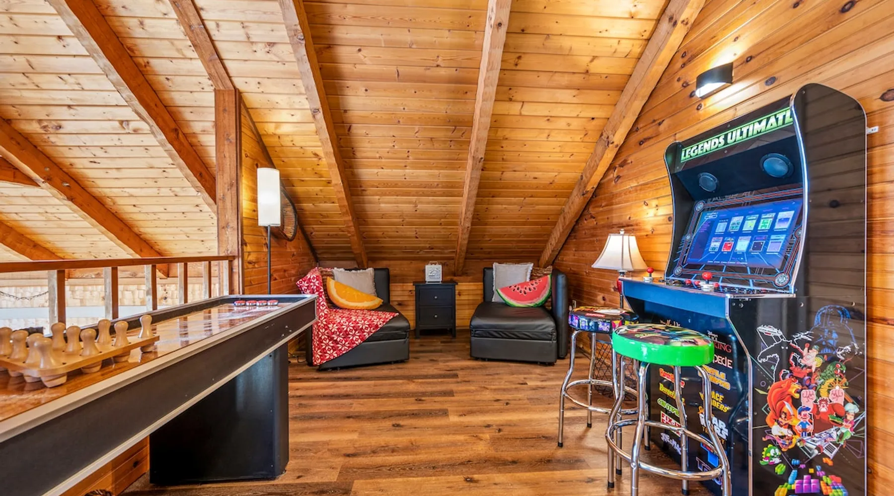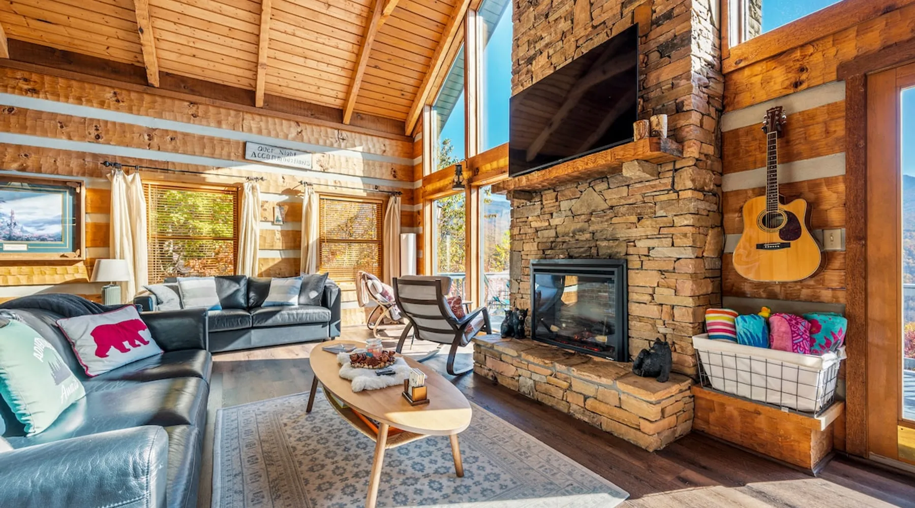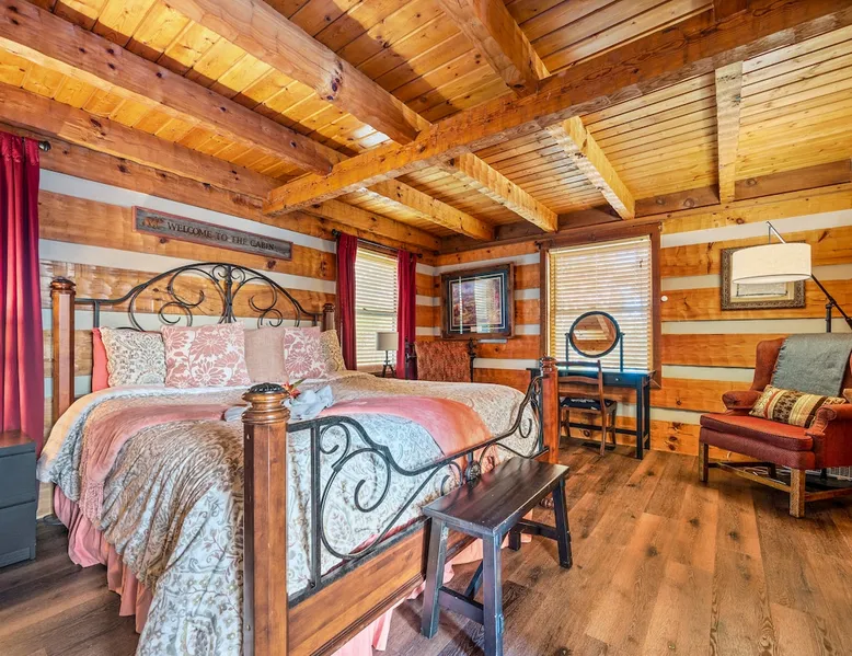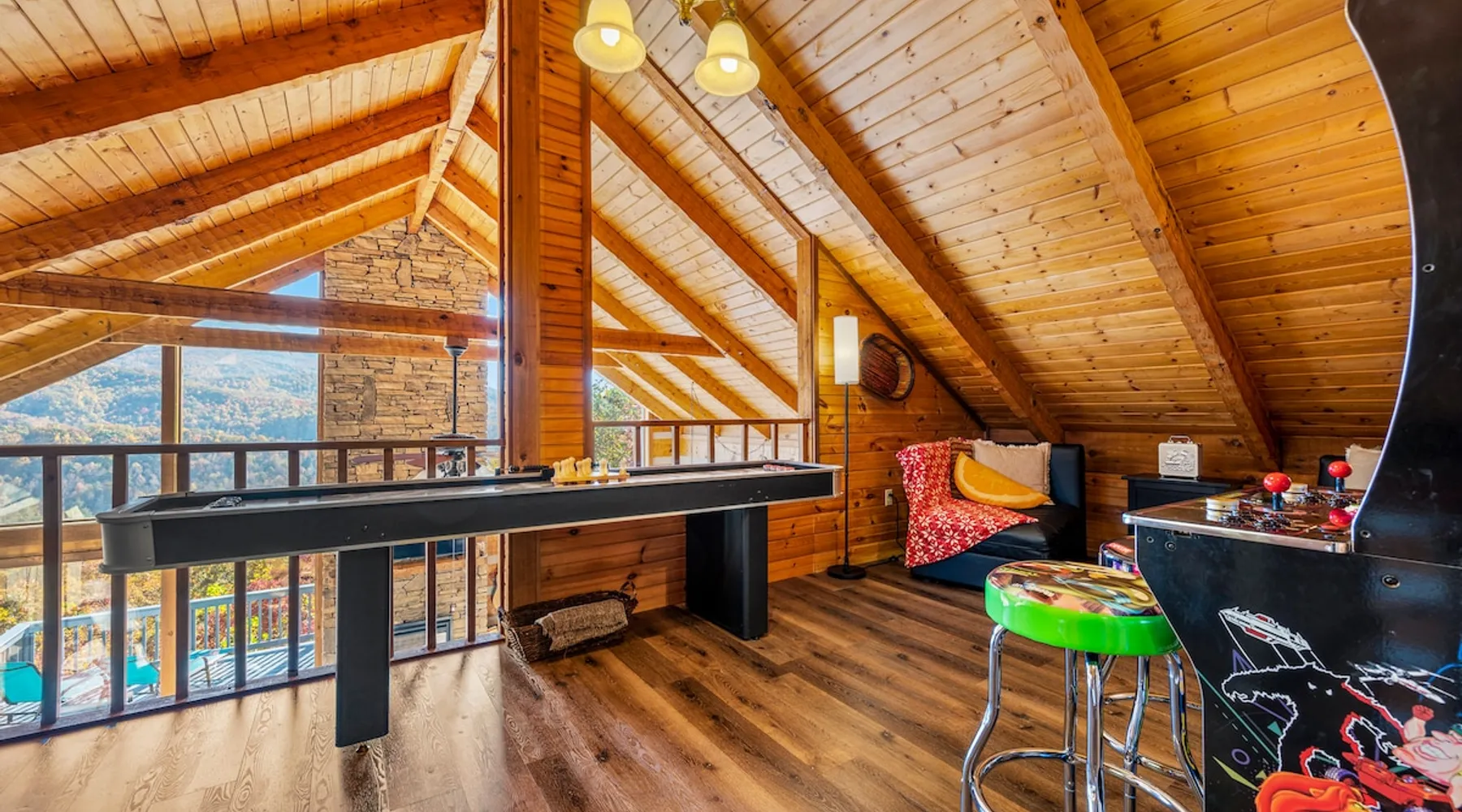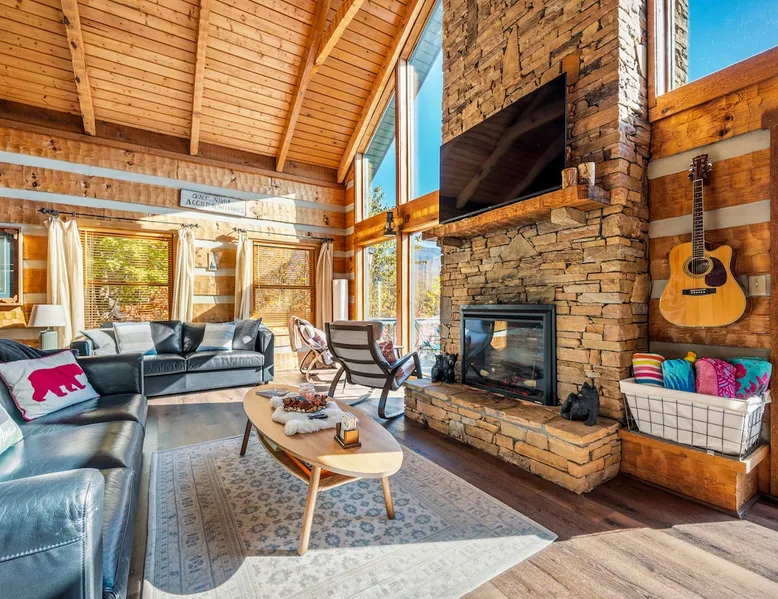 Escape the noise of Gatlinburg and find yourself relaxing on the deck at Barenberg Cabin, an updated 2BR/2.5BA dual-suite retreat. 10 miles from Gatlinburg and 20 miles to Pigeon Forge/Dollywood, enjoy it all without all the traffic. During the day savor the uninterrupted views of The Great Smoky Mountains. Dine al fresco while watching the sun sink behind the mountains and then retreat to the hot tub and soak while staring at the brilliant stars shining above. Catch a view of the local bears!. The space Barenberg's amenities include a private hot tub, game area, and awe-inspiring Smoky Mountain views. High speed internet up to 600 mbps allows you to work remotely with video conference calls. Extra perks include a sleek kitchen, Great Room and smart TVs in the suites. The game area offers shuffleboard, a 500+ multi-game arcade, several of your favorite board games and puzzles. Guest access Cobbly Nob is a secured community with 24/7 security. Parking is limited to three cars and no street parking is allowed. The road to the cabin has 2 switchbacks on paved road. No RVs are allowed. Other things to note Sleeping: There are two dual master suites (1 king, 1 queen), each with its own full bathroom. For additional sleeping beds, there is a pull-out queen size sofa in the living room and 2 pull-out twin size beds in the loft area that you can combine them together becoming a queen size bed.