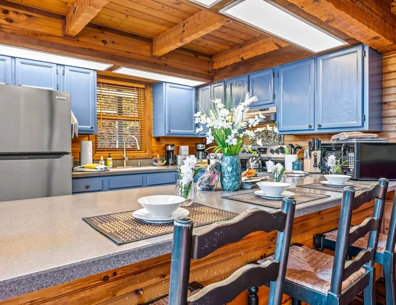 Escape the noise of Gatlinburg and find yourself relaxing on the deck at Barenberg Cabin, an updated 2BR/2.5BA dual-suite retreat. 10 miles from Gatlinburg and 20 miles to Pigeon Forge/Dollywood, enjoy it all without all the traffic. During the day savor the uninterrupted views of The Great Smoky Mountains. Dine al fresco while watching the sun sink behind the mountains and then retreat to the hot tub and soak while staring at the brilliant stars shining above. Catch a view of the local bears! The space Barenberg's amenities include a private hot tub, game area, and awe-inspiring Smoky Mountain views. High speed internet up to 600 mbps allows you to work remotely with video conference calls. Extra perks include a sleek kitchen, Great Room and smart TVs in the suites. The game area offers shuffleboard, a 500+ multi-game arcade, several of your favorite board games and puzzles. Guest access Cobbly Nob is a secured community with 24/7 security. Parking is limited to three cars and no street parking is allowed. The road to the cabin has 2 switchbacks on paved road. No RVs are allowed. Other things to note Sleeping: There are two dual master suites (1 king, 1 queen), each with its own full bathroom. For additional sleeping beds, there is a pull-out queen size sofa in the living room and 2 pull-out twin size beds in the loft area that you can combine them together becoming a queen size bed.