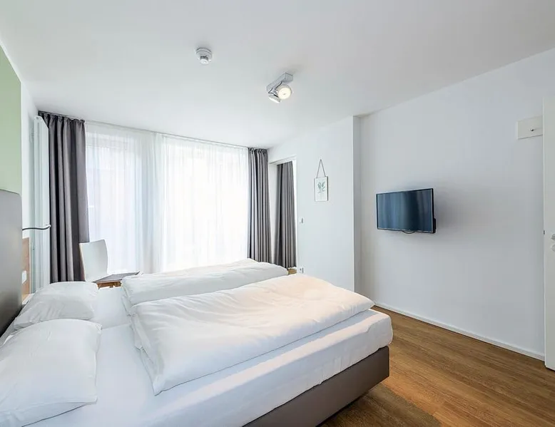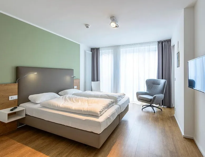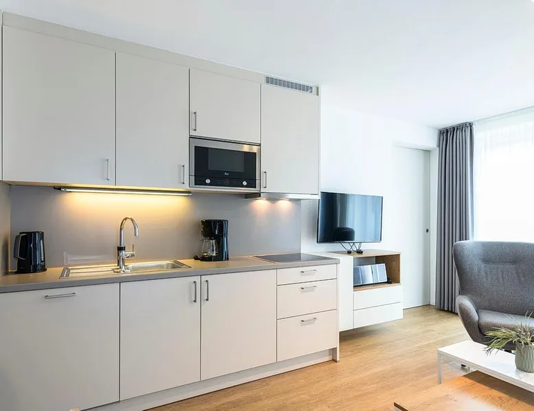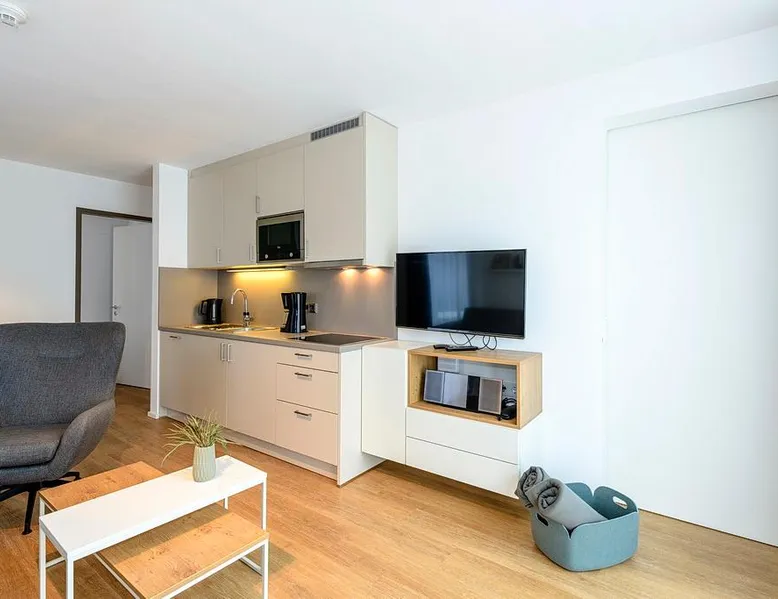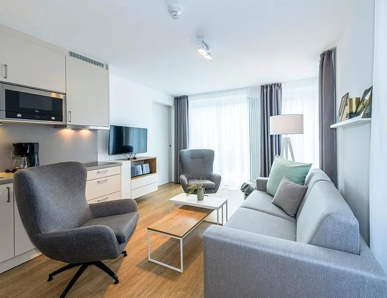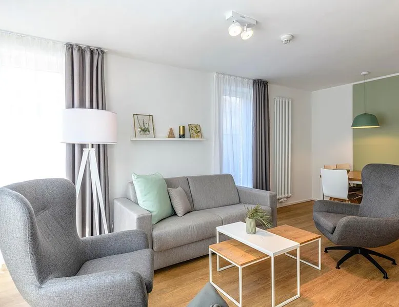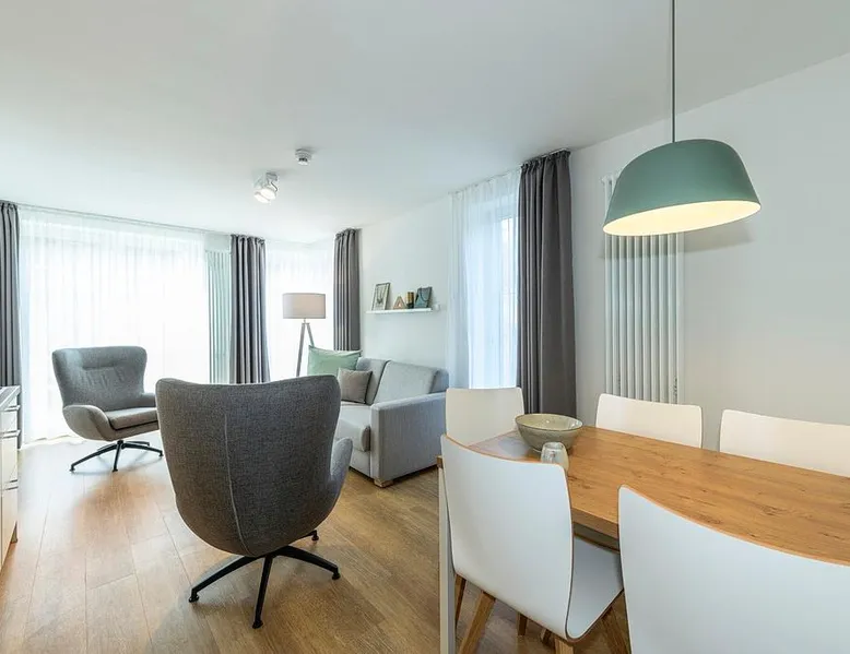 Top apartment with terrace and sauna area in the house - only 300m to the island beach! Other things to note The 67 m² large and accessible 3-room apartment is suitable for up to 4 people. Particularly noteworthy is the terrace with its own green space in a north-west location. Here you can enjoy the sun and the North Sea climate until the evening. Location The modern and bright holiday home is located in a north-west location on the ground floor of the apartment villa Anna See, in the Langeoog town center, on Barkhausenstraße. The expansive sandy beach and promenade are just 300 meters away. In the immediate vicinity you will find numerous shopping opportunities, restaurants and cafes as well as leisure activities such as the popular seawater adventure pool, golf club and kitesurfing school. The amenities This non-smoking apartment features free wi fi. The living area offers a fully equipped open kitchenette with dishwasher, freezer, coffee machine, toaster, electric kettle and microwave with grill function as well as a large flat-screen TV with CD player and radio. The apartment has a dining table and a cozy seating area. There is a double bed in the two separate bedrooms. One of the bedrooms also has a second flat-screen TV. A cot can be placed for a fee. In the stylish bathroom, there is a large walk-in shower, bath and washbasin with hair dryer and cosmetic mirror. After a relaxing day of vacation, you can relax wonderfully on the private terrace with its own small garden Features The in-house sauna area on the ground floor of the complex has a Finnish sauna, a soft sauna, a relaxation room and foot pool and is at your disposal daily during the opening time. Bathrobes and sauna towels are available at the reception for a small rental fee. Please note that this apartment is a non-smoking apartment. Pets are very welcome. Apartmentvilla has an elevator as well as coin-operated washing machines and dryers. Bicycle parking spaces and charging stations for e-bikes are available free of charge in the outdoor area of the complex.