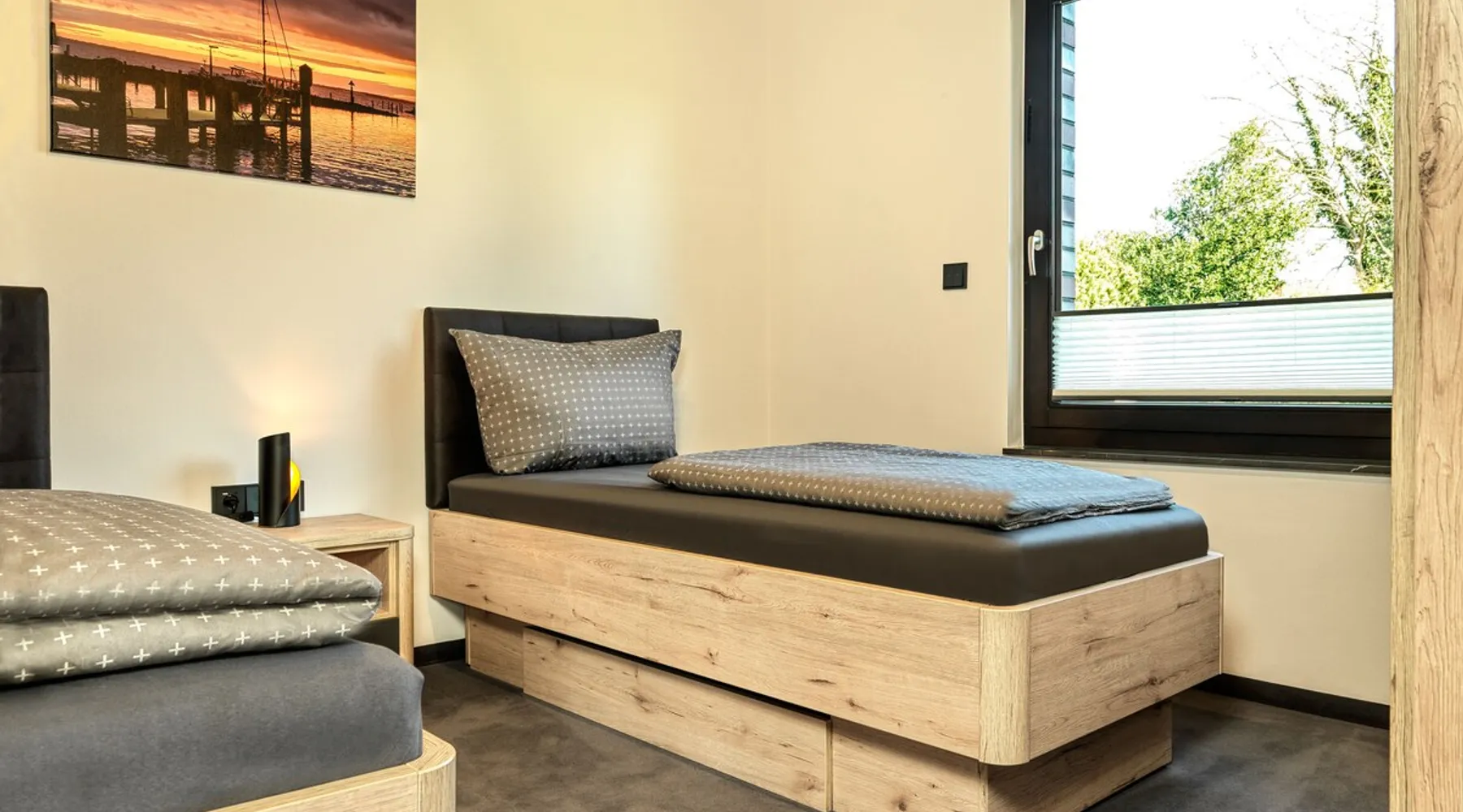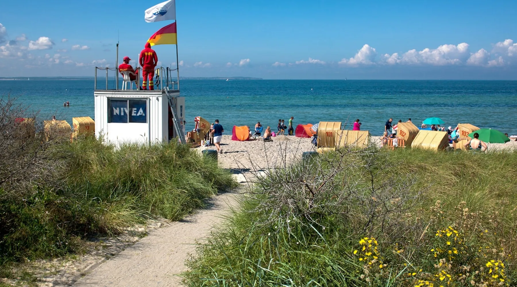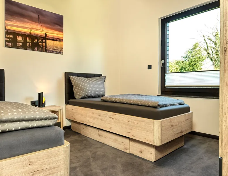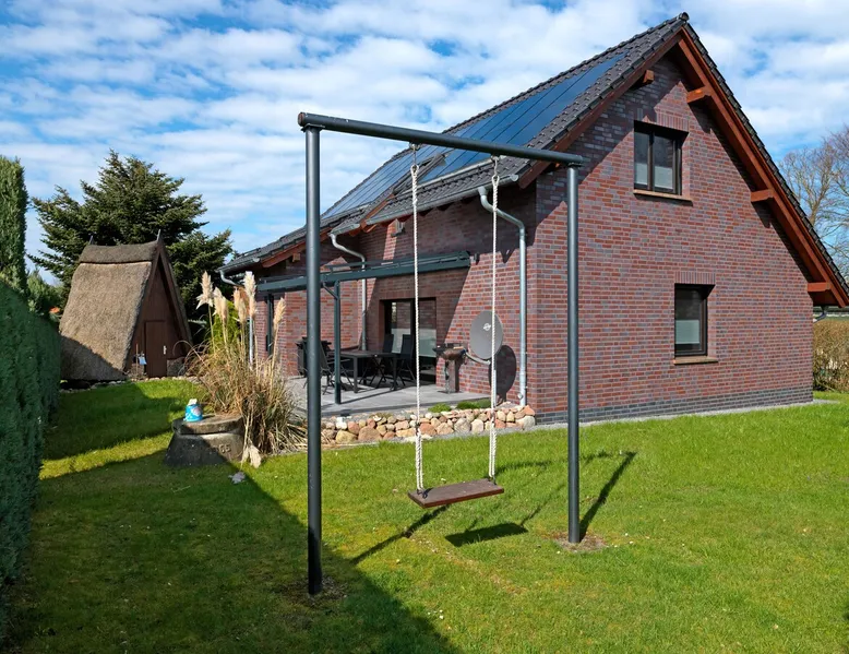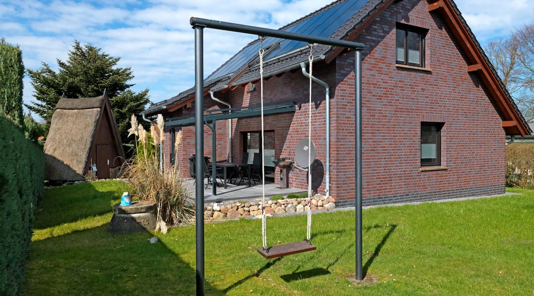 Far away from the hustle and bustle, you can enjoy the peace and quiet and are still close to the harbor with a sandy beach (approx. 500 m away). Other things to note Take a dream vacation with up to 4 people in this house, newly renovated in 2022, close to the beach! The large living area with a beautiful dining area and couch corner as well as TV makes your vacation something special. This area particularly invites families with children to spend time together. Board games are available. A bedroom with two single beds for two people, a bathroom with a large shower and toilet, a fully equipped kitchen with microwave/oven/ceramic hob/dishwasher and fridge-freezer awaits you on the ground floor. On the upper floor there is a bedroom with a double bed, a bathroom with a bathtub and a spacious living room with a comfortable seating area with TV/DVD and free Netflix. There is also a desk with an internet connection. The covered terrace with garden furniture, grill, swing and view of the greenery invites you to read, grill or play around. Children's travel cot and high chair are available in the house for our little guests. The use of washing machines and dryers can be booked for an additional charge of €2.50 per night. Free Wi-Fi is available throughout the house. No Smoking!!! Pets not allowed for allergy reasons! Up to two cars can park in a row on the driveway. There is also a charging station for electric vehicles. We look forward to your booking and to welcoming you to Haus Muschelperle!