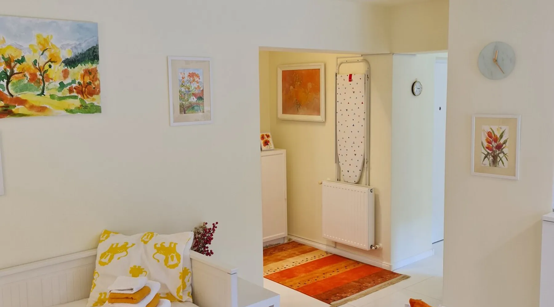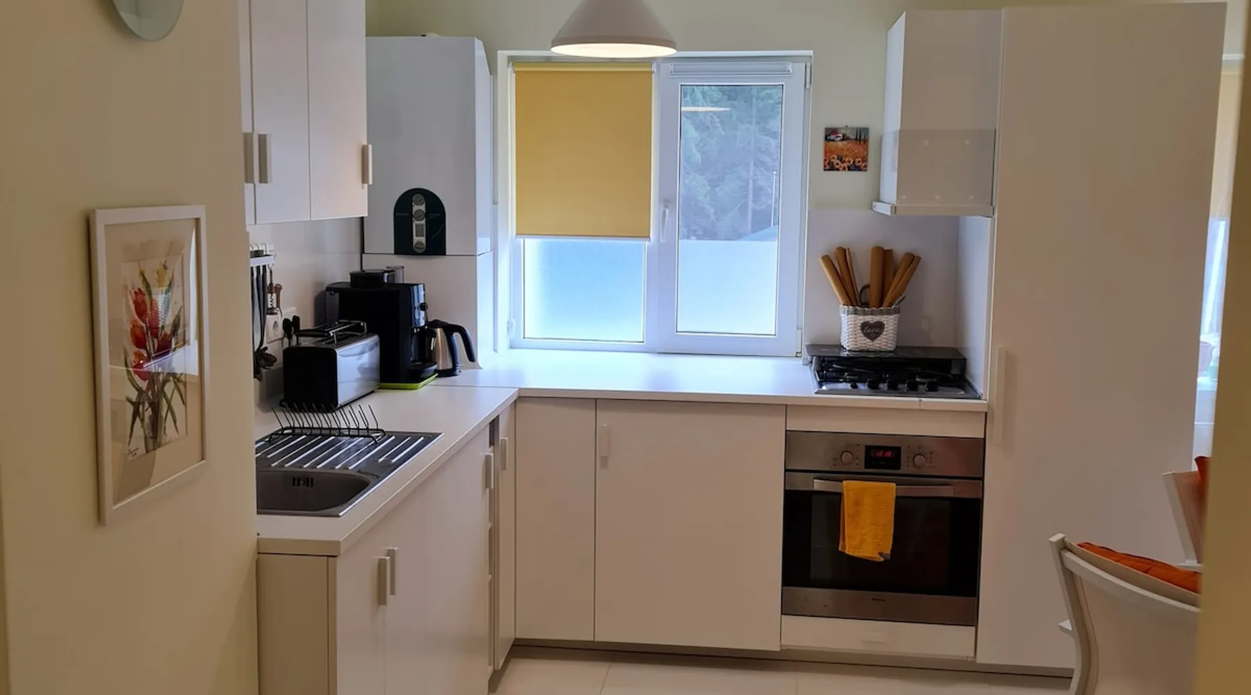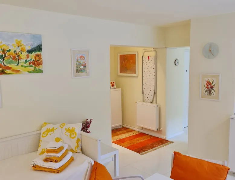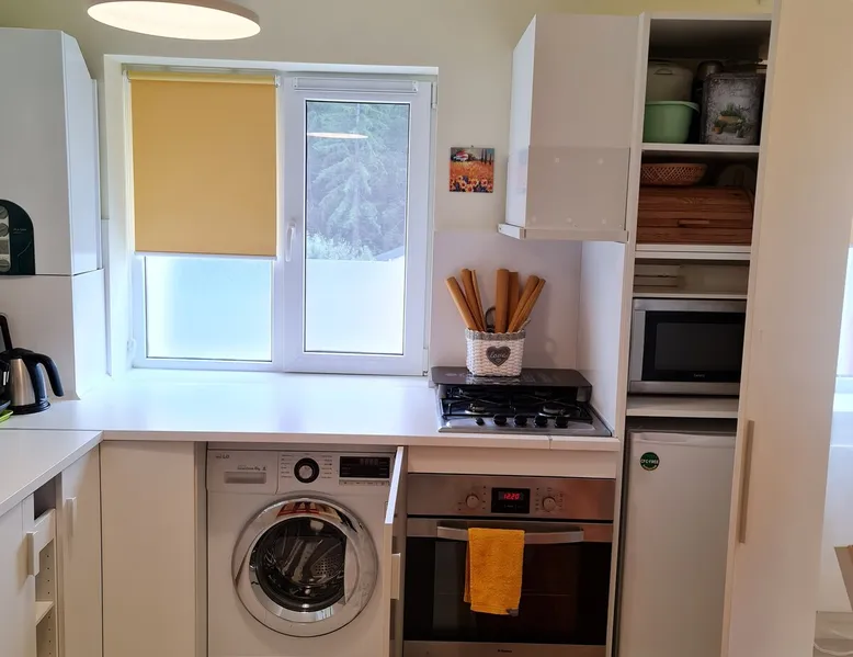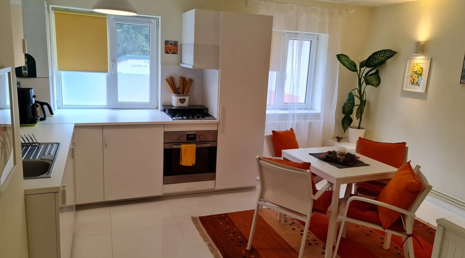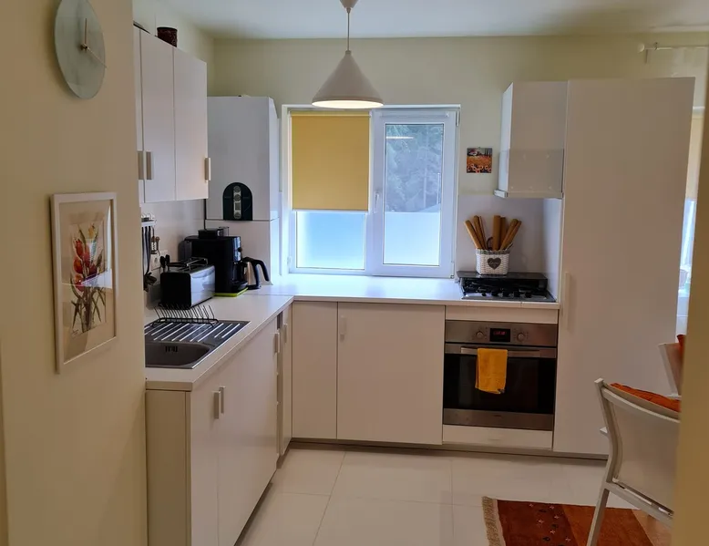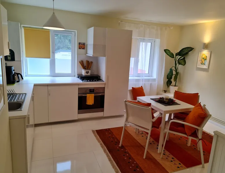 The apartment is located at the foot of the Bucegi Mountains, the immediate vicinity of Hotel Silva (50m) and the Busteni cable car (100m). The location is quiet, welcoming and offers you a gorgeous view to Bucegi Mountains. Spacious, consisting of a living room , bedroom, one bathroom, office area, hallway, sofa bed , fully equipped kitchen with dishwasher and laundry machine. Ideal for families (and with kids), tourists who want to feel at home, young people,couples or for a mountain getaway. The space The white apartment is where we hope you can feel at home. It is located a stone's throw from the cable car in Busteni and the Silva Hotel, overlooking the sun, the creek, the forest and the mountain. Perfectly soundproofed and thermally insulated, with its own boiler and thermoregulation, it has opaque blinds in sleeping areas and smart lock, with temporary custom code for each guest. Besides the complete facilities, the white apartment is arranged in Scandinavian style, with straw-colored walls and contrasting color spots in tones of solar yellow, orange and pale pink. The paintings are original, signed, in watercolor, acrylic or oil and benefit from warm led lighting. Carpets are made of short, anti-allergic silk, adding hard shades of balancing the pastel of the walls. We look forward to having an espresso from freshly ground beans. Guest access The guests have access to the entire apartment.