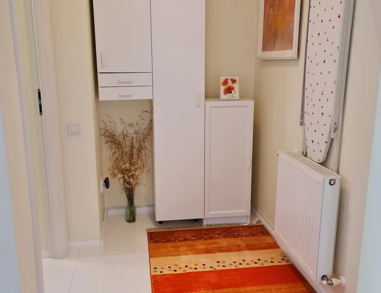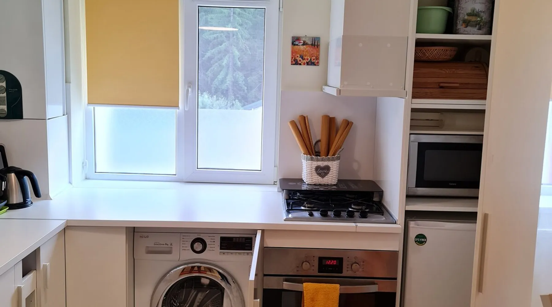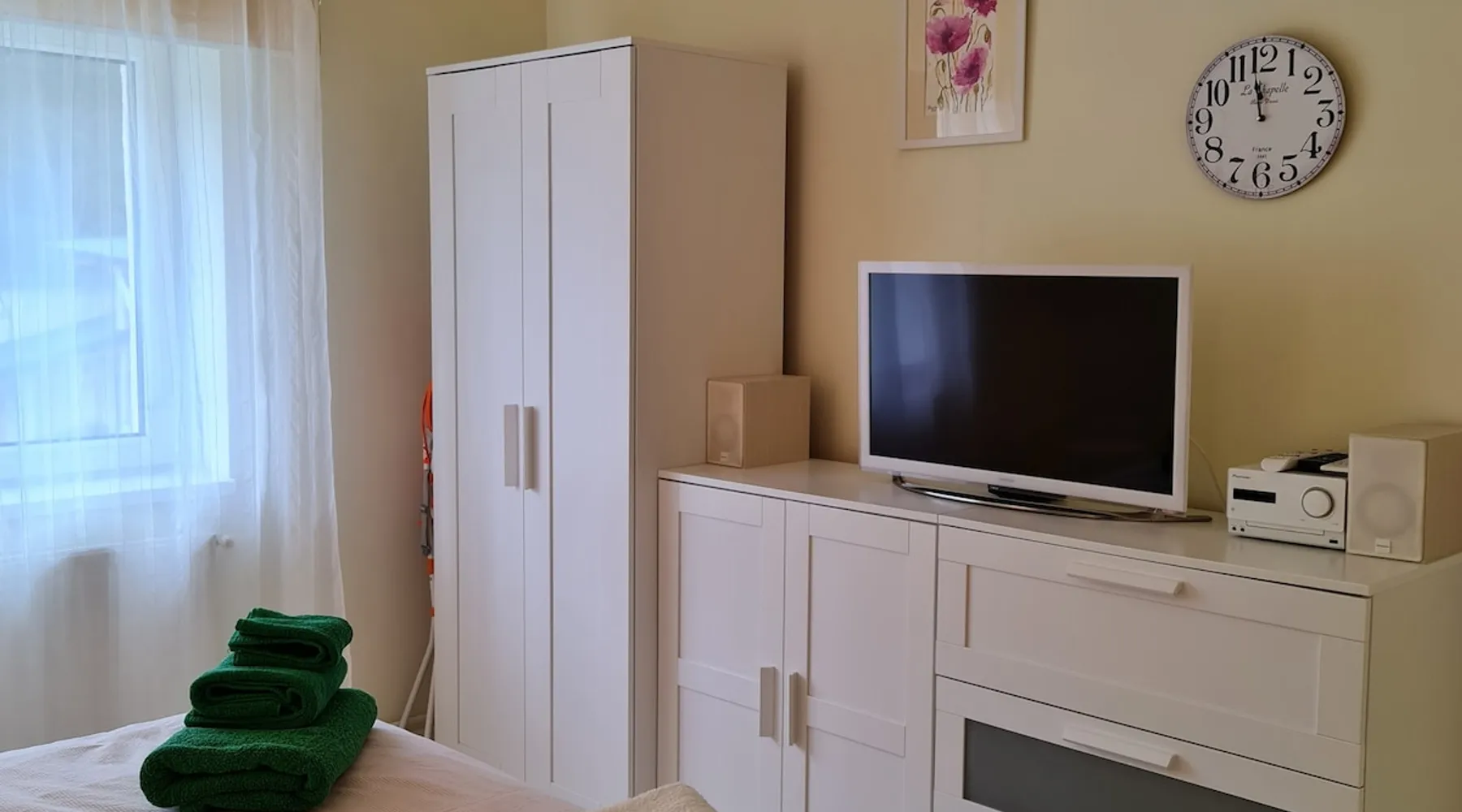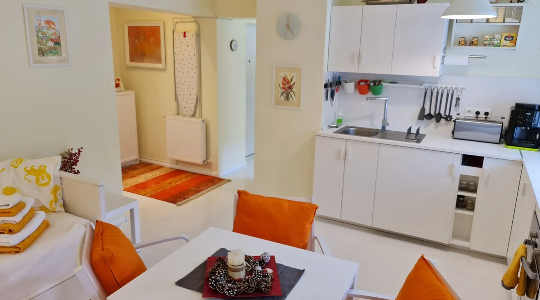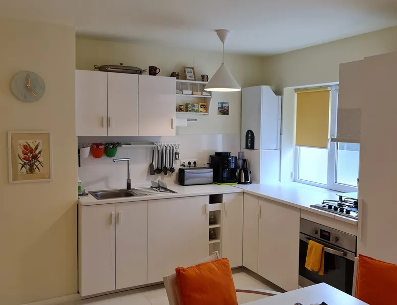 The apartment is located at the foot of the Bucegi Mountains, the immediate vicinity of Hotel Silva (50m) and the Busteni cable car (100m). The location is quiet, welcoming and offers you a gorgeous view to Bucegi Mountains. Spacious, consisting of a living room , bedroom, one bathroom, office area, hallway, sofa bed , fully equipped kitchen with dishwasher and laundry machine. Ideal for families (and with kids), tourists who want to feel at home, young people,couples or for a mountain getaway. The space The white apartment is where we hope you can feel at home. It is located a stone's throw from the cable car in Busteni and the Silva Hotel, overlooking the sun, the creek, the forest and the mountain. Perfectly soundproofed and thermally insulated, with its own boiler and thermoregulation, it has opaque blinds in sleeping areas and smart lock, with temporary custom code for each guest. Besides the complete facilities, the white apartment is arranged in Scandinavian style, with straw-colored walls and contrasting color spots in tones of solar yellow, orange and pale pink. The paintings are original, signed, in watercolor, acrylic or oil and benefit from warm led lighting. Carpets are made of short, anti-allergic silk, adding hard shades of balancing the pastel of the walls. We look forward to having an espresso from freshly ground beans. Guest access The guests have access to the entire apartment.