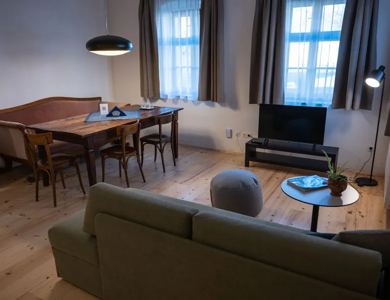 With us you live & sleep in a monument - a more than 200 year old double stretched farm with 1,200 square meters of garden. Our Tschardakhof has 5 apartments which can be booked individually or exclusively. Our farm is perfect for intergenerational vacations, groups of friends or even workations. Vacation, celebrate and work together - but with enough privacy in your own apartment. ATTENTION: from November - March the apartment Troadkasten is not included) The space Our farm has a main building with 4 apartments and 1 apartment in the Troadkasten (only included in the price from April to October). The names of the five apartments are reminiscent of their historical function. While the living areas of the building were already housed in the Anger and Hofstatt, the wine cellar served as a storage and production facility for viticulture. In the Viecherei, the horses rested from their daily work and in the Troadkasten, the grain harvested in summer was stored. Here is information about the apartments: Top 1 Anger: entrance hall with wardrobe, 1 bedroom with a double box spring bed and a sofa bed for 2 people, as well as a desk and wardrobe, 1 living room with a fully equipped kitchen, dining room and sofa bed with TV. Bathroom with shower, separate toilet. (max. 6 people) Top 2 wine cellars: You enter the apartment via 2 steps and you are in the kitchen-living room (fully equipped kitchen and dining table for 4 people) and a cloakroom. A staircase in the former wine cellar leads you to the bathroom with shower and toilet (extra). Up 2 steps from the kitchen-diner is the large living/bedroom with a double box spring bed and a large sofa bed with a TV. The room also has a desk, wardrobe and chest of drawers. (max. 4 people) Top 3 Viecherei: kitchen-living room with a small pull-out couch for 1 child, TV, dining table for 3 people, fully equipped kitchen. 1 bedroom with a double box spring bed (1.60m wide), desk and wardrobe. Bathroom with shower and extra toilet (max. 2 adults and 1 child + baby bed) Top 4 Hofstatt: entrance hall with wardrobe, 1 bedroom with a double box spring bed and a sofa bed for 2 people, as well as a desk, chest of drawers and wardrobe, 1 living room with a fully equipped kitchen, dining room and sofa bed with TV. Bathroom with shower, separate toilet. Stairs to the terrace. (Max. 6 people) Top 5 Troadkasten: A short steep staircase leads to the kitchen with dining area and the bathroom with shower and toilet. A longer steep staircase leads to the sleeping area with a double box spring bed and sofa bed (for 1 child aged 3 years and up) and a TV. The Troadkasten also has air conditioning. (max. 2 adults and 1 child over 3 years) Our common room Kramasuri has a mini bar with local drinks (beer, mineral water, wine and juices), dryer and washing machine, games, children's books and more cooking utensils. The 1,200 m2 garden invites you to play and relax. There are 2 terraces - one right next to the apartment Top 4 Hofstatt with a large table and a second with a gas grill by the Troadkasten. There are deckchairs and sun loungers. You can find shade under one of our trees. We have 2 e-bikes that can be rented and an e-charging station at the entrance. There is free Wi-Fi throughout the courtyard. When booking the entire courtyard, we recommend using the living room of the Hofstatt apartment as a “common room”. An additional table can also be added here. The perfect maximum occupancy is 12 adults and 8 children. Other things to note The Burgenland Card is included in our prices. For group bookings, we provide additional dishes and glasses. Please do not take dishes, glasses and cookware from the other apartments. On request, we also provide breakfast - this is placed in boxes in front of the apartments. Parties with external guests are only allowed on request!