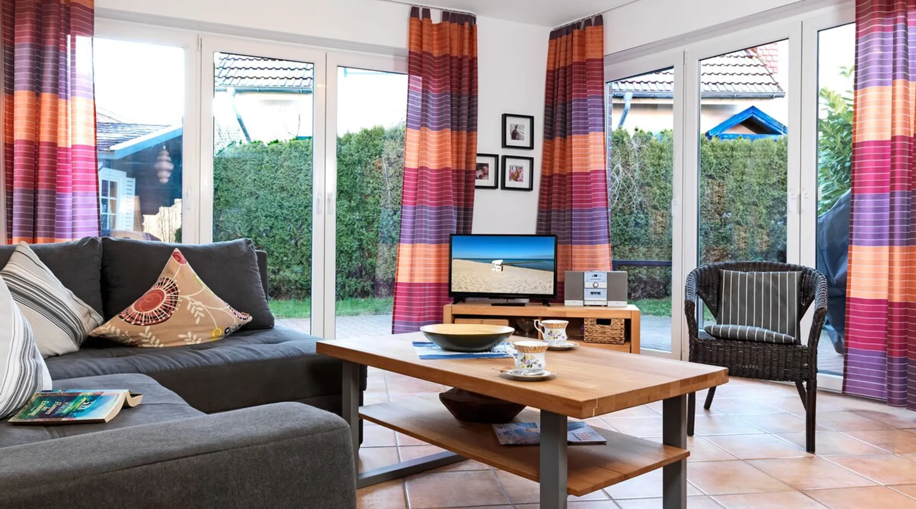 The pretty holiday semi-detached house is located in the small village of Kaltenhof. A dirt road takes you to the sandy beach of the Schwarzen Busch in just 5 minutes. Other things to note In this holiday semi-detached house you will find a cozy living room with flat screen TV, stereo system, fireplace, sofa bed and open fitted kitchen. Here you will find everything you need for a successful holiday: fridge-freezer, stove/oven, dishwasher and microwave. From the living room you can access the large terrace with patio furniture,beach umbrella and barbecue. There is also a bedroom with a double bed on the ground floor. A large bathroom with bathtub, toilet and washing machine completes the ground floor. Two cozy bedrooms with double beds, one of which has its own TV, are available on the upper floor for up to 4 people. Here you will find the large bathroom with shower/toilet and sauna. Make use of the garden area, which is equipped with new patio furniture and a beach chair. A travel cot as well as a high chair and a handcart are available for our little guests. A free internet connection is available to you. There is 1 parking space at the house. This house is a non-smoking house and pets are allowed. Let yourself be pampered every day. We offer a bread roll delivery service all year round, which you can book with us at least 4 days before arrival. You will receive detailed information from us upon request!