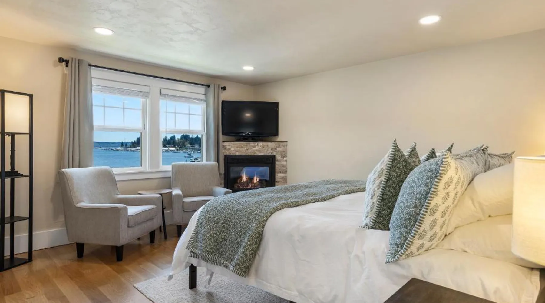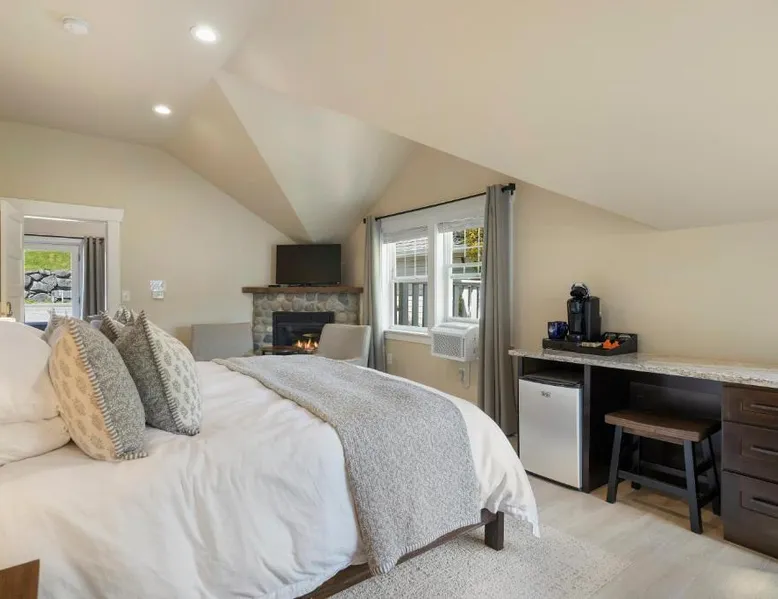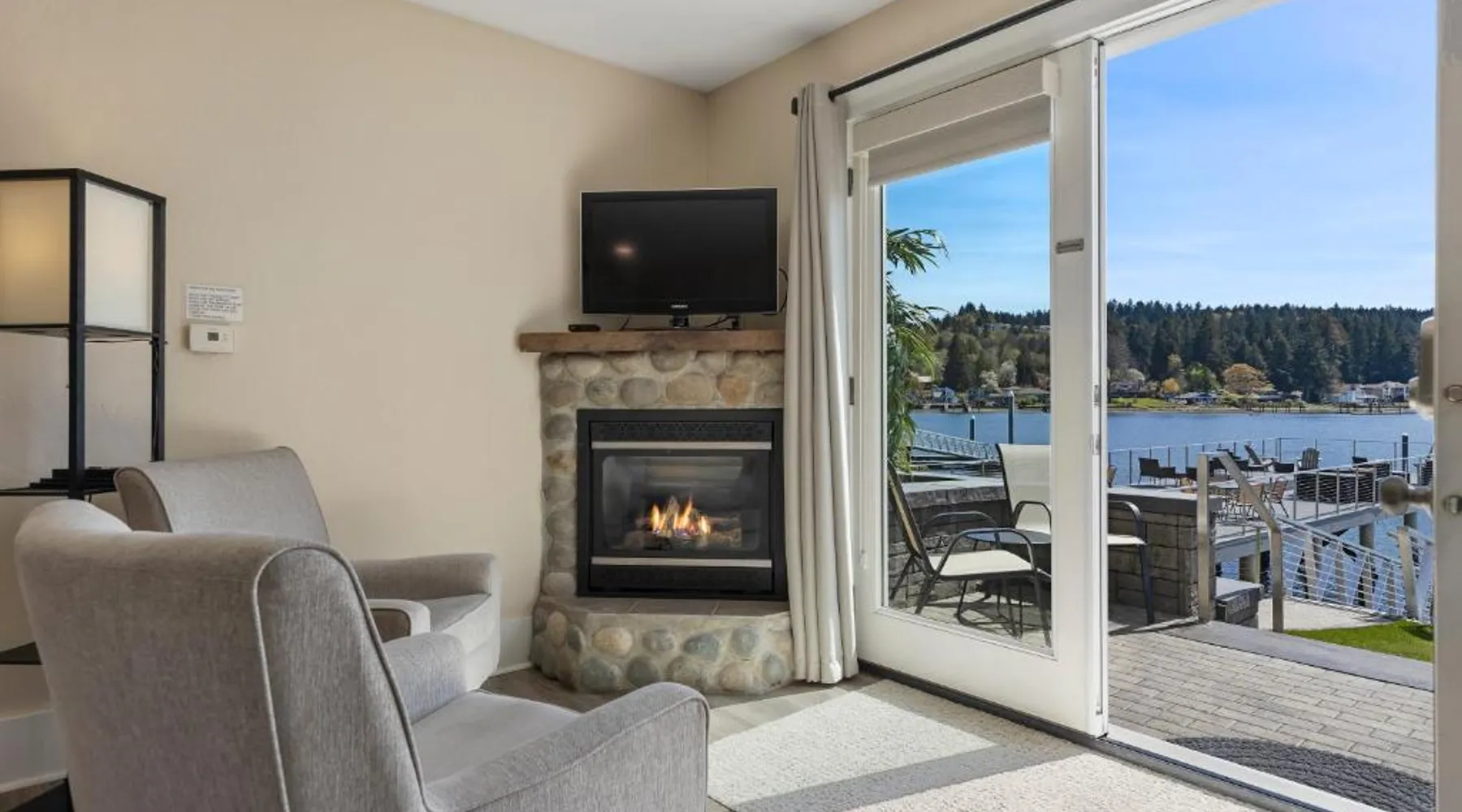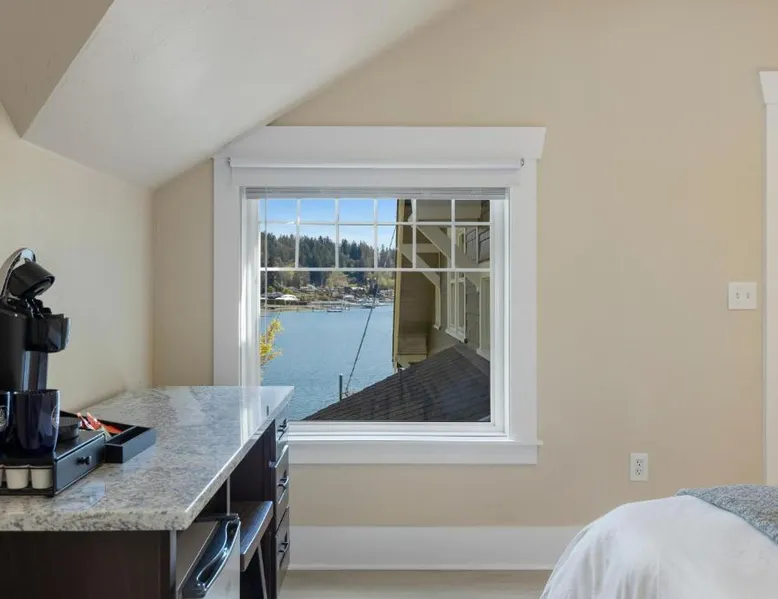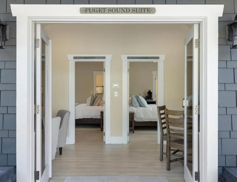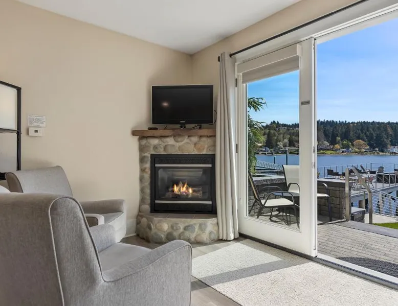 Elegant Accommodations: Waterfront Inn in Gig Harbor offers adults-only rooms with sea views, terraces, and balconies. Each room features air-conditioning, a private bathroom, and modern amenities including a work desk and free WiFi. Exceptional Facilities: Guests can enjoy a sun terrace, water sports facilities, and a lush garden. The inn provides free WiFi, outdoor seating areas, and private check-in and check-out services. Additional amenities include a fireplace, kitchenette, and dining area. Prime Location: Located 34 mi from Seattle–Tacoma International Airport and 14 mi from the Museum of Glass, the inn offers easy access to local attractions. Guests appreciate the scenic views, comfortable rooms, and nearby options for food and drinks. This 2 bedroom suite includes 2 bedrooms and 2 bathrooms adjoined by a common area with a table and kitchenette with a seating area. One room has a gas fireplace and the other has an electric fireplace. Both rooms have free WiFi and flat-screen TVs. The private bathrooms include towels and toiletries. A refrigerator, microwave, ice maker and coffeemaker are also provided. Only one of the rooms has an obstructed ocean view. The other room has a street view.
