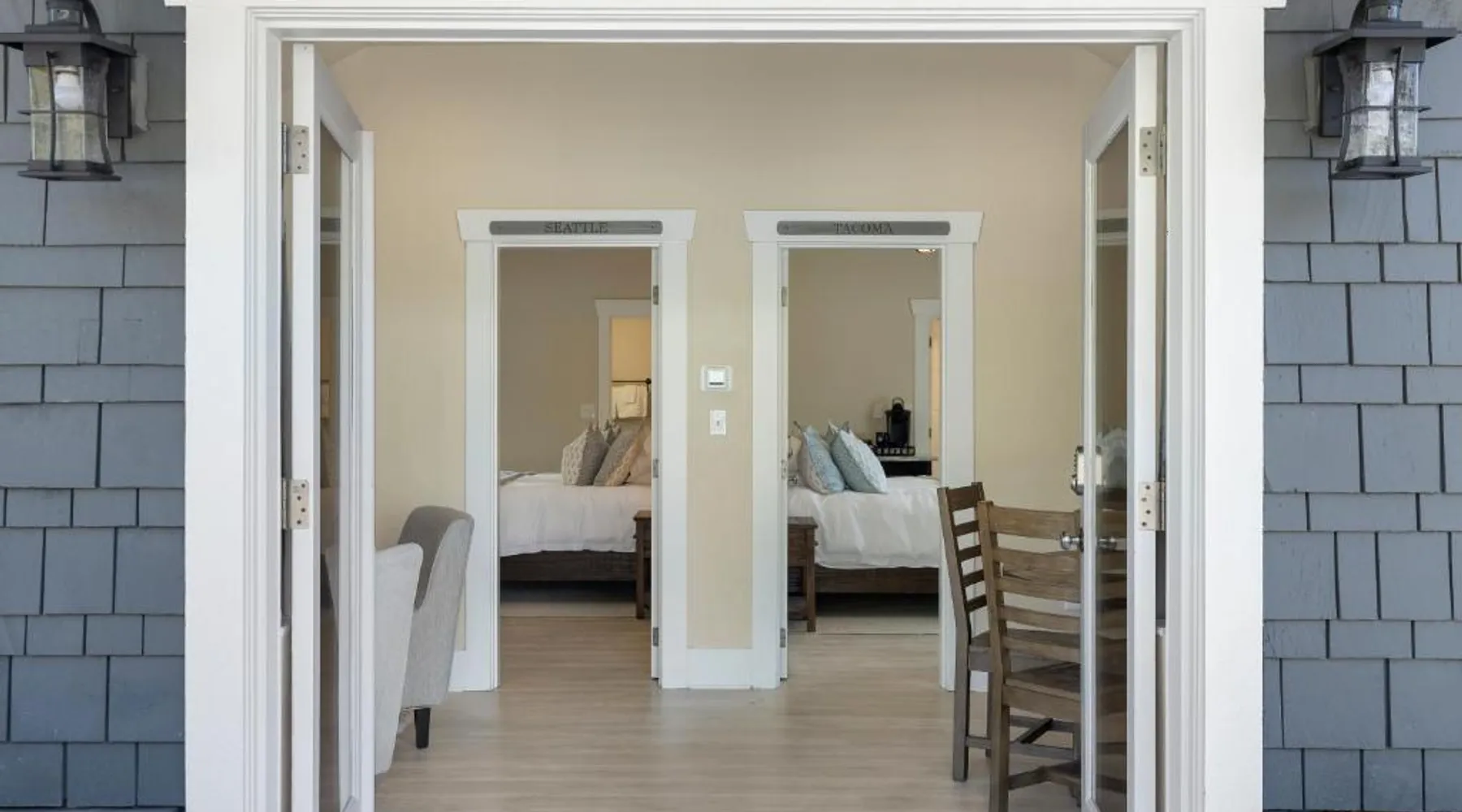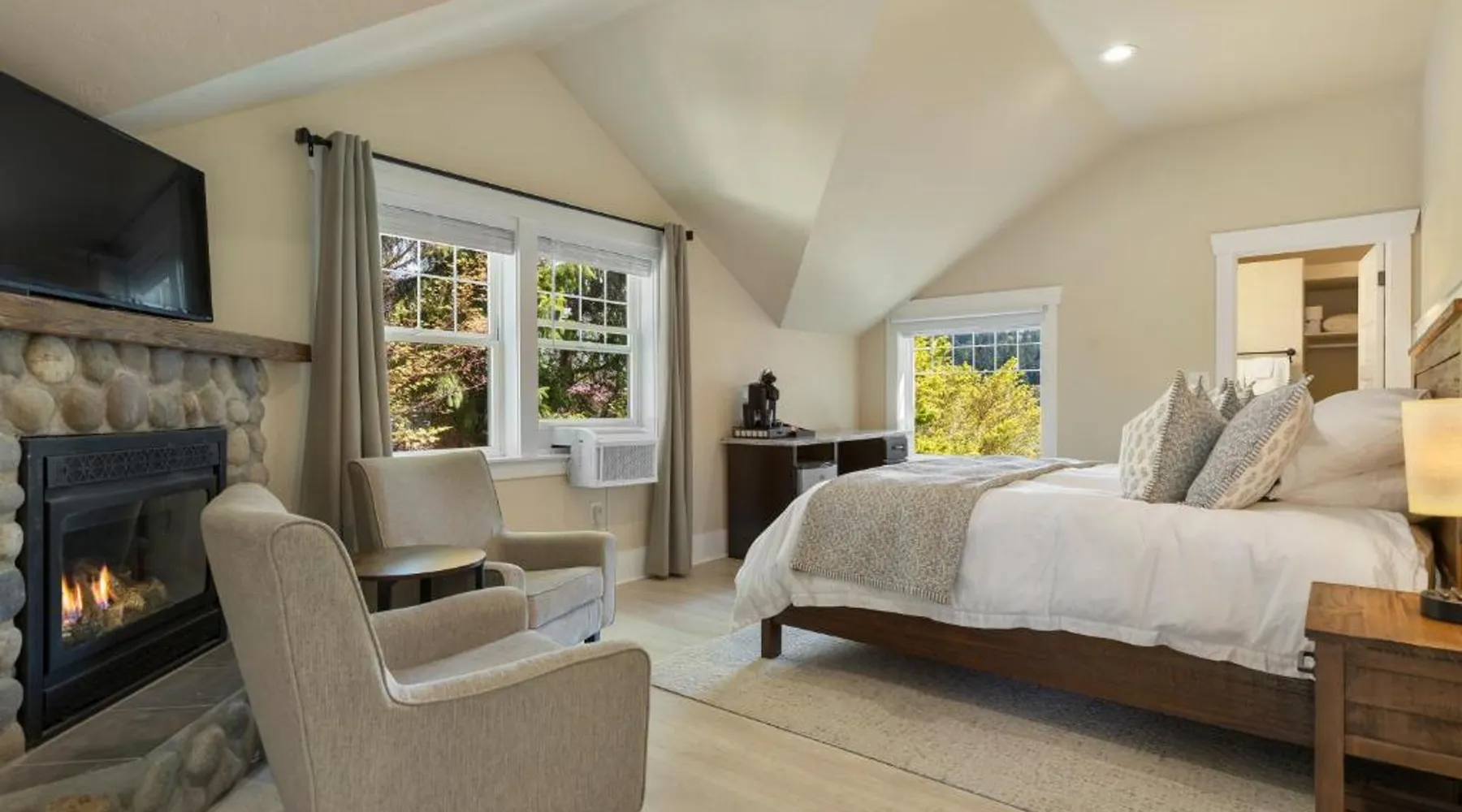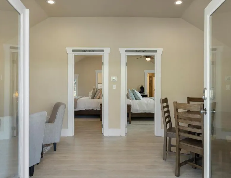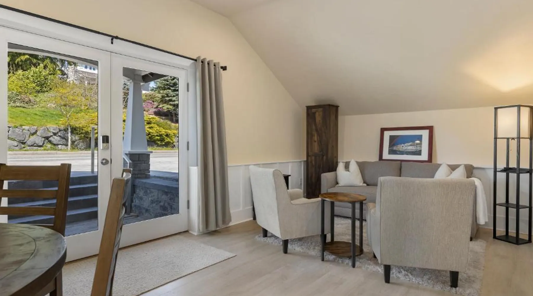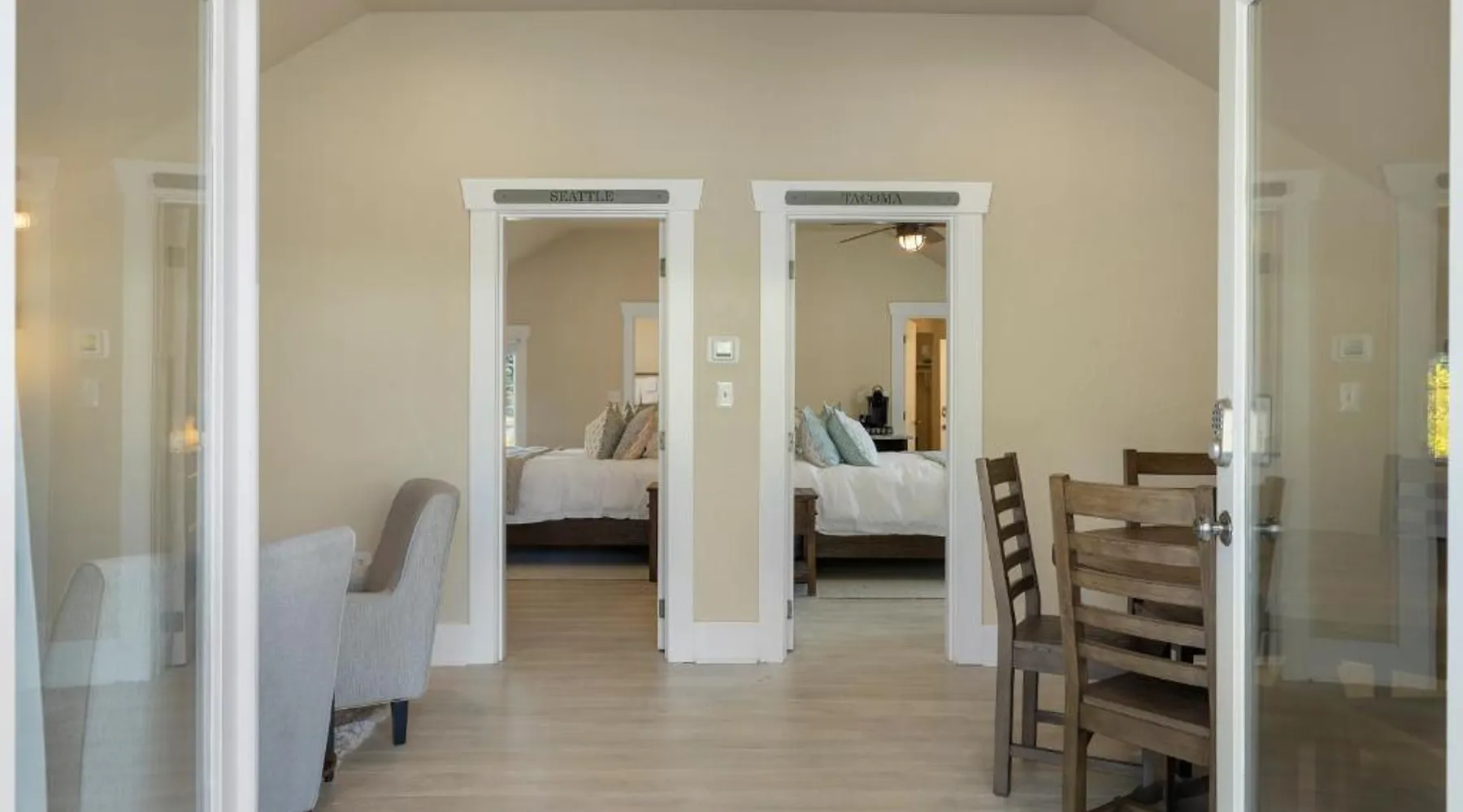 Elegant Accommodations: Waterfront Inn in Gig Harbor offers adults-only rooms with sea views, terraces, and balconies. Each room features air-conditioning, a private bathroom, and modern amenities including a work desk and free WiFi. Exceptional Facilities: Guests can enjoy a sun terrace, water sports facilities, and a lush garden. The inn provides free WiFi, outdoor seating areas, and private check-in and check-out services. Additional amenities include a fireplace, kitchenette, and dining area. Prime Location: Located 34 mi from Seattle–Tacoma International Airport and 14 mi from the Museum of Glass, the inn offers easy access to local attractions. Guests appreciate the scenic views, comfortable rooms, and nearby options for food and drinks. This 2 bedroom suite includes 2 bedrooms and 2 bathrooms adjoined by a common area with a table and kitchenette with a seating area. One room has a gas fireplace and the other has an electric fireplace. Both rooms have free WiFi and flat-screen TVs. The private bathrooms include towels and toiletries. A refrigerator, microwave, ice maker and coffeemaker are also provided. Only one of the rooms has an obstructed ocean view. The other room has a street view.