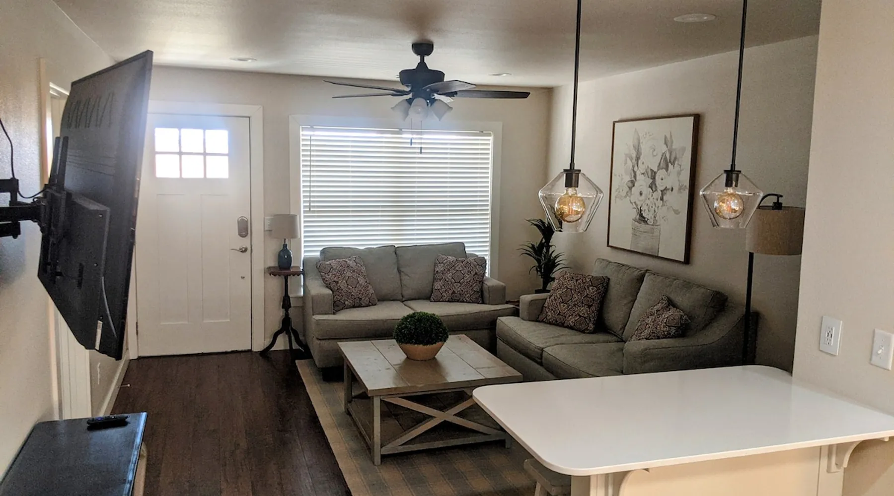 This fun three-bedroom cottage is just right for a weekend stay (or longer!) in Northwest Arkansas. You'll be 15 minutes from the University of Arkansas in Fayetteville, 10 minutes from The AMP in Rogers, and 25 minutes to the world-class Crystal Bridges Art Museum in Bentonville. Our guests are situated in the midst of some of the best attractions in the Ozarks! The space Our cottage was recently renovated from top to bottom, and it is just waiting for you! There are three bedrooms in total, two with queen-sized beds and one with a pair of twin beds. In addition, there are two indoor living spaces---a living room with large screen TV (Roku enabled) and a private room with a table perfect for playing cards or opening up your laptop and just getting some work done. A small deck in the back is perfect for outdoor socializing when the weather is nice. Other things to note No smoking and no pets allowed on this property.