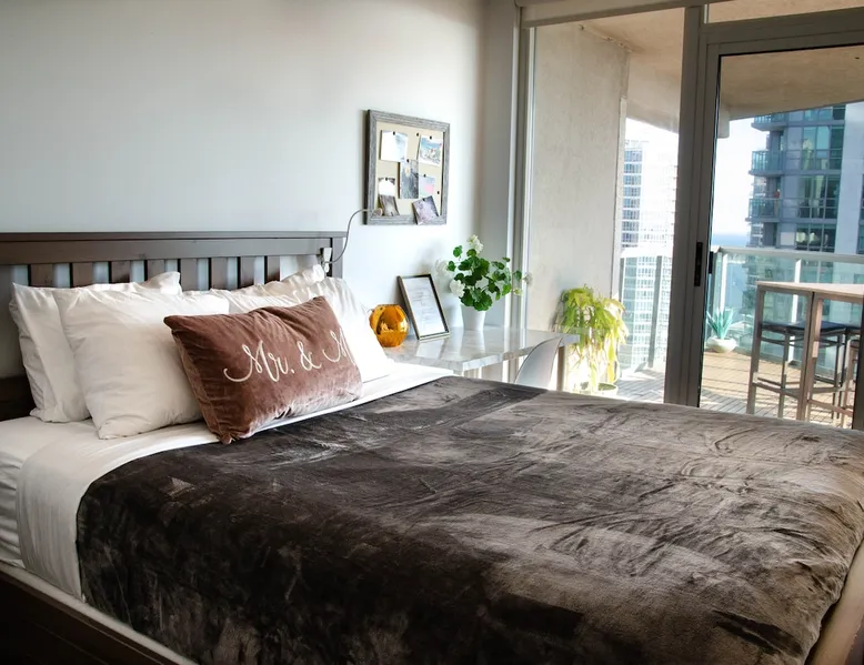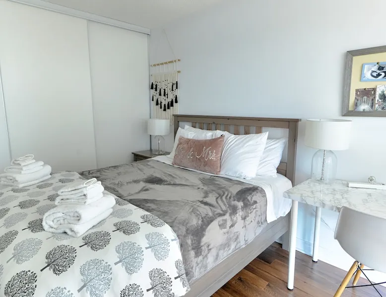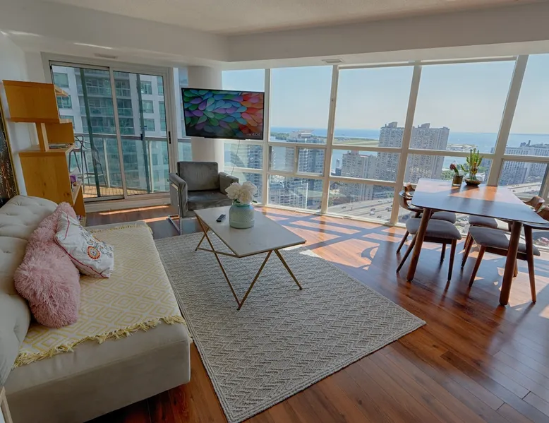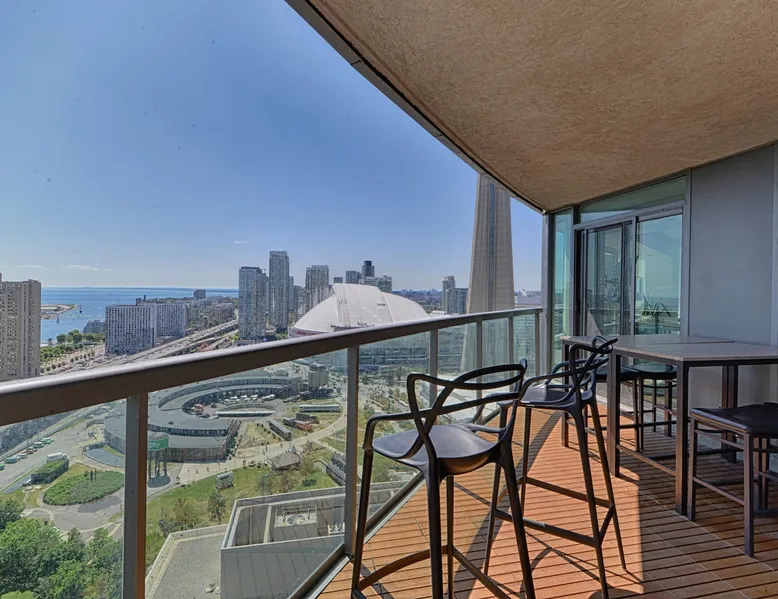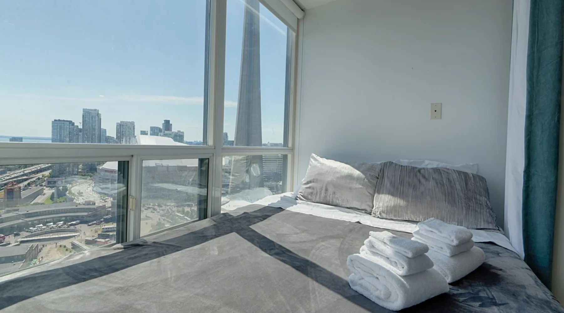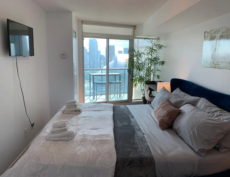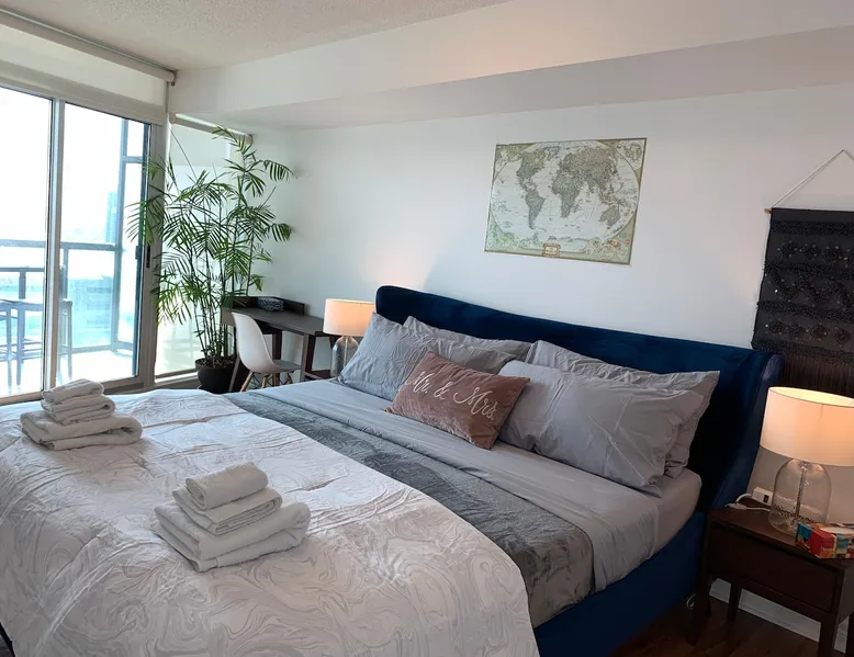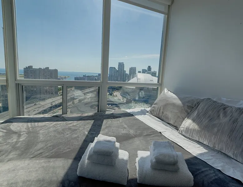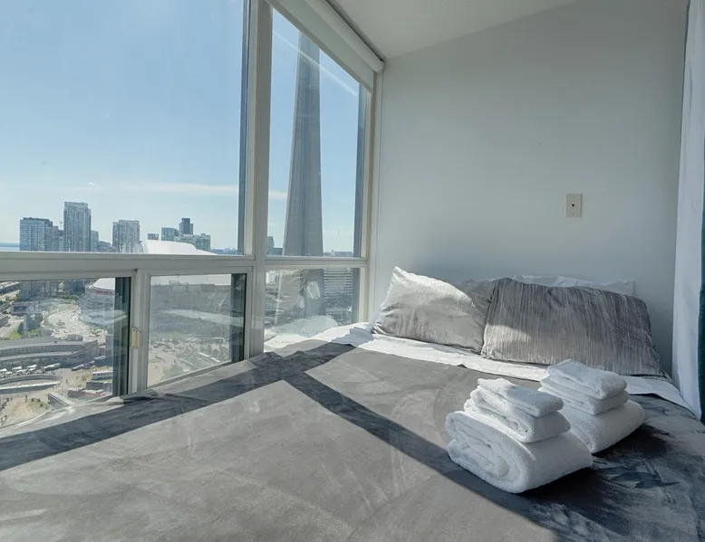 Professional cleaning: All furnaces disinfected with Lysol. One Free onsite Parking! Only available for long term rental. Expansive floor to ceiling windows (with roller shades) offer breathtaking, panoramic views of the CN Tower, Rogers Centre, Aquarium, Harbour Front, Lake and Toronto Island. Third queen bed set up in the breakfast area with curtains to ensure privacy. The space We viewed over hundreds of condos in downtown Toronto to find this diamond. Luxurious, spacious, two bedroom condo in an exclusive complex in downtown Toronto, this unit's location is second to none! Whatever you are in Toronto for, we are probably near it. Watch the sun rise AND set with fabulous south-southwest views. Have a morning coffee or evening cocktail on the sprawling, south-facing, oversized deck. Or have a quiet moment to yourself on the second deck off your master bedroom. Perfect for visiting tourists, families, business people looking for an upscale place to call home, in a fabulous location with stunning views. Guest access BATHROOMS - soaker tub with shower (shower stall in second bathroom) - fluffy, high quality towels. KITCHEN - a fully-equipped, modern kitchen has all you need to prepare a gourmet meal: - stainless steel range, refrigerator, dishwasher, microwave oven - stainless steel pots & pans - full dinnerware set - all cooking utensils, cutlery & glassware - Bodum Electrical burr Coffee grinder and Cuisinart coffeemaker - washer/dryer. BALCONIES - cozy bistro set full patio dining set on main balcony - cozy bistro set to enjoy morning coffee off the master bedroom. BUSINESS - workstation in both bedrooms - high speed internet The building is fully secured, with key/fob controlled access. Superb array of amenities: health club, swimming pool, hot tub and his & her saunas.