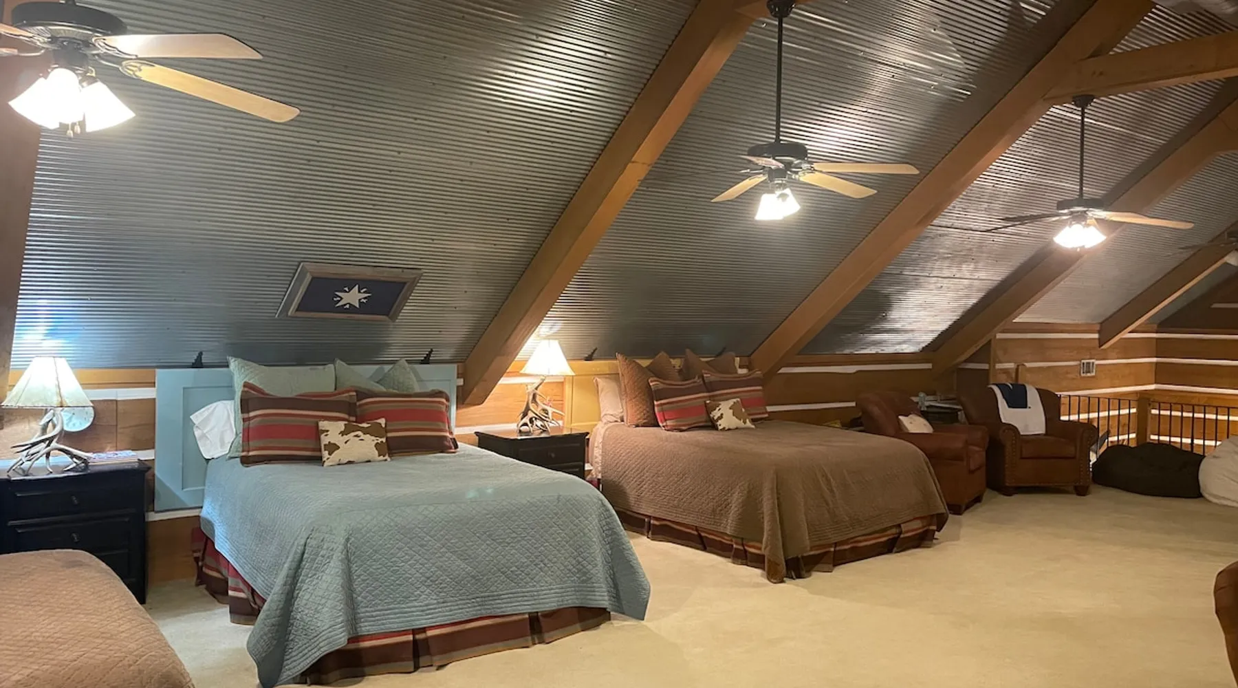 If you are planning a trip to Oxford, MS this beautiful vacation cabin on 150 acres accommodates groups of 1- 12 guests. You will enjoy the beautiful views on the large porches with your own lake and private pool. The space is perfect for large families, friend groups, leadership retreats, corporate getaways. Bedroom # 1: King w/ full bathroom # 2: King w/ full bathroom (tub/shower) # 3: Upstairs loft w/ 4 queen beds & sitting are (1/2 bath) insta: cedarpointlodge for more pics
