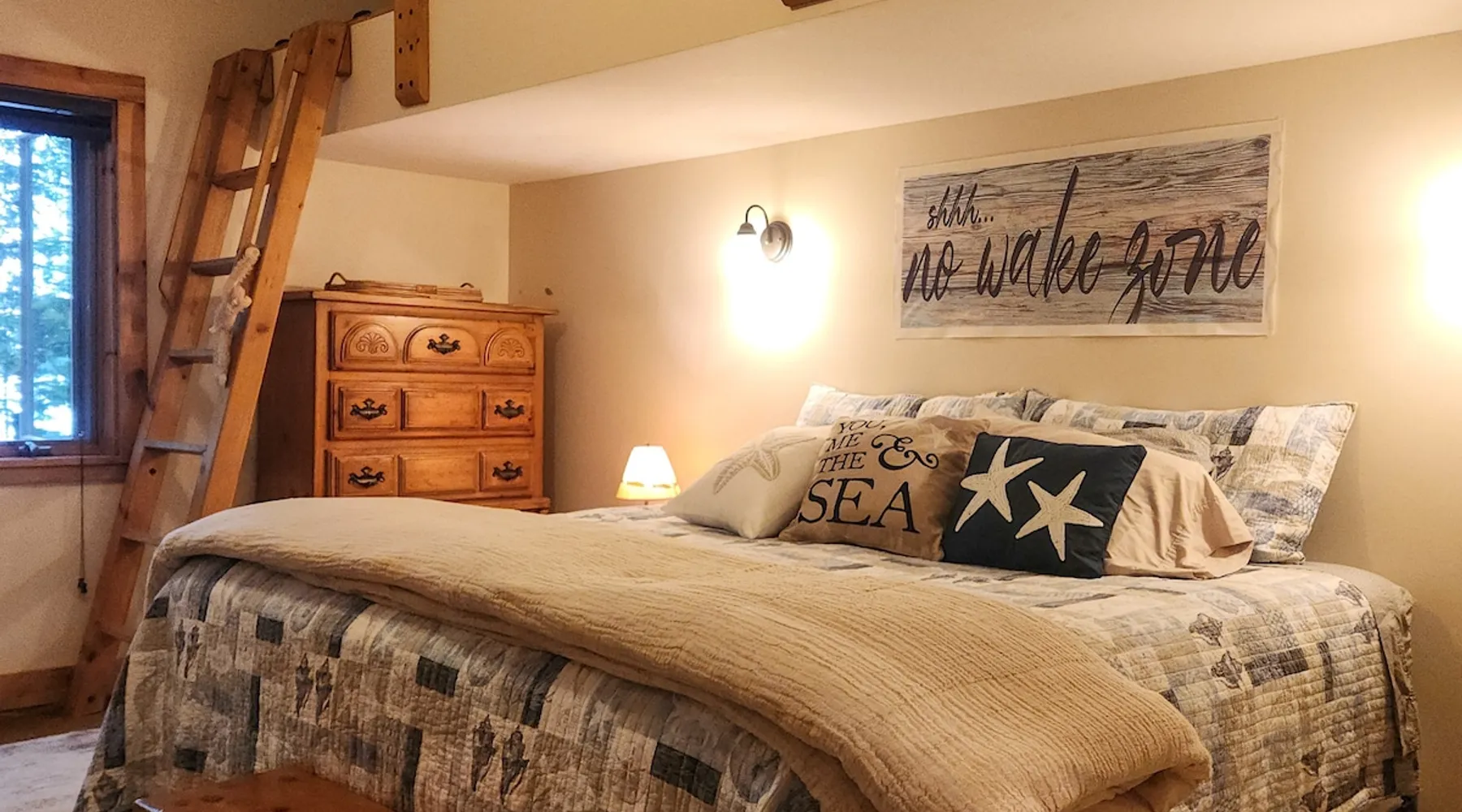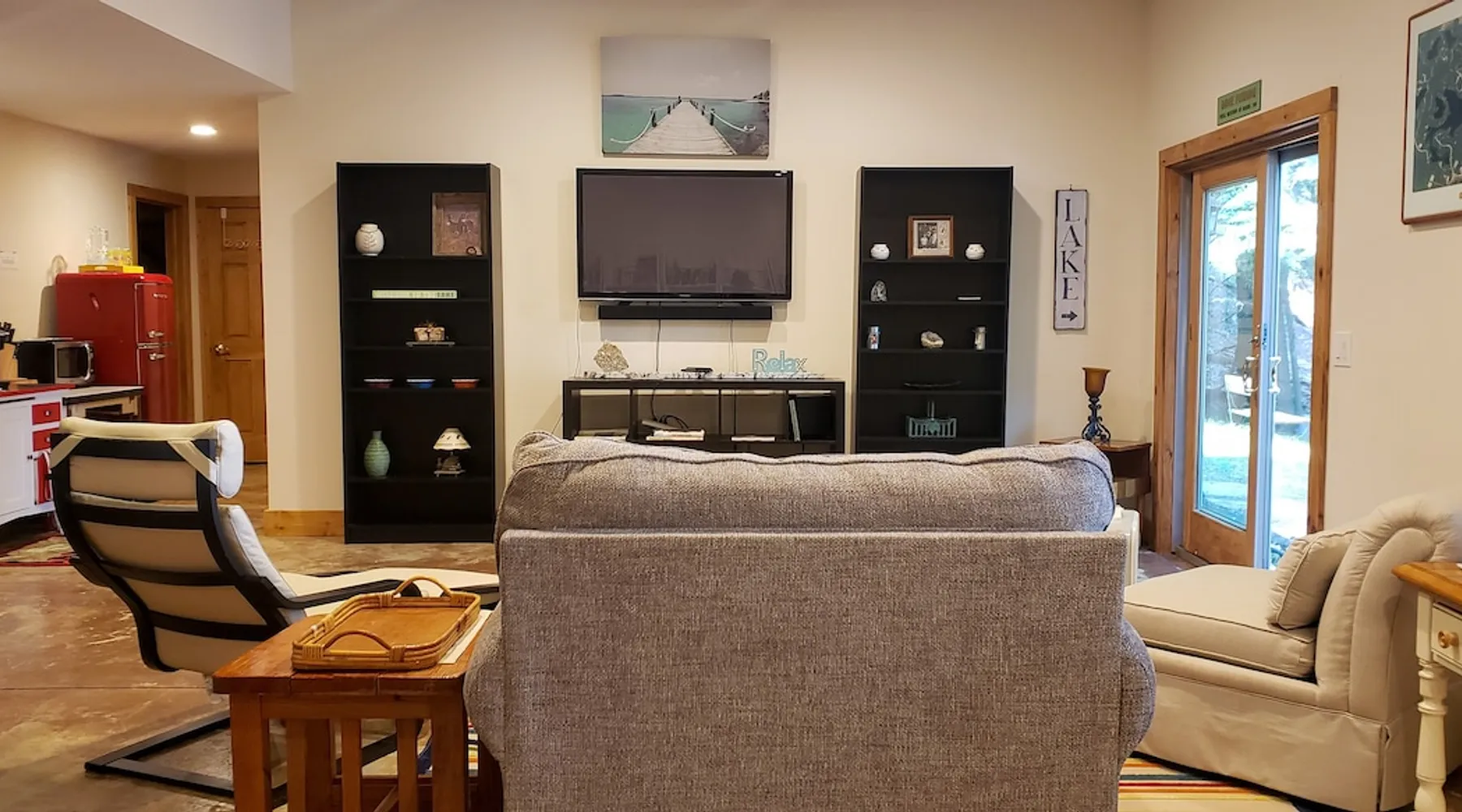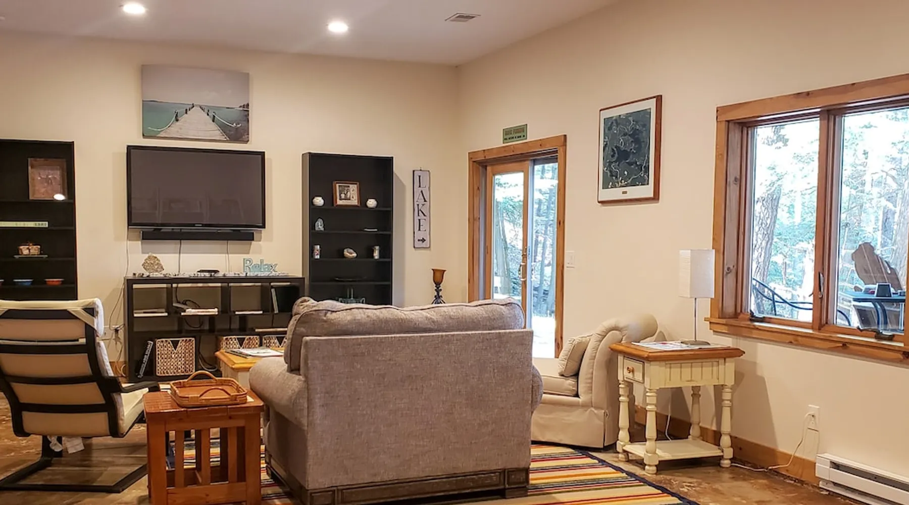 NO CLEANING FEE ! Be my guest ! Your own Private bedroom, bathroom & Living Room on the lower level of my 4200 sf home with Direct Waterfront & Lake Views of Spider Lake from 4 large windows. Approx 950 sq ft walks out to a deck over looking the lake with Patio Furniture, Charcoal Grill and stairs going down to the lakefront. I have been "in the biz" & owned Harolds Resort next door for 34 years & managed others peoples vacation homes on this lake too. Come & hang out at the lake ! The space 50 feet from the water ! This is approx 950 sq ft of my finished Lower Level of my 4200 sq ft Spider Lake Home. This space has a Bedroom with King Bed & a Loft Bed above with 2 twin mattresses. Suggested ages for kids are 6-12, they have to be able to climb up/down a ladder. Right across the hall is a Full Bath and in the hall a stocked Linen Closet. The Living Room - Rec Room has a Comfy Seating, a Large TV with Amazon FireStick, Assorted Books & Puzzles . Light and Bright with 10' ceilings and lots of natural light and windows overlooking Spider Lake. For Snacks and Beverages there is a Small Refrigerator, Toaster Oven, Microwave and Keurig. Glass Sliding Door opens to a Large Deck overlooking the Lake with Patio Furniture and Weber Charcoal Grill ( bring charcoal) . NOTE; There is 1 KING bed and a Loft Bed with 2 twin mattresses for KIDS. and a double futon sofa bed in the Rec Room. This space can sleep 6, if 2 of the 6 are kids that are able to climb up and down a ladder and sleep in the loft bed, if that is the case, message me and I will change the Max Occ to 5 or 6 . I just don't want 6 adults booking the space so I have the Max Occ set to 4. Thanks for understanding ** You will need to walk down a hill and around the house to your private entrance, and then there are stairs down to the dock. The house is built into a hill, in the woods and on the lake.*** This is like a little hike in the woods ** ...k Guest access You'll have private access to the lower level. In general, I am very flexible and if you need anything, just let me know. Other things to note We a very friendly family and love to be of assistance, however we also understand our guest's desire for privacy. You will have your own parking and entrance and one of us is usually nearby if you need anything. Kathy