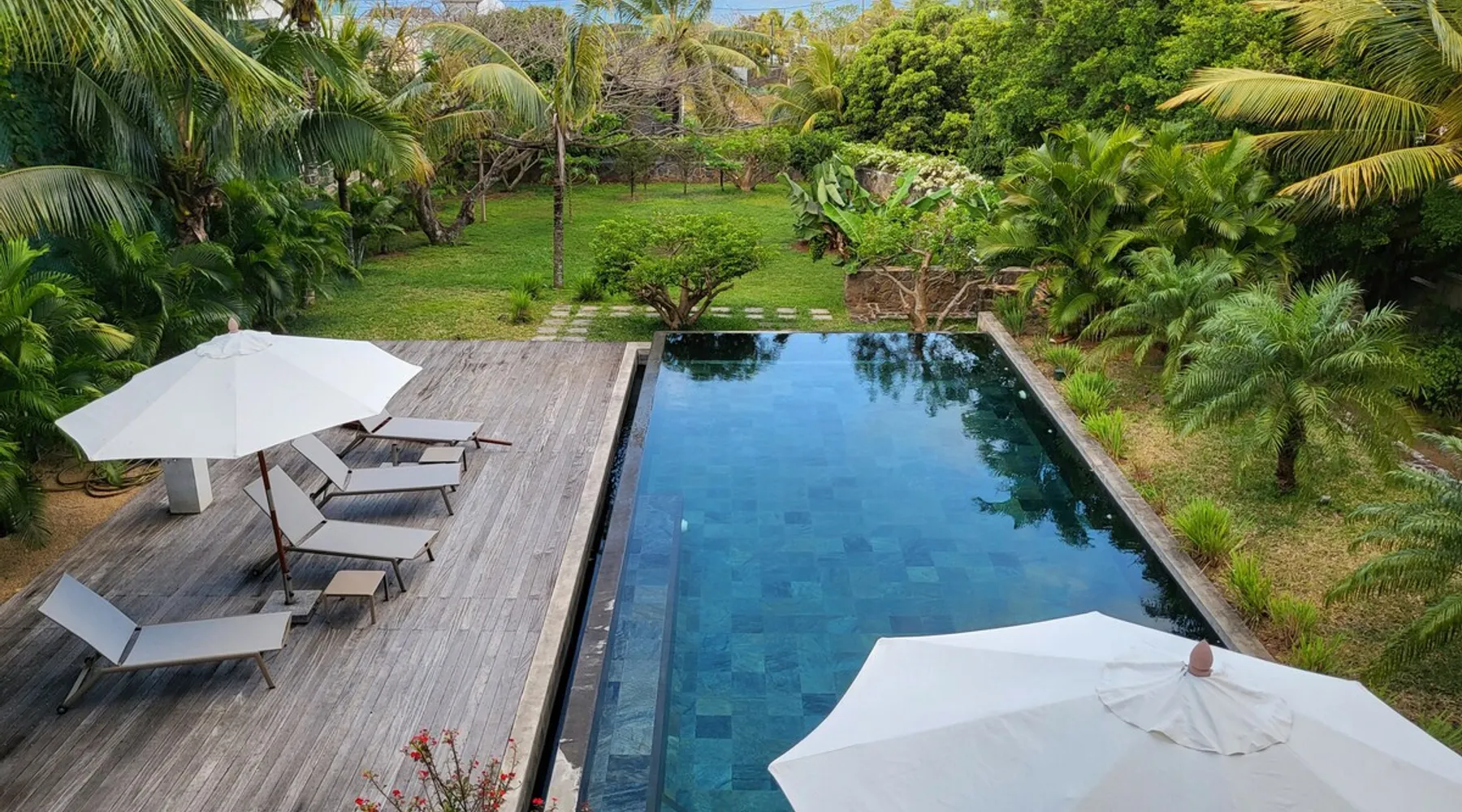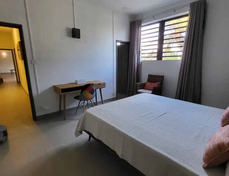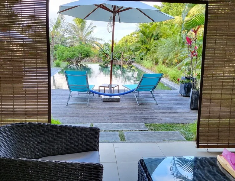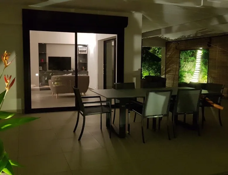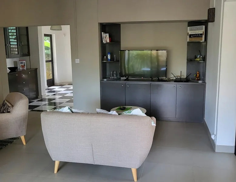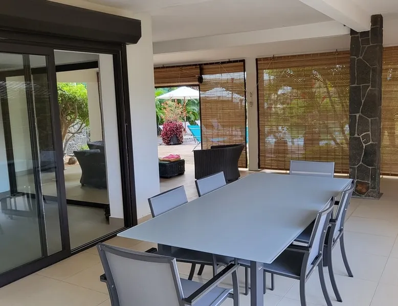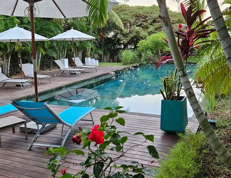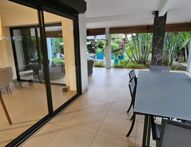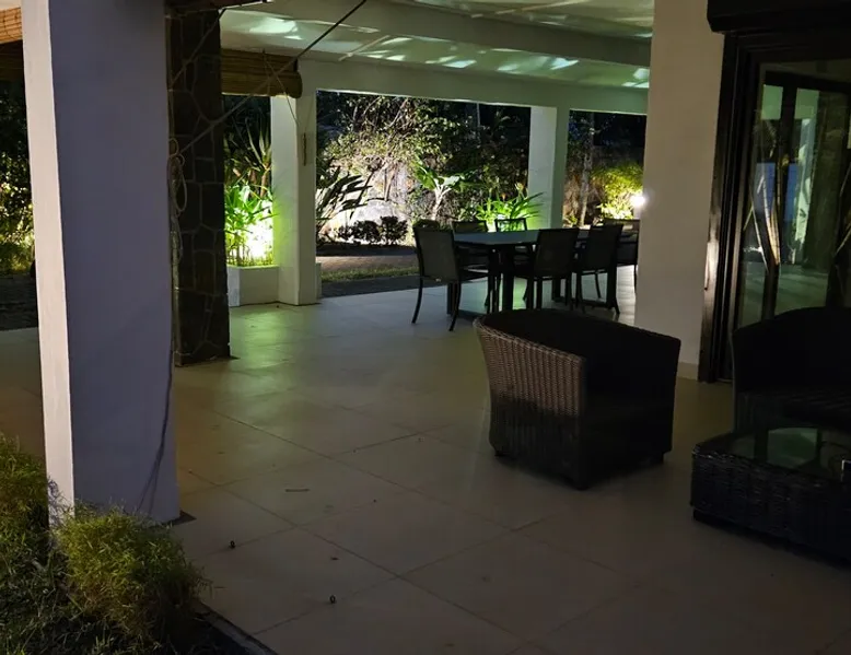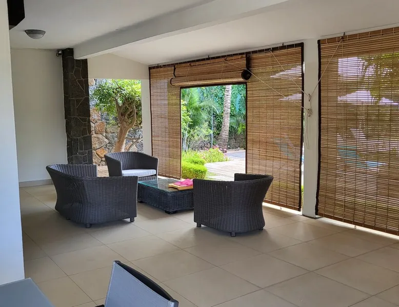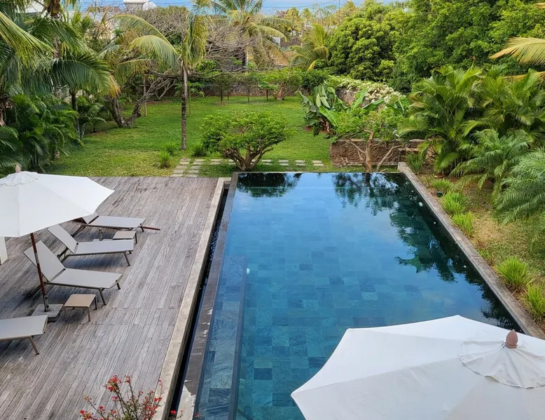 Single storey of 170 m2 with a completely independent 90m2 veranda (covered terrace) on the ground floor of a villa with an infinity pool of 16 m x 6 m with a huge deck. in a magnificent tropical garden of 2000 m². Close to superb beaches, 1.5 km from an 18-hole golf course, the Mont Choisy golf club and 3.5 km from the city center of the seaside resort of Grand Baie, its shops and its many restaurants. This villa is ideally located. The space The house is located on top of a hill in a completely enclosed ocean of greenery and has the advantage of being well ventilated thanks to the trade winds. The villa is equipped with a large generator capable of powering all the air conditioning, lighting and all the household appliances in the accommodation in the event of power cuts which are relatively frequent in Mauritius.