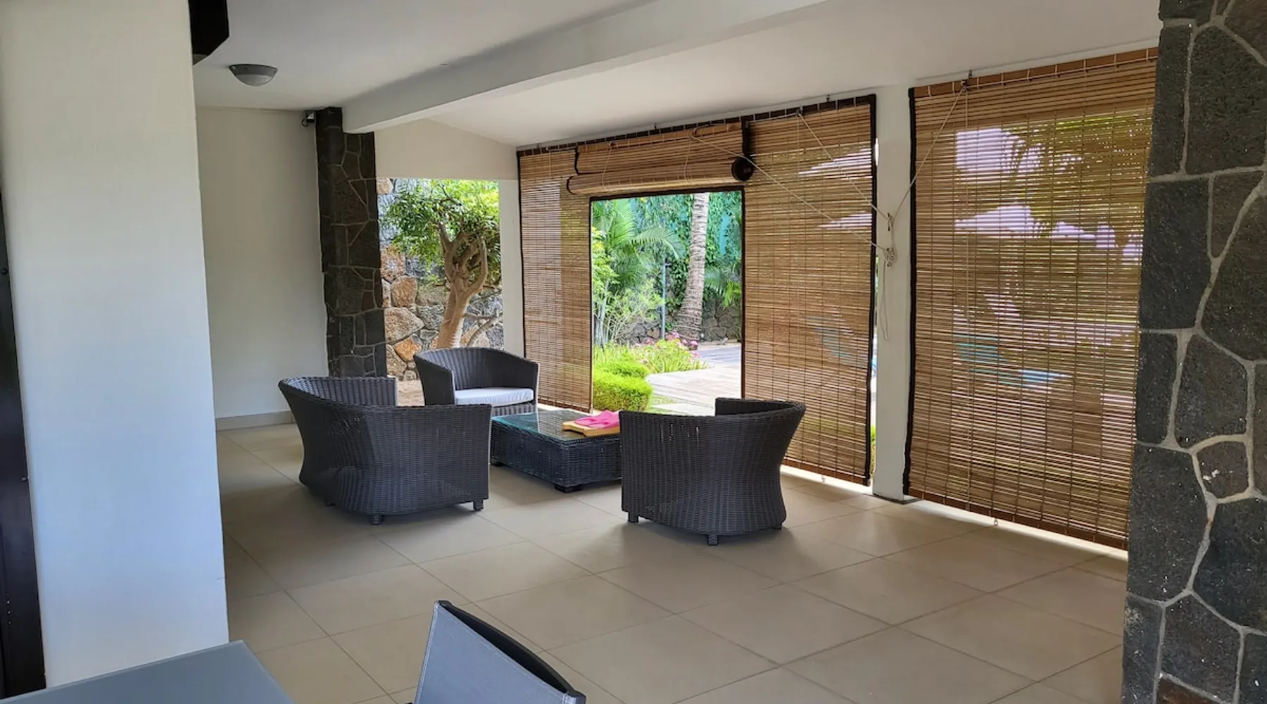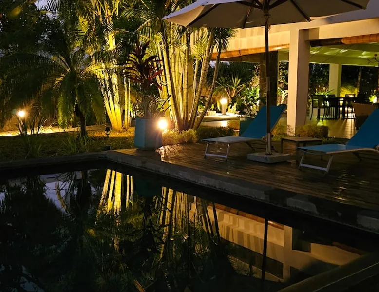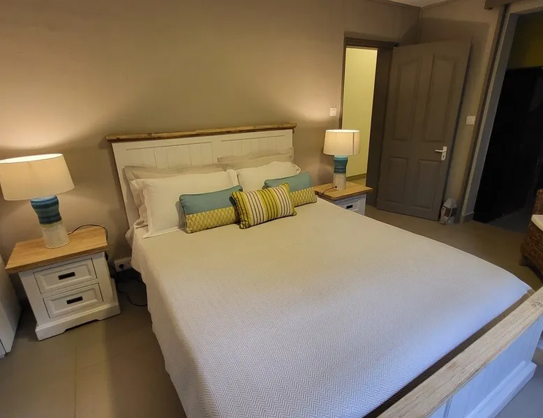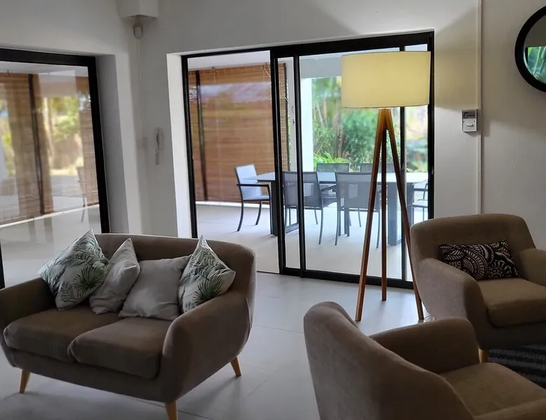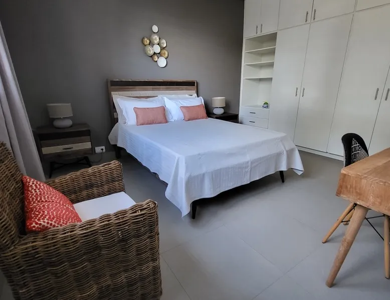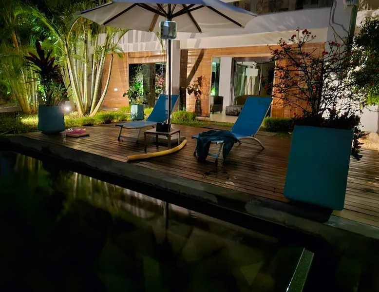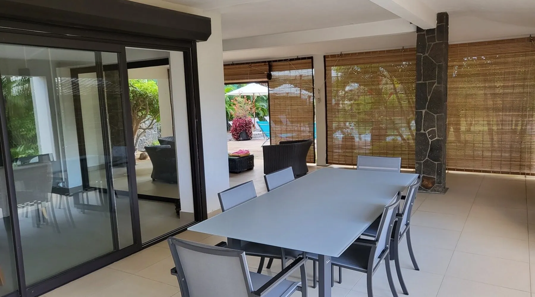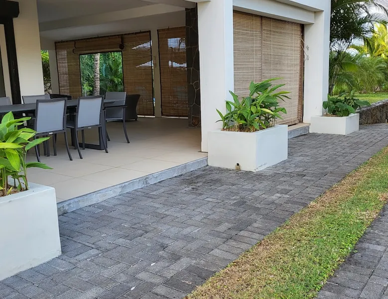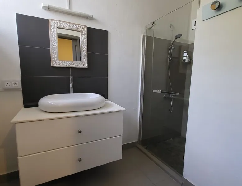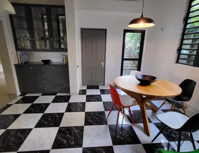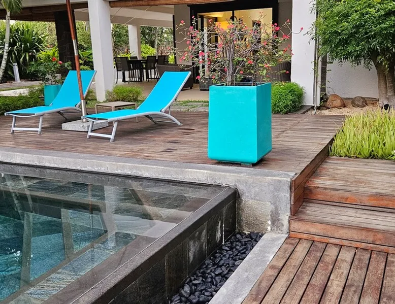 Single storey of 170 m2 with a completely independent 90m2 veranda (covered terrace) on the ground floor of a villa with an infinity pool of 16 m x 6 m with a huge deck. in a magnificent tropical garden of 2000 m². Close to superb beaches, 1.5 km from an 18-hole golf course, the Mont Choisy golf club and 3.5 km from the city center of the seaside resort of Grand Baie, its shops and its many restaurants. This villa is ideally located. The space The house is located on top of a hill in a completely enclosed ocean of greenery and has the advantage of being well ventilated thanks to the trade winds. The villa is equipped with a large generator capable of powering all the air conditioning, lighting and all the household appliances in the accommodation in the event of power cuts which are relatively frequent in Mauritius.