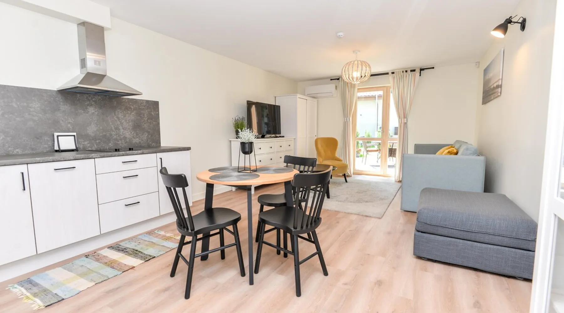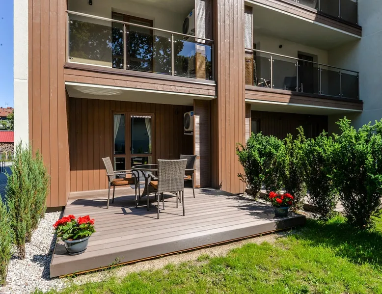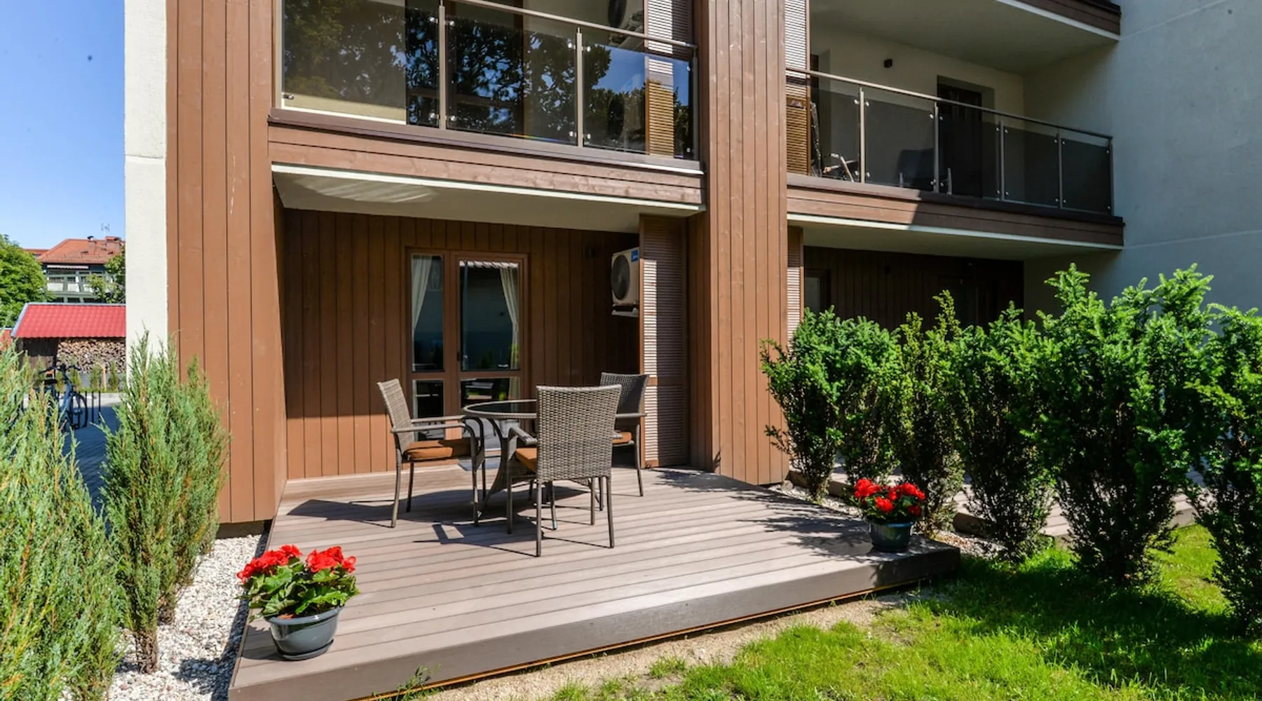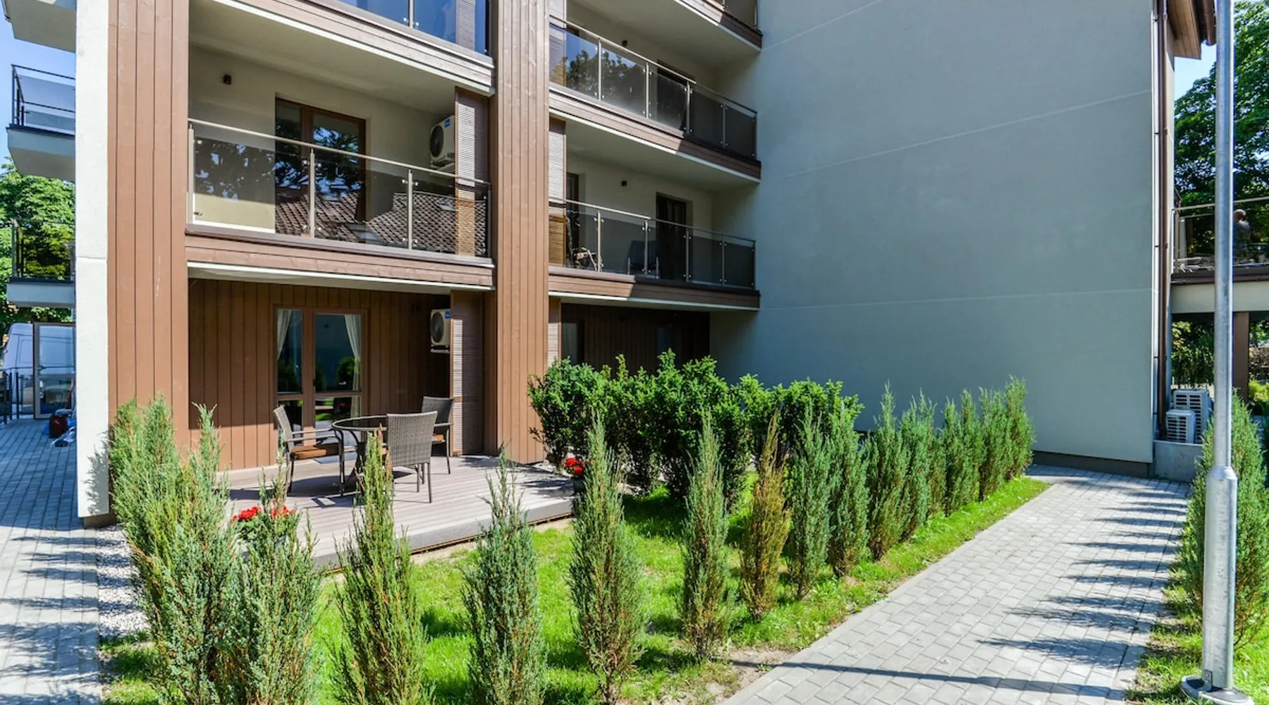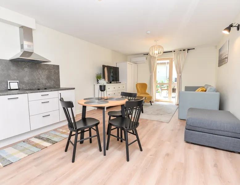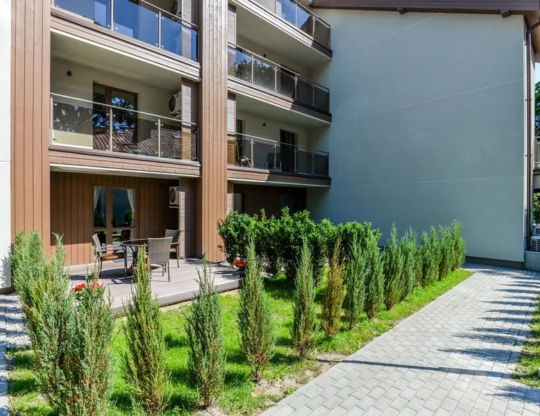 “New construction, beautiful and cozy apartment on the ground floor with spacious terrace. To the Curonian Lagoon about 200m, Baltic Sea about 1200m, nearest bar 300m, grocery store 200m,bus stop 2 min walk. Free parking near you. Contactless check-in.
