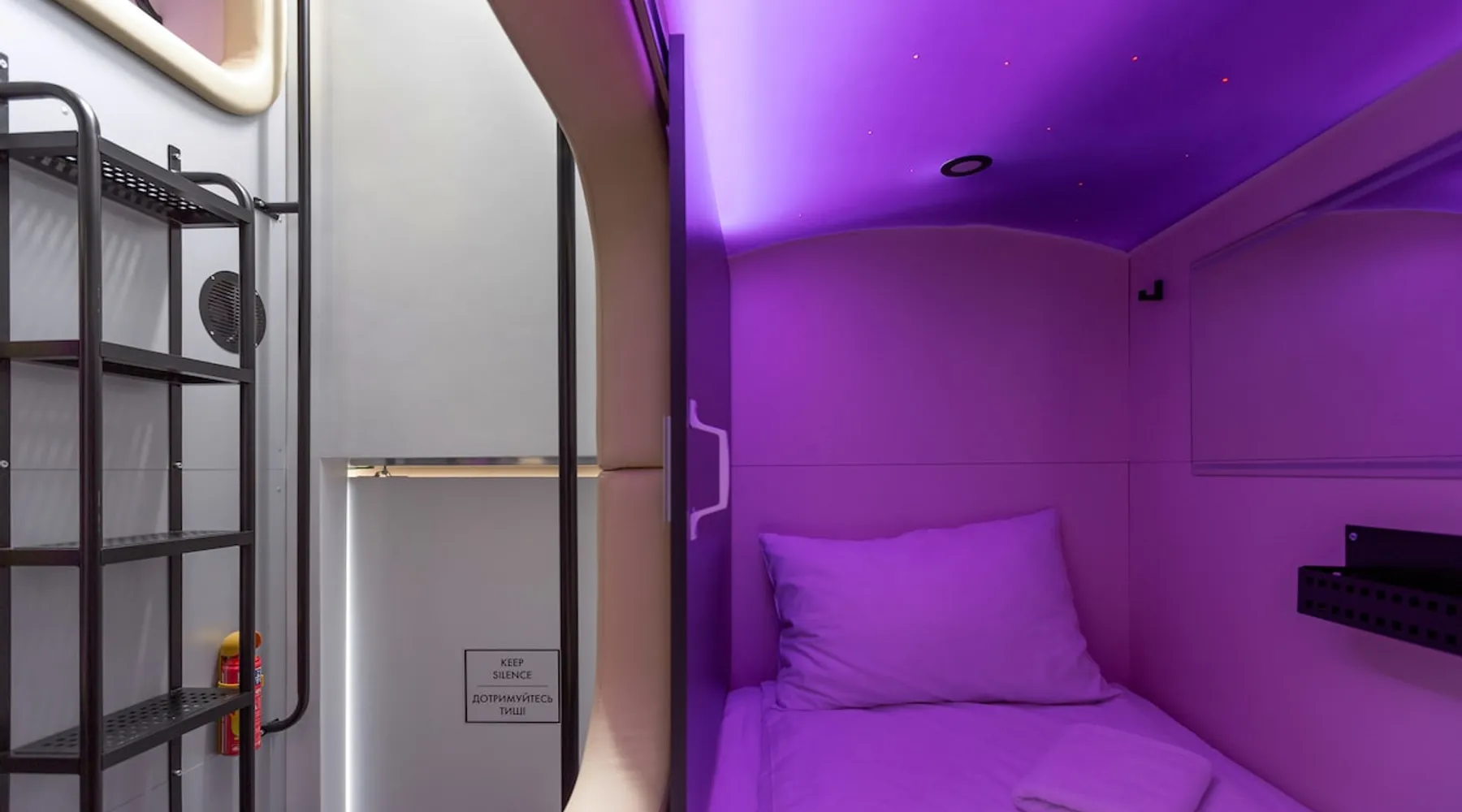 Cozy modern capsule hotel with a 24-hour front desk. The building is located 15 minutes walk to the center of Lviv. It offers an air-fed room with free Wi-Fi. Each is provided with a personal wardrobe, crocs, a towel and an electronic card. There is also a lounge area, shared kitchen and bathrooms. Guest access At your disposal is a cozy capsule in the men's block with everything you need: air conditioning, bed linen, pillow, blanket, orthopedic mattress, Wi-Fi. Also, each guest will be given a personal wardrobe, crocs, a towel and an electronic card. In the common area: TV, movie nights, yoga mats, board games, poufs, ironing board, iron. In the shared kitchen: kettle, refrigerator, dishes, microwave oven, filtered water. In the bathroom: shower gel, cute, hairdryer. You can order additional cleaning, change of bed linen and towels for a fee. Other things to note Standard check-in time is at 14:00 and check-out is at 12:00. If necessary, you can extend late check-out or early check-in for half the price. Dear guests, please note that we are non-smoking.