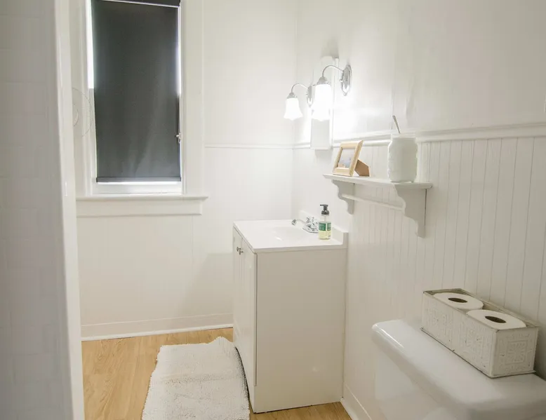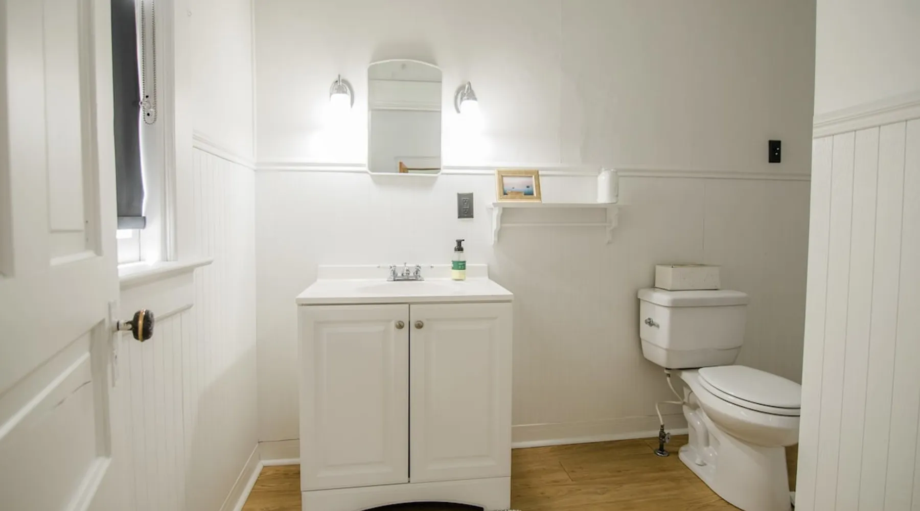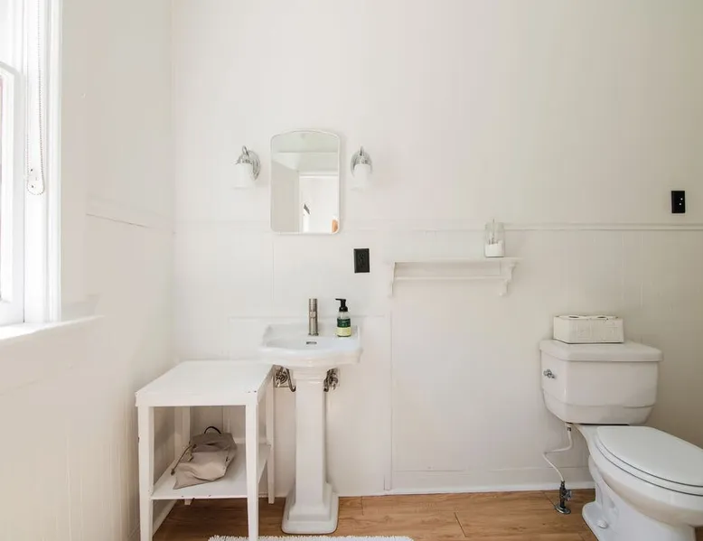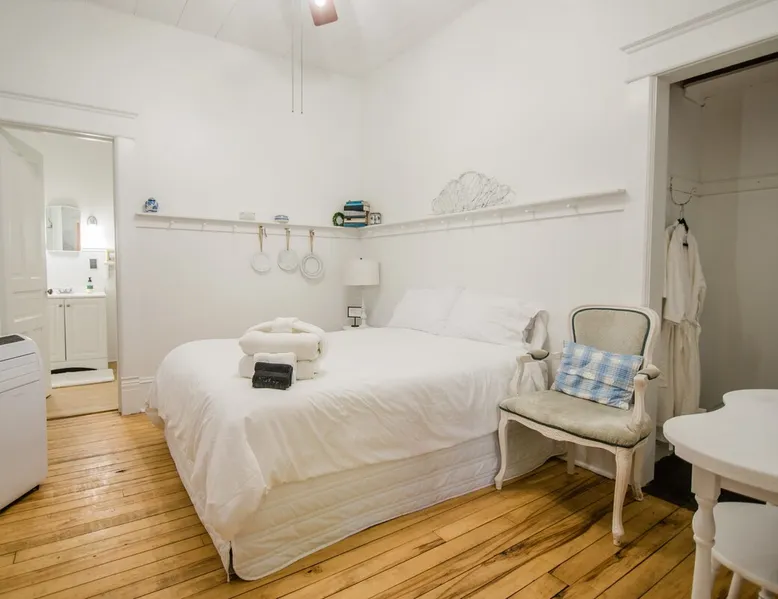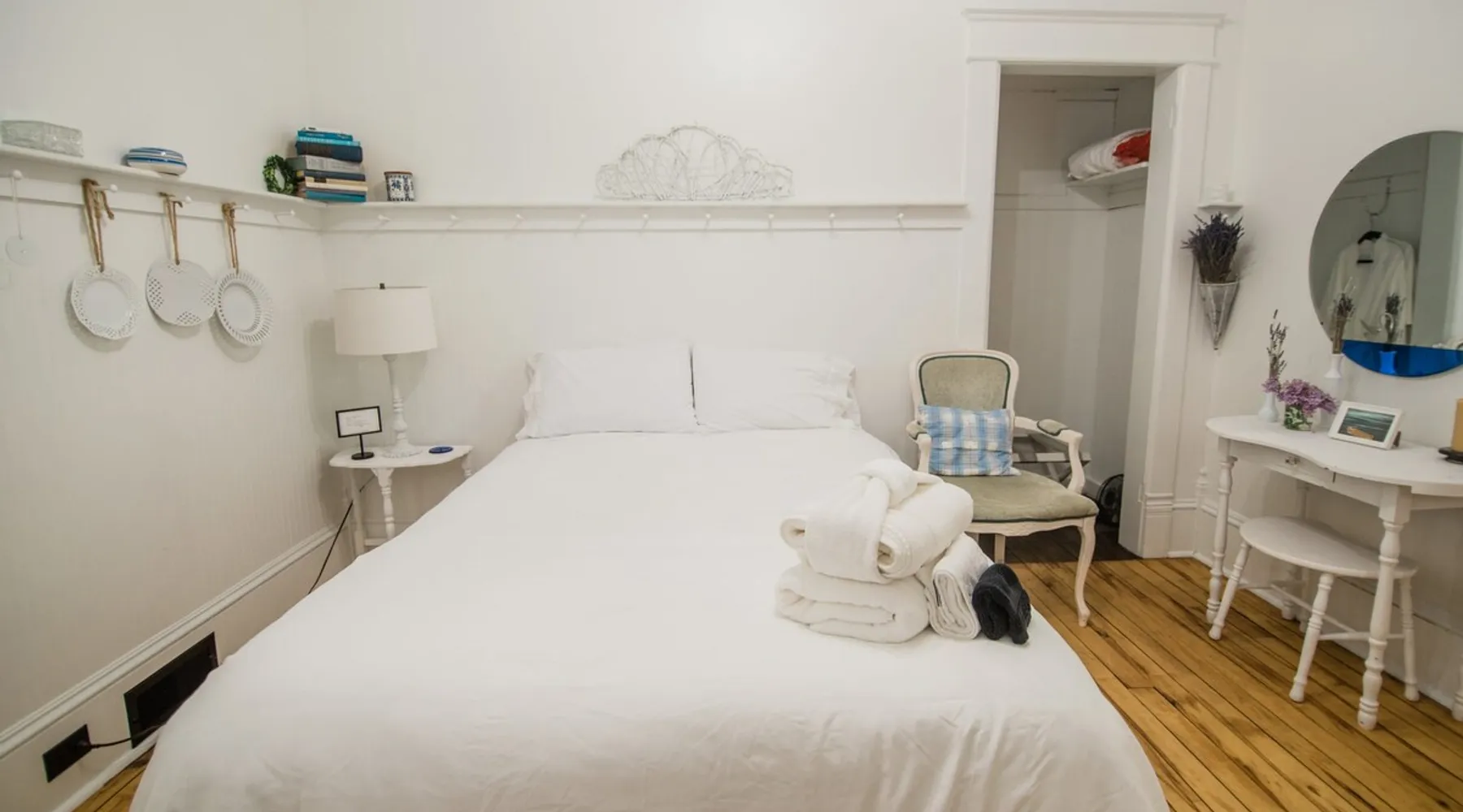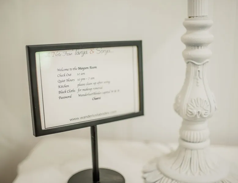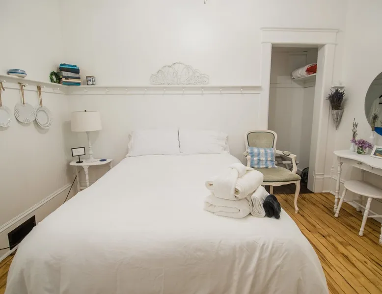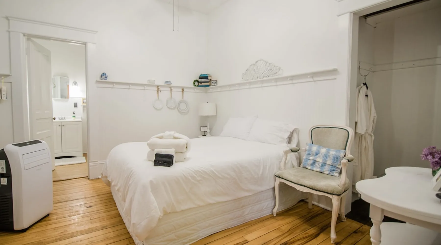 main level | queen | en suite bath & shower The space The Mayson room has thoughtful & varied amenities. In-Room Air Conditioning, Professional Hair Dryer, Boutique Bath Products, Robes, Incredible Linens, Complimentary Wireless Internet, Clothing Steamer, Fan, In-Room Heaters & more available upon request. Other things to note breakfast not included or available - not the best room choice for light sleepers, as it is on the main level - EV charging station 2 blocks from the BW @ the Merrie's Market