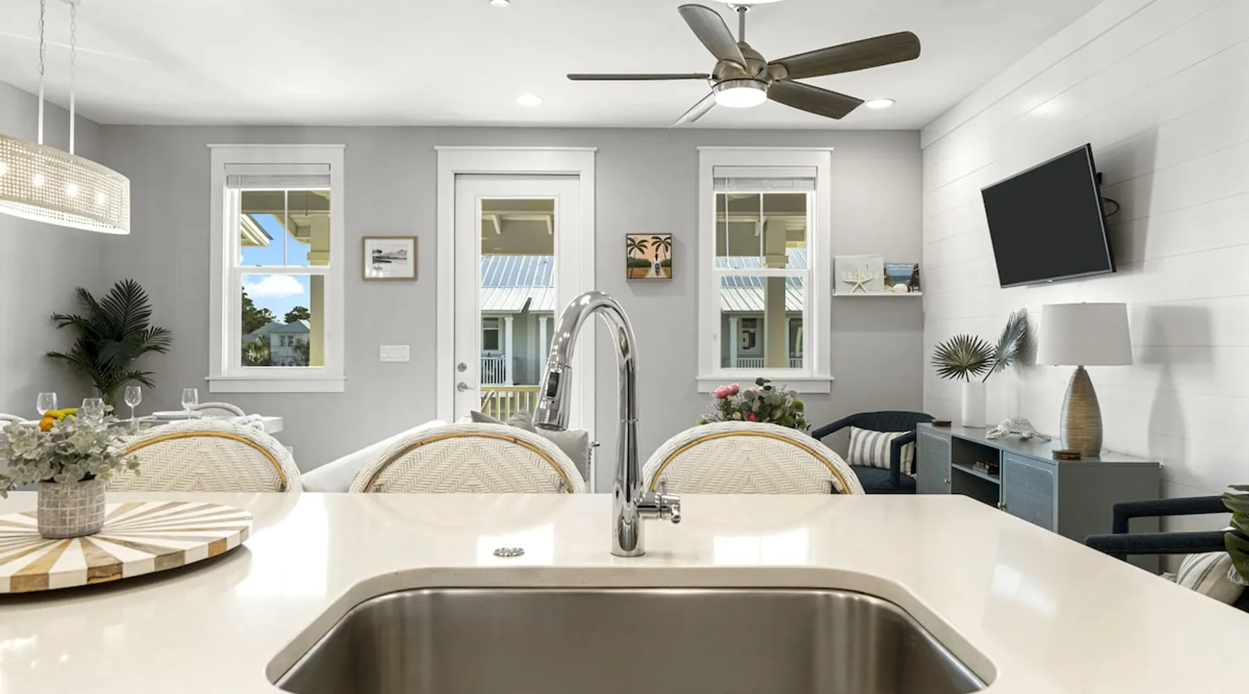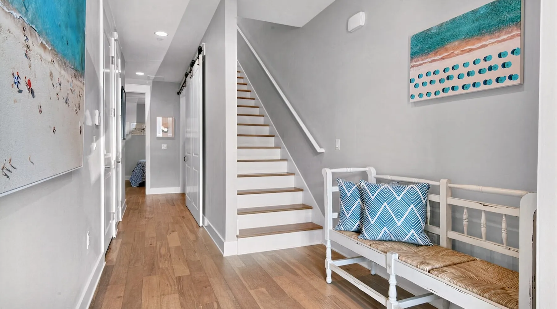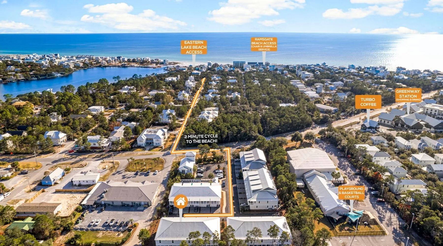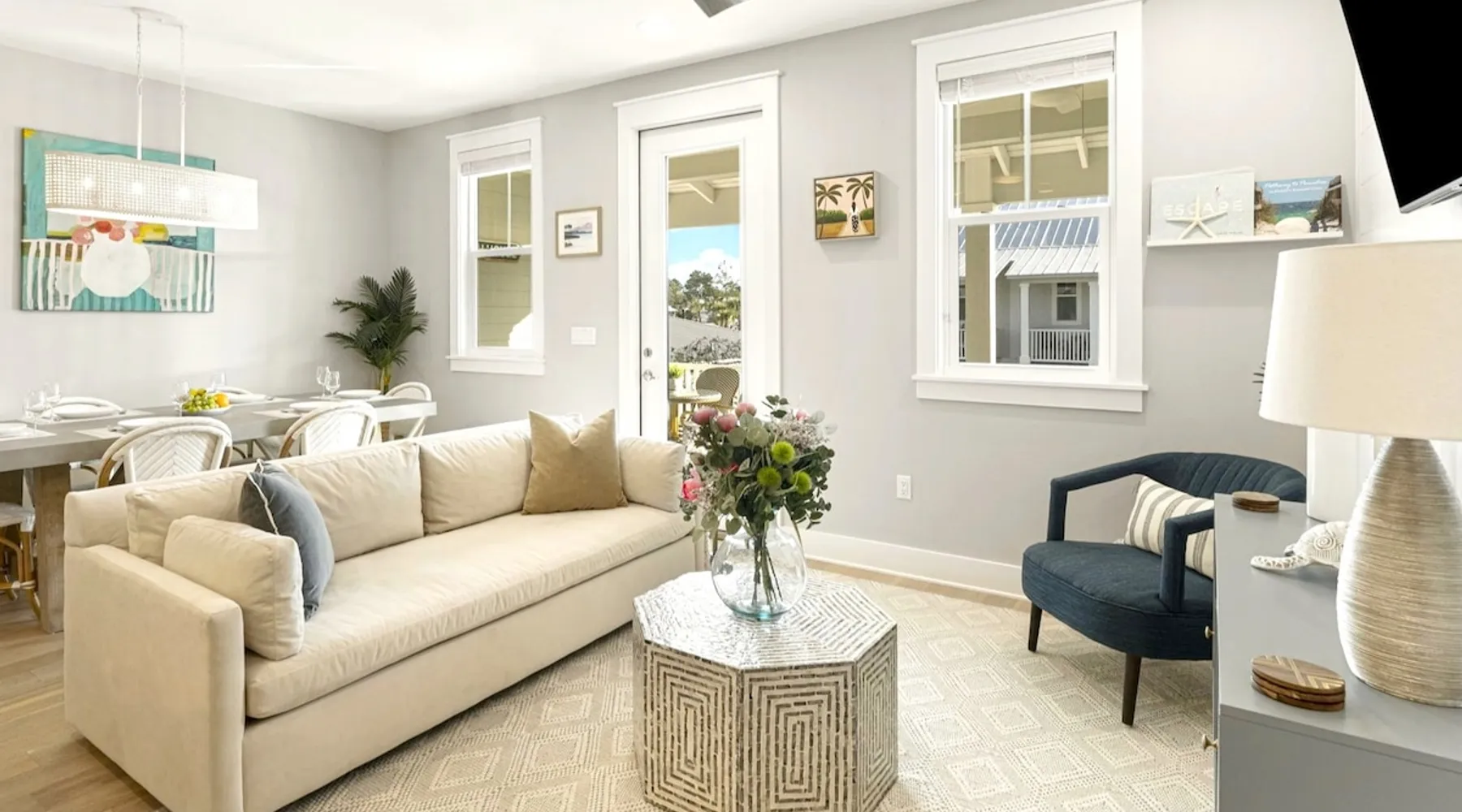 Welcome to Emerald Air, a beautifully decorated two-story townhome in the heart of 30A's Seagrove Beach. The best beaches and restaurants are at your doorstep, along with a community pool and beautiful Eastern Lake. 2 Min Bike or Golf Cart ride to Public Beach Access 2 Min Walk to Greenway Station shopping & dining 4 Min Drive to Deer Lake State Park It’s the perfect place to relax with the whole family and enjoy all Florida has to offer. Experience 30A's Best With Us & Learn More Below! The space KEY FEATURES: ☀ Community Pool 150 ft from your doorstep ☀ Complimentary rental golf cart supplied at property from local vendor ☀ Beach gear including beach chairs, a cooler, boogie boards & a beach umbrella ☀Two-minute walk to Greenway Station featuring coffee shops, restaurants & shopping ☀ Two-minute bike or Golf Cart ride to Eastern Lake Public Beach Access ☀ 3 bedrooms: 1 king, 2 queens, 1 bunk bed ☀ 2 full bathrooms + 1 half bath ☀ Full kitchen w/ stainless steel appliances ☀ Cozy living area w/ flat-screen Smart TV ☀ Private balcony w/dining table and outdoor furniture ☀ Private Patio w/grill + access to community pool ☀ Free parking ☀ In-unit washer & dryer ☀ Complimentary use of 4 adult bikes & 1 Burley Bee ☀ Access to outdoor playground and basketball court ☆☆ BEDROOMS + BATHROOMS ☆☆ This home is perfect for families or small groups, with three full bedrooms plus additional bunk beds built in under the stairwell. There are two bedrooms downstairs and a primary bedroom upstairs on the main level. The primary bedroom features a king-sized bed and a flat-screen Smart TV, large walk-in closet, and an ensuite bathroom with dual sinks and a walk-in shower. The remaining bedrooms are on the first floor and feature queen-sized beds and flat-screen Smart TVs. The additional bunk beds are available outside the two downstairs bedrooms. The bedrooms on the first level share access to the second full bathroom, complete with a shower/tub combo. ☆☆ KITCHEN & LOUNGE ☆☆ The kitchen, dining, and living areas sit on the second floor of the home. The kitchen is equipped with stainless steel appliances and stocked with everything you'll need for preparing meals during your stay. There’s also a dining table with seating for six. ☆☆ Upstairs Balcony ☆☆ The balcony is outfitted with outdoor furniture, perfect for morning coffee or evening happy hour drinks. There’s also a small breakfast table with seating for four if you prefer to dine al fresco. A private backyard patio with a gas grill. ☆☆ Downstairs Patio ☆☆ The private backyard patio features a gas grill and some outdoor seating. ☆☆ The Surrounding Area ☆☆ Eastern Lake Beach Access provides one of the best stretches of public beach in the area, and is a two minute bike ride from the property . There are also several restaurants within walking and cycling distance, including Turbo Coffee, The Salty Butcher, Pecan Jack's, Steamboat Grill 30A, Old Florida Fish House, Beachy Bean, Buddy's Seafood Market, the Perfect Pig, Cafe 30A, and Kahve & Cream. Greenway Station is located just two minutes-walk from the property and offers additional dining and shopping. ★☆ Book Today & Let Us Take Care Of You In Santa Rosa Beach! ☆★ Guest access ☀ Free parking is available in the driveway for up to two vehicles. ☀ Additional parking for a 3rd vehicle is usually available nearby- contact host for details ☀ Garage for storage of bicycles, beach gear and golf cart ☀ Keyless entry through electronic keypad Amenities in the unit include wifi, cable TV and apps, a washer and dryer, a gas grill, Keurig and drip coffee-makers, cookware, spices, a stove, an oven, a microwave, a toaster, a hair dryer, hangers, an iron & ironing board, yoga mats, keyless entry, and more. A free welcome box is provided containing coffee pods & tea bags, detergent & other essentials to get your stay off to a great start. Please note that pets are not allowed, and no smoking or vaping is permitted on the property. Follow us on IG #EmeraldAir30A