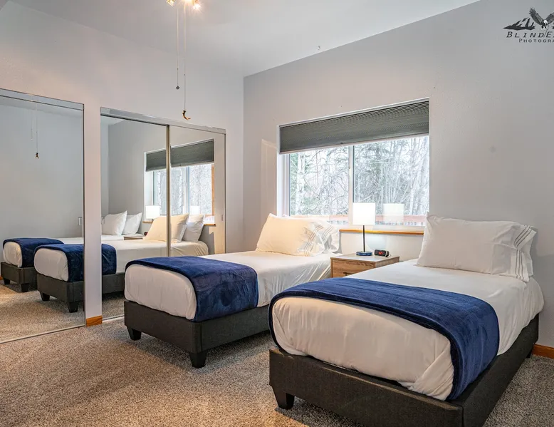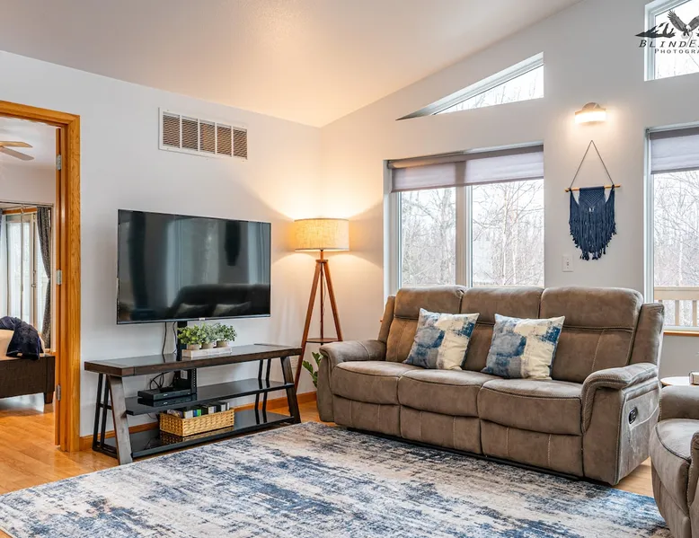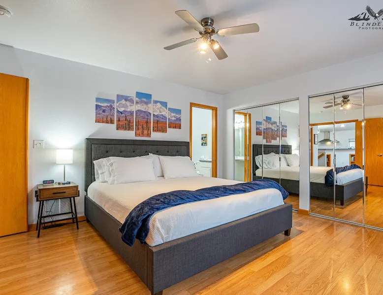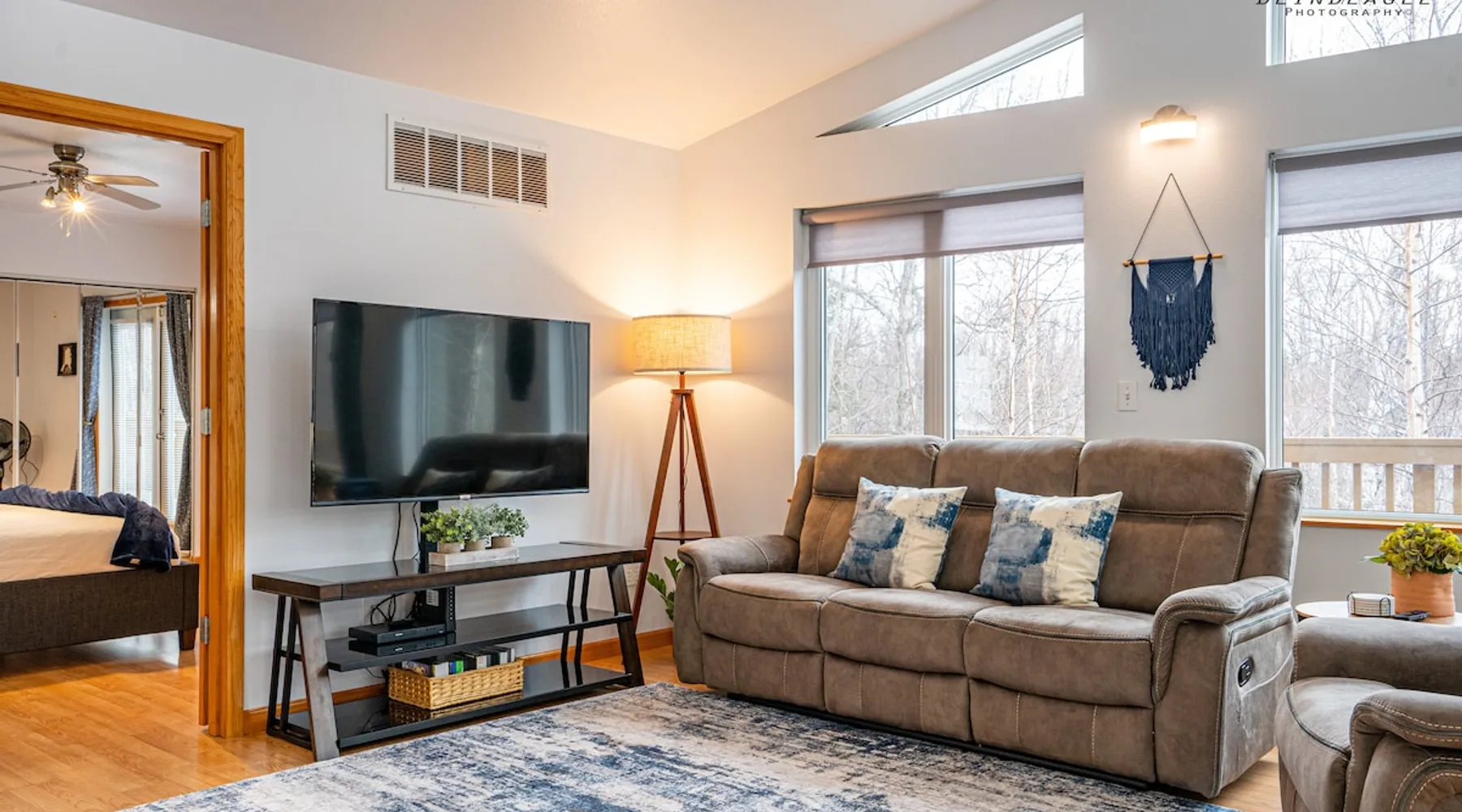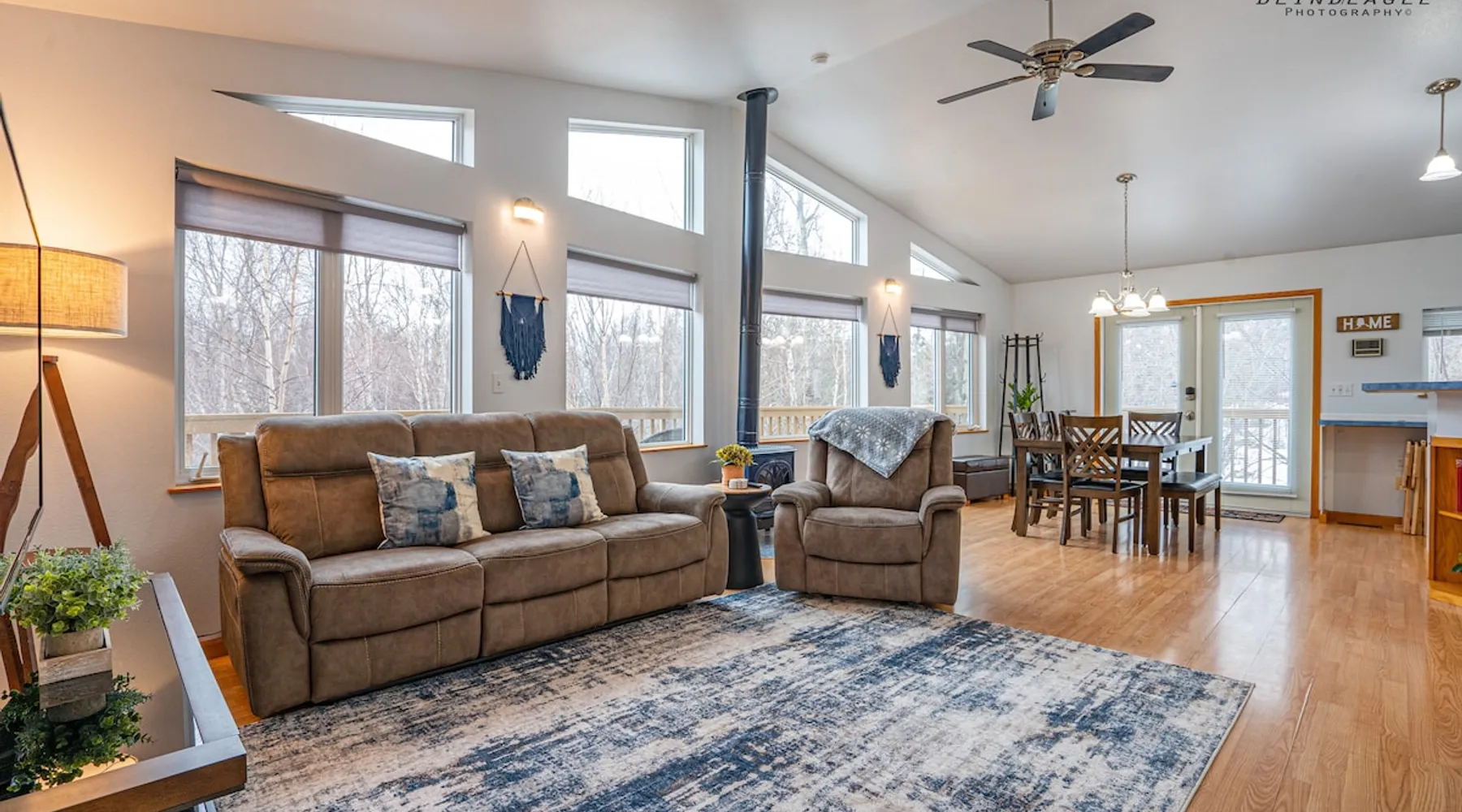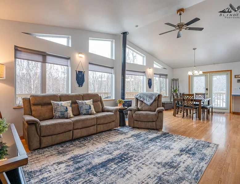 Gather your family, group, or team at the 2,400 sq. ft. Hickory Tree House halfway between Palmer and Wasilla. With 2 living areas, 2 decks, and 2 sets of bedrooms & baths, the layout is perfect for 2 families or groups seeking their own spaces. The little ones will love Kid's Corner with its games, books & more. Enjoy quiet and privacy on the 4 acres of treed, scenic beauty, within close proximity to many attractions and recreational spots. As you follow the illuminated pathway to the guest entrance, you'll be greeted by French doors with a keyless entry system that leads to the open-concept great room. The room boasts cathedral ceilings, an abundance of windows that offer scenic views and natural light, and plush seating for ultimate relaxation. Get cozy by the gas fireplace or enjoy your favorite shows on the 55" streaming TV using your own login credentials. You can also watch a movie from the DVD collection or read a book from the library located in the kitchen island. The fully equipped kitchen with newer appliances provides ample space for meal prep, with a large island, plentiful counter space, double sinks, and a chef-preferred gas range. Additionally, you'll find small appliances like a toaster, coffeemaker, slow cooker, rice cooker, and blender, as well as a convenient coffee station with Keurig and complimentary K-cups. The dining table seats 8 guests (plus included TV trays) and offers spectacular views. Outside, there are two decks where you can enjoy the scenic beauty while unwinding. The property has four acres of treed land, plus nearby hiking trails and recreational activities provide ample entertainment. You'll sleep comfortably in any of the six available beds, with two bedrooms on each level plus a queen sofa-bed in the lower-level living area. The upper level offers a king bed with access to the upper deck and a second bedroom with two twin beds. The bathroom with double vanities and a large shower is shared between the two bedrooms. The lower level has two more bedrooms, one with a queen bed and the other with two twin beds, a bathroom with dual sinks, a jetted tub, and a walk-in shower. The lower level also has a living area with a smart TV, a pull-out queen sleeper sofa, and a workspace for remote work. The kid's corner is perfect for children, with beanbag chairs, toys, puzzles, and games to keep them entertained. You are welcome to use the entire house, including both the upper and lower decks, as well as the yard. Please note that the garage, shed, utility room, and storage closet are locked to guests. We prioritize your privacy and comfort and aim to facilitate a hassle-free and pleasurable stay. Should you have any inquiries or issues during your visit, please do not hesitate to contact us. The Hickory Tree House is situated in Palmer, right in the middle of the stunning and picturesque Mat-Su Valley. It's conveniently located off a main highway and is only a short distance away from various recreational opportunities and popular attractions. Distances to nearby attractions: – Williams Reindeer Farm: 14 miles – The Musk Ox Farm: 8 miles – Pioneer Falls Trailhead: 18.2 miles – Arkose Brewery: 8 miles – Alaska Backcountry Tours: 16 miles – New Wave Watersports: 5 miles – Knik Glacier Tours: 26 miles – Noisy Goose Cafe: 7 miles – Turkey Red Restaurant: 7 miles – Downtown Palmer: 6 miles – MTA Event Center (hockey): 7 miles – Downtown Wasilla: 6 miles – Alaska State Fair: 8 miles – Palmer Municipal Airport: 8 miles – Settlers Bay Golf Course: 15 miles – Skeetawk Ski Area: 14 miles – Hatcher Pass: 20 miles – JBER: 37 miles – Anchorage: 43 miles – Anchorage Aurora Quest Northern Lights Tour: 50 miles – Ted Stevens International Airport: 48 miles – Matanuska Glacier: 50 miles – Talkeetna: 76 miles – Seward: 167 miles – Exit Glacier and Kenai Fjords National Park: 172 miles – Denali National Park: 200 miles – Kenai: 198 miles – Wrangell-St. Elias National Park: 211 miles – Valdez: 259 miles – Homer: 263 miles – Delta Junction: 296 miles – Fairbanks: 321 miles – North Pole: 333 miles – Arctic Circle sign: 514 miles The residence is situated in a peaceful, well-established neighborhood near a main highway that is only a brief drive to shopping and dining options in Palmer or Wasilla. If you are traveling from out of state, we suggest renting a car as public transportation is limited. While a 4-wheel drive vehicle is not essential during the warmer months, it is preferable during the winter months.. The gravel driveway has sufficient space for parking up to 4 vehicles. On-street parking is not permitted. We welcome longer stays, travel nurses, military families relocating, digital nomads, and families needing temporary housing due to insurance claims. Please don't hesitate to contact us with questions or for further information. We love pets and welcome one well-behaved and non-aggressive family dog. We kindly request that pets are not allowed on the furniture or the carpet or left unattended in the home. Pets must be on a leash when outdoors, and pet owners are responsible for any damages and cleaning up after their pets. Please keep the lower-level door closed as pets are not allowed on the carpet. If you have a second dog, please contact us for authorization prior to booking. Our home is kid-friendly, and we have provided a Kid's Corner in the lower level with toys, games, and books for kids to enjoy. However, please note that the home is not completely child-proof, as there is a staircase leading to the lower level, a fireplace in the main living area, and several closet doors that have mirrored glass. Please use discretion to determine if our home is appropriate for your family. For your peace of mind, we recommend purchasing travel insurance from a reliable carrier for your trip. As per Airbnb regulations, we do not permit parties or events on the property.