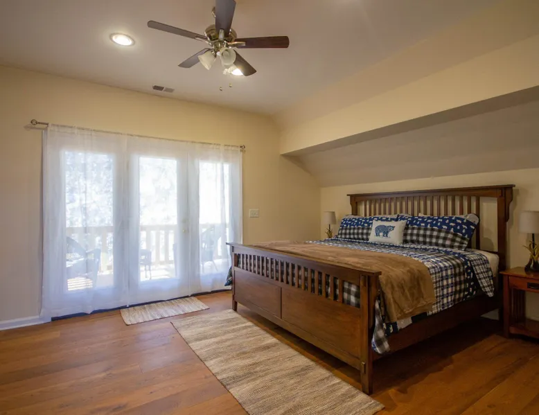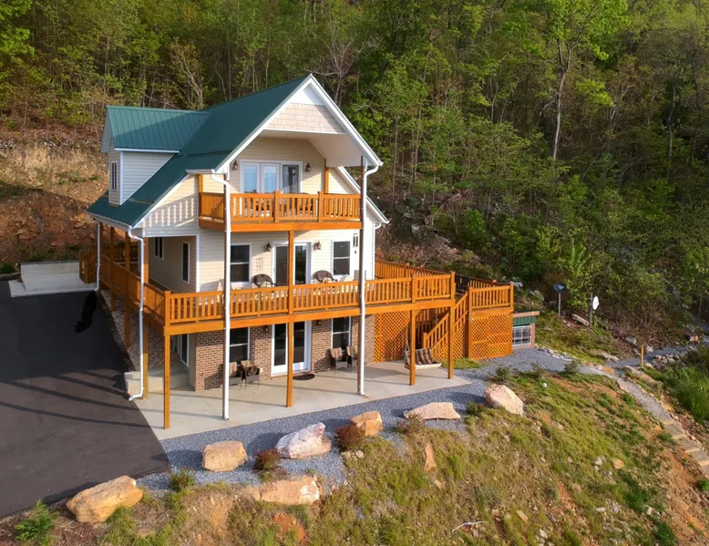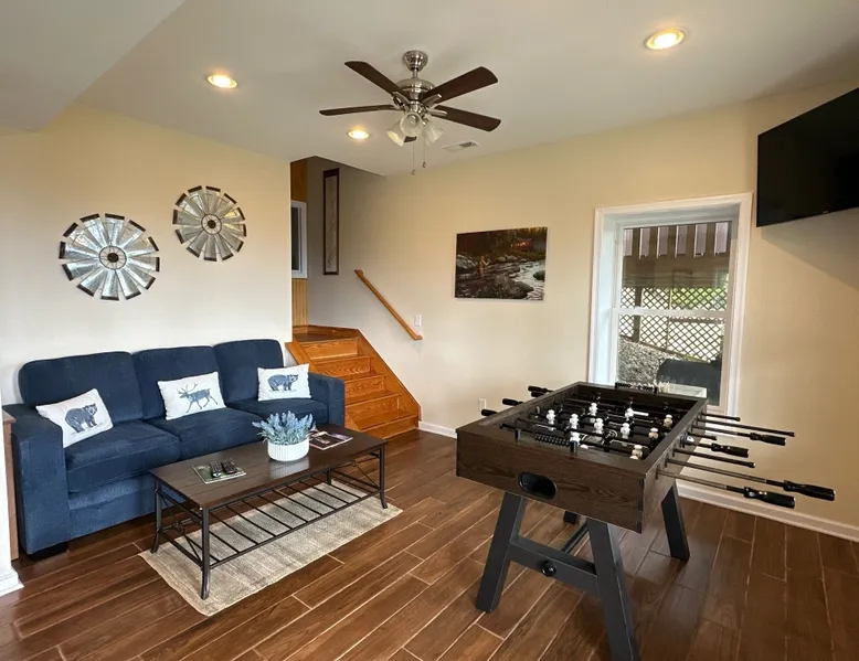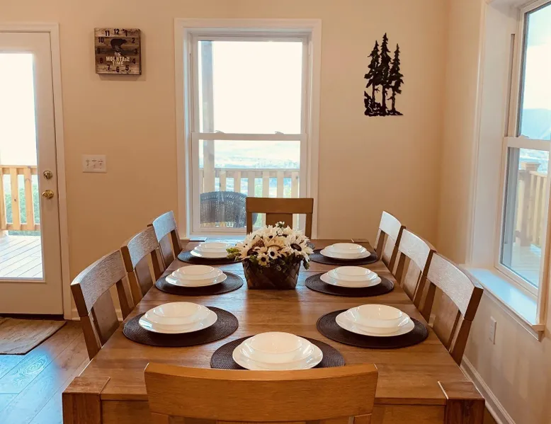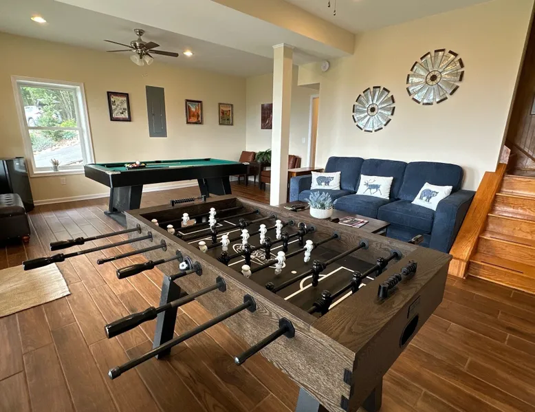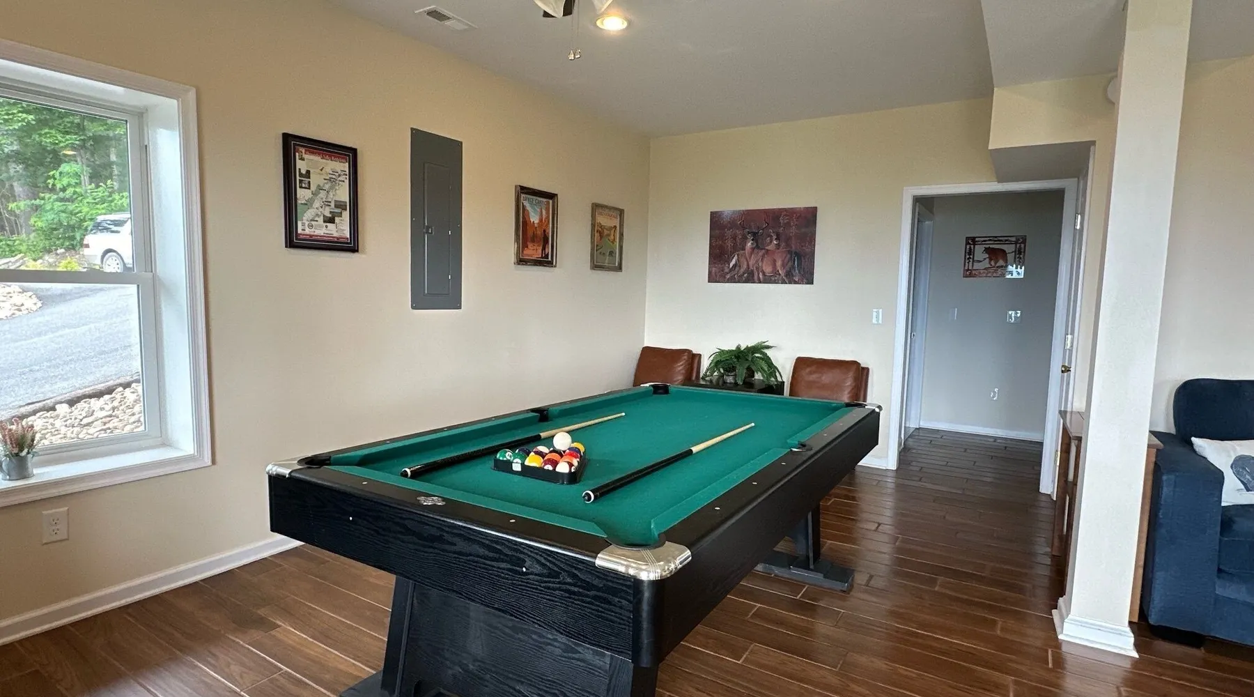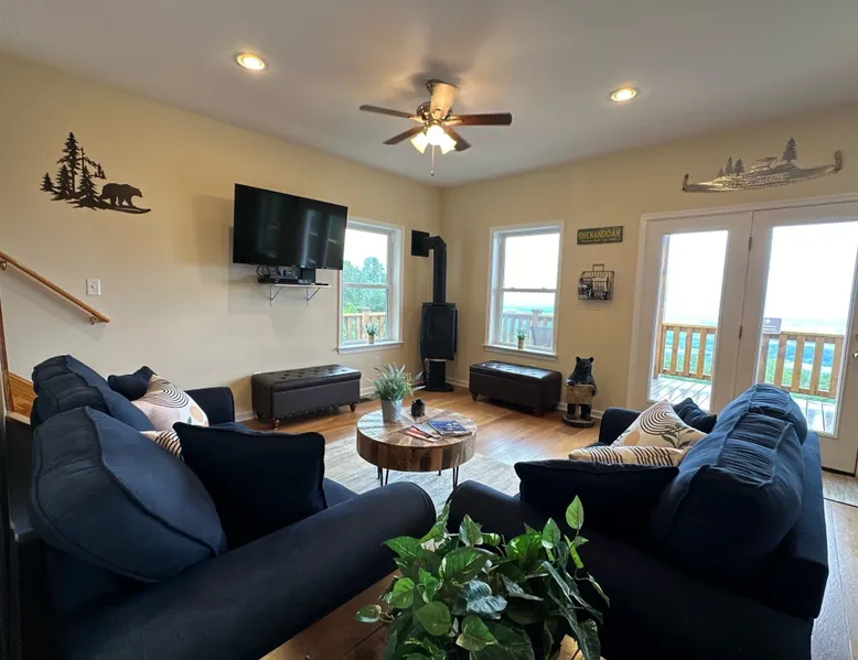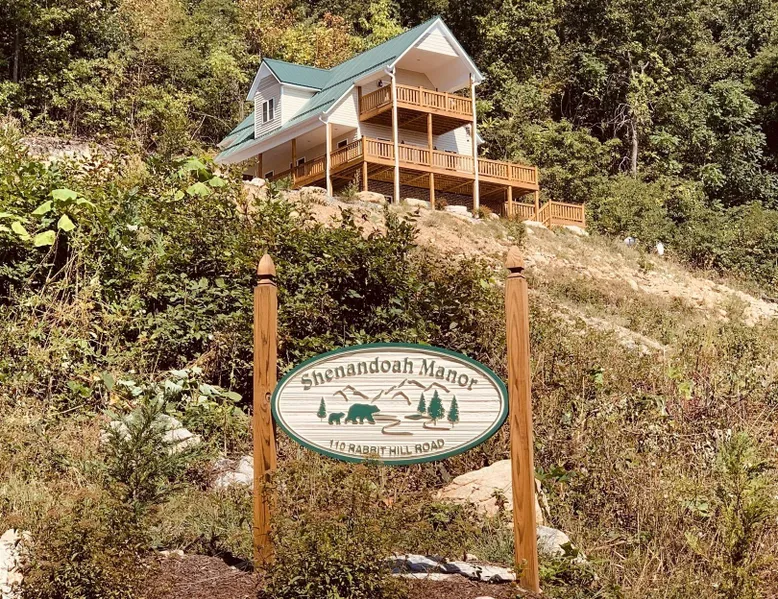 **Just installed- EV Charger- charge your electric vehicle right at the property!** Designed specifically for guests as a resort-style property, Shenandoah Manor is the perfect place for your getaway. Privacy, seclusion, and relaxation are just some of the things you'll find here, along with an abundance of wildlife- black bears, foxes, coyotes, raptors, deer, owls, wild turkeys, rabbits, and raccoons. Just a few short steps from the back door of Shenandoah Manor, you will find the George Washington National Forest, which offers opportunities for nature walks, hiking, and enjoying the peacefulness of nature. Recently built, no expense was spared in building a getaway that your family, friends, or group will talk about for years. This lodge is just a few miles from downtown Luray, the mighty Shenandoah River, and the National Park. Located at almost 2000 feet in mountain elevation, Shenandoah Manor offers fantastic views of Shenandoah National Park and surrounding George Washington National Forest- along with beautiful four-season views of the Shenandoah River. Two king, two queen, 1 full bed and 4 twin beds will comfortably sleep 14. The kitchen offers modern cooking, double ovens, a refrigerator, a dishwasher, and everything you need for a great meal. If you'd rather cook outside, we've got you covered with a gas grill. Challenge each other to a game of horseshoes or cornhole (cornhole is available during the summer months)! Go fishing in the pond! Sit around the fire pit, relaxing and toasting marshmallows. New Feature! A playground for the kids has just been added- they can swing and slide to their hearts' content! On rainy days, there is still plenty to do inside. With a game room featuring a pool table and foosball table, you'll be having fun for hours! Free, fast Wifi internet and Dish TV with hundreds of channels will keep you connected. There is a landline phone with free local and long-distance calls. There are board games to rummage through. Everywhere you turn, this house has what you're looking for! The property is also close to a host of attractions, including Luray Caverns, Cooter's Dukes of Hazzard Museum, The Civil War Museum, and more! Some things to note about Shenandoah Manor: Check-in is at 3:00 p.m., and check-out is at 11:00 a.m. Early check-in or late check-out may be available; feel free to ask us! Please try to limit the number of cars per reservation to 5 or fewer. The base rate includes 4 guests. Additional guests are extra. Please read the itemized charges carefully! Dogs are welcome! The weight limit is 50 pounds per dog, and the pet fee is $75 per dog. Unfortunately, we can't accept cats. Sorry about that! PLEASE NOTE: During winter months, a four-wheel drive (4WD) or all-wheel drive (AWD) vehicle is required. Shenandoah Manor has a security camera located on the property, which is pointed toward the driveway.