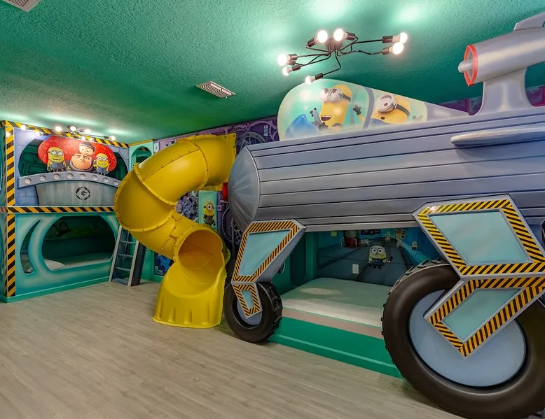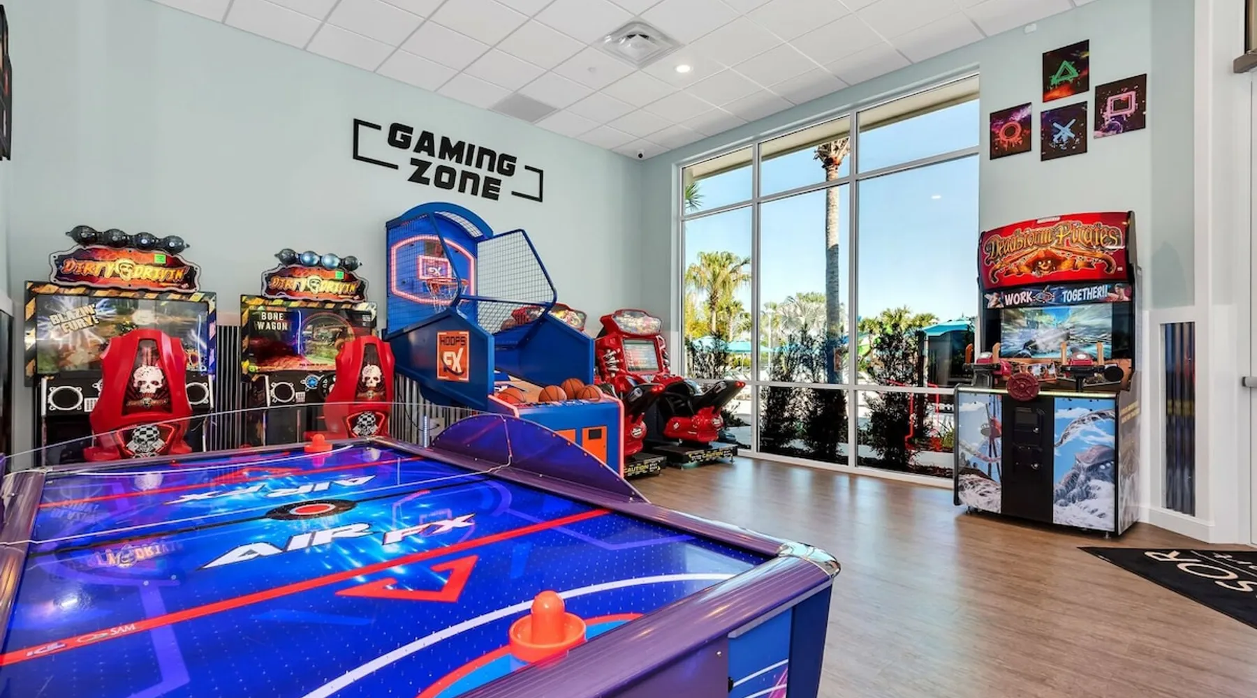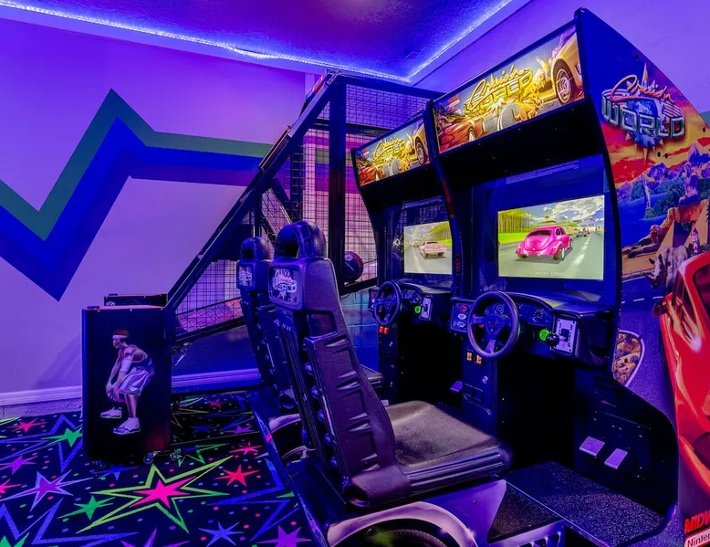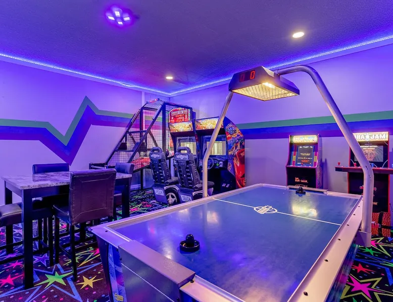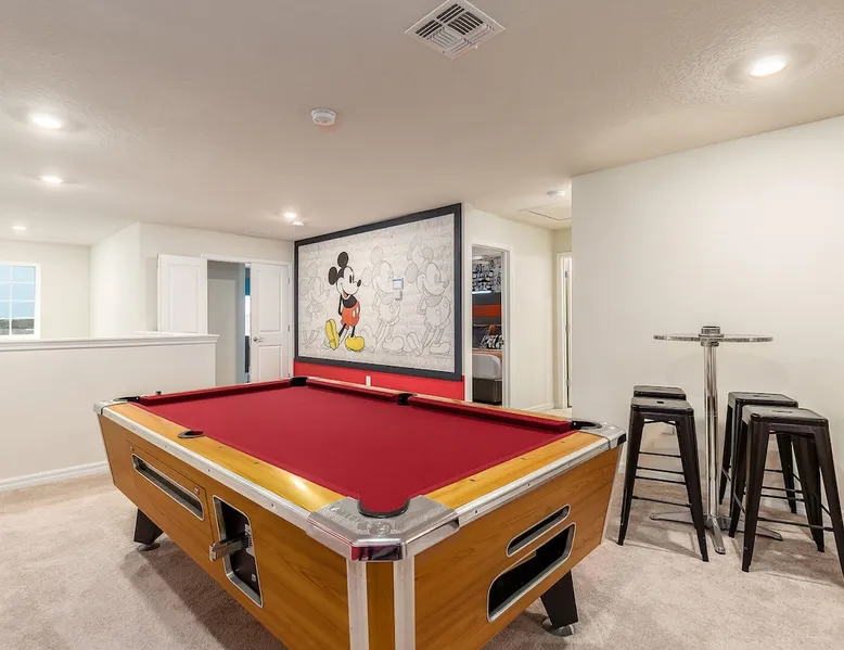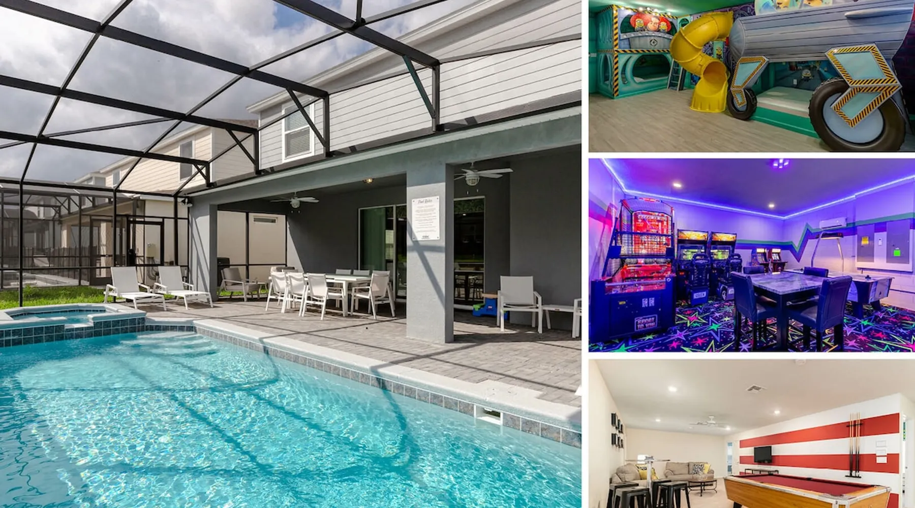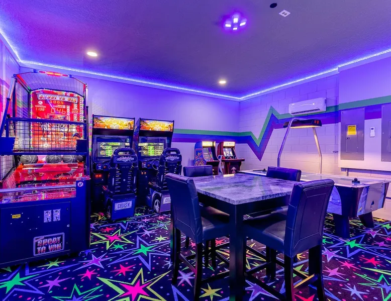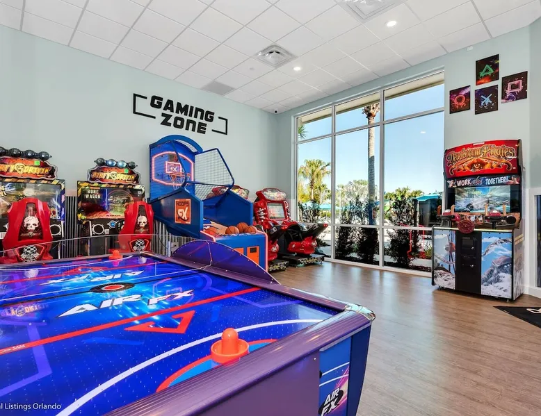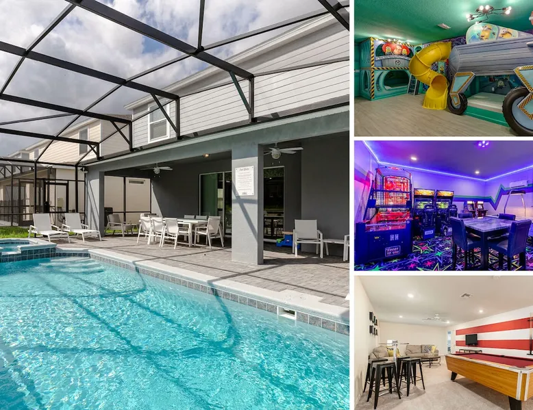 Photos updated: July 2023 Vacation in paradise at Windsor Island Luxury, a 7-bedroom, 6-bath elite villa featuring a game room, loft, custom-built kids rooms, and private screened-in pool situated in Orlando's newest vacation home community, Windsor Island Resort (newly-built, photos coming soon). The space Vacation in paradise at Windsor Island Luxury, an 7-bedroom, 6-bath elite villa featuring a game room, loft, custom-built kids rooms, and private screened-in pool situated in Orlando's newest vacation home community, Windsor Island Resort (newly-built, photos coming soon). Step inside this beautifully-built villa and be greeted by the front foyer that leads to the main area of the home. The fully equipped kitchen features everything you need to create the greatest meals on your magical vacation with kitchen barstool seating for six, perfect for the whole family. Look over to your left and you'll notice a welcoming dining room space. This area offers seating for eight, including two sofa tables and plenty of room for the family to dine at any time of day. The modern-designed gathering room is perfect for lounging after a fun day at the parks with plenty of spacious seating and a 75-inch SMART TV to watch your favorite movies and TV shows on. Don't just admire the view from the living area of your spectacular private screened-in pool deck, become immersed in it as soon as you step past the sliding doors. This modern pool deck comes with the latest furnishings, including an extra-large dining table with room for eight guests. Have a relaxing, well-deserved day by the pool at one of the four sun loungers or two comfy sitting chairs at your leisure. There's even a picnic table for the little ones to enjoy when having a delicious meal by the pool. Head back indoors to discover one of the most thrilling rooms in this home. The first-floor arcade room features some of the most popular arcade games around, like NBA Arcade, Deer Hunter, Basketball Arcade, Dynamo Air Hockey, and many more. Spend time with the family as they challenge one another on these exciting games at the high-top table seating for four, perfect for chowing down on a meal or lounging. For the adults, the upstairs loft features a spacious sectional sofa for lounging and a pub table set with seating for four. Turn on the 75-inch SMART TV for hours of entertainment. Put on your favorite sports team's live game or play your favorite music to enhance the atmosphere. And while the TV plays, test your skills on the pool table amongst your family and friends. There's never a dull moment in this upstairs loft! When it's time to wind down after a day full of fun, choose from one of the seven spacious bedrooms. Choose from the first master suite and bedroom two, both on the first floor, or head upstairs for the rest of the charming bedrooms. Guests even have the option of catching their z's in a superhero-inspired king bedroom, a galaxy-inspired king bedroom, and for the little ones, a mischievous character-inspired room will be the talk of the vacation! All bedrooms come equipped with a 50-inch SMART TV, with the two master bedroom suites featuring a 55-inch SMART TV. A luxury getaway is a lot closer than you think. Experience Orlando's newest vacation home community in style and book your stay at Windsor Island Luxury today! Disclaimer: This is a brand new rental community. Some amenities are still under construction and are not available for use yet.