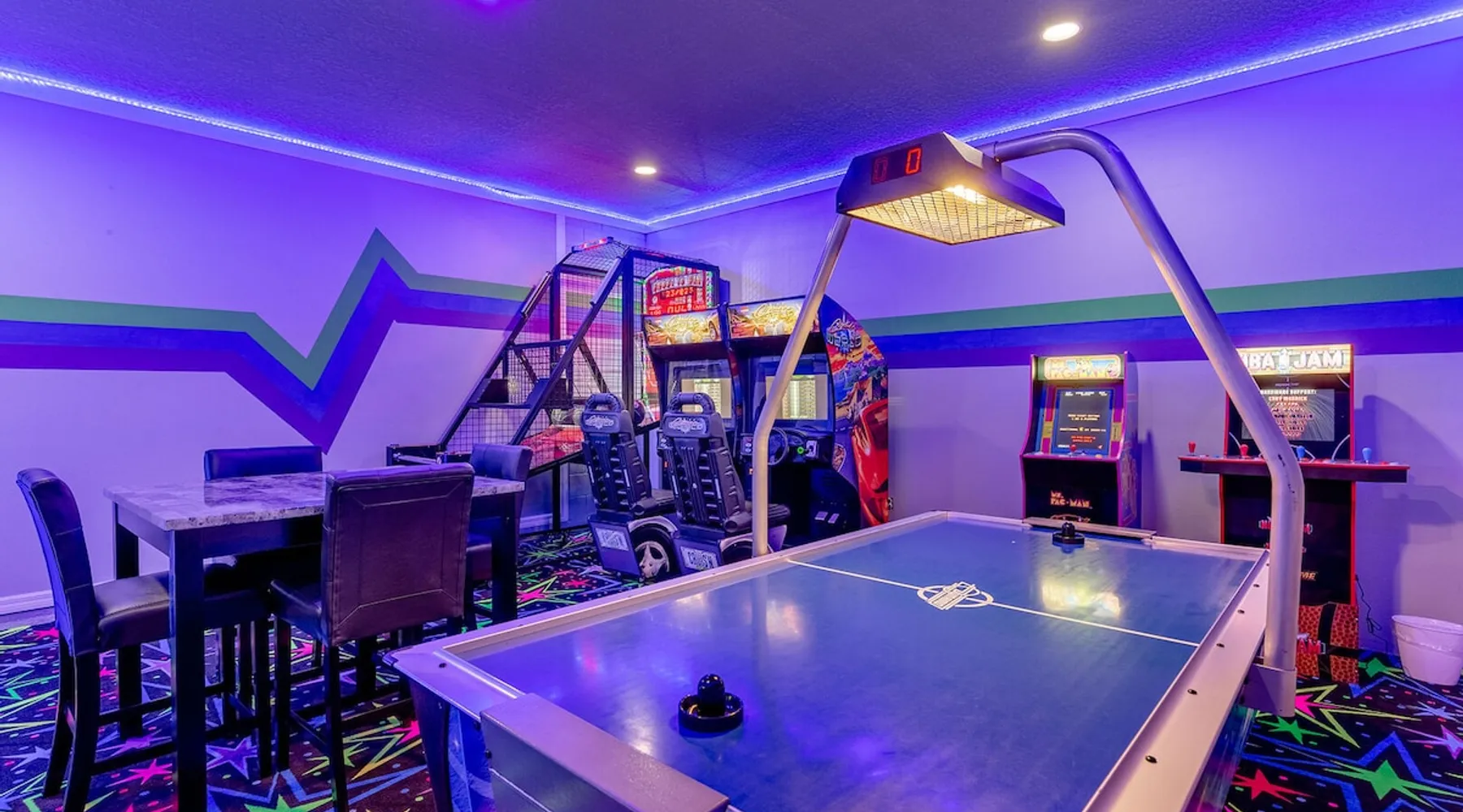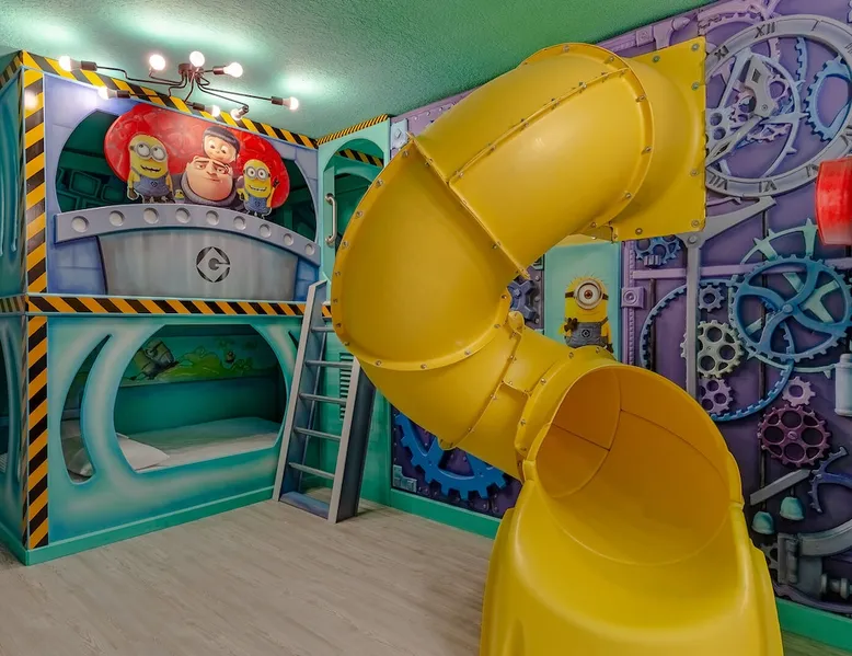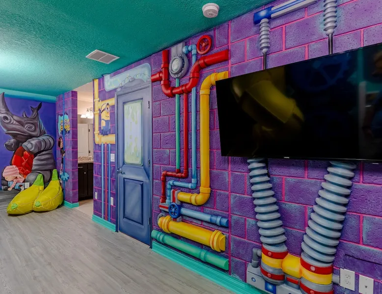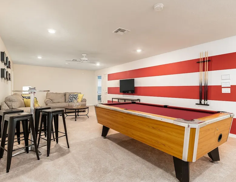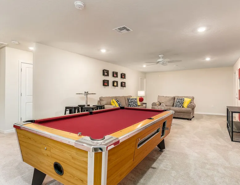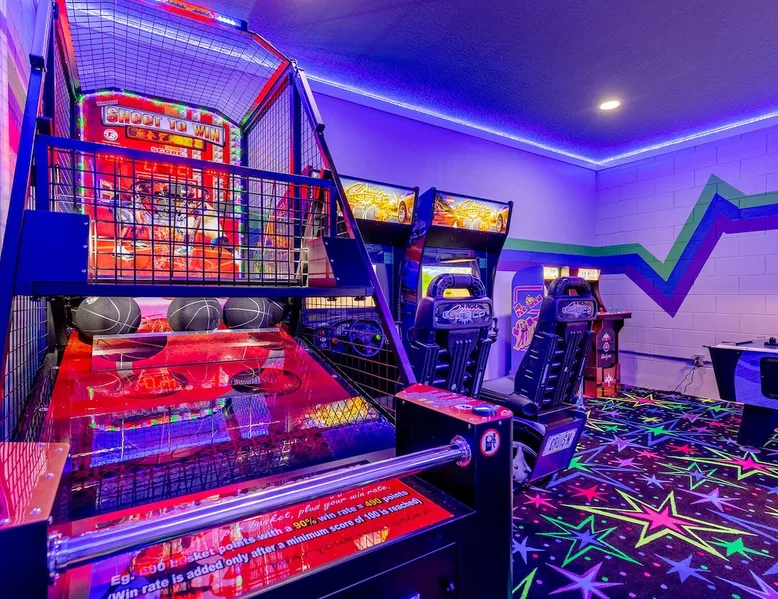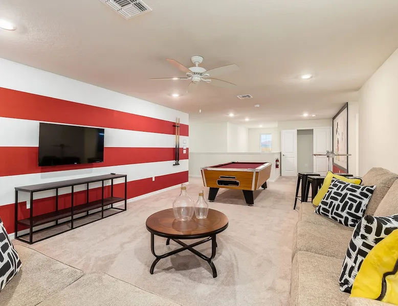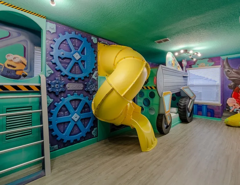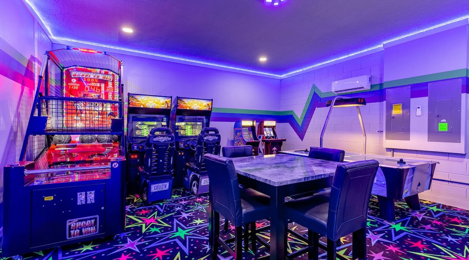 Photos updated: July 2023 Vacation in paradise at Windsor Island Luxury, a 7-bedroom, 6-bath elite villa featuring a game room, loft, custom-built kids rooms, and private screened-in pool situated in Orlando's newest vacation home community, Windsor Island Resort (newly-built, photos coming soon). The space Vacation in paradise at Windsor Island Luxury, an 7-bedroom, 6-bath elite villa featuring a game room, loft, custom-built kids rooms, and private screened-in pool situated in Orlando's newest vacation home community, Windsor Island Resort (newly-built, photos coming soon). Step inside this beautifully-built villa and be greeted by the front foyer that leads to the main area of the home. The fully equipped kitchen features everything you need to create the greatest meals on your magical vacation with kitchen barstool seating for six, perfect for the whole family. Look over to your left and you'll notice a welcoming dining room space. This area offers seating for eight, including two sofa tables and plenty of room for the family to dine at any time of day. The modern-designed gathering room is perfect for lounging after a fun day at the parks with plenty of spacious seating and a 75-inch SMART TV to watch your favorite movies and TV shows on. Don't just admire the view from the living area of your spectacular private screened-in pool deck, become immersed in it as soon as you step past the sliding doors. This modern pool deck comes with the latest furnishings, including an extra-large dining table with room for eight guests. Have a relaxing, well-deserved day by the pool at one of the four sun loungers or two comfy sitting chairs at your leisure. There's even a picnic table for the little ones to enjoy when having a delicious meal by the pool. Head back indoors to discover one of the most thrilling rooms in this home. The first-floor arcade room features some of the most popular arcade games around, like NBA Arcade, Deer Hunter, Basketball Arcade, Dynamo Air Hockey, and many more. Spend time with the family as they challenge one another on these exciting games at the high-top table seating for four, perfect for chowing down on a meal or lounging. For the adults, the upstairs loft features a spacious sectional sofa for lounging and a pub table set with seating for four. Turn on the 75-inch SMART TV for hours of entertainment. Put on your favorite sports team's live game or play your favorite music to enhance the atmosphere. And while the TV plays, test your skills on the pool table amongst your family and friends. There's never a dull moment in this upstairs loft! When it's time to wind down after a day full of fun, choose from one of the seven spacious bedrooms. Choose from the first master suite and bedroom two, both on the first floor, or head upstairs for the rest of the charming bedrooms. Guests even have the option of catching their z's in a superhero-inspired king bedroom, a galaxy-inspired king bedroom, and for the little ones, a mischievous character-inspired room will be the talk of the vacation! All bedrooms come equipped with a 50-inch SMART TV, with the two master bedroom suites featuring a 55-inch SMART TV. A luxury getaway is a lot closer than you think. Experience Orlando's newest vacation home community in style and book your stay at Windsor Island Luxury today! Disclaimer: This is a brand new rental community. Some amenities are still under construction and are not available for use yet.