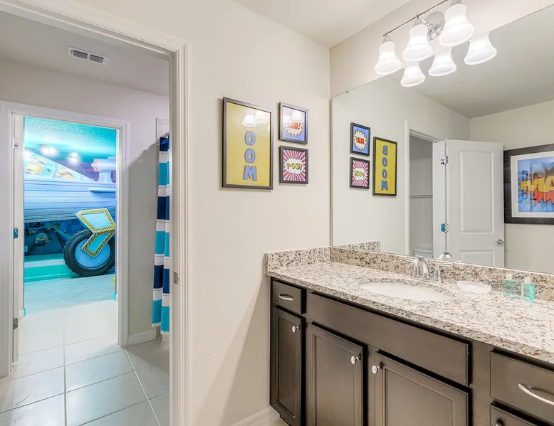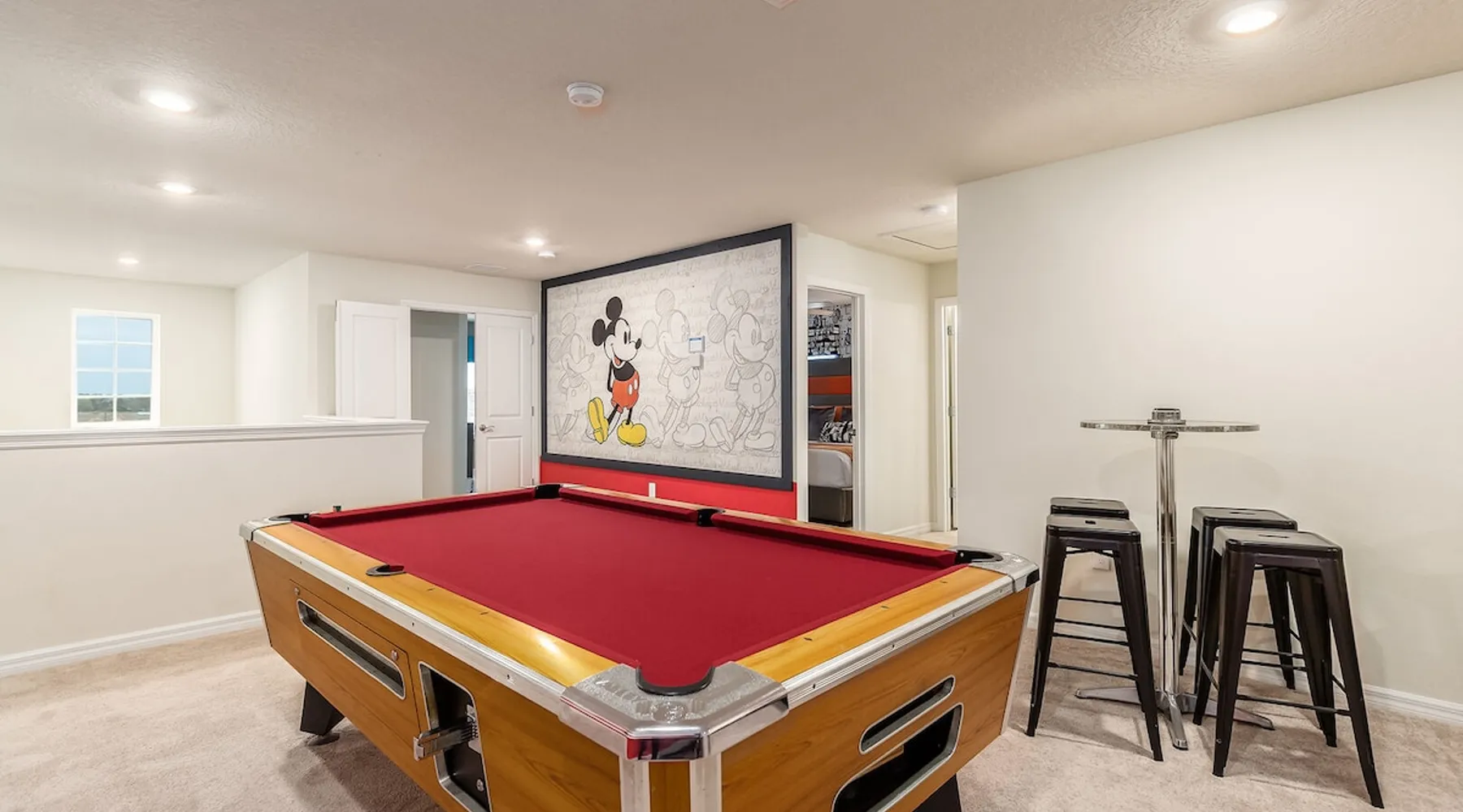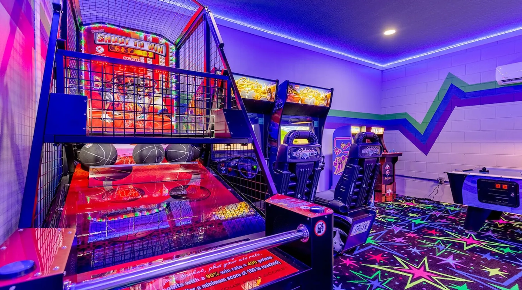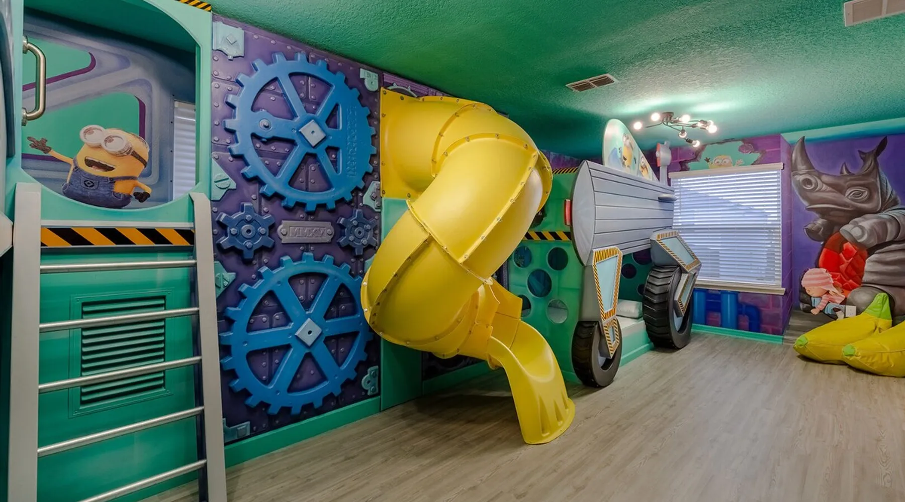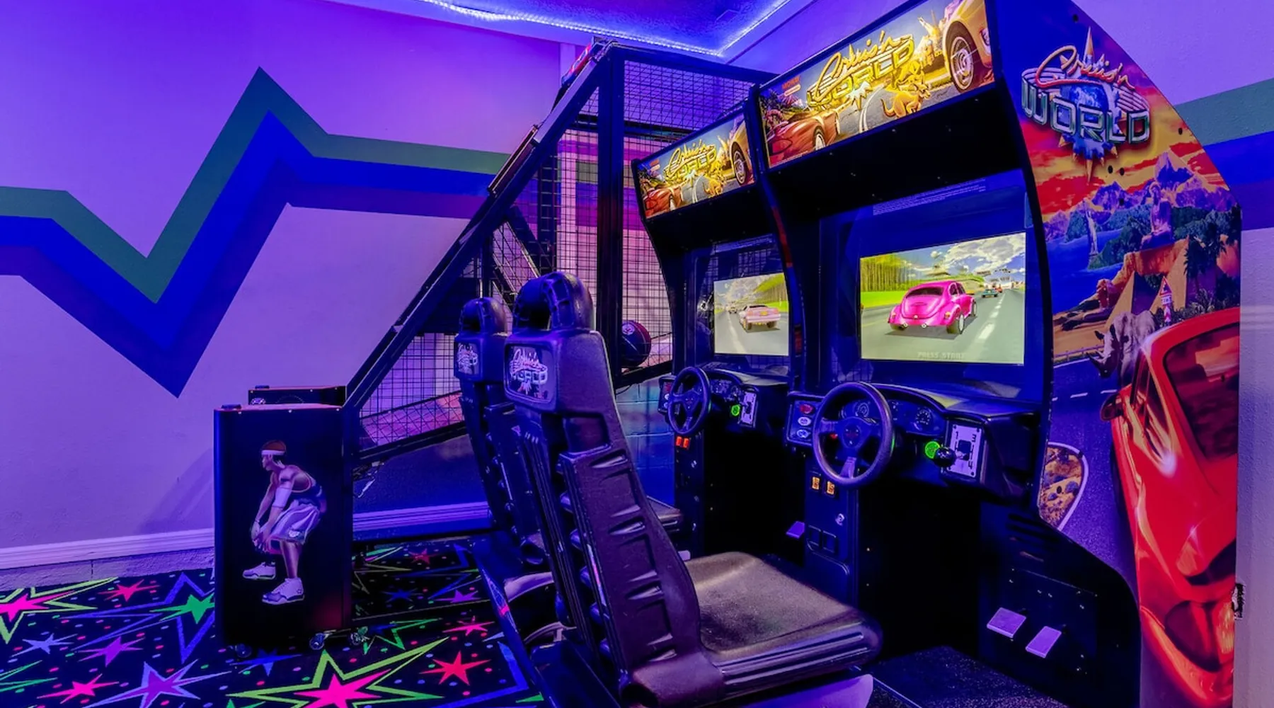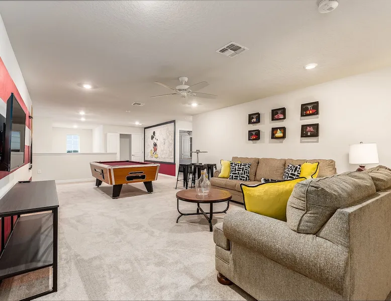 Photos updated: July 2023 Vacation in paradise at Windsor Island Luxury, a 7-bedroom, 6-bath elite villa featuring a game room, loft, custom-built kids rooms, and private screened-in pool situated in Orlando's newest vacation home community, Windsor Island Resort (newly-built, photos coming soon). The space Vacation in paradise at Windsor Island Luxury, an 7-bedroom, 6-bath elite villa featuring a game room, loft, custom-built kids rooms, and private screened-in pool situated in Orlando's newest vacation home community, Windsor Island Resort (newly-built, photos coming soon). Step inside this beautifully-built villa and be greeted by the front foyer that leads to the main area of the home. The fully equipped kitchen features everything you need to create the greatest meals on your magical vacation with kitchen barstool seating for six, perfect for the whole family. Look over to your left and you'll notice a welcoming dining room space. This area offers seating for eight, including two sofa tables and plenty of room for the family to dine at any time of day. The modern-designed gathering room is perfect for lounging after a fun day at the parks with plenty of spacious seating and a 75-inch SMART TV to watch your favorite movies and TV shows on. Don't just admire the view from the living area of your spectacular private screened-in pool deck, become immersed in it as soon as you step past the sliding doors. This modern pool deck comes with the latest furnishings, including an extra-large dining table with room for eight guests. Have a relaxing, well-deserved day by the pool at one of the four sun loungers or two comfy sitting chairs at your leisure. There's even a picnic table for the little ones to enjoy when having a delicious meal by the pool. Head back indoors to discover one of the most thrilling rooms in this home. The first-floor arcade room features some of the most popular arcade games around, like NBA Arcade, Deer Hunter, Basketball Arcade, Dynamo Air Hockey, and many more. Spend time with the family as they challenge one another on these exciting games at the high-top table seating for four, perfect for chowing down on a meal or lounging. For the adults, the upstairs loft features a spacious sectional sofa for lounging and a pub table set with seating for four. Turn on the 75-inch SMART TV for hours of entertainment. Put on your favorite sports team's live game or play your favorite music to enhance the atmosphere. And while the TV plays, test your skills on the pool table amongst your family and friends. There's never a dull moment in this upstairs loft! When it's time to wind down after a day full of fun, choose from one of the seven spacious bedrooms. Choose from the first master suite and bedroom two, both on the first floor, or head upstairs for the rest of the charming bedrooms. Guests even have the option of catching their z's in a superhero-inspired king bedroom, a galaxy-inspired king bedroom, and for the little ones, a mischievous character-inspired room will be the talk of the vacation! All bedrooms come equipped with a 50-inch SMART TV, with the two master bedroom suites featuring a 55-inch SMART TV. A luxury getaway is a lot closer than you think. Experience Orlando's newest vacation home community in style and book your stay at Windsor Island Luxury today! Disclaimer: This is a brand new rental community. Some amenities are still under construction and are not available for use yet.