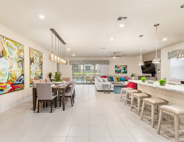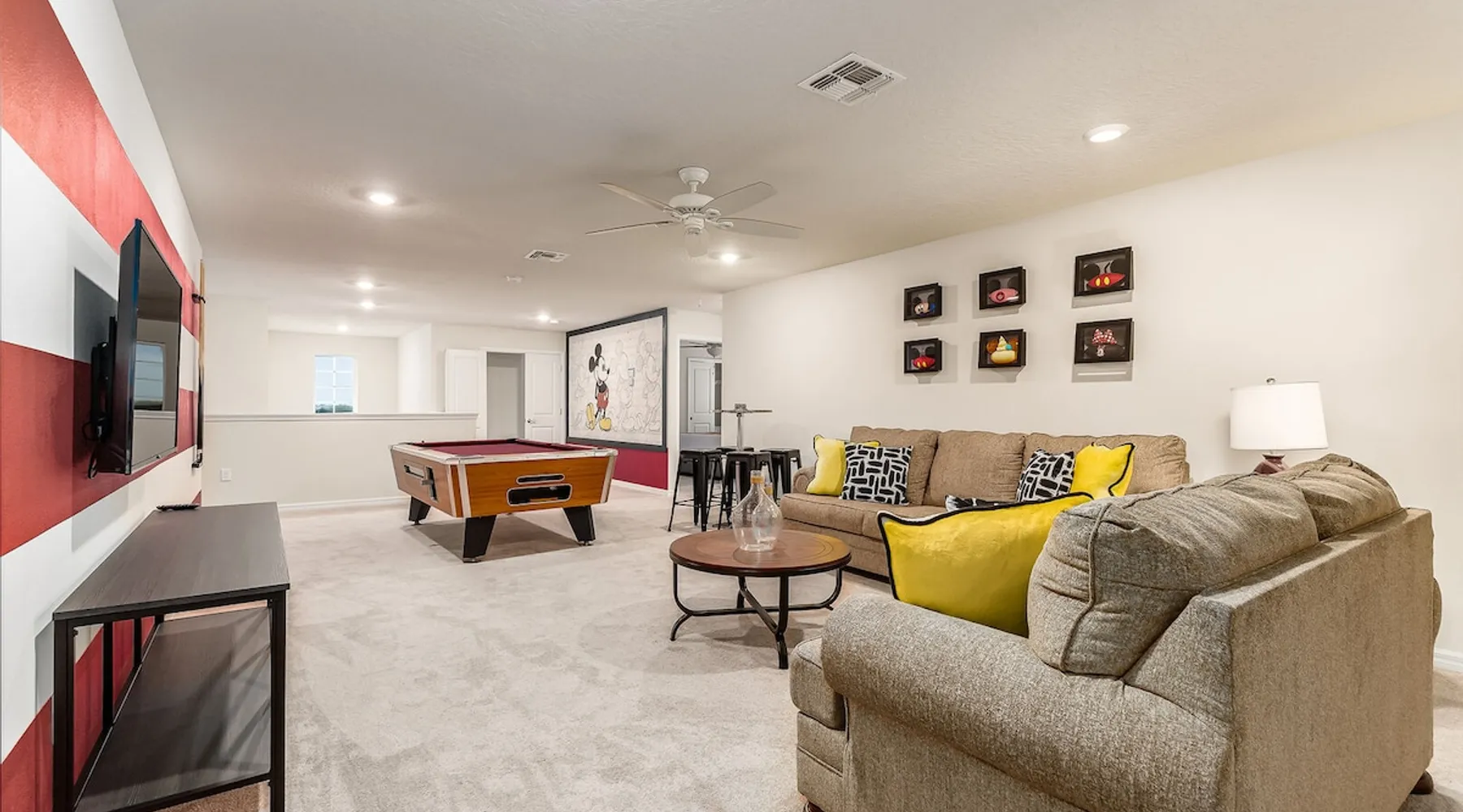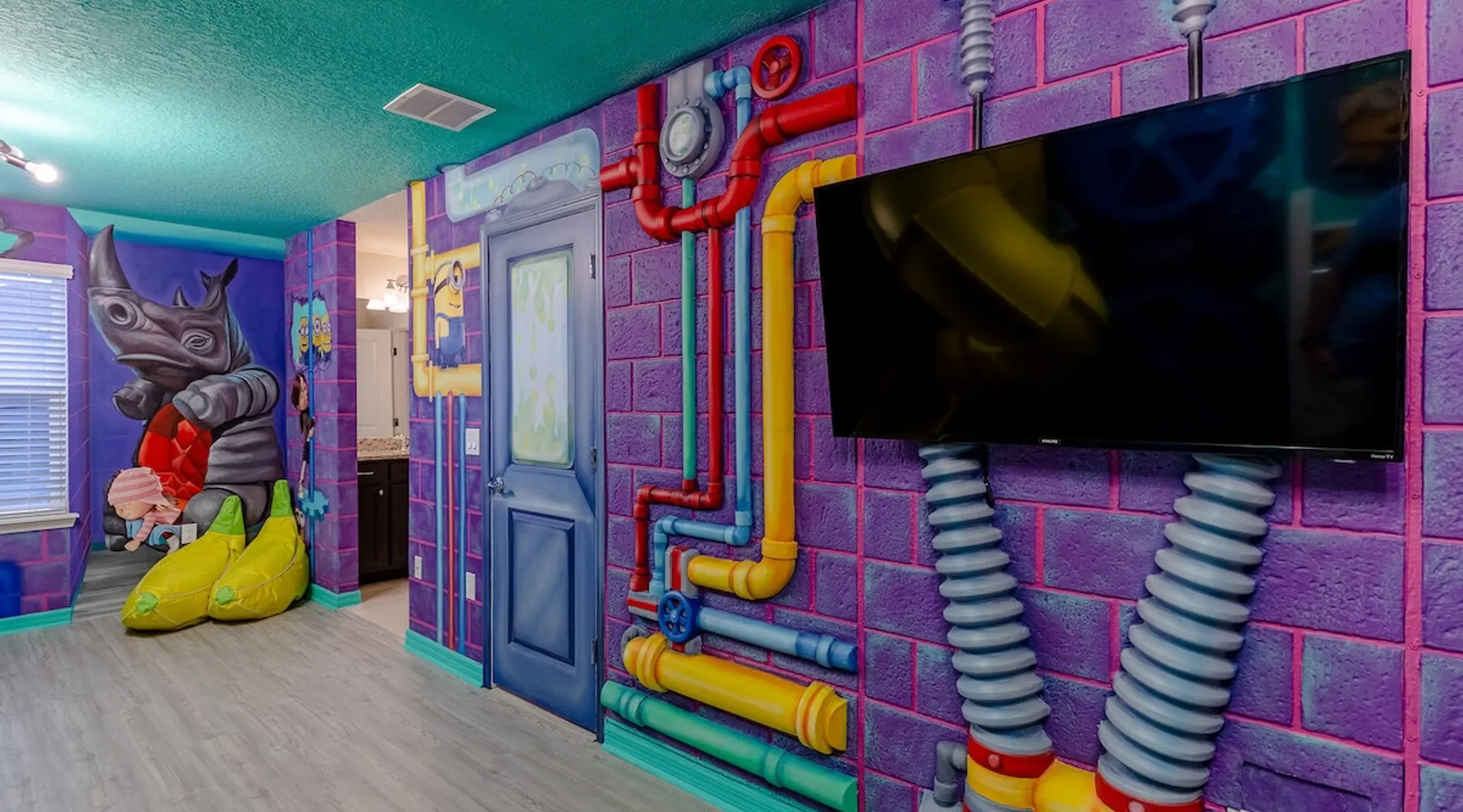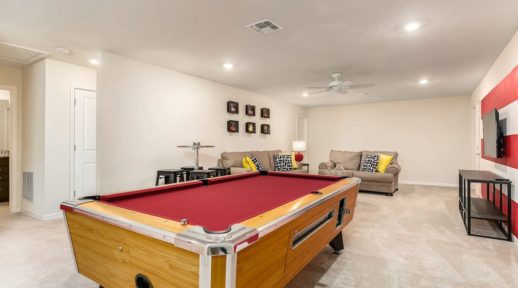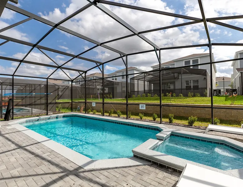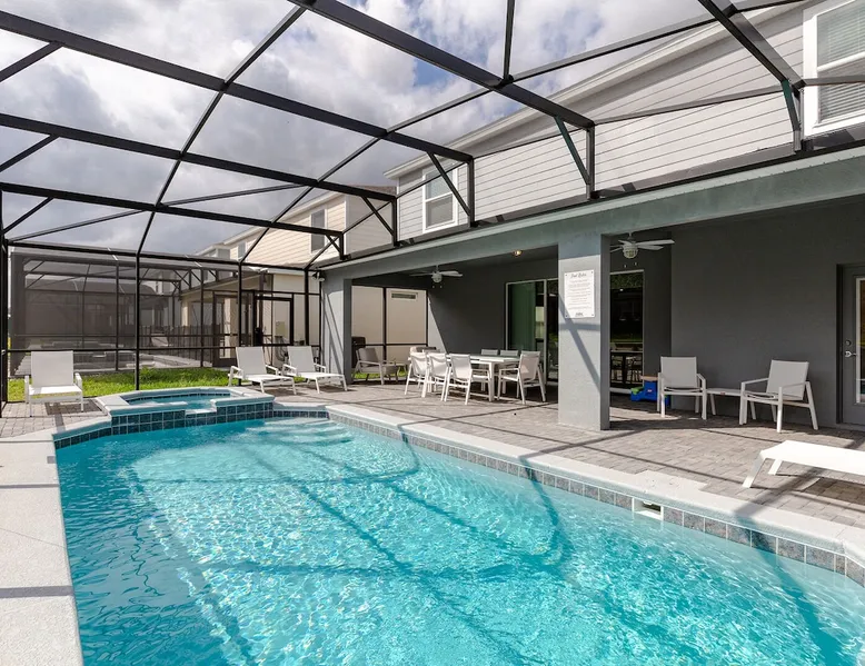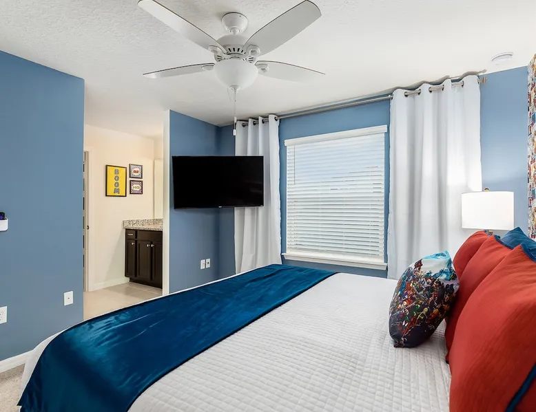 Photos updated: July 2023 Vacation in paradise at Windsor Island Luxury, a 7-bedroom, 6-bath elite villa featuring a game room, loft, custom-built kids rooms, and private screened-in pool situated in Orlando's newest vacation home community, Windsor Island Resort (newly-built, photos coming soon). The space Vacation in paradise at Windsor Island Luxury, an 7-bedroom, 6-bath elite villa featuring a game room, loft, custom-built kids rooms, and private screened-in pool situated in Orlando's newest vacation home community, Windsor Island Resort (newly-built, photos coming soon). Step inside this beautifully-built villa and be greeted by the front foyer that leads to the main area of the home. The fully equipped kitchen features everything you need to create the greatest meals on your magical vacation with kitchen barstool seating for six, perfect for the whole family. Look over to your left and you'll notice a welcoming dining room space. This area offers seating for eight, including two sofa tables and plenty of room for the family to dine at any time of day. The modern-designed gathering room is perfect for lounging after a fun day at the parks with plenty of spacious seating and a 75-inch SMART TV to watch your favorite movies and TV shows on. Don't just admire the view from the living area of your spectacular private screened-in pool deck, become immersed in it as soon as you step past the sliding doors. This modern pool deck comes with the latest furnishings, including an extra-large dining table with room for eight guests. Have a relaxing, well-deserved day by the pool at one of the four sun loungers or two comfy sitting chairs at your leisure. There's even a picnic table for the little ones to enjoy when having a delicious meal by the pool. Head back indoors to discover one of the most thrilling rooms in this home. The first-floor arcade room features some of the most popular arcade games around, like NBA Arcade, Deer Hunter, Basketball Arcade, Dynamo Air Hockey, and many more. Spend time with the family as they challenge one another on these exciting games at the high-top table seating for four, perfect for chowing down on a meal or lounging. For the adults, the upstairs loft features a spacious sectional sofa for lounging and a pub table set with seating for four. Turn on the 75-inch SMART TV for hours of entertainment. Put on your favorite sports team's live game or play your favorite music to enhance the atmosphere. And while the TV plays, test your skills on the pool table amongst your family and friends. There's never a dull moment in this upstairs loft! When it's time to wind down after a day full of fun, choose from one of the seven spacious bedrooms. Choose from the first master suite and bedroom two, both on the first floor, or head upstairs for the rest of the charming bedrooms. Guests even have the option of catching their z's in a superhero-inspired king bedroom, a galaxy-inspired king bedroom, and for the little ones, a mischievous character-inspired room will be the talk of the vacation! All bedrooms come equipped with a 50-inch SMART TV, with the two master bedroom suites featuring a 55-inch SMART TV. A luxury getaway is a lot closer than you think. Experience Orlando's newest vacation home community in style and book your stay at Windsor Island Luxury today! Disclaimer: This is a brand new rental community. Some amenities are still under construction and are not available for use yet.