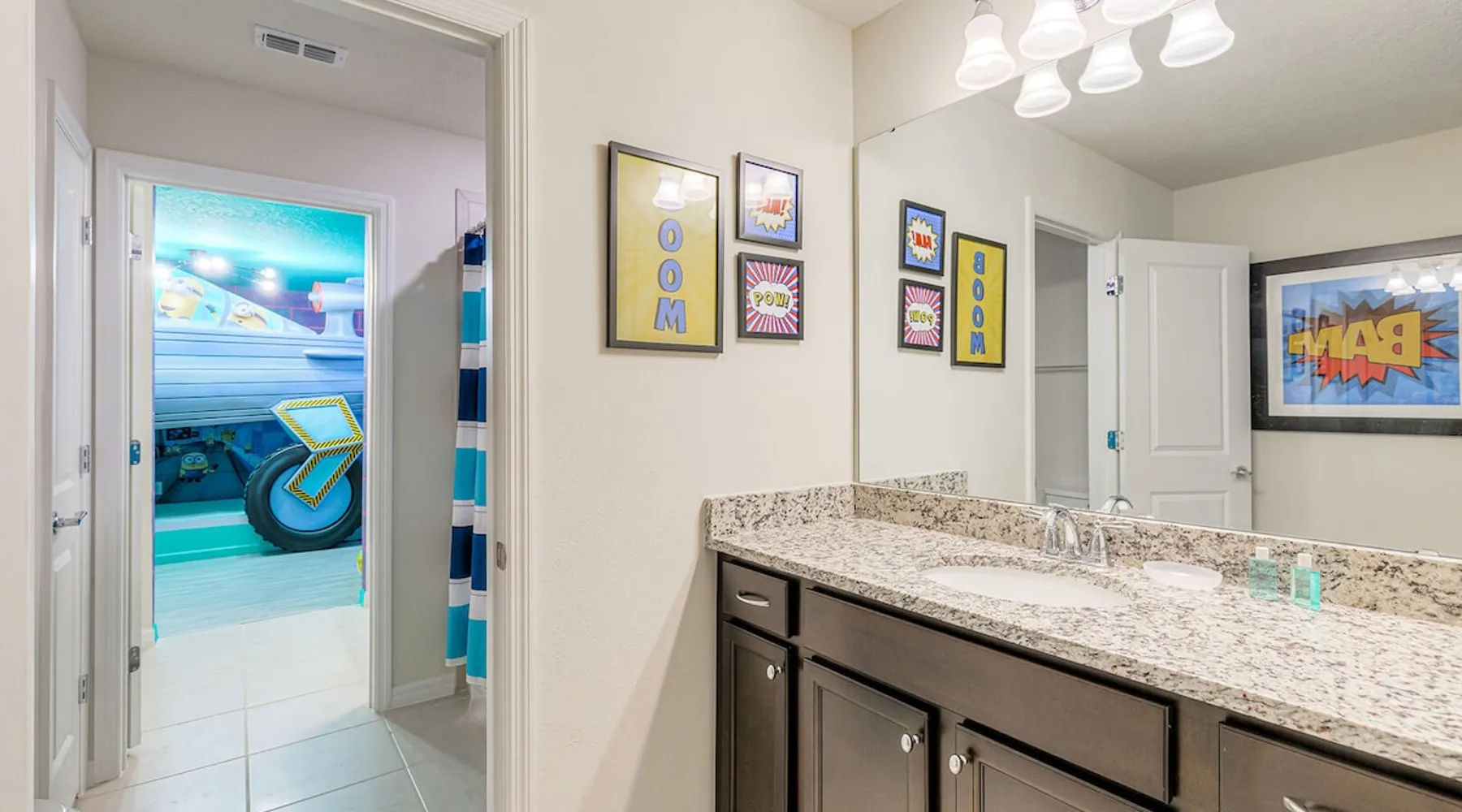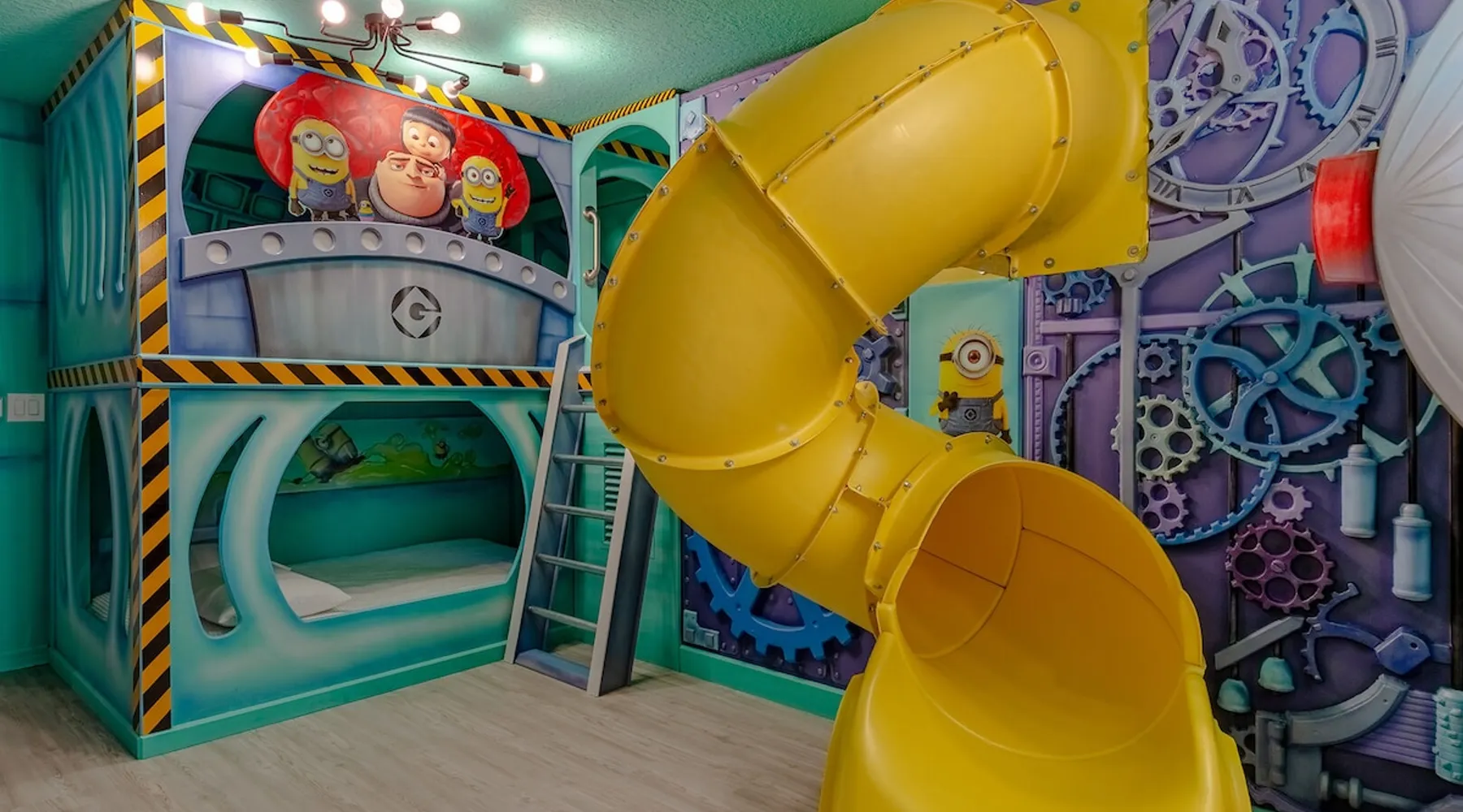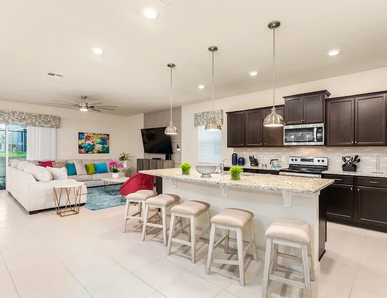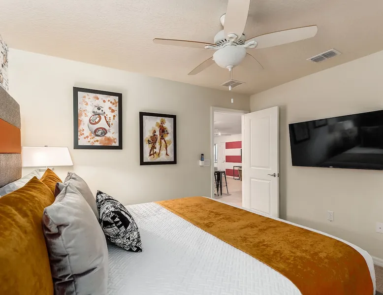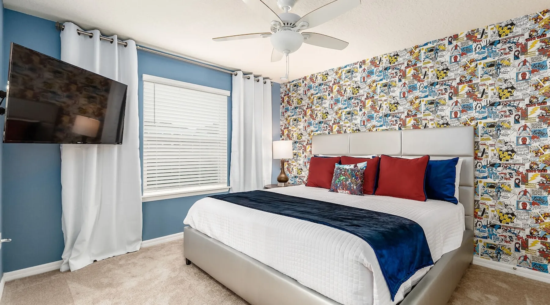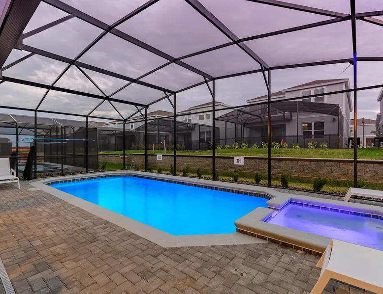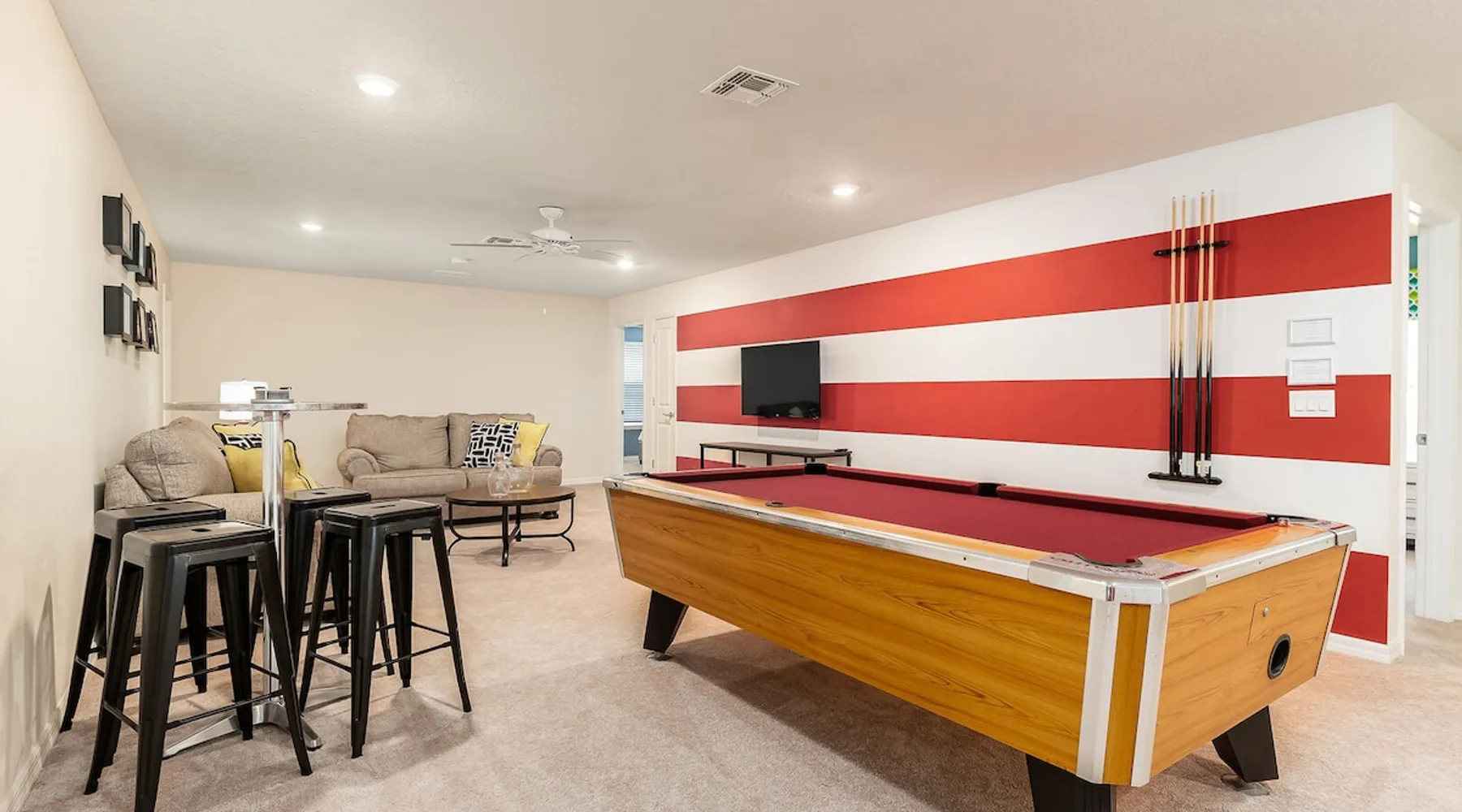 Photos updated: July 2023 Vacation in paradise at Windsor Island Luxury, a 7-bedroom, 6-bath elite villa featuring a game room, loft, custom-built kids rooms, and private screened-in pool situated in Orlando's newest vacation home community, Windsor Island Resort (newly-built, photos coming soon). The space Vacation in paradise at Windsor Island Luxury, an 7-bedroom, 6-bath elite villa featuring a game room, loft, custom-built kids rooms, and private screened-in pool situated in Orlando's newest vacation home community, Windsor Island Resort (newly-built, photos coming soon). Step inside this beautifully-built villa and be greeted by the front foyer that leads to the main area of the home. The fully equipped kitchen features everything you need to create the greatest meals on your magical vacation with kitchen barstool seating for six, perfect for the whole family. Look over to your left and you'll notice a welcoming dining room space. This area offers seating for eight, including two sofa tables and plenty of room for the family to dine at any time of day. The modern-designed gathering room is perfect for lounging after a fun day at the parks with plenty of spacious seating and a 75-inch SMART TV to watch your favorite movies and TV shows on. Don't just admire the view from the living area of your spectacular private screened-in pool deck, become immersed in it as soon as you step past the sliding doors. This modern pool deck comes with the latest furnishings, including an extra-large dining table with room for eight guests. Have a relaxing, well-deserved day by the pool at one of the four sun loungers or two comfy sitting chairs at your leisure. There's even a picnic table for the little ones to enjoy when having a delicious meal by the pool. Head back indoors to discover one of the most thrilling rooms in this home. The first-floor arcade room features some of the most popular arcade games around, like NBA Arcade, Deer Hunter, Basketball Arcade, Dynamo Air Hockey, and many more. Spend time with the family as they challenge one another on these exciting games at the high-top table seating for four, perfect for chowing down on a meal or lounging. For the adults, the upstairs loft features a spacious sectional sofa for lounging and a pub table set with seating for four. Turn on the 75-inch SMART TV for hours of entertainment. Put on your favorite sports team's live game or play your favorite music to enhance the atmosphere. And while the TV plays, test your skills on the pool table amongst your family and friends. There's never a dull moment in this upstairs loft! When it's time to wind down after a day full of fun, choose from one of the seven spacious bedrooms. Choose from the first master suite and bedroom two, both on the first floor, or head upstairs for the rest of the charming bedrooms. Guests even have the option of catching their z's in a superhero-inspired king bedroom, a galaxy-inspired king bedroom, and for the little ones, a mischievous character-inspired room will be the talk of the vacation! All bedrooms come equipped with a 50-inch SMART TV, with the two master bedroom suites featuring a 55-inch SMART TV. A luxury getaway is a lot closer than you think. Experience Orlando's newest vacation home community in style and book your stay at Windsor Island Luxury today! Disclaimer: This is a brand new rental community. Some amenities are still under construction and are not available for use yet.