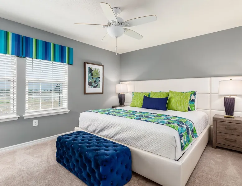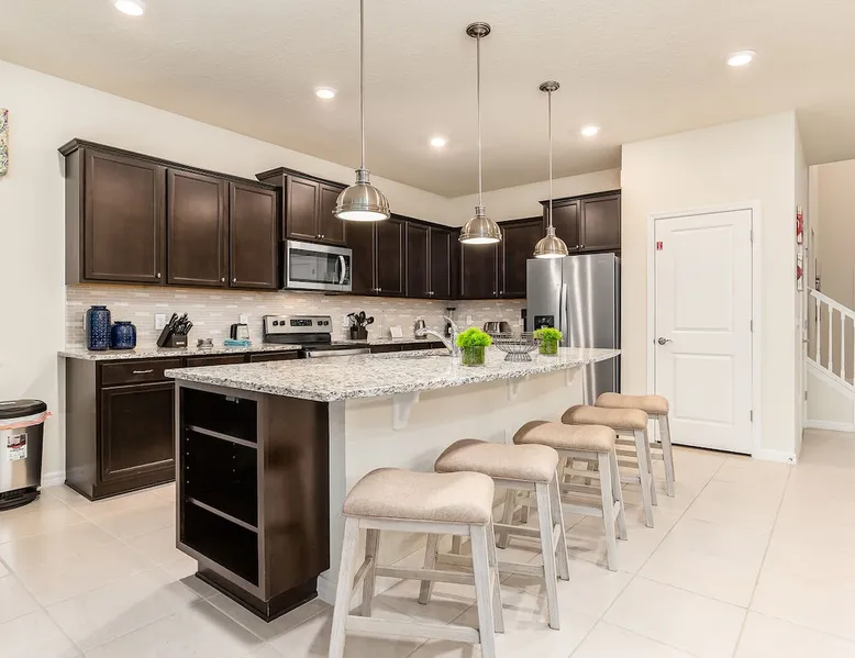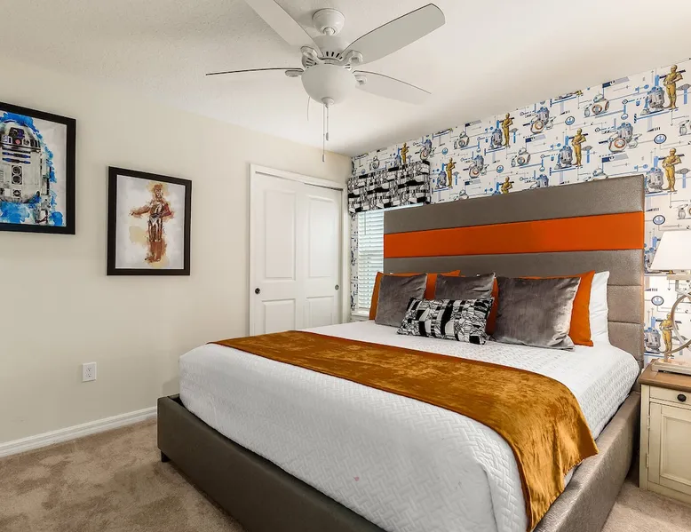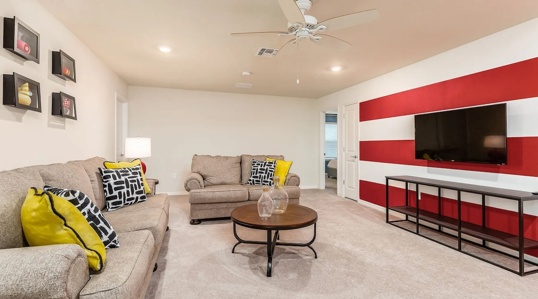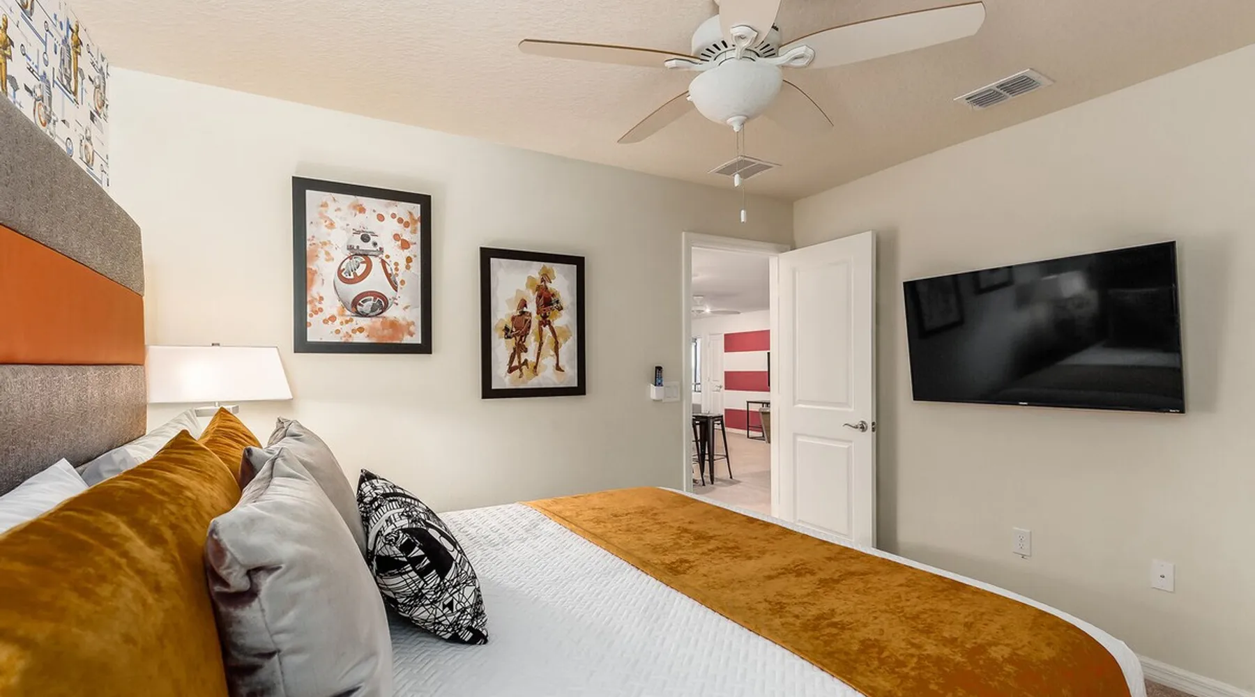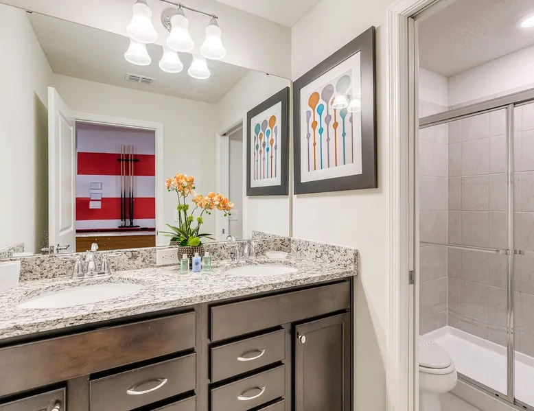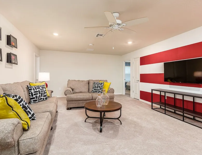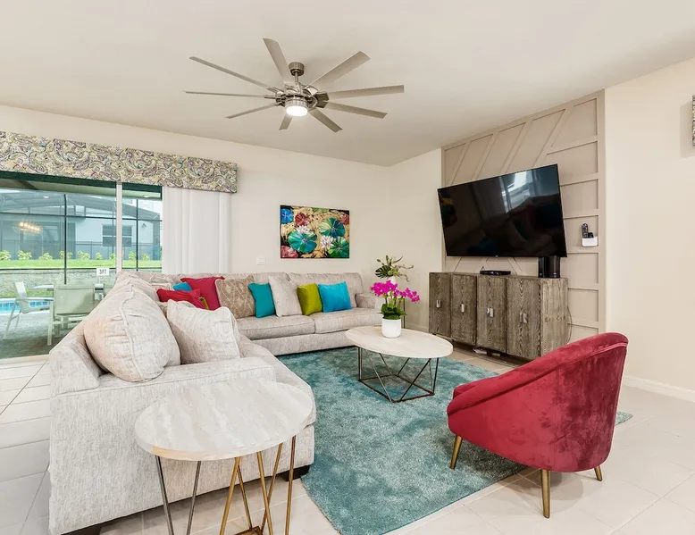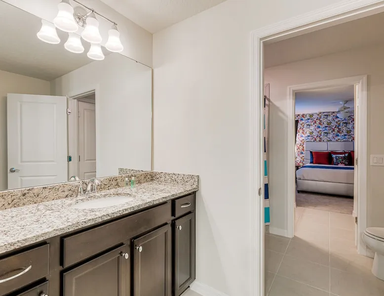 Photos updated: July 2023 Vacation in paradise at Windsor Island Luxury, a 7-bedroom, 6-bath elite villa featuring a game room, loft, custom-built kids rooms, and private screened-in pool situated in Orlando's newest vacation home community, Windsor Island Resort (newly-built, photos coming soon). The space Vacation in paradise at Windsor Island Luxury, an 7-bedroom, 6-bath elite villa featuring a game room, loft, custom-built kids rooms, and private screened-in pool situated in Orlando's newest vacation home community, Windsor Island Resort (newly-built, photos coming soon). Step inside this beautifully-built villa and be greeted by the front foyer that leads to the main area of the home. The fully equipped kitchen features everything you need to create the greatest meals on your magical vacation with kitchen barstool seating for six, perfect for the whole family. Look over to your left and you'll notice a welcoming dining room space. This area offers seating for eight, including two sofa tables and plenty of room for the family to dine at any time of day. The modern-designed gathering room is perfect for lounging after a fun day at the parks with plenty of spacious seating and a 75-inch SMART TV to watch your favorite movies and TV shows on. Don't just admire the view from the living area of your spectacular private screened-in pool deck, become immersed in it as soon as you step past the sliding doors. This modern pool deck comes with the latest furnishings, including an extra-large dining table with room for eight guests. Have a relaxing, well-deserved day by the pool at one of the four sun loungers or two comfy sitting chairs at your leisure. There's even a picnic table for the little ones to enjoy when having a delicious meal by the pool. Head back indoors to discover one of the most thrilling rooms in this home. The first-floor arcade room features some of the most popular arcade games around, like NBA Arcade, Deer Hunter, Basketball Arcade, Dynamo Air Hockey, and many more. Spend time with the family as they challenge one another on these exciting games at the high-top table seating for four, perfect for chowing down on a meal or lounging. For the adults, the upstairs loft features a spacious sectional sofa for lounging and a pub table set with seating for four. Turn on the 75-inch SMART TV for hours of entertainment. Put on your favorite sports team's live game or play your favorite music to enhance the atmosphere. And while the TV plays, test your skills on the pool table amongst your family and friends. There's never a dull moment in this upstairs loft! When it's time to wind down after a day full of fun, choose from one of the seven spacious bedrooms. Choose from the first master suite and bedroom two, both on the first floor, or head upstairs for the rest of the charming bedrooms. Guests even have the option of catching their z's in a superhero-inspired king bedroom, a galaxy-inspired king bedroom, and for the little ones, a mischievous character-inspired room will be the talk of the vacation! All bedrooms come equipped with a 50-inch SMART TV, with the two master bedroom suites featuring a 55-inch SMART TV. A luxury getaway is a lot closer than you think. Experience Orlando's newest vacation home community in style and book your stay at Windsor Island Luxury today! Disclaimer: This is a brand new rental community. Some amenities are still under construction and are not available for use yet.