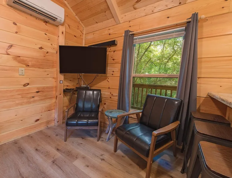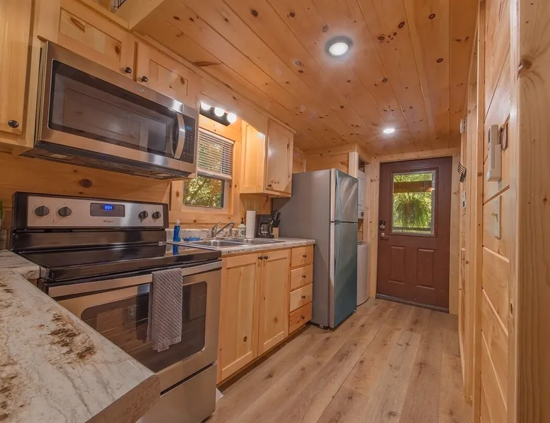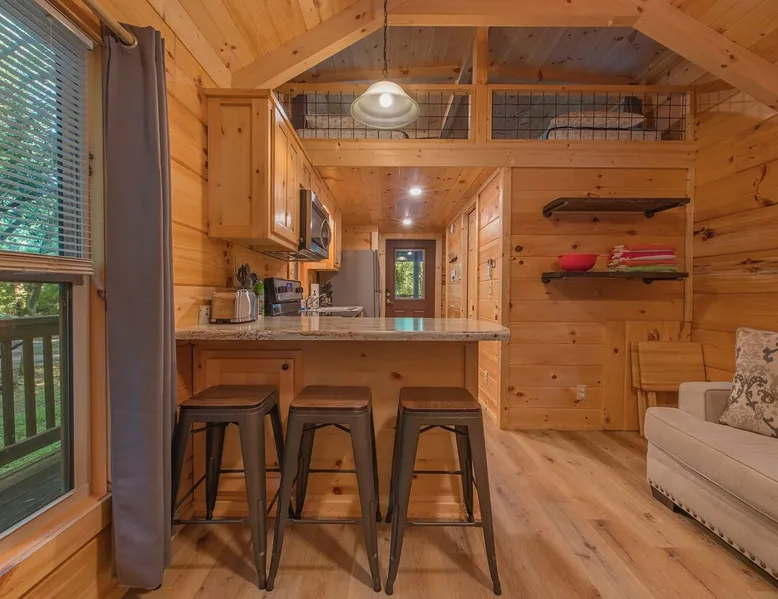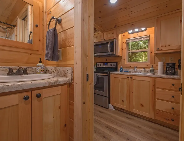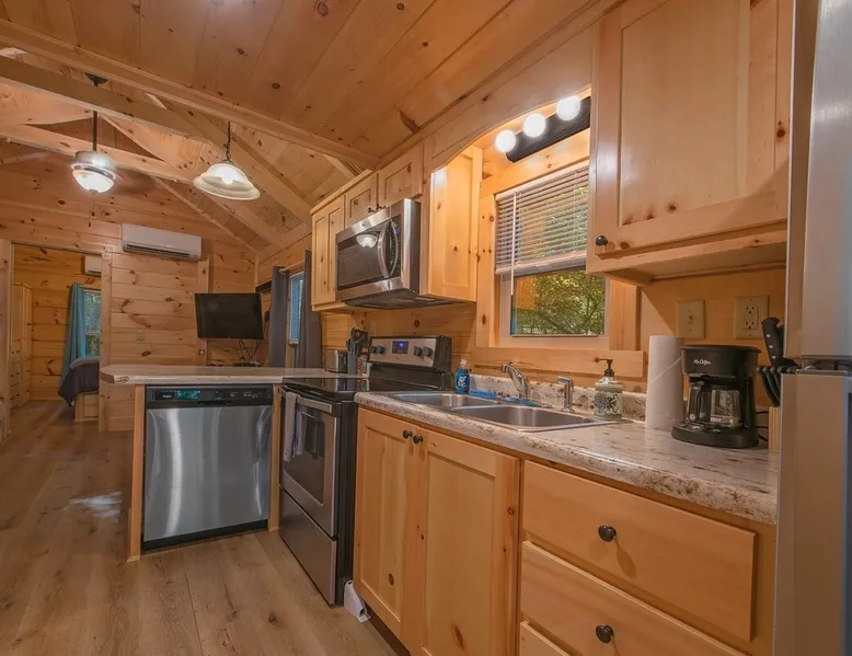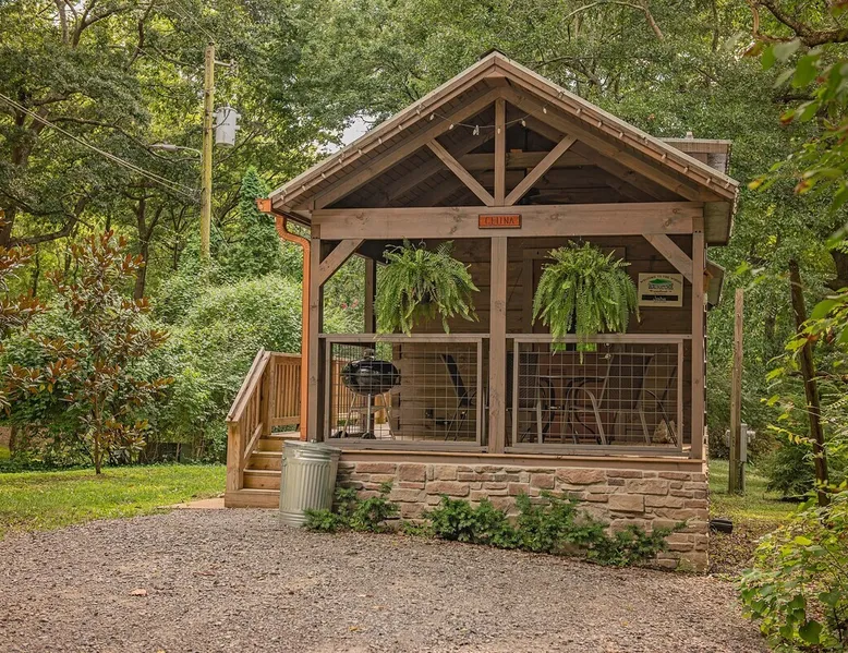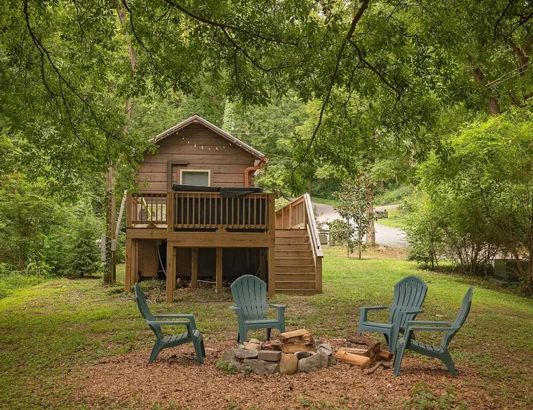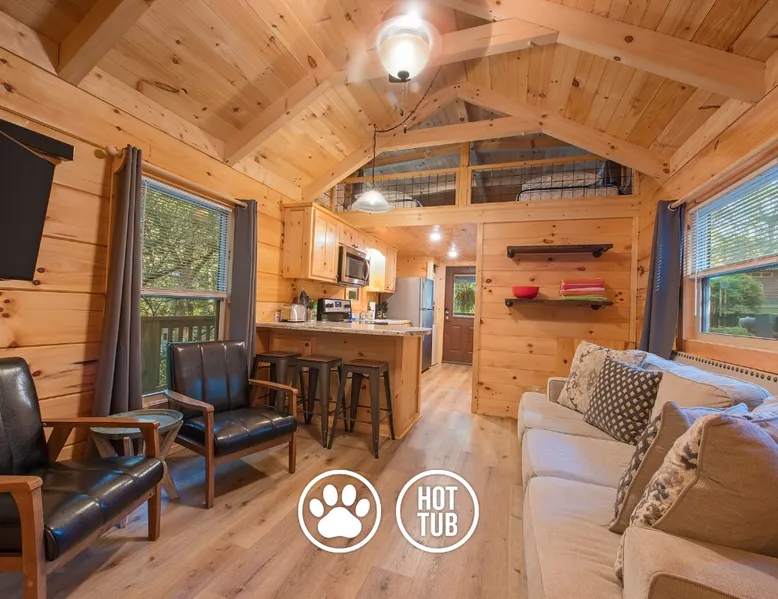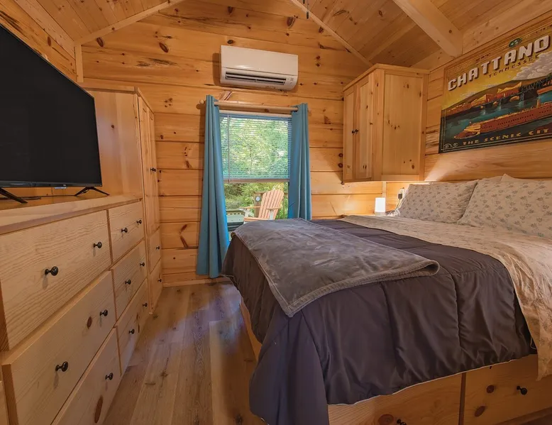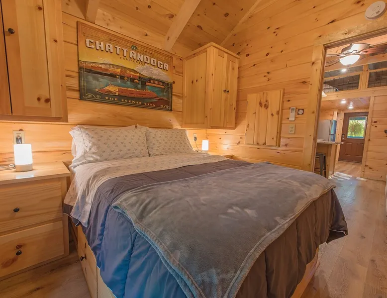 Only 5 minutes from downtown Chattanooga, Celina offers a private hot tub, a furnished back deck, a covered front deck with a charcoal grill, and a shared fire pit. It can comfortably accommodate up to 4 guests, with a main bedroom and a sleeping loft. The space Wauhatchie Woodlands is a family-owned collection of quaint, tiny-home, rustic-comfort log cabins on a 14-acre wooded property surrounded by National Park land. This natural setting is nested less than a mile from the city with quick access to downtown Chattanooga, Ruby Falls, Lookout Mountain, and the surrounding area. Named after Frank & Nicole's German host-daughter, Celina is equipped with everything you could ever need to make the most of your time in Chattanooga. Celina is one of our delightful rustic cabins. During your stay, you’ll enjoy a private hot tub, furnished back deck, covered front with charcoal grill, shared fire pit, and an incredibly memorable, charming space surrounded by nature. Celina can comfortably sleep up to 4 guests between the main bedroom and sleeping loft. The cabin is equipped with a full kitchen, smart TV, private washer dryer combo, & more. Starting from the back, you’ll find the fully furnished deck, surrounded by decades-old trees, there awaits a space of pure relaxation, your private hot tub, with easy access to the main bedroom. Just off the deck is the shared fire pit and picnic pavilion, perfect for fireside chats and evening s'mores. Firewood can be purchased on-property. Inside, the main bedroom hosts a queen bed, closets for hanging clothes, lots of drawer storage, and a Smart TV. Just outside the bedroom is your dedicated washer and dryer combo unit on one side and the full bathroom with bathtub on the other. A step further we enter the kitchen, fully stocked for cooking/dining with an electric range, microwave, stove, full-size fridge, dishwasher, and all the dishes you need to whip up a vacation feast. The living room and kitchen feature an open floor plan with vaulted ceilings with the main TV across from the sofa. Up the staircase is the sleeping loft equipped with two twin beds. Kids will love having their own space. For grownups, clearance in the loft is low, just 4' - it’s perfect for sleeping, just watch your head when you get up. The cabin’s covered front porch with dining set is the perfect place for a morning cup of coffee, or grilling out on your dedicated charcoal grill (charcoal not include). We are pleased to allow dogs at Celina Cabin, under specific terms and conditions. See our house rules/notes for more information. Chattanooga is a city known for its railroads. There are active train tracks that border the property to the north and I-24 is about half a mile away. Please note that light sleepers may be affected by the ambient city and train noise. Each cabin has been equipped with a white noise machine to help minimize any disturbance. Pack ‘n Play Travel cribs are available upon request. To make sure your stay at Wauhatchie Woodlands is perfect, our locally based Guest Services representatives are on-call from 8 am to 11 pm, seven days a week. Guest access You’ll have your cabin all to yourself during your stay. Wauhatchie Woodlands is a 14-acre property surrounded by National Forest. Guests have access to trails around the grounds, as well as shared pavilions, community fire pits, and playground. Please be respectful of other guests during your stay. Other things to note Trains & Noise: Chattanooga is a city known for its railroads. There are active train tracks that border the property to the north and I-24 is about half a mile away. Please note that light sleepers may be affected by the ambient city and train noise. Each cabin has been equipped with a white noise machine to help minimize any disturbance. Pet Policy: We are pleased to allow dogs at Celina Cabin, under specific terms and conditions. See our house rules/notes for more information. Deposits: Please note that guests under 21 or guests residing in the Greater Chattanooga Metropolitan Area will be charged a $200 refundable deposit subsequent to receiving their booking confirmation. Please review our policy forbidding parties, events and unregistered guests to ensure your stay abides with this policy and does not jeopardize your deposit. No Smoking: Smoking, vaping, and the use of e-cigarettes are prohibited inside Timberroot properties. Refer to the rental agreement to see these policies and the additional fees that occur if you fail to follow them. Pests: We take great care to ensure our properties are free from pests. Our properties are regularly treated by professional pest control and our staff takes preventative measures to keep pests out. However, as our properties are located in wooded areas, it is possible for guests to encounter insects and/or small woodland creatures like mice. If you do encounter an unwelcome pest inside your lodging, please contact our Guest Services team immediately so that our grounds team can address the problem as quickly as possible. We ask that guests help us prevent pests by keeping doors and window screens closed and maintaining proper cleanliness during their stay. By booking with us, you accept that encountering insects and woodland creatures is a possibility and that no refunds will be issued for such instances. Surveillance Cameras: Please note that for your safety, cabins may have a camera located on the front porch, facing outwards monitoring activity in front of the cabin (including driveway and roads).