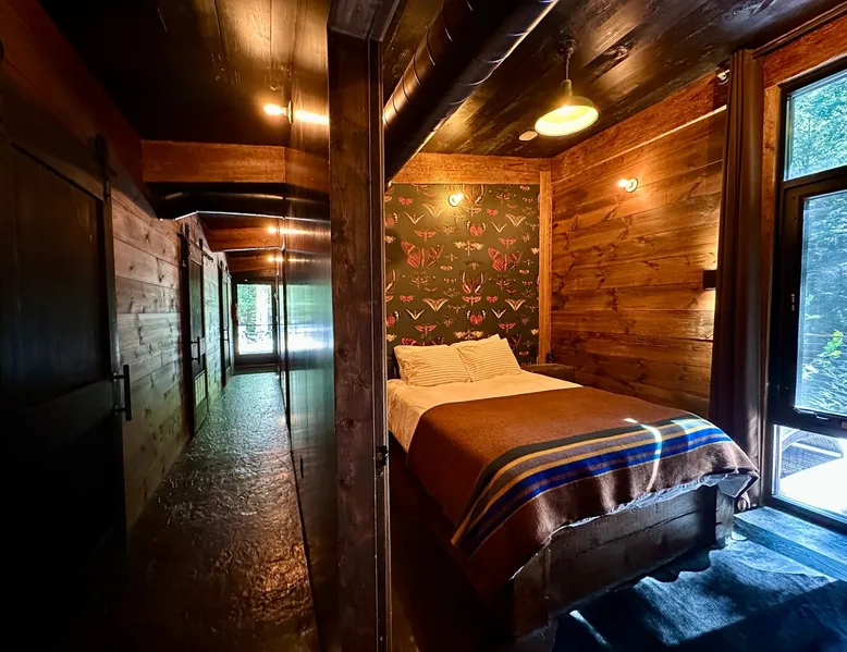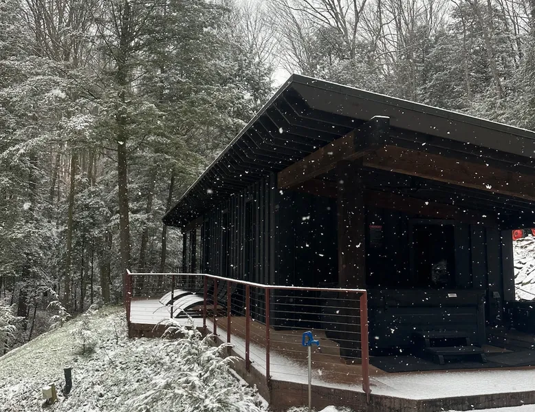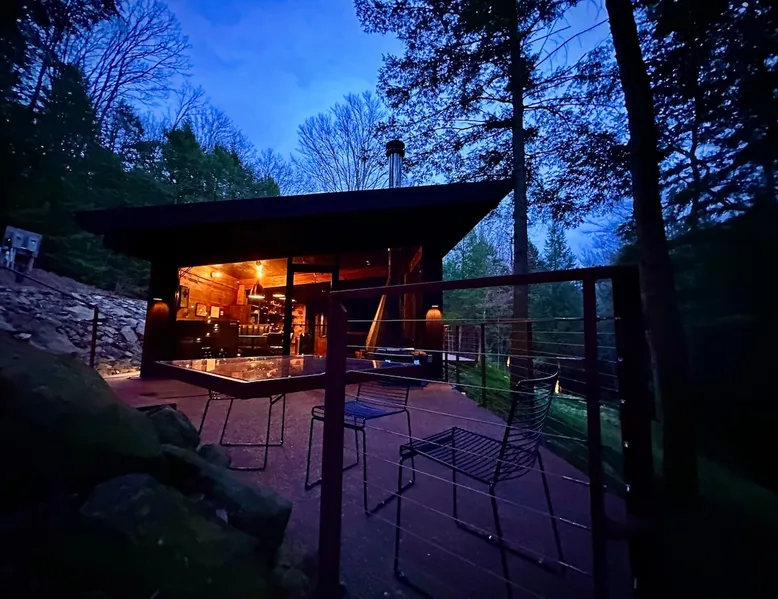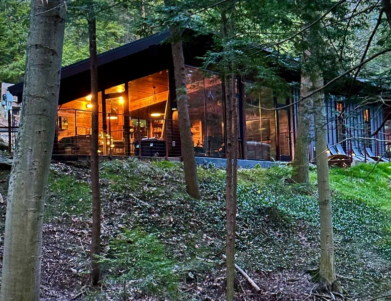 Inspired by mid-century modern design, The Ledge features expansive floor-to-ceiling windows and outdoor seating areas designed to showcase the surrounding caves and seasonal waterfalls. Nestled along a secluded, forested drive on 24 private acres, every detail has been thoughtfully curated for your comfort. The Ledge offers WiFi, a hot tub, indoor and outdoor fireplaces—creating the perfect balance of luxury and nature. Secluded, yet conveniently located for all your Hocking Hills adventures! The space The Ledge@LostCavern blends sleek and modern Industrial design with old-world appeal. Perched on the bank of a 50’ cavern this six guest, Midcentury mod cabin features salvaged timbers and a Malm fireplace. The warm lighting and radiant heated floors invite you in for hygge time with friends and family, while the floor to ceiling windows draw you outwards. And when you are ready to venture out, the surrounding patios offer ample room to lounge - complete with a breakfast nook, 7 person hot tub, outdoor fireplace and striking view of caverns galore with seasonal waterfalls at every angle. Lost Cavern property shares the same microclimate that makes the nearby state parks so distinctive. Enjoy the massive Canadian hemlocks, Black Hand Sandstone, and striking caves all to yourself! Planning your trip: Below is an itemized list of our cabin amenities to assist you in packing/planning out your stay: In the Kitchen: -Gas range, studio fridge with freezer/icemaker (12 cu ft), toaster, microwave, dishwasher, coffee grinder and coffee pot -2 Baking sheets, can opener, whisk, wooden spoons, measuring spoons and cups, spatula, cooking pans large and small, bottle/wine opener, oven mitts, rolling pin, cutting board, strainer, mixing bowl -Flatware for 8, wine glasses, dining set for 8, knife set -1 roll paper towel, dishwasher pods, dish soap, scrubbie, dish cloth/towel -salt and pepper grinder, 12 oz Intelligensia coffee beans, pack of Biscoff biscuits Living/Dining: -Board games: Trivial Pursuit, Battleship, playing cards, Guess Who, Pictionary, Chess, Jenga -Smoke/Carbon monoxide detector, Fire Extinguisher -Fireplace: 1 bundle wood, tongs/poker, lighter/matches, shovel/ash bucket (you can purchase more wood at the gas station in South Bloomingville) -Broom/dust pan (the broom also doubles as a long arm in case the fire alarm accidentally goes off) -Throw, end table, reading light -Smart Television with Netflix, standard Youtube (90 channels) Each Bedroom has: -1 queen bed outfitted with Brooklinen bedding (Luxe sheets and comforter), Pendleton wool blanket, 4 pillows, 1 LED latern, 4 USB ports, 1 clothing rack, 1 bedside stand Each Bathroom has: -3 rolls toilet paper, Oneka shampoo/conditioner, Method body wash, 5 towels, 1 hand towel, 3 wash cloth, 2 make-up towels, hand soap, hair dryer, plunger Outside spaces: -Patios: • Breakfast nook (table and 3 chairs) • Cavern side (4 lounge chairs) • Firepit area (seating for 6, seat cushions (in storage bins), fire poker/tongs, 3 roasting sticks) -Hot tub (7 person) -Grill with propane tank (extra in storage bins), poker, spatula, tongs Other things to note All wheel drive vehicles are highly recommended in wintery months and/or in precipitous weather.