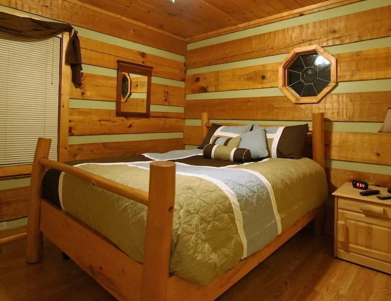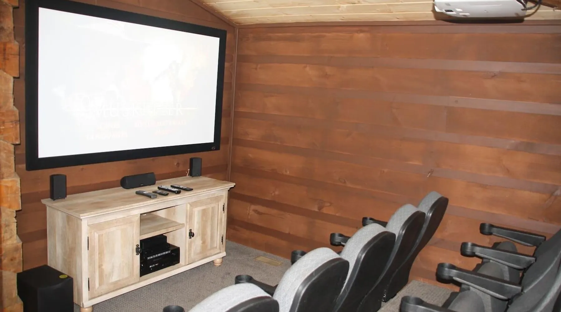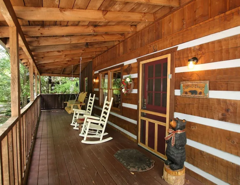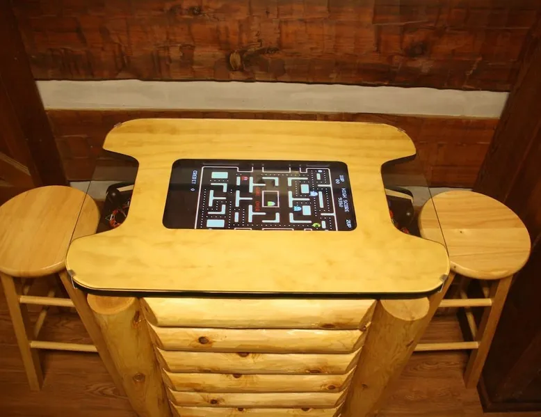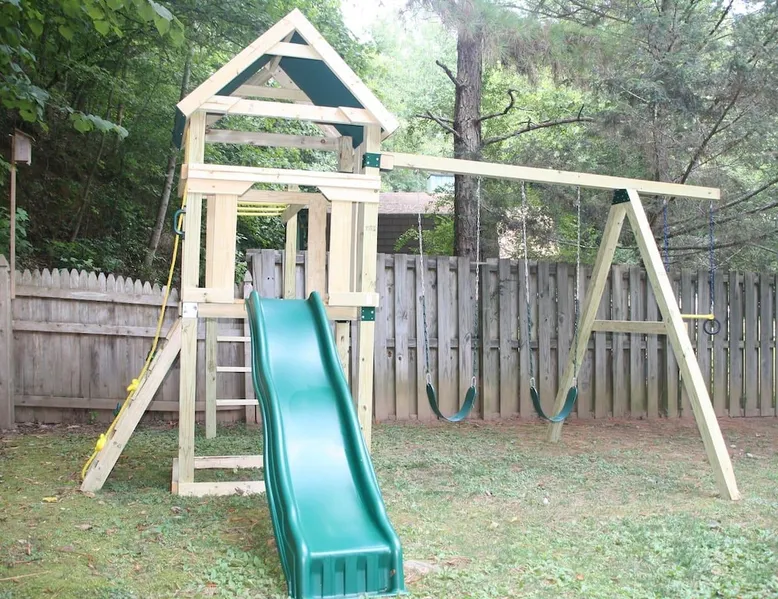 Welcome to Cub Creek, a 3-bedroom luxury cabin that provides the perfect space to enjoy family time together. Conveniently located just 5 miles from the main Pigeon Forge Parkway you will be just minutes away from all the local attractions. This hand-hewn log cabin provides the perfect base for spending your days exploring then heading back to the cabin for a little peace and tranquility. The space Just imagine sipping your morning coffee from the front porch swing while listening to the sounds of the small creek. Unwind together… This comfortable two-level home means there’s plenty of space for family time but also somewhere to escape for a little peace and quiet. Everyone will love their accommodations in one of the 3 bedrooms. Cub Creek offers two king bedrooms and one queen bedroom plus a loft with 2 sets of twin bunk beds. The unique fenced in yard provides a safe space for your family to enjoy outside. Let the kids play on the playground while the adults relax in the hot tub or at night you can gather the family around the fire pit for smores. Eat together… Whether you are preparing a family feast or just a snack, the fully equipped kitchen has everything you need to cook up the perfect meal and the BBQ/Grill and picnic table means outdoor cooking and eating can also be on the menu. Play together… When you’re not out exploring all that Pigeon Forge has to offer, you can spend time chilling and chatting, challenging one another to a game of air-hockey or Foosball or try to beat the highest score on the 60-game arcade. Bring your popcorn because the theater room equipped with projector screen, sound system and tiered theater seating will feel just like you are at the movies. Whether your idea of the perfect getaway is action packed days or relaxing peace and quiet, Cub Creek is the perfect place for your family to make memories together! Free Fun Included Every Day! To enhance your vacation experience free admissions to some of the area's most popular attractions are included - with a daily value of $640. You will receive one free ticket per day per group to each of the following: Dollywood, Dolly’s Splash Country, Anakeesta, Titanic Museum, Wonderworks, Beyond the Lens, Country Tonite, Big Creek Expeditions, Top Jump, Crave Golf, Paula Deen’s Adventure Park, Legacy Zipline, Alcatraz East Crime Museum, Rocky Top Coaster, Rowdy Bear Snow Park, Paula Deen’s Lumberjack Feud, Soaky Mountain Water Park, Comedy Barn and The Grand Majestic Theater. Tickets are not cumulative but do reset each day. There is no limit to the number of attractions you can visit in a day. Guest access There is a wheel chair ramp to access the cabin and the yard. All rooms downstairs, with the exception of the queen bedroom, have door openings large enough to accommodate a wheel chair. The tiled shower includes a seat. The upstairs is not accessible by wheelchair. Other things to note Must be 25 or older to rent - photo ID required
