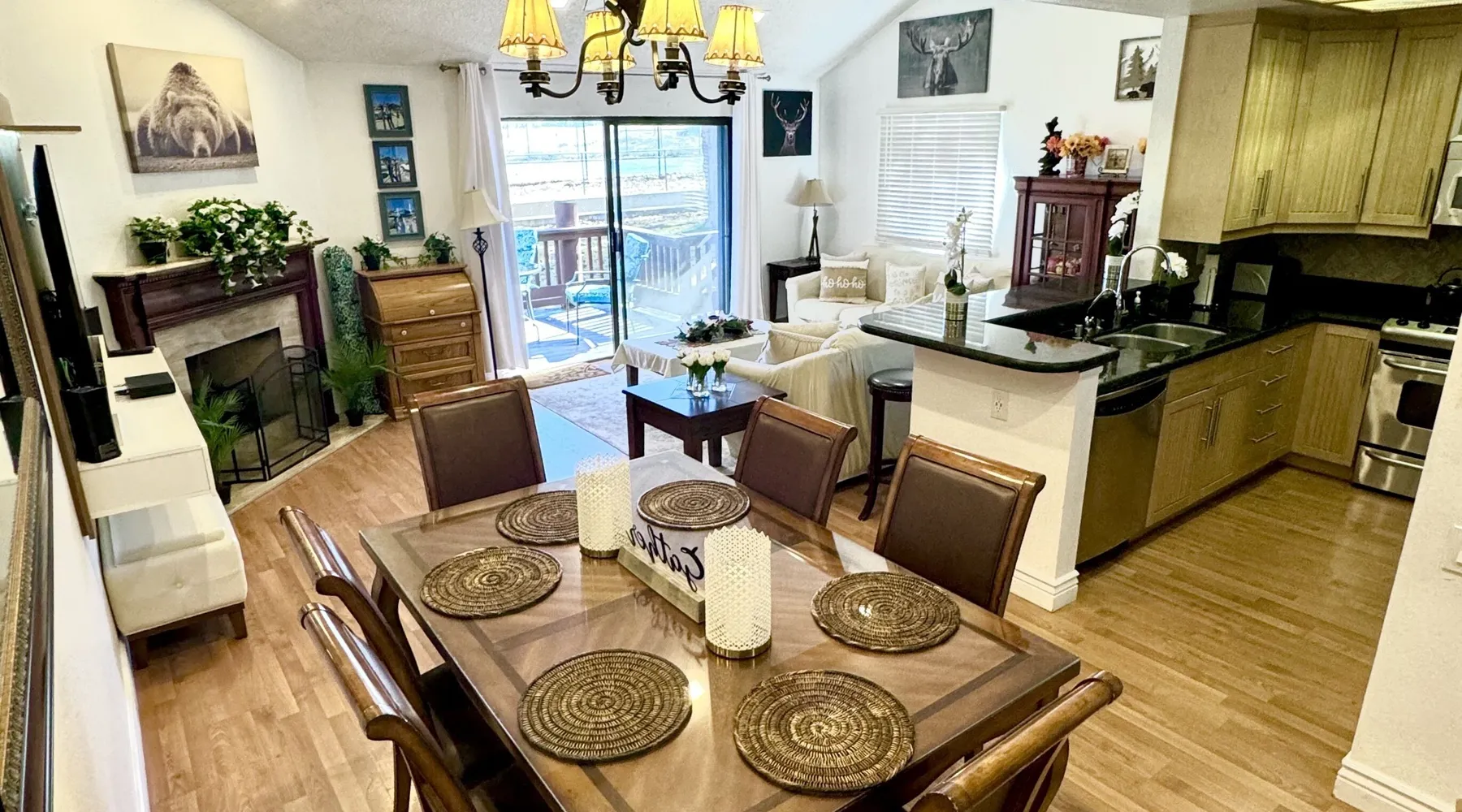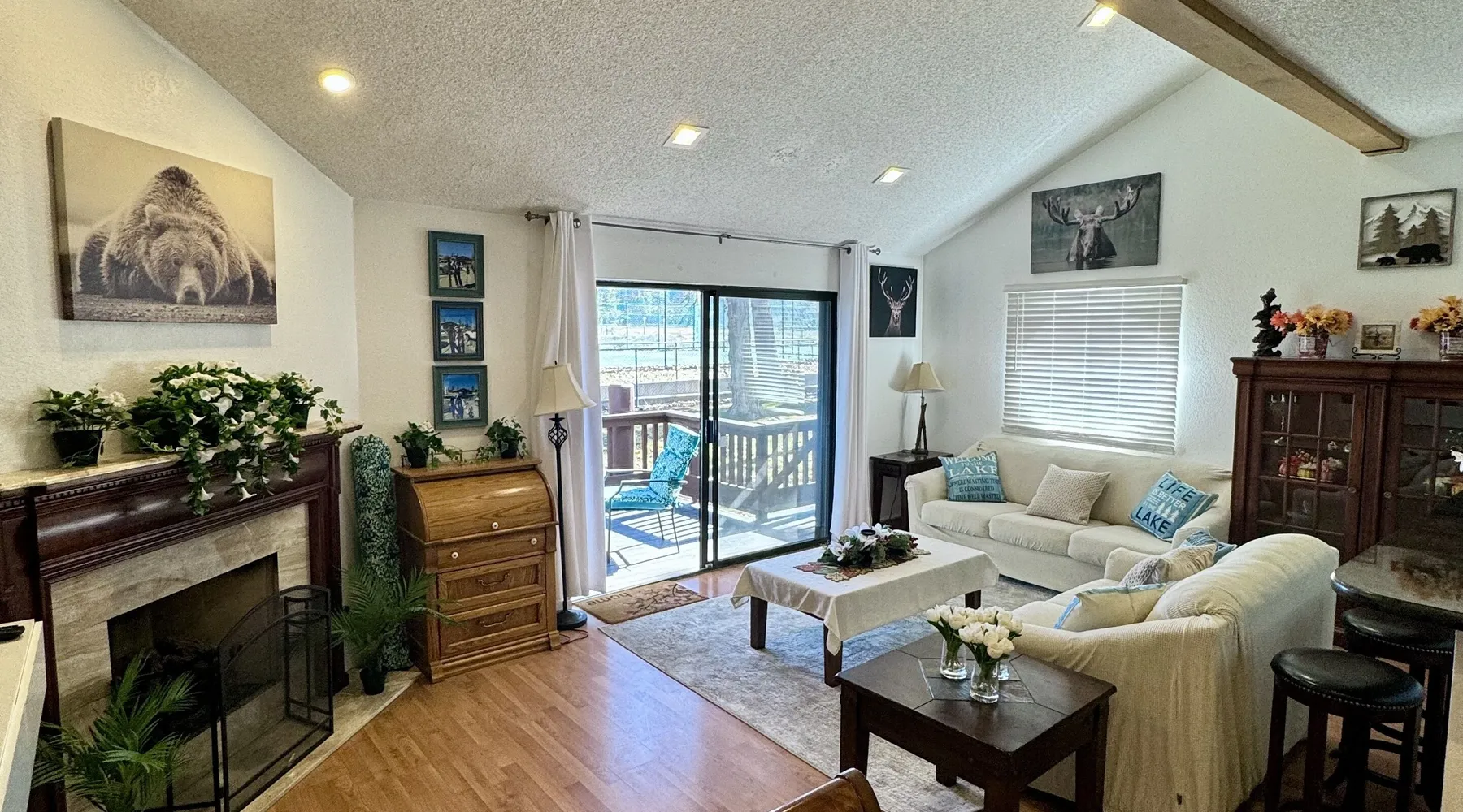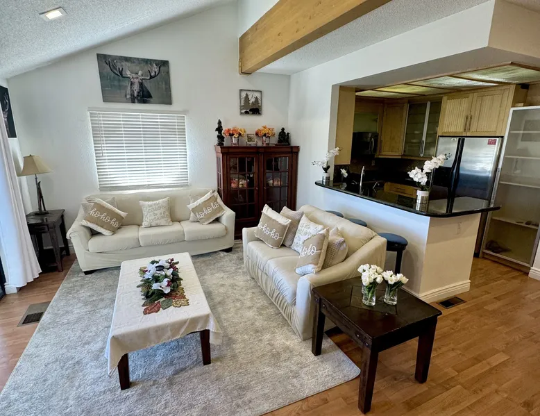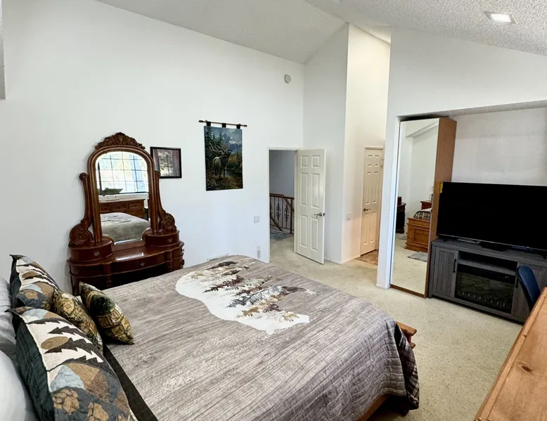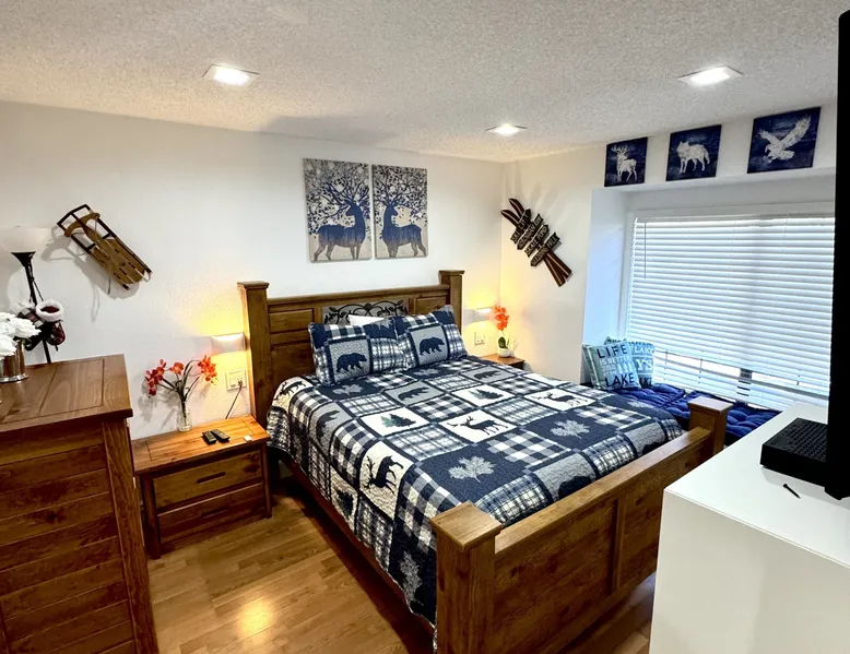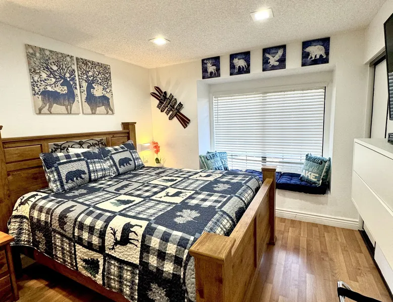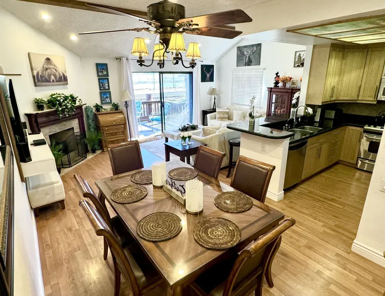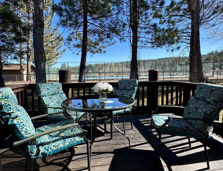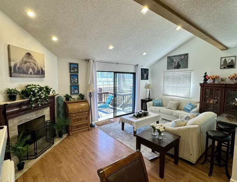 Knotty Pine Retreat Big Bear | Lakeside Condo Welcome to Knotty Pine Big Bear Lake Retreat, perfect for a group of friends or family vacation to the mountains our furnished and cozy two story condo chalet has all that you need for a memorable and relaxing vacation to Big Bear no matter the season you visit. Located in Boulder Bay your complex is less than a mile walk to local Pleasure Point Marina and under a short ten minute car ride to the Village, grocery stores, and ski resorts- this is the ultimate destination for any group. Enter on the lower level where you are greeted with gorgeous hardwood floors, cathedral ceilings, and big open windows that allow the perfect balance of natural lighting and views of the snow falling outside. Snuggle up here on the cozy couches as you warm your toes together in front of the toasty gas faux log fireplace and pop on a movie on the mounted flat screen TV with Cable and complimentary hi speed WIFI internet provided to keep you connected while vacationing. The breakfast bar stools and formal dining table provide plenty of space to enjoy your meals together as a group while the chef of your party will love the equipped kitchen here at Knotty Pine, complete with cookware, stainless appliances, and a dishwasher your cleanup will be an absolute breeze. Enjoy quick and easy access to a lower level bedroom and bathroom while the upstairs hosts two additional sleeping quarters and includes the primary suite with a private bath- all of your rooms are made up for your group with warm linens, blankets, pillows, and fresh shower towels for your visit when you arrive. Outside you can enjoy sipping your first cup of coffee in the mornings on your private patio deck with adorable patio furnishings or enjoy the propane BBQ where you can grill up your freshly caught dinner from the lake and unwind. Pairing relaxation and the necessities from home along with a most prime lakeside location you will absolutely love your stay here at our Knotty Pine - Big Bear Lake Retreat, as an added bonus this lakeside complex is within a short walk to local Pleasure Point Marina and offers a seasonal community tennis court and heated outdoor summertime pool and spa for your use. Sleeping Arrangements: Bedroom 1: Queen Bed- Downstairs Entry Level Bedroom 2: Full Bed- Upstairs 2nd Level Bedroom 3: King Bed, TV w/Cable, Private Full Bath - Upstairs 2nd Level Bathroom Arrangements: Hallway Full Bath - Downstairs Entry Level Private 3/4 Bath (Shower Only) - Bedroom 3- Upstairs 2nd Level -Sleeps 6 -2 Cars Driveway Parking -NO PETS ALLOWED- Fines Imposed For Pets Found On Premises -1,374 Total Square Feet City Permit #: VRR-2023-2261