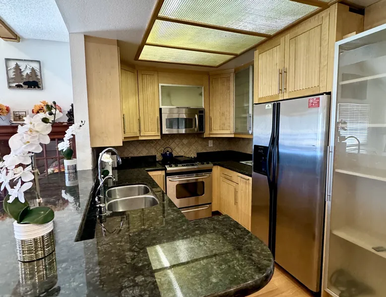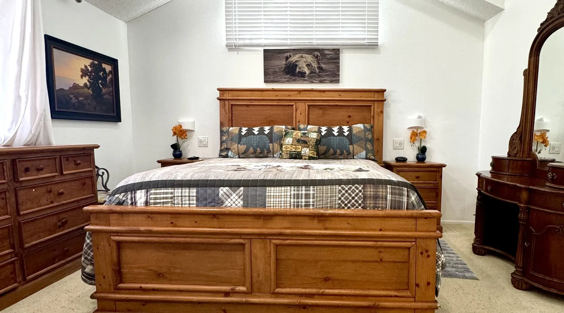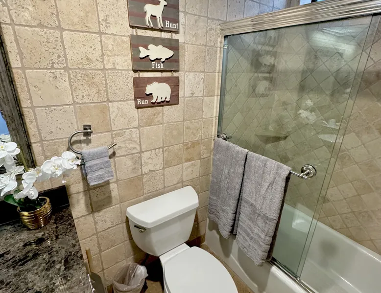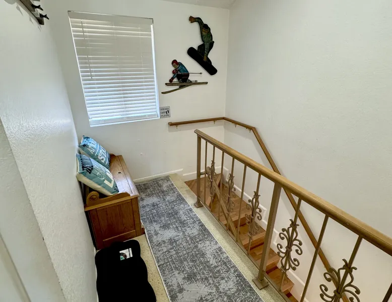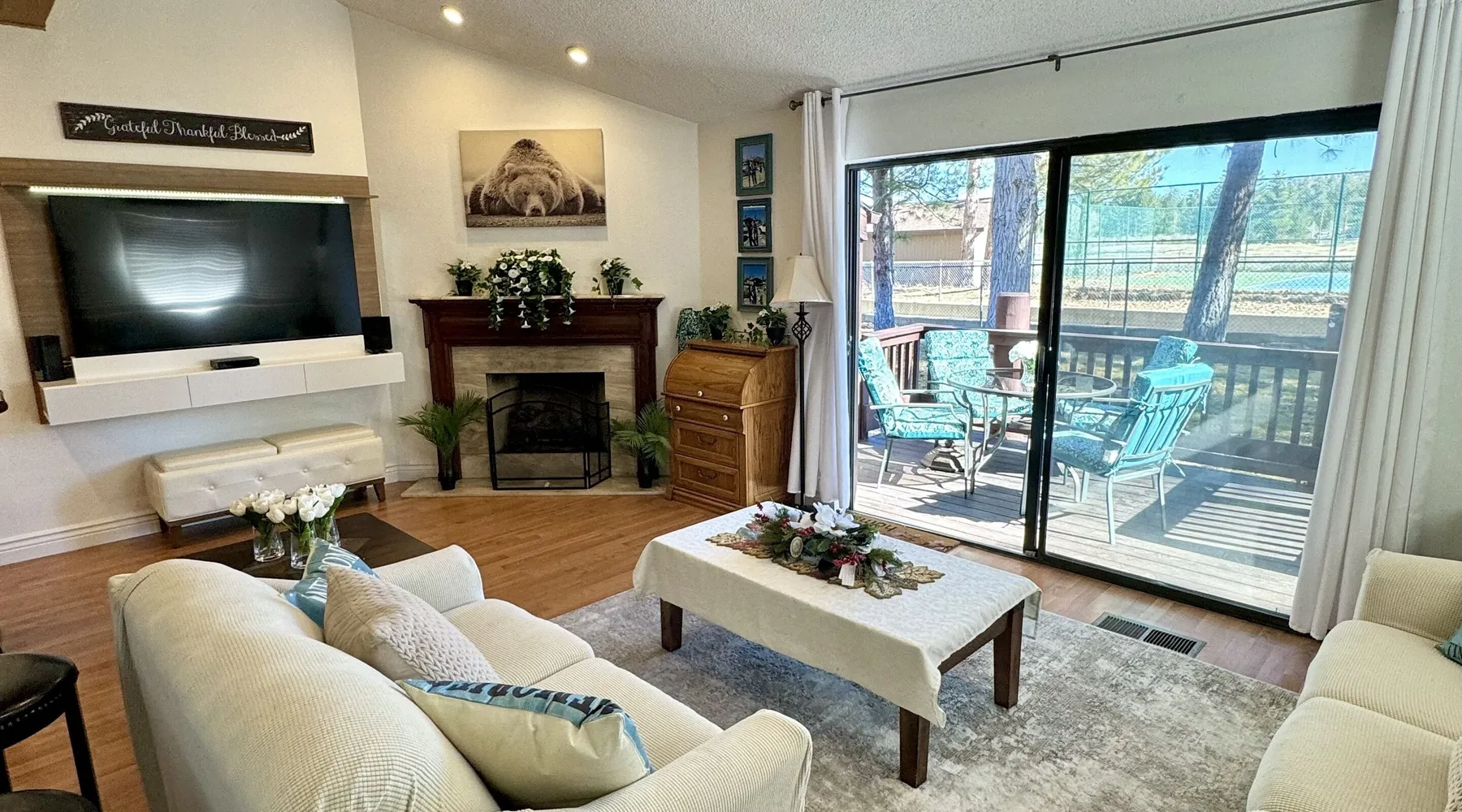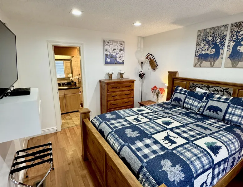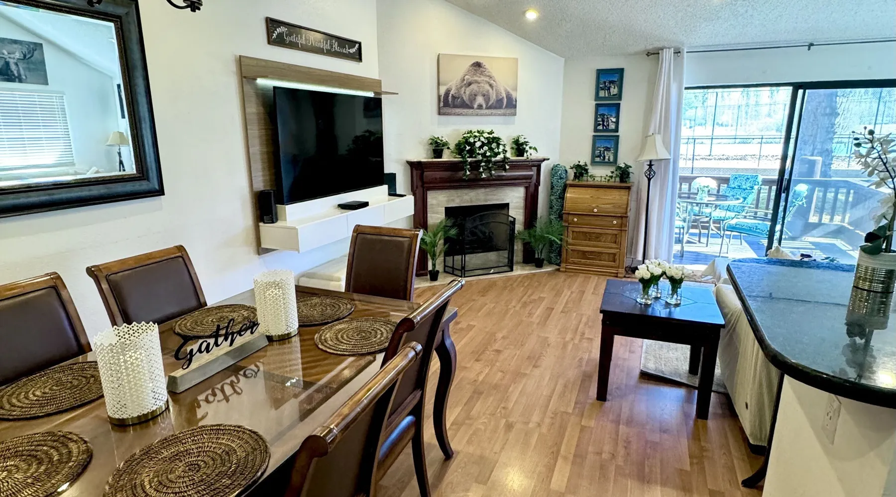 Knotty Pine Retreat Big Bear | Lakeside Condo Welcome to Knotty Pine Big Bear Lake Retreat, perfect for a group of friends or family vacation to the mountains our furnished and cozy two story condo chalet has all that you need for a memorable and relaxing vacation to Big Bear no matter the season you visit. Located in Boulder Bay your complex is less than a mile walk to local Pleasure Point Marina and under a short ten minute car ride to the Village, grocery stores, and ski resorts- this is the ultimate destination for any group. Enter on the lower level where you are greeted with gorgeous hardwood floors, cathedral ceilings, and big open windows that allow the perfect balance of natural lighting and views of the snow falling outside. Snuggle up here on the cozy couches as you warm your toes together in front of the toasty gas faux log fireplace and pop on a movie on the mounted flat screen TV with Cable and complimentary hi speed WIFI internet provided to keep you connected while vacationing. The breakfast bar stools and formal dining table provide plenty of space to enjoy your meals together as a group while the chef of your party will love the equipped kitchen here at Knotty Pine, complete with cookware, stainless appliances, and a dishwasher your cleanup will be an absolute breeze. Enjoy quick and easy access to a lower level bedroom and bathroom while the upstairs hosts two additional sleeping quarters and includes the primary suite with a private bath- all of your rooms are made up for your group with warm linens, blankets, pillows, and fresh shower towels for your visit when you arrive. Outside you can enjoy sipping your first cup of coffee in the mornings on your private patio deck with adorable patio furnishings or enjoy the propane BBQ where you can grill up your freshly caught dinner from the lake and unwind. Pairing relaxation and the necessities from home along with a most prime lakeside location you will absolutely love your stay here at our Knotty Pine - Big Bear Lake Retreat, as an added bonus this lakeside complex is within a short walk to local Pleasure Point Marina and offers a seasonal community tennis court and heated outdoor summertime pool and spa for your use. Sleeping Arrangements: Bedroom 1: Queen Bed- Downstairs Entry Level Bedroom 2: Full Bed- Upstairs 2nd Level Bedroom 3: King Bed, TV w/Cable, Private Full Bath - Upstairs 2nd Level Bathroom Arrangements: Hallway Full Bath - Downstairs Entry Level Private 3/4 Bath (Shower Only) - Bedroom 3- Upstairs 2nd Level -Sleeps 6 -2 Cars Driveway Parking -NO PETS ALLOWED- Fines Imposed For Pets Found On Premises -1,374 Total Square Feet City Permit #: VRR-2023-2261