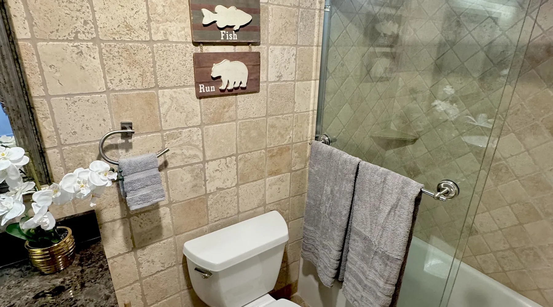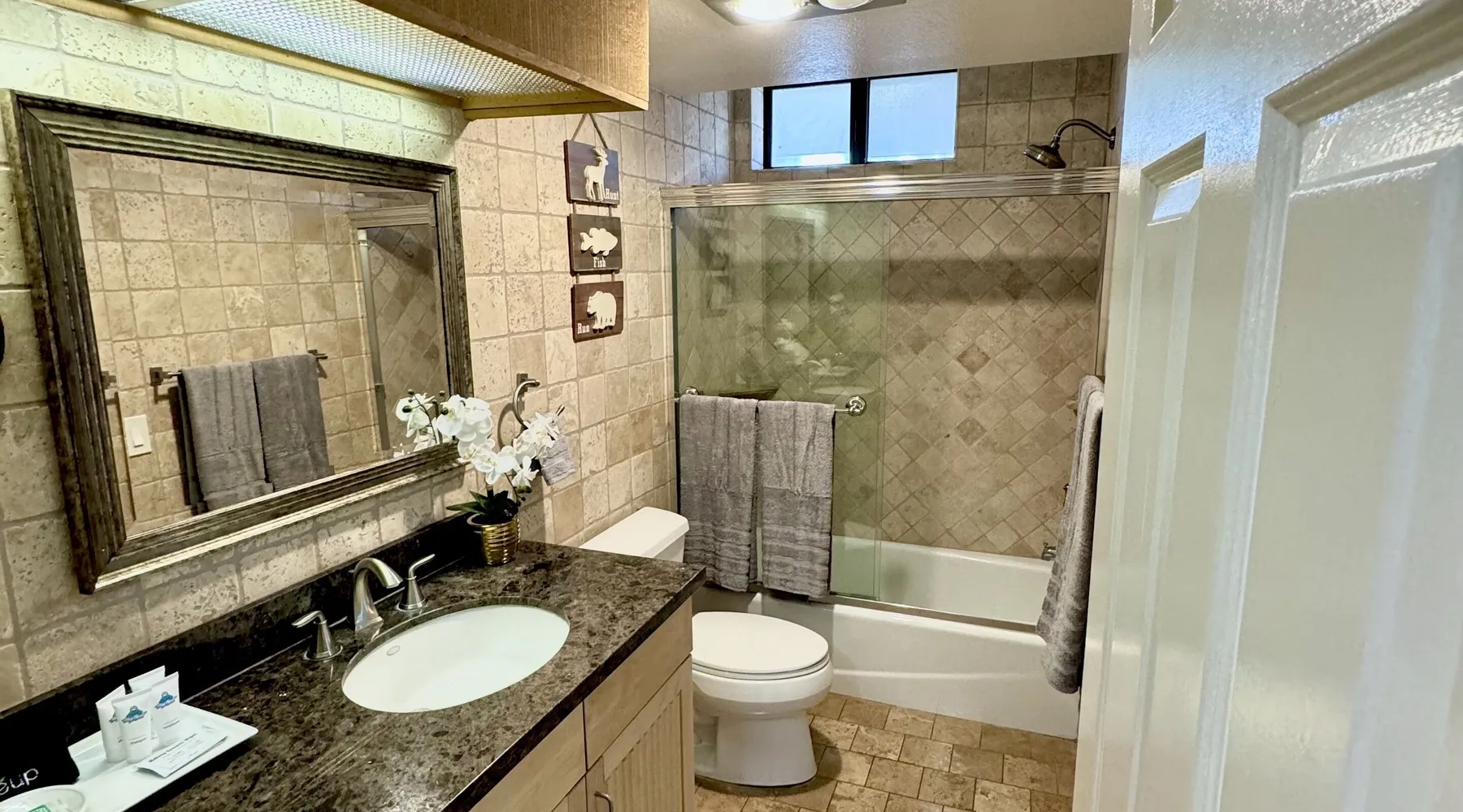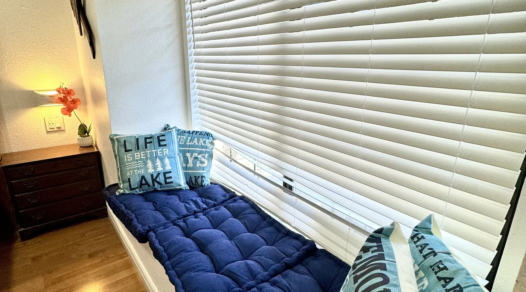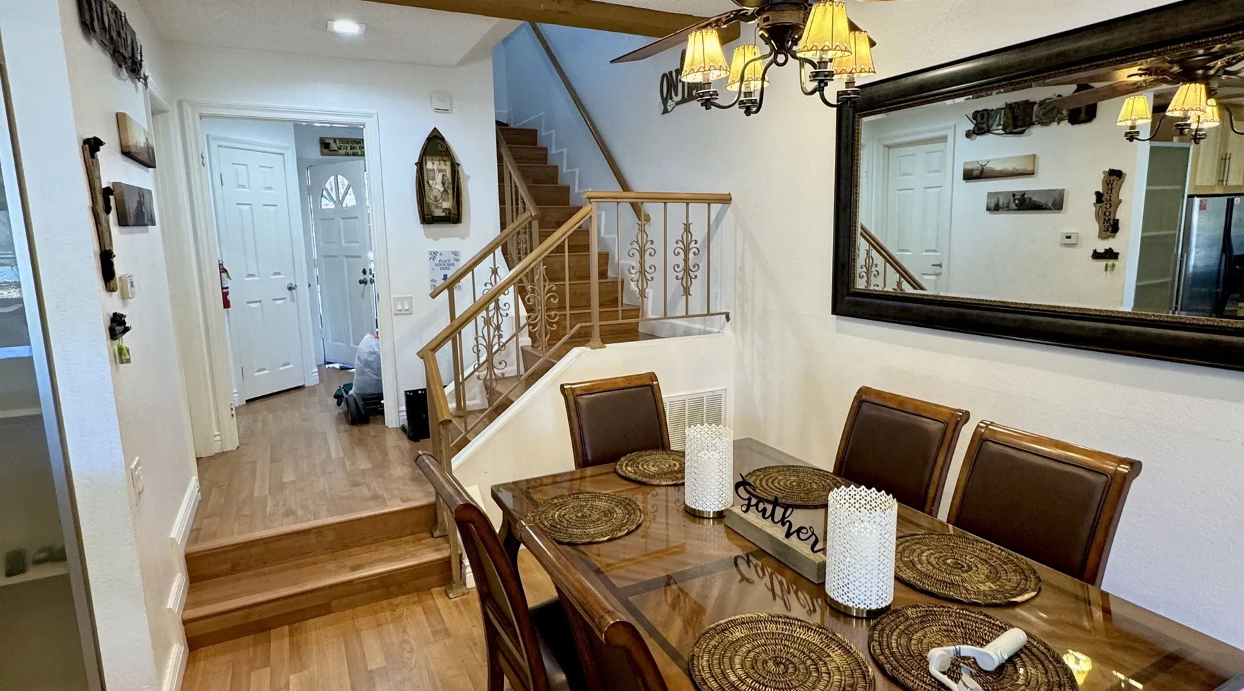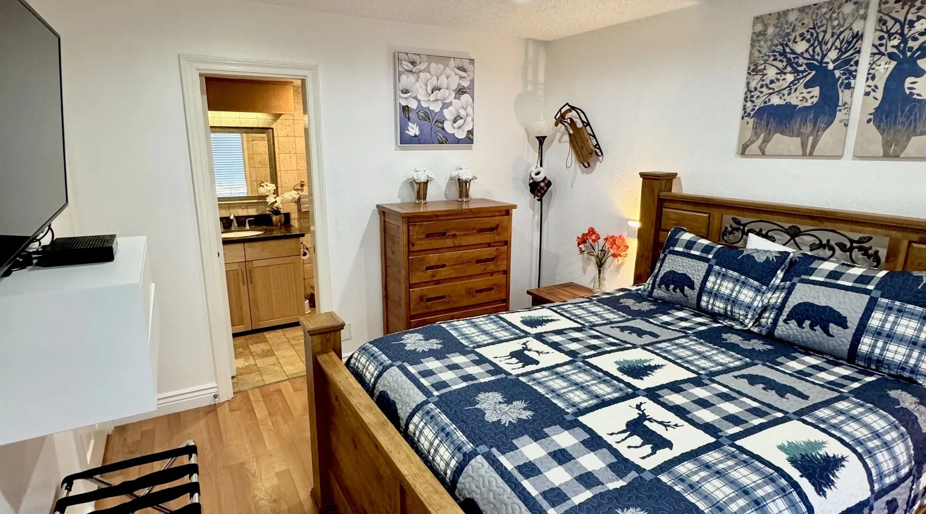 Knotty Pine Retreat Big Bear | Lakeside Condo Welcome to Knotty Pine Big Bear Lake Retreat, perfect for a group of friends or family vacation to the mountains our furnished and cozy two story condo chalet has all that you need for a memorable and relaxing vacation to Big Bear no matter the season you visit. Located in Boulder Bay your complex is less than a mile walk to local Pleasure Point Marina and under a short ten minute car ride to the Village, grocery stores, and ski resorts- this is the ultimate destination for any group. Enter on the lower level where you are greeted with gorgeous hardwood floors, cathedral ceilings, and big open windows that allow the perfect balance of natural lighting and views of the snow falling outside. Snuggle up here on the cozy couches as you warm your toes together in front of the toasty gas faux log fireplace and pop on a movie on the mounted flat screen TV with Cable and complimentary hi speed WIFI internet provided to keep you connected while vacationing. The breakfast bar stools and formal dining table provide plenty of space to enjoy your meals together as a group while the chef of your party will love the equipped kitchen here at Knotty Pine, complete with cookware, stainless appliances, and a dishwasher your cleanup will be an absolute breeze. Enjoy quick and easy access to a lower level bedroom and bathroom while the upstairs hosts two additional sleeping quarters and includes the primary suite with a private bath- all of your rooms are made up for your group with warm linens, blankets, pillows, and fresh shower towels for your visit when you arrive. Outside you can enjoy sipping your first cup of coffee in the mornings on your private patio deck with adorable patio furnishings or enjoy the propane BBQ where you can grill up your freshly caught dinner from the lake and unwind. Pairing relaxation and the necessities from home along with a most prime lakeside location you will absolutely love your stay here at our Knotty Pine - Big Bear Lake Retreat, as an added bonus this lakeside complex is within a short walk to local Pleasure Point Marina and offers a seasonal community tennis court and heated outdoor summertime pool and spa for your use. Sleeping Arrangements: Bedroom 1: Queen Bed- Downstairs Entry Level Bedroom 2: Full Bed- Upstairs 2nd Level Bedroom 3: King Bed, TV w/Cable, Private Full Bath - Upstairs 2nd Level Bathroom Arrangements: Hallway Full Bath - Downstairs Entry Level Private 3/4 Bath (Shower Only) - Bedroom 3- Upstairs 2nd Level -Sleeps 6 -2 Cars Driveway Parking -NO PETS ALLOWED- Fines Imposed For Pets Found On Premises -1,374 Total Square Feet City Permit #: VRR-2023-2261