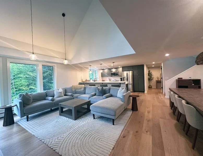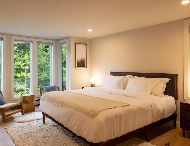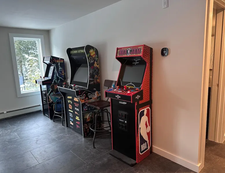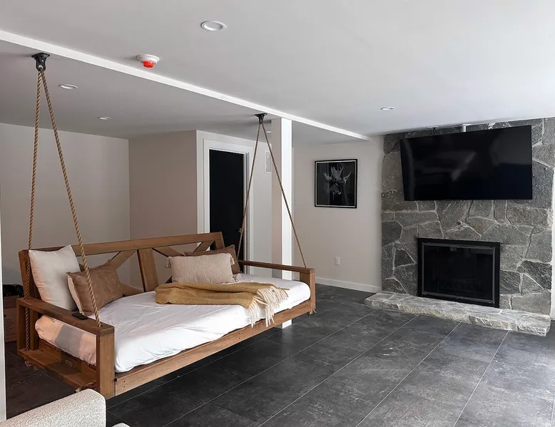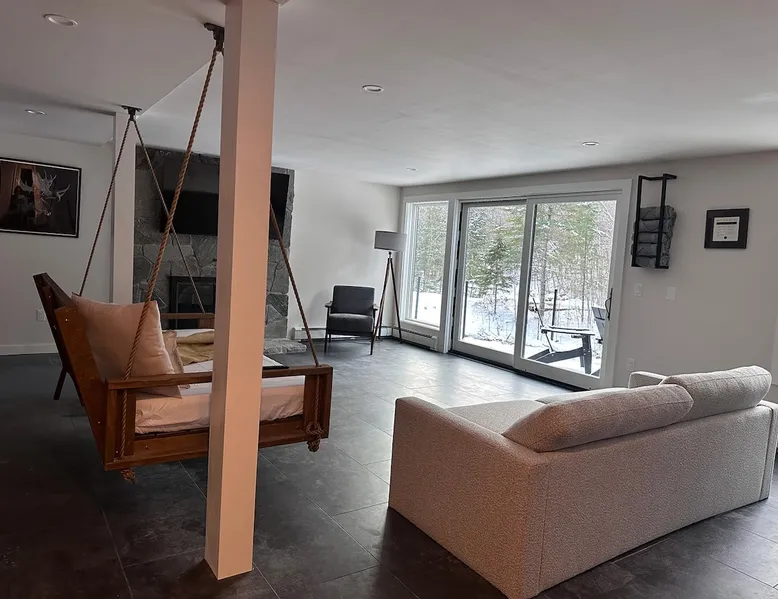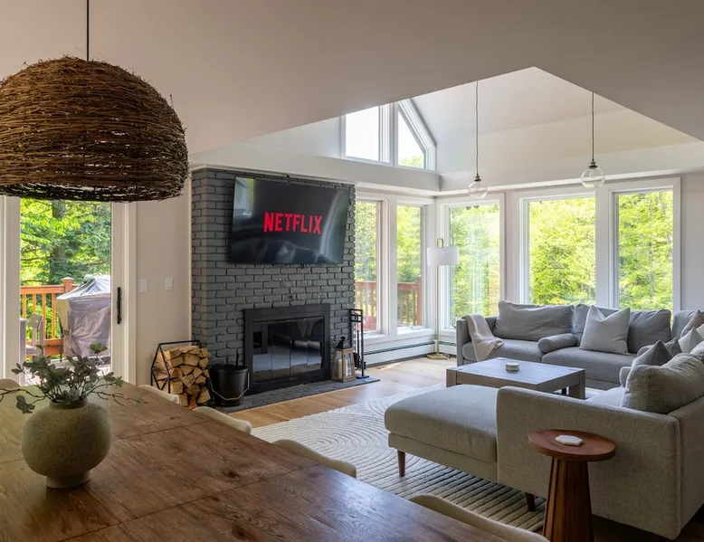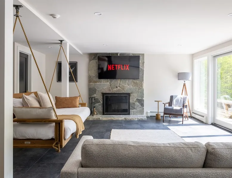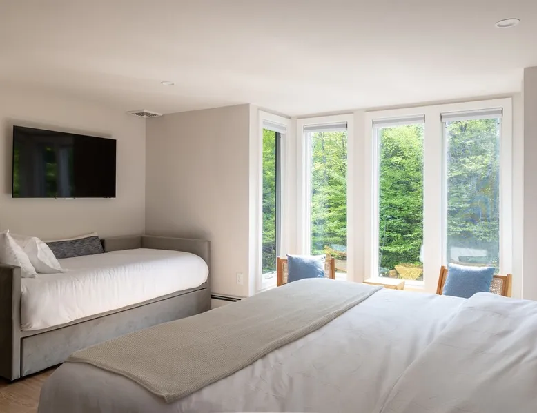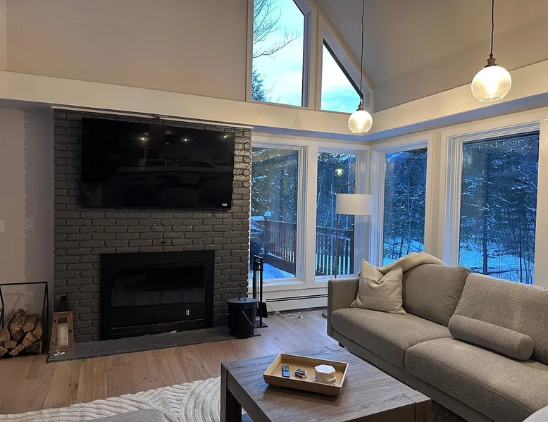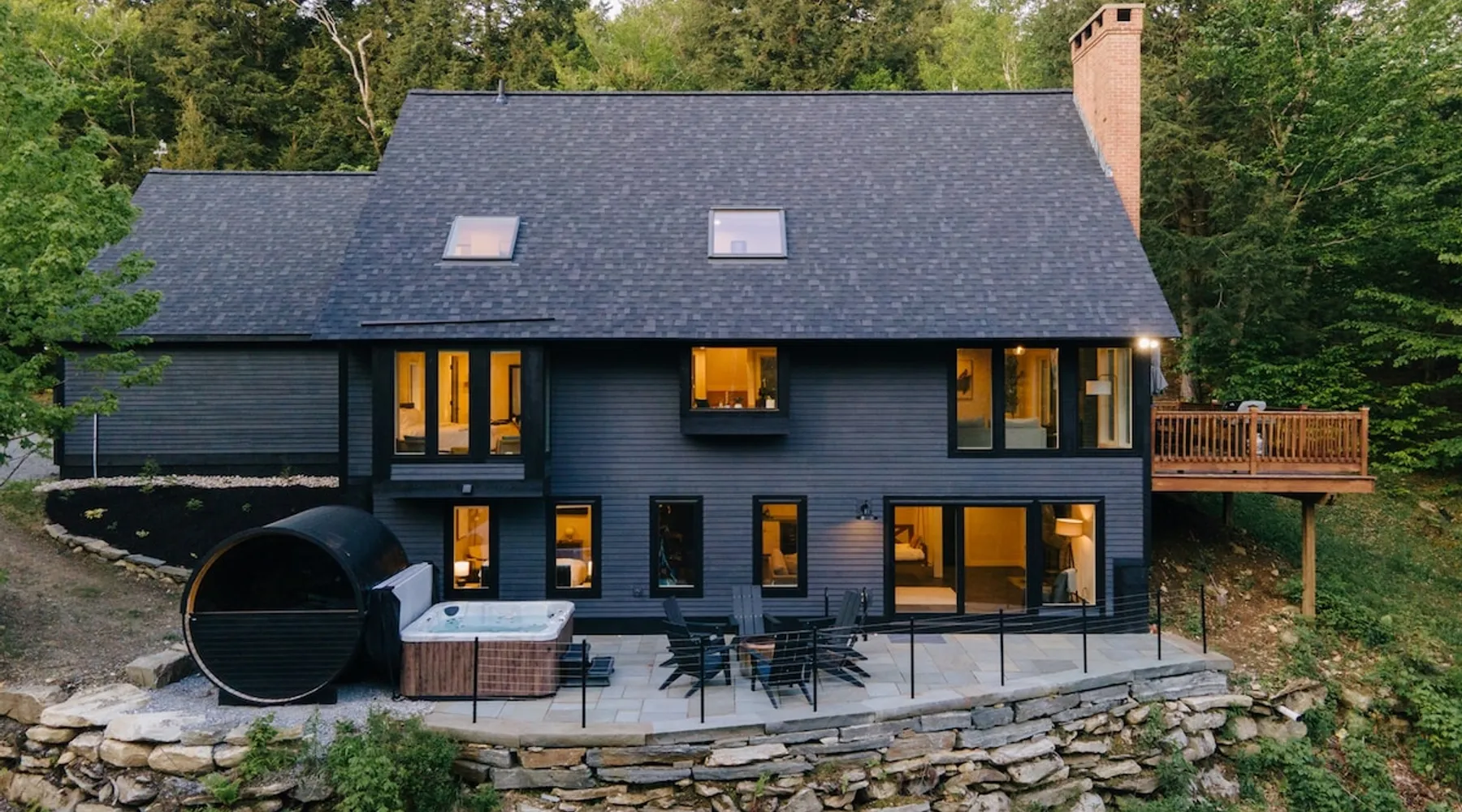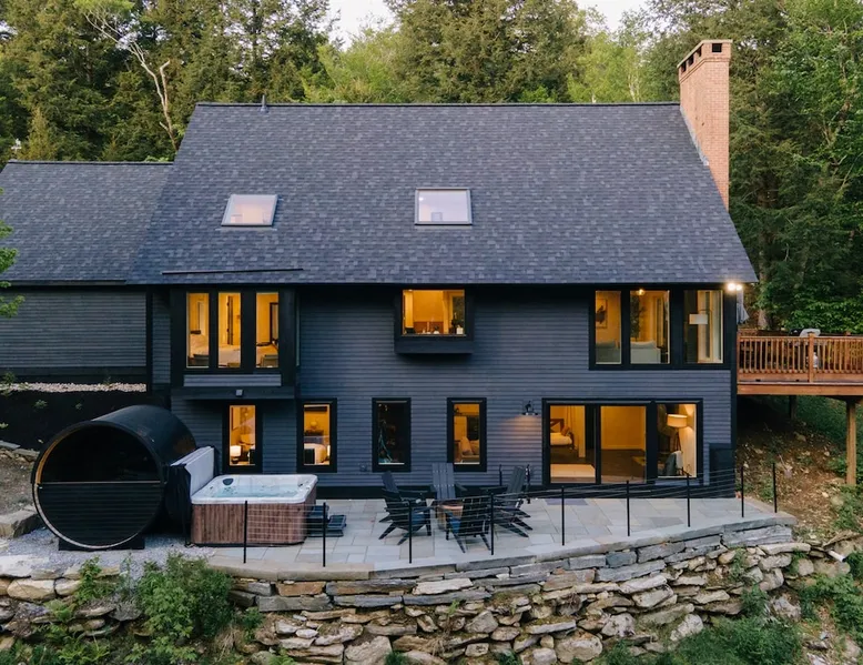 Our brand new outdoor heated plunge pool is almost complete! Escape to The Wandering Moose by 42 North LP. This meticulously curated modern home, steps from Stratton's winter shuttle, offers luxurious comfort for your group with four bedrooms and four and a half bathrooms. Enjoy a private hot tub, barrel sauna, and arcade games. With high-speed Wi-Fi and a pet-friendly policy, it's your perfectly appointed year-round base for unforgettable Vermont adventures. Book your serene getaway today! The space Experience unparalleled comfort and exquisite design on every floor of this stunning home. On the first level, you'll find a convenient half bath and an expansive, open-concept living space perfect for entertaining. The gourmet kitchen flows seamlessly into the elegant dining room and sophisticated living area. Step out onto the main level deck, complete with a BBQ and outdoor seating for eight, ideal for al fresco dining. Bedroom 1 is a serene primary suite featuring a plush king bed, a day bed with a trundle, and a full en-suite bathroom with an accessibility shower bar for ultimate comfort. Ascend to the second level for more refined accommodations. Bedroom 2 offers a luxurious queen bed with a trundle and a private en-suite bathroom with a deep soaking tub. Bedroom 3 provides flexible sleeping with two twin beds that can be easily configured as needed. A versatile loft area includes a comfortable pull-out couch and a laundry area, while a full hall bathroom with a shower serves this floor. The lower level unveils an impressive living space designed for relaxation and fun. Gather around the cozy stone fireplace or enjoy hours of entertainment on one of three arcade games. From this level, you can directly access the patio, where you'll find the private hot tub and barrel sauna, perfect for unwinding. Bedroom 4 provides a tranquil retreat with a sumptuous queen bed. A full hall bathroom with a shower and a second laundry room complete this exceptionally designed lower level. Guest access Guests will enjoy private, exclusive access to the entire Wandering Moose property, ensuring a truly private and undisturbed mountain retreat. Your convenience is our priority; check-in is seamless and flexible any time after 5 PM via our easy-to-use smart lock. We'll provide you with a unique access code before your arrival, so you can settle in at your own pace. Other things to note Here are a few friendly details to help you settle in and make the most of your mountain getaway: - Your Rental Agreement: After booking, we'll send a standard rental agreement for the primary guest to sign. It's a simple step to confirm your reservation and ensure a smooth stay. - Paws Welcome: We're happy to host your well-behaved dogs! You can bring up to two pups, with a $75 nightly fee per pet. - Primary Renter Age: The primary guest must be at least 25 years old to reserve the property. - Fresh Air Inside: For everyone's comfort, smoking is not permitted anywhere on the property, indoors or out. - Hot Tub & Sauna Ready: Your private hot tub and sauna are ready for relaxation! Their maintenance is included in your stay and they're professionally serviced between every visit. - Mountain Home Access: Like many authentic mountain homes, the Wandering Moose has stairs to access different areas. While the path to the entrance is lit, please note the property is not wheelchair accessible. - Safety & Security: For your peace of mind, there are exterior cameras on the property. The home is also equipped with a centrally monitored fire alarm for your safety. We can't wait for you to create unforgettable memories at the Wandering Moose!