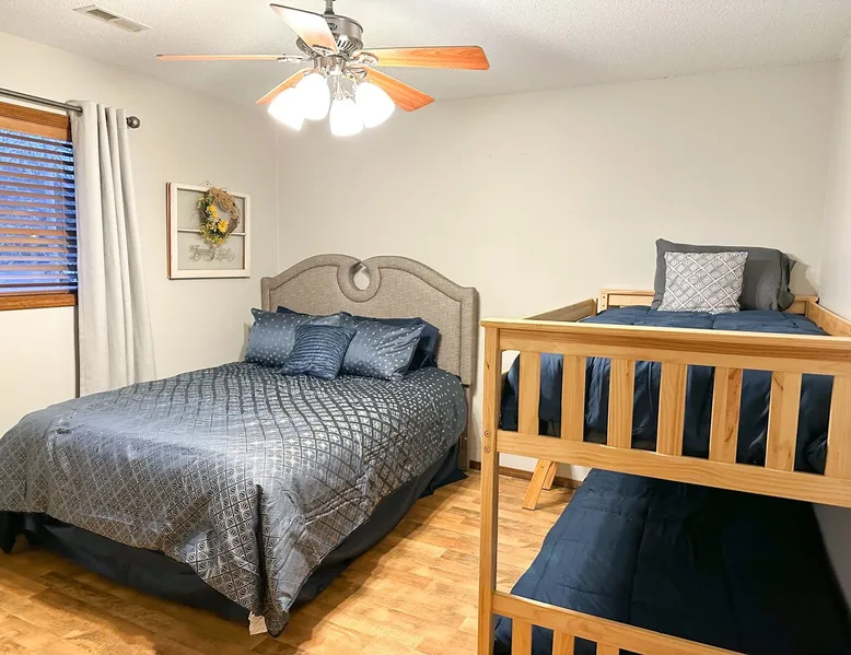 Notch★Sleeps20-3CONDOS★FreeTrailerParking BRANSON COZY GETAWAYS - THREE CONDOS located in the same building right across from the pool at Notch Estates. Included in the pricing are 3 condos with a total of 6 bedrooms, 6 bathrooms, 3 full kitchens and 3 large 24' decks. This configuration is perfect for friends or family vacationing together but still maintaining your own space. Condo 5 - Walk-in unit with 2 king beds & sofa bed Condo 9-King bed, queen bed, sofa sleeper Condo 10-King Bed, Queen bed, Bunk beds, Sofa sleeper Languages English
