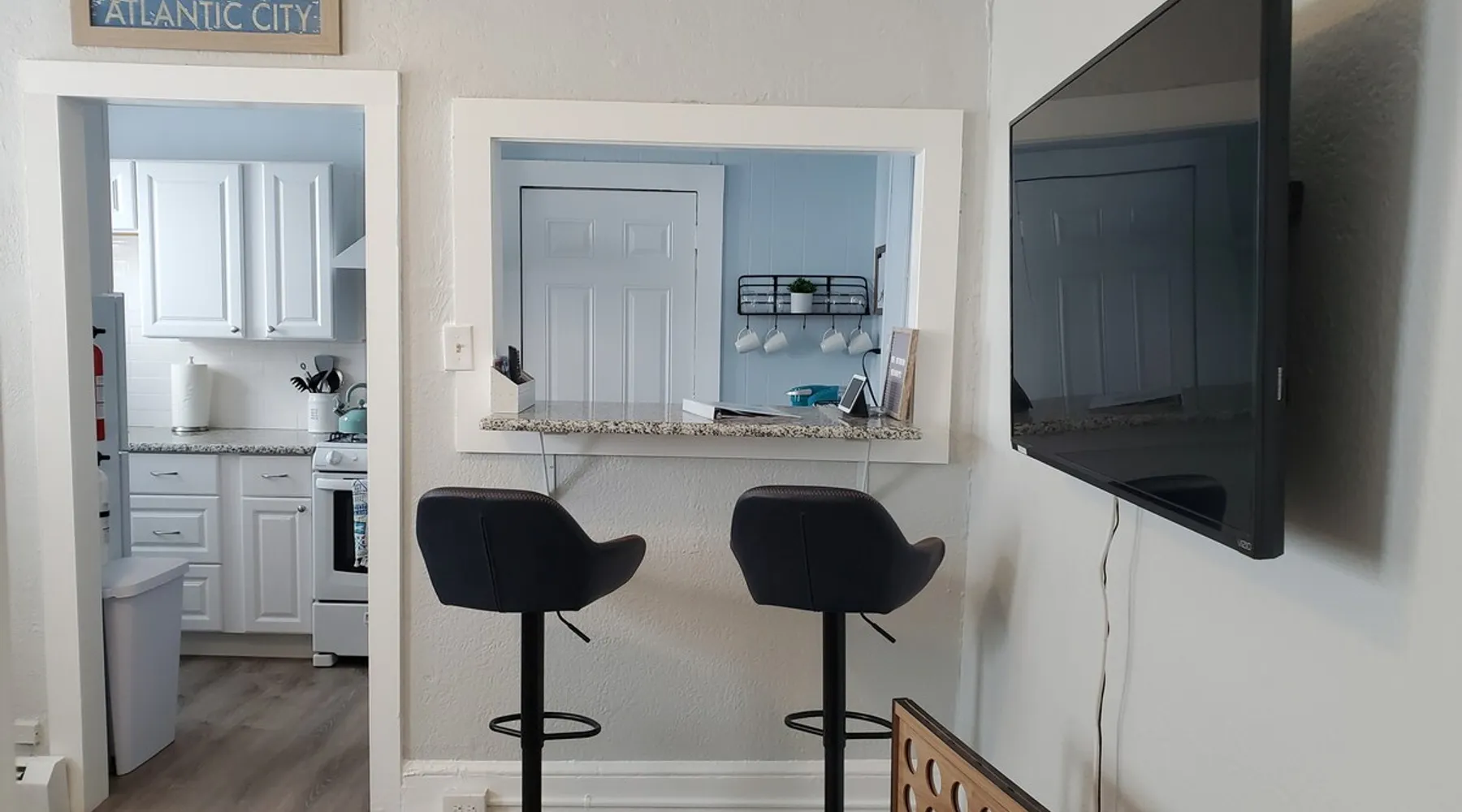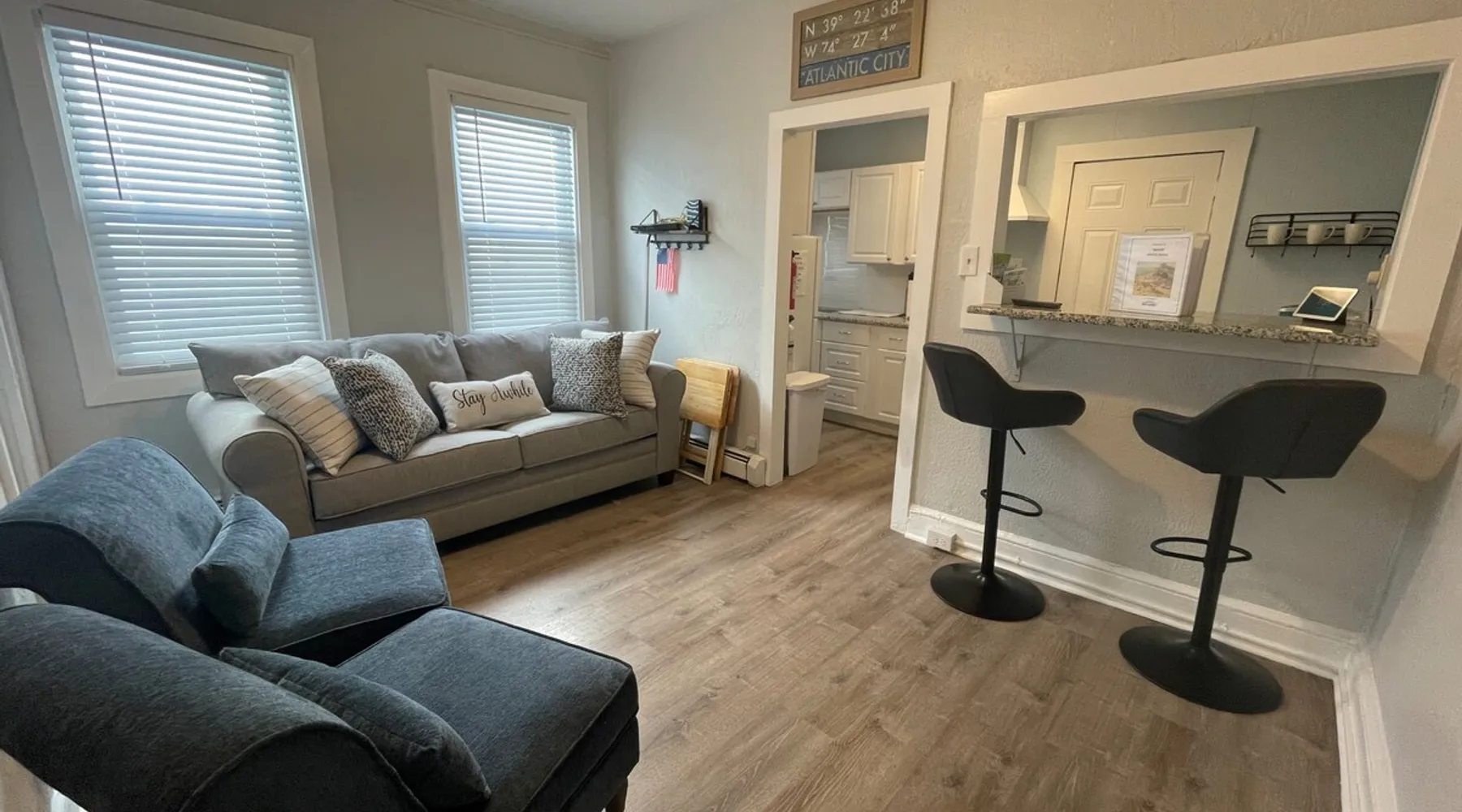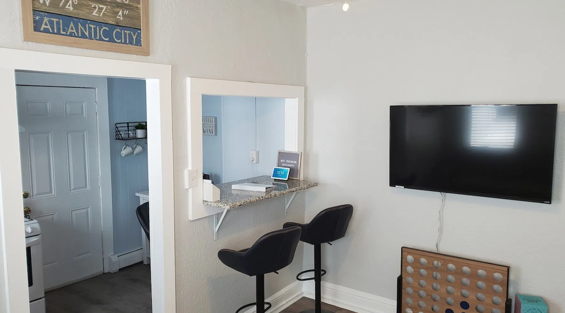 Just a few feet from the Beach & Boardwalk!!! Less than 10 min walk to Tropicana casino. Beautiful newly renovated 2 Bedroom, 1 Bath apartment located in a duplex. Freshly furnished & designed to create a cozy and comfortable home away from home by the beach! The apartment is surrounded by the best that Atlantic City has to offer! Awesome restaurants, bars, casinos and shops are within minutes of the property. Perfect location to enjoy a surf & sunrise. We invite you to come relax and unwind! The space This sunny beach apartment is the upper level of a Duplex. Step into a cozy space with 2 Bedrooms and 1 Full Bathroom. It is on the smaller side, but very cozy and in a great vicinity to the boardwalk and beach! SLEEPING ARRANGEMENTS: -Both bedrooms are adorned with cozy linens. -Each bedroom has a smart TV for your viewing pleasure (no cable, just streaming apps). BEDROOM 1: 1 King Size Bed BEDROOM 2: 1 Queen Size Bed KITCHEN: -The kitchen is brand new, fully stocked with amenities and new appliances. -There is an eating nook with 4 modern high stools and a charming coffee station perfect for a morning cup of brew. LIVING ROOM: -The Living room is cozy with a pull out couch and large smart TV. AMENITIES: -The home is also equipped with Wifi, several games, a Keurig coffee maker, an iron and ironing board, air conditioning/heat and much more! -The apartment has it's own thermostat for temperature controls. LOCATION: -This property is in a great vicinity to all that Atlantic City has to offer! Practically beachside, you can enjoy the sun and ocean, stroll the boardwalk and piers, visit eateries and bars, gamble at the nearby Casinos and shop till you drop at the Tanger Outlets. PLEASE NOTE: - This property is part of an attached duplex, meaning it shares walls with neighboring units. While we strive to provide a peaceful and comfortable stay, occasional noise or scents from adjacent units may be noticeable. These occurrences are outside of our control and are a natural aspect of shared-wall living. If this could impact your enjoyment, this property may not be the best fit for your stay. -Since this is the upstairs unit, please keep in mind that noise may be heard from the unit below or the property next door. -This property is a few feet from the beach and Boardwalk, and it is easy to track sand into the unit. -It is common that winds from the ocean might blow some sand through the window air conditioning vents or if exterior doors are left open. **We take the cleanliness and presentation very seriously. We have experienced this ongoing issue, and like to make guests aware of in the event they experience it. -Please be aware, parking can be quite difficult. We strive to provide parking permits for the street, however if misplaced, the city does not replace them. Therefore, we cannot guarantee their availability if a guest misplaces or takes them with them. There is a $100 fee for any misplaced permits. BOOK WITH US and unlock discounts and special offers exclusive to Cozy Cohost guests. Take advantage of all that Atlantic City has to offer and enjoy savings at top local spots including famous restaurants, night clubs, spas, coffee shops, distilleries, breweries, boat tours, bike rentals, mini golf, and more... Guest access ACCESS & ENTRY: -Guests will have access to the entire upstairs apartment. -This apartment is the upper floor of a duplex. -The lower level guests share the same front entry, but each apartment has its own separate entrance. - Since this is a duplex, attached property close to the Boardwalk, there is the potential for noise. You may hear neighbors or people walking from the Boardwalk. -Please be respectful to the neighbors, other guests, and the surrounding homes and businesses. -Please note that check-out time is promptly at 11:00 AM. Failure to check out by this time may result in a $100 fee per hour. We appreciate your cooperation in ensuring a smooth transition for our next guests. Thank you for your understanding! KEYLESS ENTRY: There is keyless entry. Your host will provide you with the door code approximately one hour prior to check in the day of your trip. PARKING: -There is only on street parking at this property. -There is no driveway or designated parking area. -You will be provided with 1 residential parking permit to use in areas that have time restricted parking signage. -$100 fee for unreturned parking permits upon check out. -We strive to provide parking permits for our guests' convenience; however, please note that availability is limited. The city issues a set number of permits and unfortunately does not replace lost or unreturned ones. While we do our best to ensure permits are available for your stay, there may be rare instances when a previous guest has misplaced one. We sincerely apologize if this occurs and appreciate your understanding. -Guests are responsible for city street parking compliance; read & follow signage to avoid parking tickets. -We are not responsible for parking tickets due to negligence. ADDITIONAL PARKING: -For extra vehicles, there are several paid parking lots and meters in the area, and we will provide you with information regarding using the lots with your check-in information. -There is also a parking garage at Stockton University on Atlantic Avenue. MAIL: -Please do not ship items to the property. -If there is something of priority that you need shipped please reach out to us directly for alternative options. -We are not responsible for any items shipped to the property. ENVIRONMENTAL NOTES: -Property located in a city environment; potential for noise from cars or foot traffic. -Please be advised, since this property is a few feet from the beach and Boardwalk, it is easy to track sand into the unit and it is common that winds that come off the ocean might blow some sand through the window air conditioning vents or if exterior doors are left open. SECURITY: -The home is protected by exterior ring camera security. -There are R
