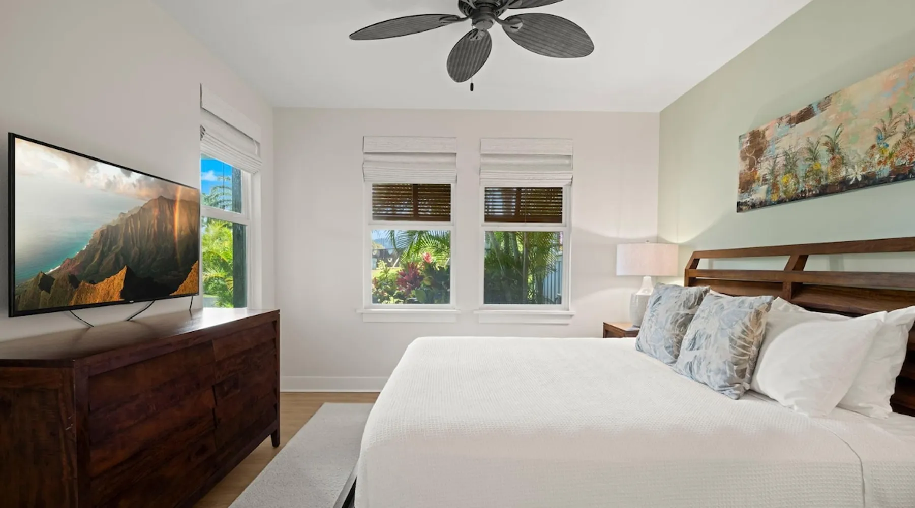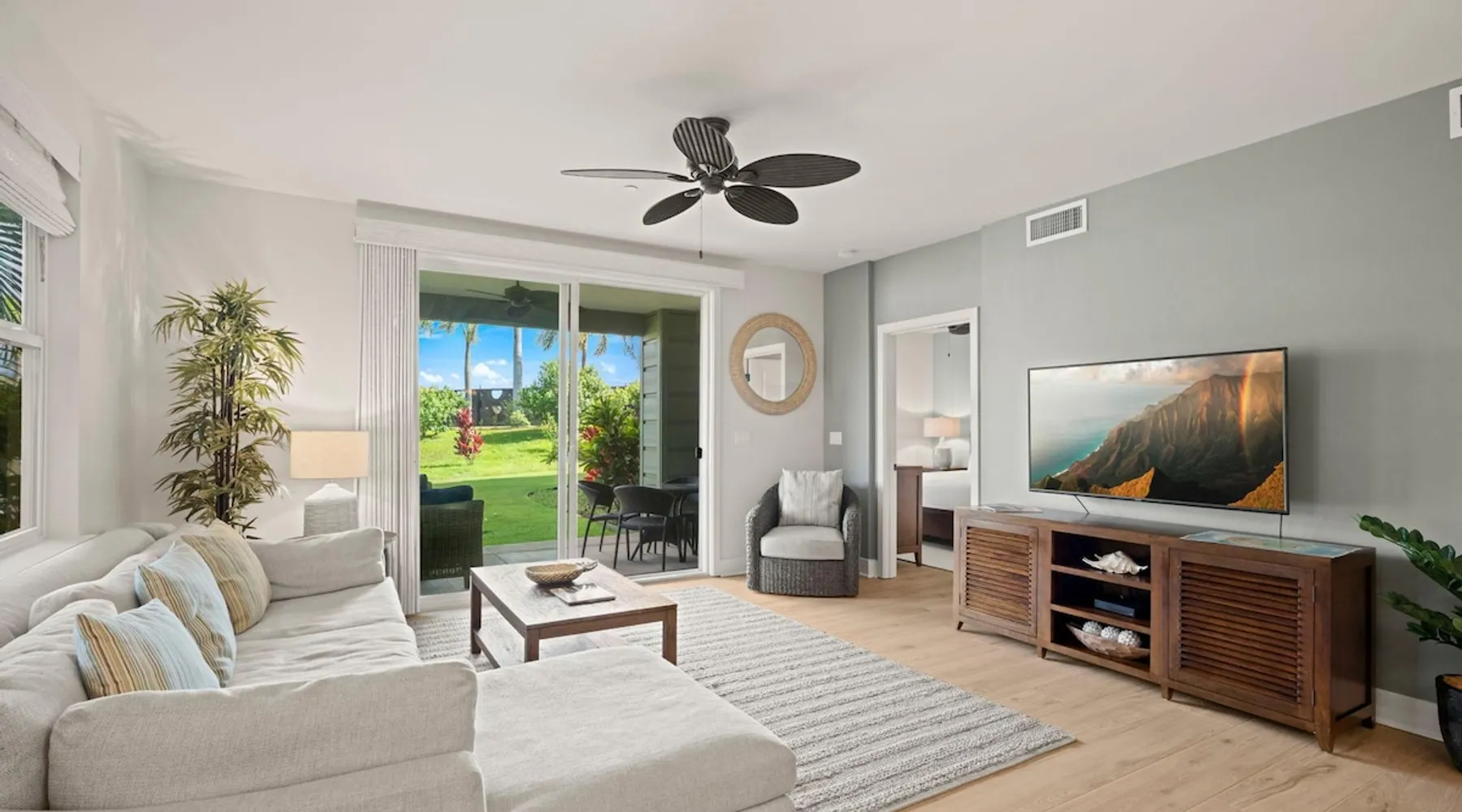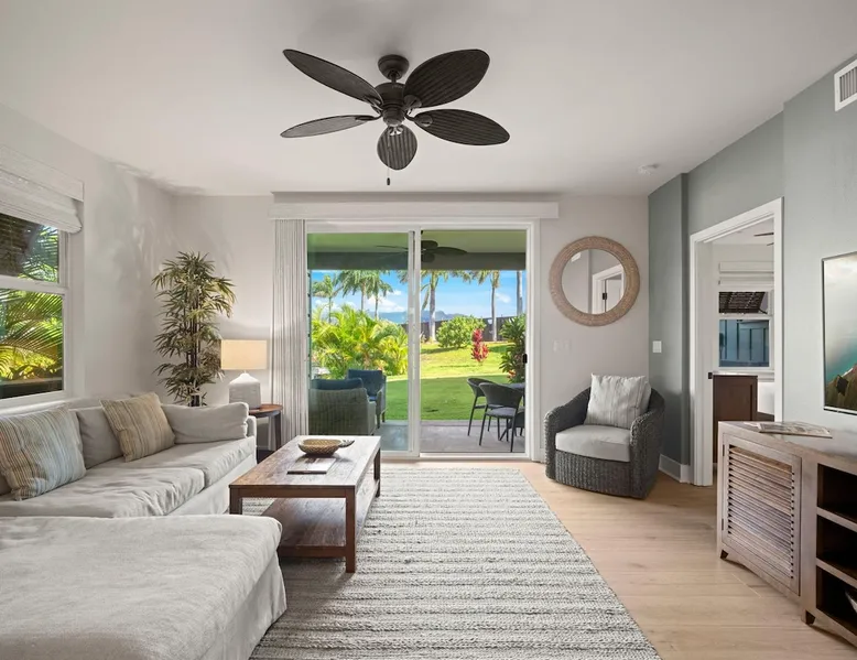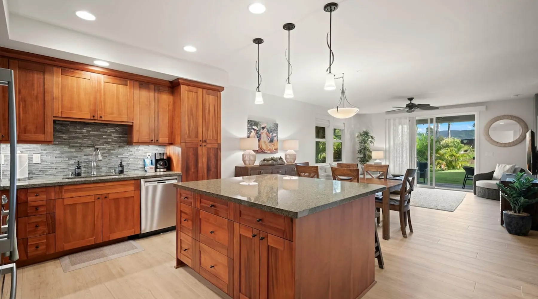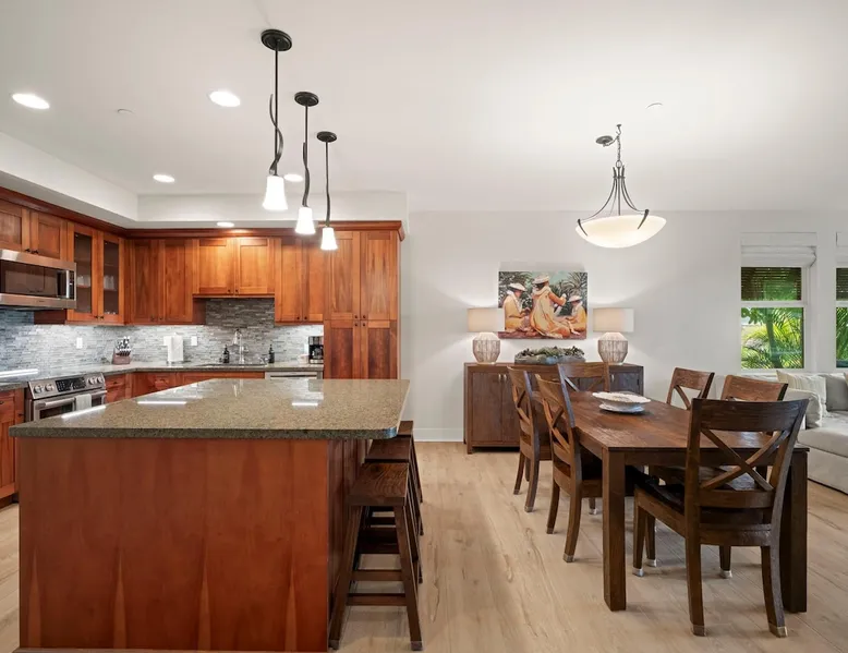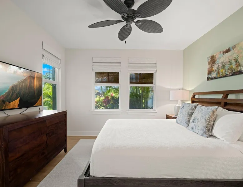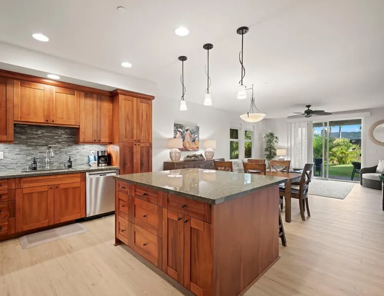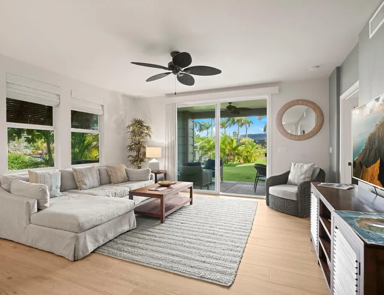 Hawaii Life Rental Presents Pili Mai 5D - Luxury three bedroom, three bathroom condo. Centrally located on Kauai’s sunny south side! The space Make yourself at home in this luxury three bedroom, three bathroom condo located on Kauai’s sunny south side! A generously open-floor plan allows for abundant natural lighting and air flow throughout the entire home. The spacious living room features comfortable furnishings and a large entertainment center with flat-screen, cable TV. Plentiful windows offer cooling trade-winds and display lush greenery with beautiful mountain views. Step through sliding glass doors to a covered lanai which includes a dining area and lounge space. Enjoy a morning cup of coffee, afternoon drink, or dinner surrounded by colorful, tropical foliage! The living room flows into the appointed dining area with a lovely wood table and chairs for six. You will find everything you need to create a gourmet meal at home in this fully-stocked kitchen, equipped with granite countertops, stainless appliances, bountiful cabinet and counter space, and large center island. Wonderfully bright and modern, anyone will feel like a five-star chef here! The Master Bedroom features a king size bed, generous walk-in closet with wardrobe, and colorful garden views. The spacious ensuite bathroom includes a double vanity and walk-in, glass shower. The Second Bedroom also features a king size bed, ample closet space, and small dresser. The private ensuite bathroom includes a full bathtub and shower. The Third Bedroom offers a Queen Bed, full closet, and dresser. The third bathroom is a shared full bath with a combination bathtub and shower. All three bedrooms include Cable TV, Ceiling Fans, and double bedside tables with reading lights. Adjacent to the second bedroom is an executive office area with desk, chair, additional storage, and enough privacy to get work done! Contemporary and tasteful island decor creates a tropical vibe throughout the house. The perfect balance of luxury and comfort. This unit is single-level plan so no need to worry about carrying luggage up any stairs! Additional amenities include Washer and Dryer, Wifi, Hair dryers, iron and ironing board, parking, one in-room safe, telephone and beach essentials. Indoor Features: -King bedroom with en suite, walk in shower -King bedroom with ensuite, bathtub and shower -Queen bedroom -Hall bath with tub/shower combo -Washer/Dryer in unit -Central air conditioning Pili Mai is Kauai's newest resort development and is located within the famous Kiahuna Golf Course. Guest’s have access to the resort’s community recreation center with gas BBQ's, outdoor pool, children's pool, and spa, sun deck with lounge chairs and umbrellas, outdoor showers, covered dining and lounge area, and indoor fitness center. Centrally located, everything you need is within walking distance at the Poipu Shopping Village which offers restaurants, coffee shops, small convenience stores, shopping, and entertainment! Poipu Beach Park is just over a mile away and is an ideal location to spend a day snorkeling and relaxing. ***Disclosure: As of Aug 19, 2022 a new project is underway approximately. 0.6 miles away which guests may hear noise from machinery & construction. Hawaii Life Rentals is a locally owned, licensed real estate company with rentals on Kauai, Maui, Oahu, and Hawaii. We offer on-island personal assistance and Concierge services. Rates do not include taxes, cleaning and applicable fees. Hawaii Life/VRBO bookings: Guests must sign a rental contract within 48 hours of booking to confirm the reservation. TA-097-841-3568-01 TMK- Registration Details 280140330311, TA-097-841-3568-01