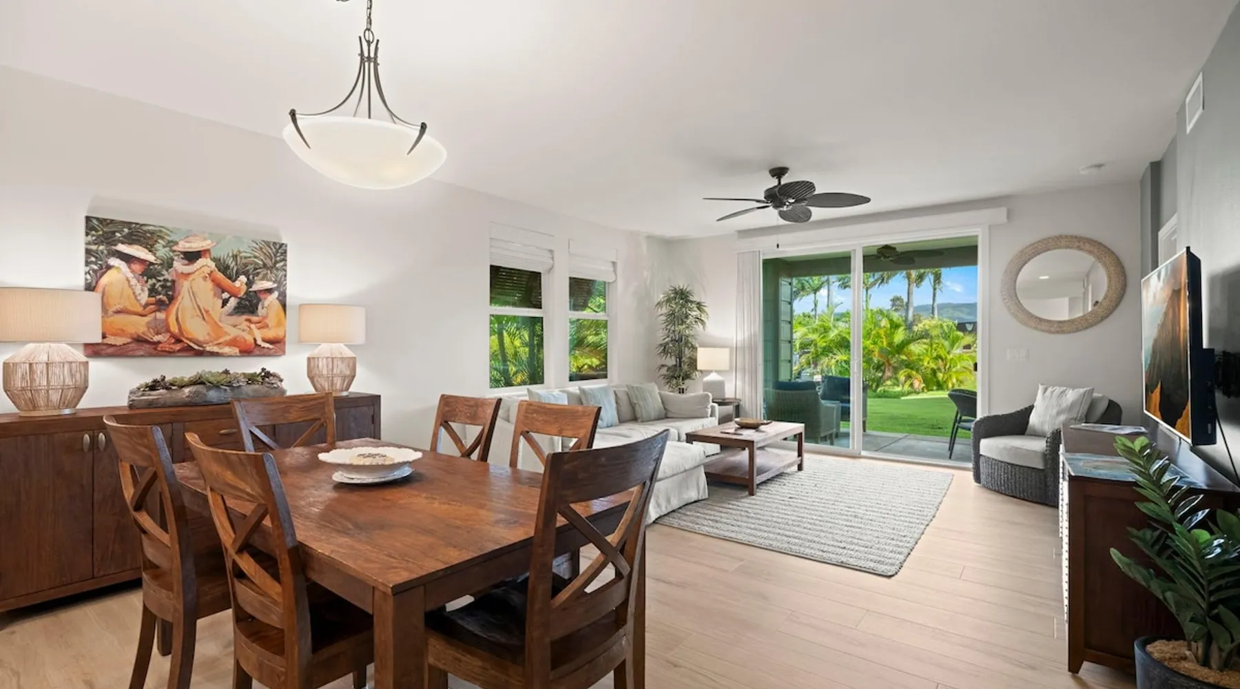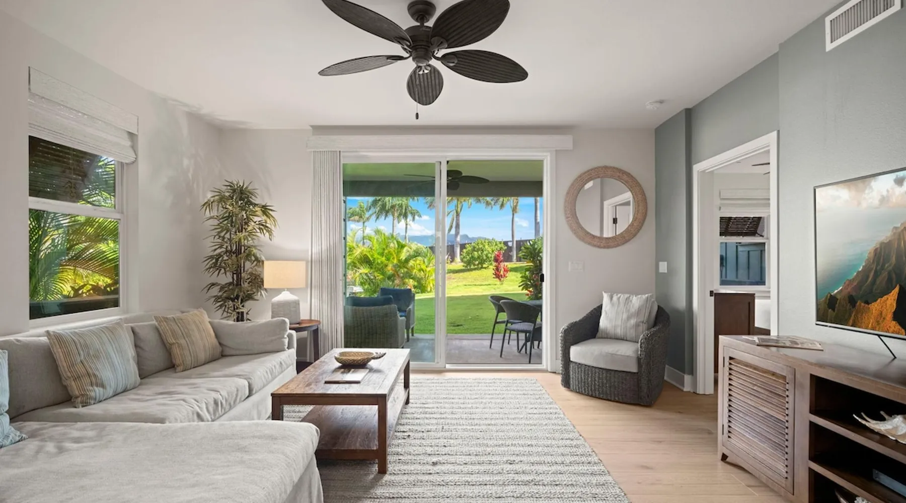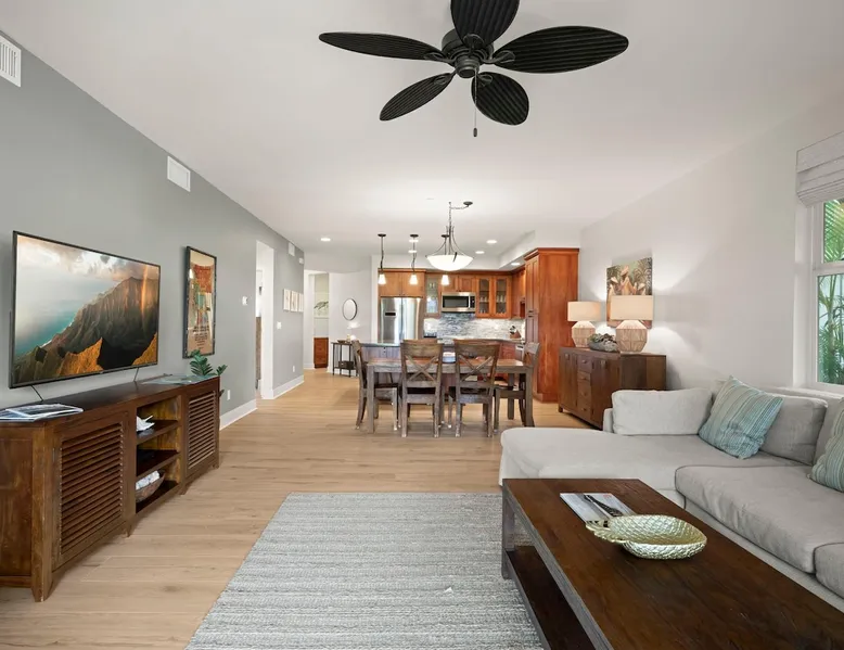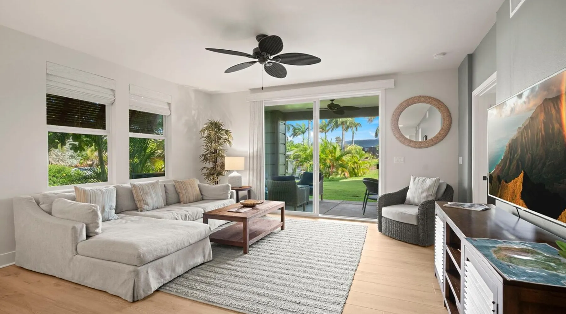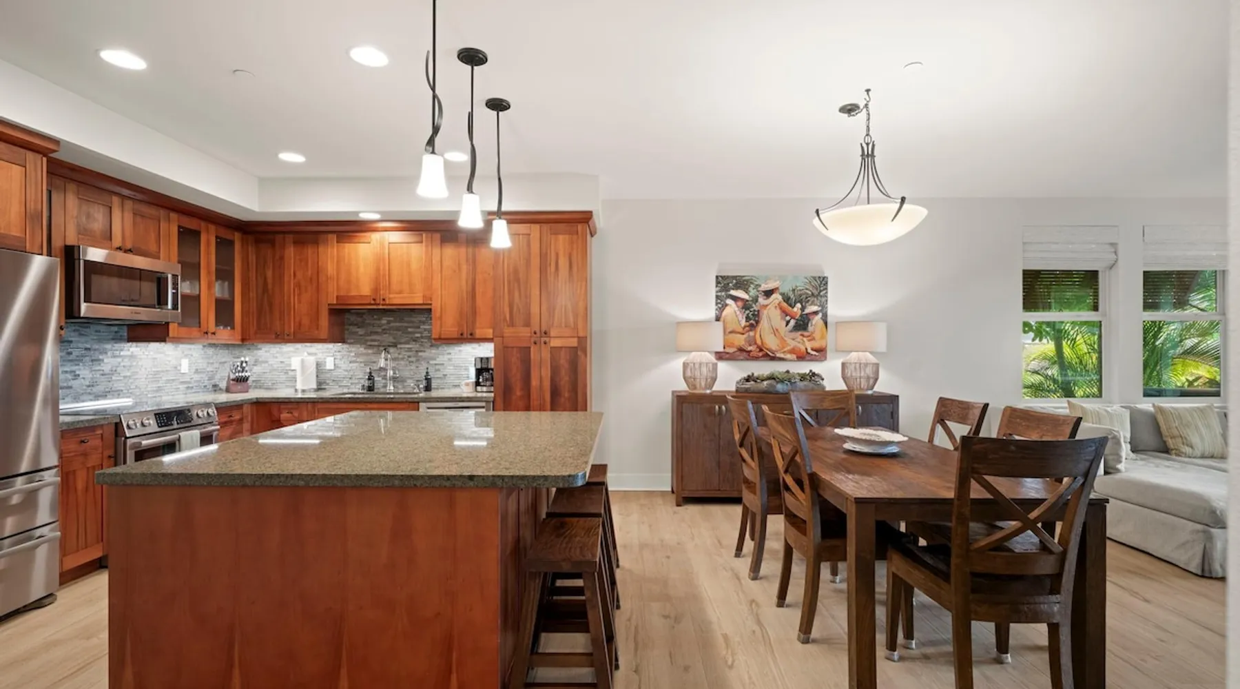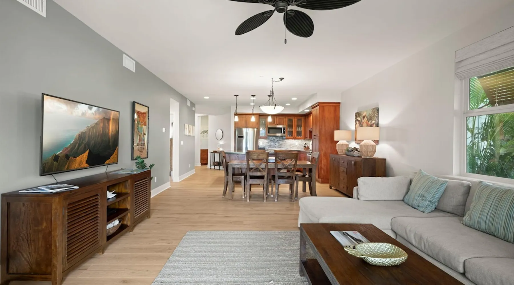 Hawaii Life Rental Presents Pili Mai 5D - Luxury three bedroom, three bathroom condo. Centrally located on Kauai’s sunny south side! The space Make yourself at home in this luxury three bedroom, three bathroom condo located on Kauai’s sunny south side! A generously open-floor plan allows for abundant natural lighting and air flow throughout the entire home. The spacious living room features comfortable furnishings and a large entertainment center with flat-screen, cable TV. Plentiful windows offer cooling trade-winds and display lush greenery with beautiful mountain views. Step through sliding glass doors to a covered lanai which includes a dining area and lounge space. Enjoy a morning cup of coffee, afternoon drink, or dinner surrounded by colorful, tropical foliage! The living room flows into the appointed dining area with a lovely wood table and chairs for six. You will find everything you need to create a gourmet meal at home in this fully-stocked kitchen, equipped with granite countertops, stainless appliances, bountiful cabinet and counter space, and large center island. Wonderfully bright and modern, anyone will feel like a five-star chef here! The Master Bedroom features a king size bed, generous walk-in closet with wardrobe, and colorful garden views. The spacious ensuite bathroom includes a double vanity and walk-in, glass shower. The Second Bedroom also features a king size bed, ample closet space, and small dresser. The private ensuite bathroom includes a full bathtub and shower. The Third Bedroom offers a Queen Bed, full closet, and dresser. The third bathroom is a shared full bath with a combination bathtub and shower. All three bedrooms include Cable TV, Ceiling Fans, and double bedside tables with reading lights. Adjacent to the second bedroom is an executive office area with desk, chair, additional storage, and enough privacy to get work done! Contemporary and tasteful island decor creates a tropical vibe throughout the house. The perfect balance of luxury and comfort. This unit is single-level plan so no need to worry about carrying luggage up any stairs! Additional amenities include Washer and Dryer, Wifi, Hair dryers, iron and ironing board, parking, one in-room safe, telephone and beach essentials. Indoor Features: -King bedroom with en suite, walk in shower -King bedroom with ensuite, bathtub and shower -Queen bedroom -Hall bath with tub/shower combo -Washer/Dryer in unit -Central air conditioning Pili Mai is Kauai's newest resort development and is located within the famous Kiahuna Golf Course. Guest’s have access to the resort’s community recreation center with gas BBQ's, outdoor pool, children's pool, and spa, sun deck with lounge chairs and umbrellas, outdoor showers, covered dining and lounge area, and indoor fitness center. Centrally located, everything you need is within walking distance at the Poipu Shopping Village which offers restaurants, coffee shops, small convenience stores, shopping, and entertainment! Poipu Beach Park is just over a mile away and is an ideal location to spend a day snorkeling and relaxing. ***Disclosure: As of Aug 19, 2022 a new project is underway approximately. 0.6 miles away which guests may hear noise from machinery & construction. Hawaii Life Rentals is a locally owned, licensed real estate company with rentals on Kauai, Maui, Oahu, and Hawaii. We offer on-island personal assistance and Concierge services. Rates do not include taxes, cleaning and applicable fees. Hawaii Life/VRBO bookings: Guests must sign a rental contract within 48 hours of booking to confirm the reservation. TA-097-841-3568-01 TMK- Registration Details 280140330311, TA-097-841-3568-01