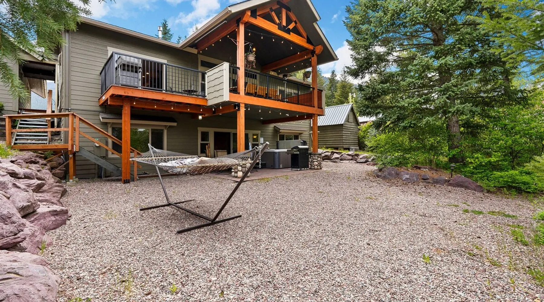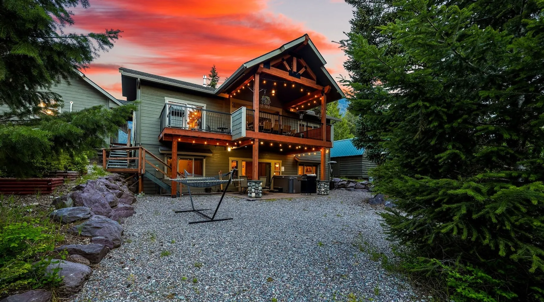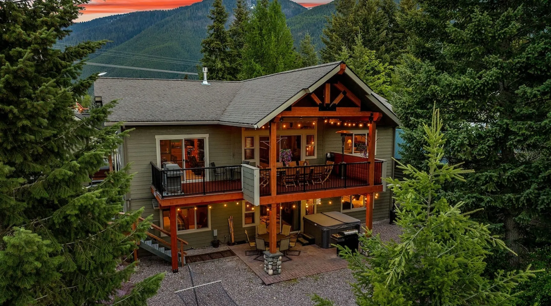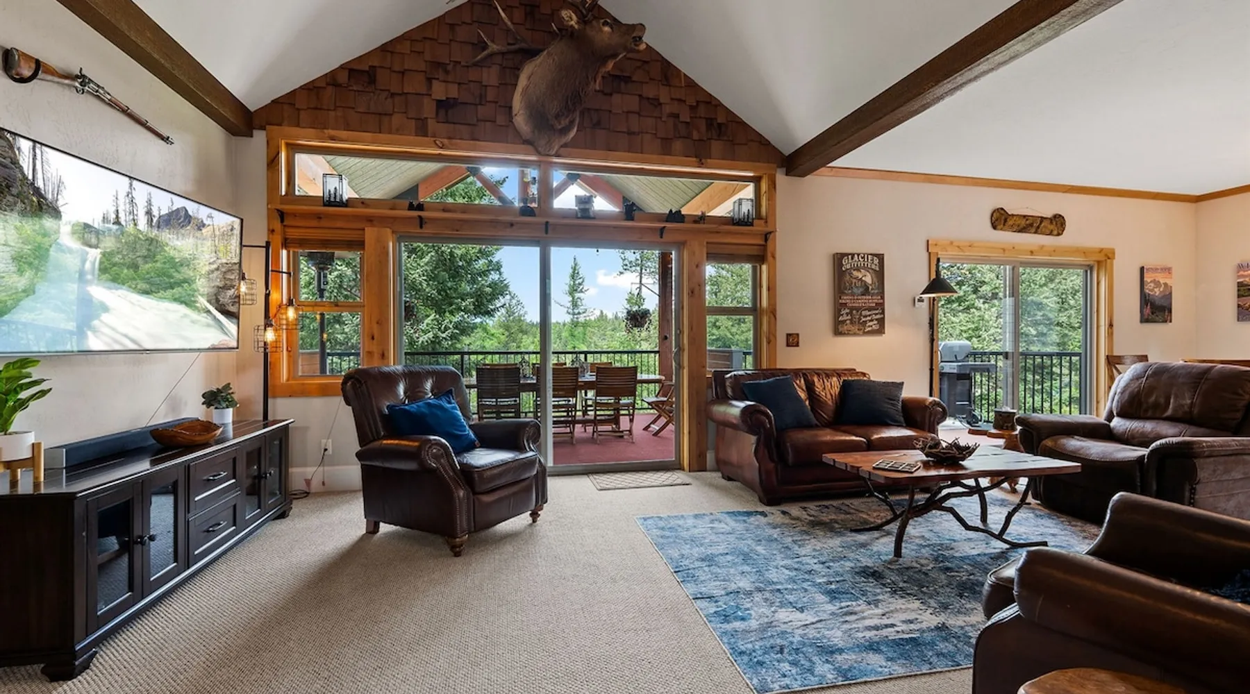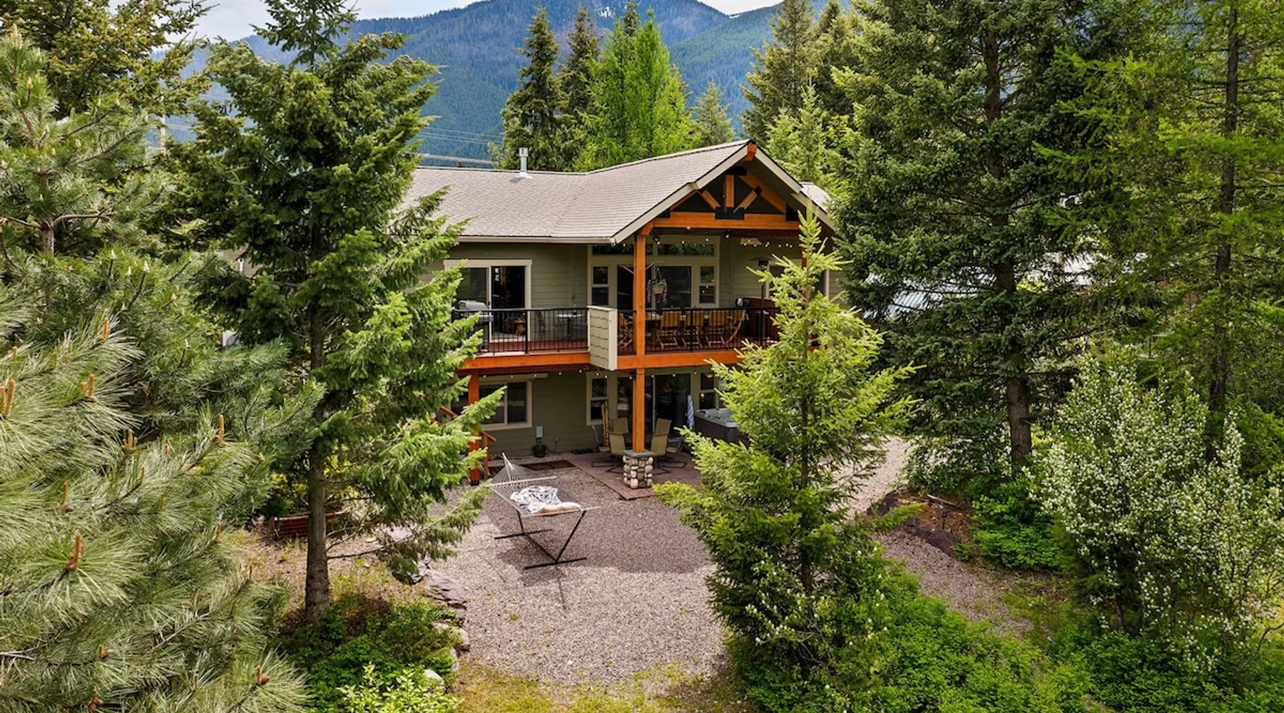 The perfect location to experience it all! Just 10 min from the West entrance of Glacier National Park, 29 miles from Flathead Lake (the largest natural lake in the west), 6 minutes away from two different ziplines and aerial parks, 4 minutes to mini golf, 10 minutes to water slides, along with ample opportunities for white-water rafting, horse-back riding, hiking, fishing, boating, skiing, biking and many other activities. Just 23 mi from Big Mountain, with 3000 acres of World class skiing! The space After a full day of adventure, come home and curl up by the fire or soak away your sore muscles in the large, 6 person hot tub. Enjoy amazing views of the river and mountains from the waterfront gazebo and secluded backyard or treat yourself to a family-style BBQ on the upper deck! There's plenty of space to unwind and relax with family and friends! Conveniently located within walking distance to groceries, fuel and dining and only 14 miles from Glacier International Airport. ☆☆ LUXURY AMENITIES ☆☆ This custom 3200 sq. ft. home combines rustic charm with five-star amenities for an incredible retreat! It offers 3 bedrooms, 3.5 bathrooms, spacious living areas, a well-stocked kitchen and sweeping balconies to help you relax while surrounded by natural beauty with river and mountain views. This home sleeps 10-12 and has been stocked with everything you'll need for an unforgettable vacation! With 43" 4K Smart TVs in every bedroom, a 60" Smart TV in each living room, a 6 person hot tub, stainless steel appliances, pine log beds with luxury mattresses, a fireplace, a fully-stocked kitchen including spices, coffee and tea supplies, a ping-pong table, foosball table, double shot basketball, corn hole, old fashioned popcorn maker, and much more! It even has three refrigerators and two dishwashers for those wanting to do their own meal prep, and a washer and dryer for your convenience. ☆☆ BEDROOMS & SLEEPING ARRANGEMENTS ☆☆ On the upper level you'll find a master suite (nicknamed the Eagle's Nest) with a luxury King size bed and ensuite bathroom including an infrared sauna, with large windows that look over the wooded back yard. On the lower level there is a second master suite (the Bear's Den) with a luxury King size bed and ensuite bathroom, the third bedroom (Moose Hollow) with a Queen size bed, each located conveniently right off the additional kitchenette, living room & bathroom. There is also a brand new sleeper sofa in the downstairs lounge area (Goat Mountain) and 2 rollaway beds and 2 blow up queen sized air mattresses available for extra guests. ☆☆ BATHROOMS ☆☆ This home is perfect for groups of 10-12 for many reasons, and one is because it has 3.5 updated bathrooms. The master bathroom has a gorgeous tiled walk in shower with rain shower features, two sinks with expansive counter space, huge walk-in closet, separate toilet room and designer finishes. The second ensuite bathroom has a walk in shower behind glass doors, rain shower features and double sinks with ample counter space and a large walk-in closet. The third bathroom features a tub/shower combo and a single sink with adequate counter space, while the half bathroom is conveniently located between the dining room and game room. Plush hotel quality towels are provided throughout. ☆☆ KITCHEN & LOUNGE ☆☆ Designed for entertaining groups, this home features multiple lounge spaces indoors and out and a fully stocked, galley style gourmet kitchen. The main living room has a wall of windows that overlook the shady patio and lush green, wooded property. The designer finishes and decor bring the beauty of nature indoors, and the luxury furniture makes this open space the perfect place to get together. Relax in the leather recliners or matching sofa and watch your favorite shows on the sleek 65" flat-screen TV. The gourmet kitchen sits right off the living room and dining room areas. There's room to keep your groceries in the cabinets and any one of the three stainless steel fridges, use the gas range to make homemade meals from scratch or heat leftovers in the microwave. Enjoy using the coffee maker for freshly brewed coffee, the toaster, blender, InstaPot, or any other gadgets to make your family's favorite meals and treats. The formal dining room sits in a sunny alcove of windows and offers comfortable seating for 8. Downstairs, there is even more room to hang out. A kitchenette with a fridge, dishwasher, microwave and slow drip and Kuerig coffee equipment and supplies, making it easy to whip up a quick snack or drink to enjoy in the adjacent secondary lounge area. Sit at the custom log bar with your snacks or set up your laptop here and get some work done. The lounge has a comfortable sofa in front of an electric fireplace, 65" flat screen TV, and sliding glass doors that lead out to the covered patio and hot tub. The final lounge area is a place the kids won't want to leave! Check out the brand new Infinity Game Table with games for all ages! Also features a large sofa/chaise lounger in a carpeted area for watching TV or playing your favorite PS4 game with an old fashioned movie theatre style popcorn popper. It also has an Infinity Game table, ping pong table, foosball table, and large connect four. This area is located in the detached, heated garage which is perfect for keeping the noise down in the main living areas. ☆☆ OUTSIDE SPACE ☆☆ Nothing beats feeling the crisp mountain air on your cheeks, hearing the chirp of a passing robin, the breeze as it ruffles the aspen leaves, and the sound of the river as it traverses down the canyon while sitting in the comfort of your own private deck in solitude. What a feeling of peace and freedom and exhilaration as you experience relaxation like never before! This nature lover's oasis offers multiple ways to enjoy the outdoors. There are two private patios, one on each level of the home. The main patio has soaring wood-paneled ceilings, outdoor lounge furni