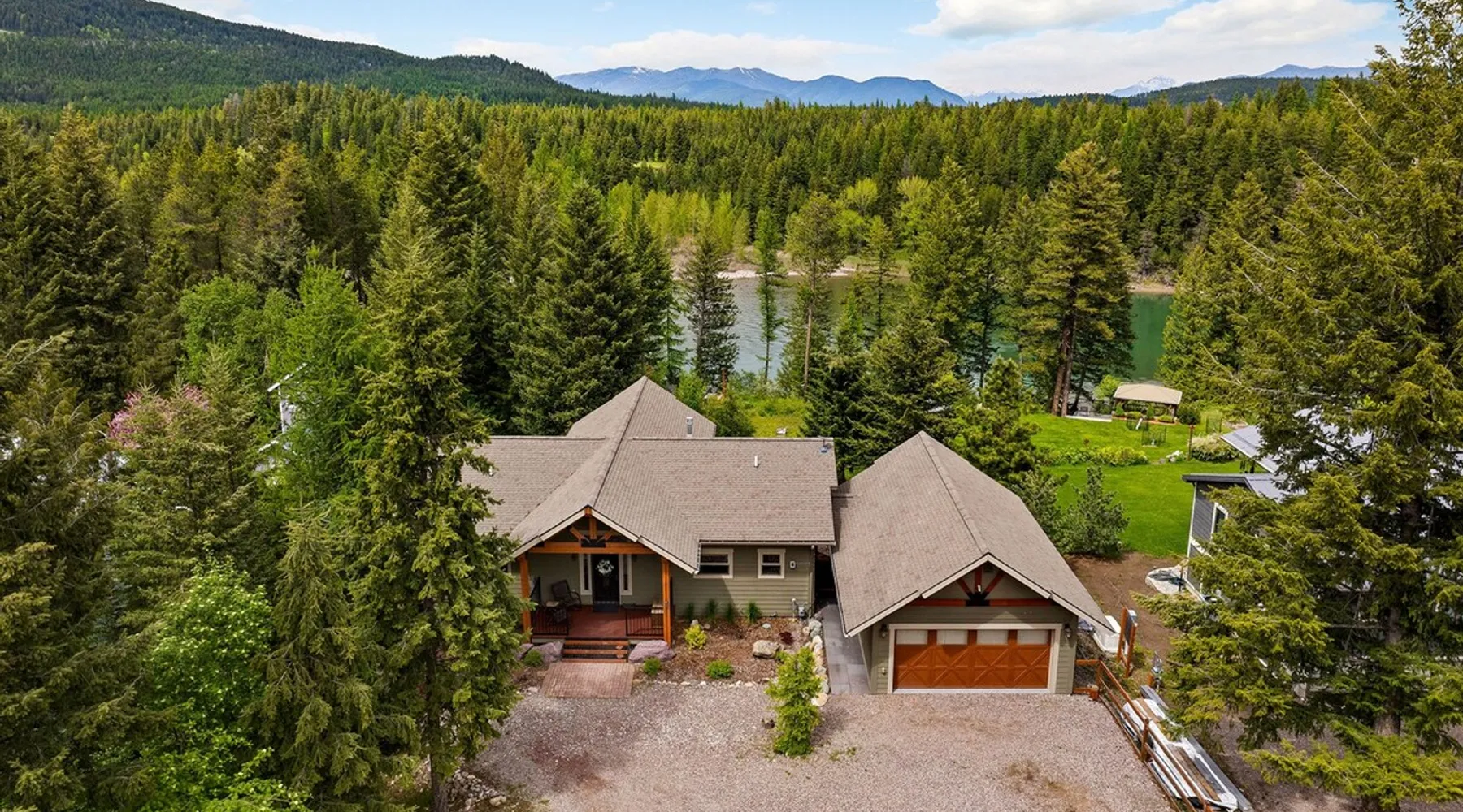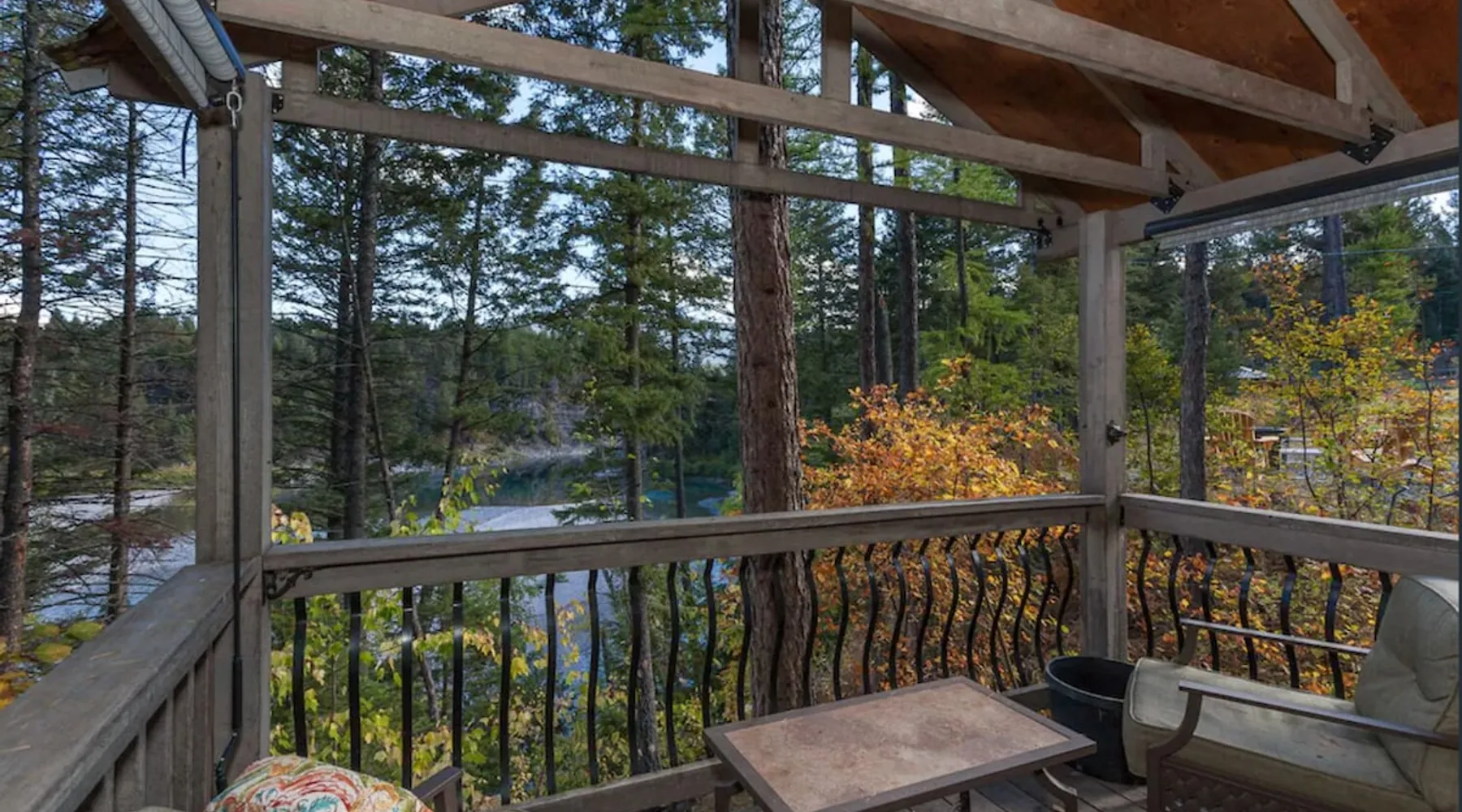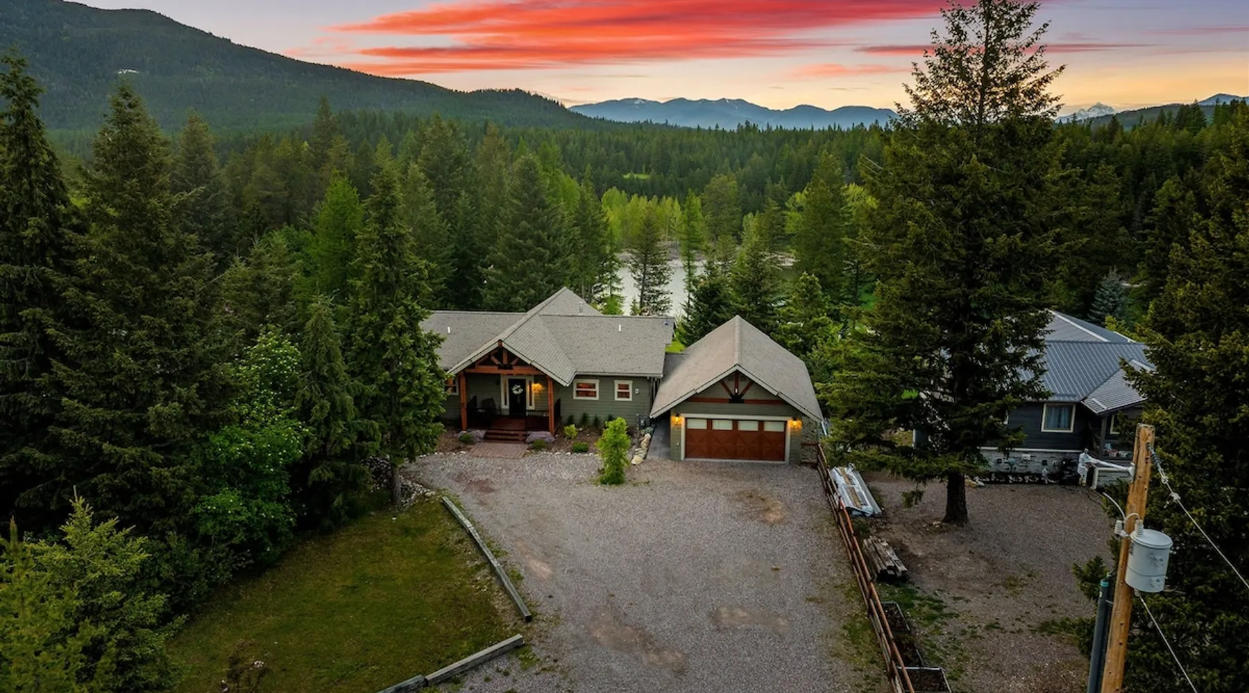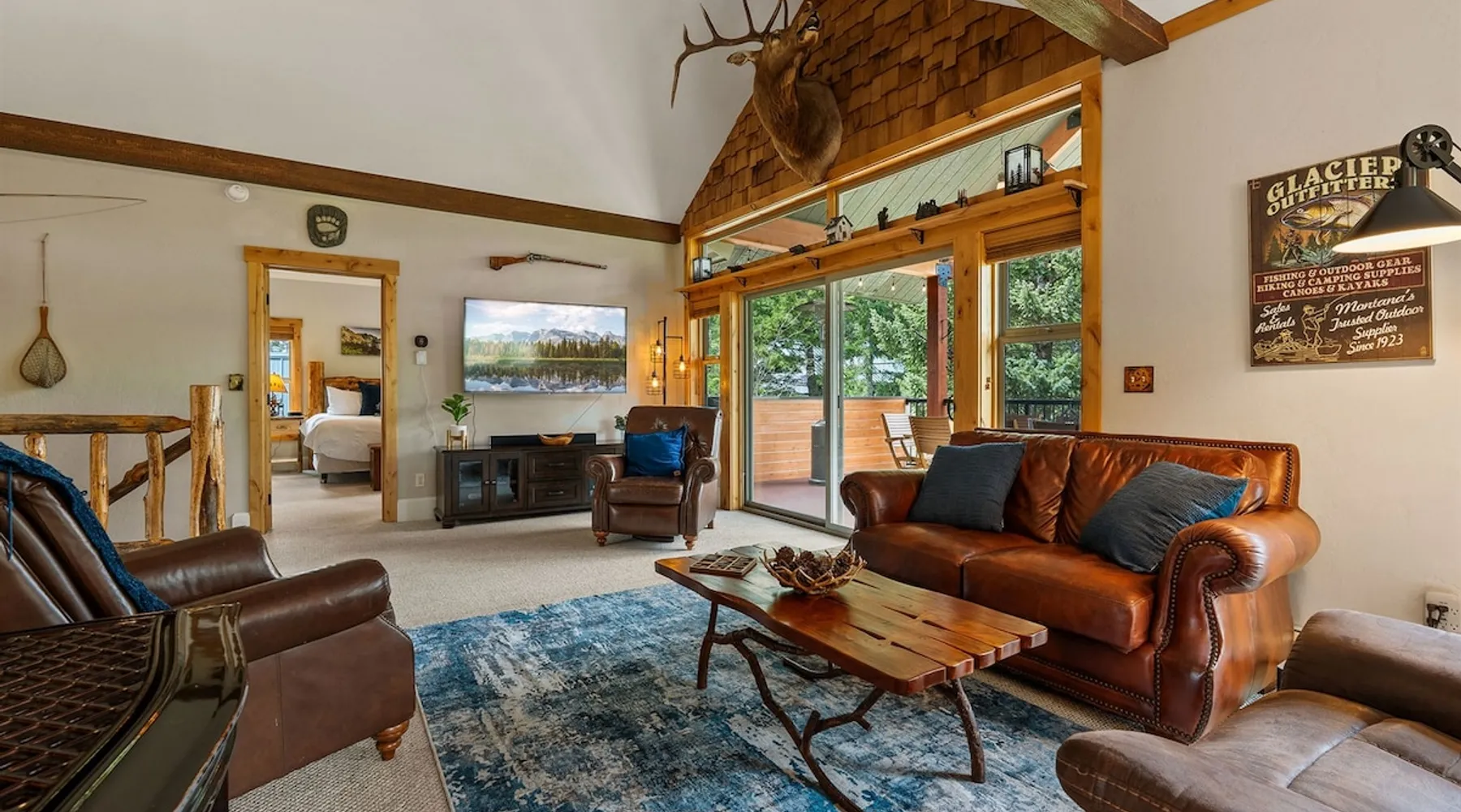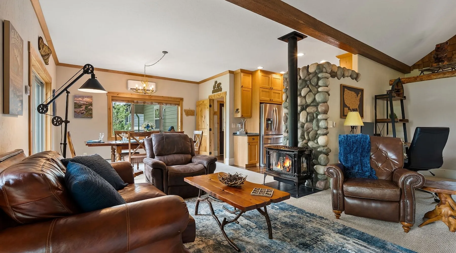 The perfect location to experience it all! Just 10 min from the West entrance of Glacier National Park, 29 miles from Flathead Lake (the largest natural lake in the west), 6 minutes away from two different ziplines and aerial parks, 4 minutes to mini golf, 10 minutes to water slides, along with ample opportunities for white-water rafting, horse-back riding, hiking, fishing, boating, skiing, biking and many other activities. Just 23 mi from Big Mountain, with 3000 acres of World class skiing! The space After a full day of adventure, come home and curl up by the fire or soak away your sore muscles in the large, 6 person hot tub. Enjoy amazing views of the river and mountains from the waterfront gazebo and secluded backyard or treat yourself to a family-style BBQ on the upper deck! There's plenty of space to unwind and relax with family and friends! Conveniently located within walking distance to groceries, fuel and dining and only 14 miles from Glacier International Airport. ☆☆ LUXURY AMENITIES ☆☆ This custom 3200 sq. ft. home combines rustic charm with five-star amenities for an incredible retreat! It offers 3 bedrooms, 3.5 bathrooms, spacious living areas, a well-stocked kitchen and sweeping balconies to help you relax while surrounded by natural beauty with river and mountain views. This home sleeps 10-12 and has been stocked with everything you'll need for an unforgettable vacation! With 43" 4K Smart TVs in every bedroom, a 60" Smart TV in each living room, a 6 person hot tub, stainless steel appliances, pine log beds with luxury mattresses, a fireplace, a fully-stocked kitchen including spices, coffee and tea supplies, a ping-pong table, foosball table, double shot basketball, corn hole, old fashioned popcorn maker, and much more! It even has three refrigerators and two dishwashers for those wanting to do their own meal prep, and a washer and dryer for your convenience. ☆☆ BEDROOMS & SLEEPING ARRANGEMENTS ☆☆ On the upper level you'll find a master suite (nicknamed the Eagle's Nest) with a luxury King size bed and ensuite bathroom including an infrared sauna, with large windows that look over the wooded back yard. On the lower level there is a second master suite (the Bear's Den) with a luxury King size bed and ensuite bathroom, the third bedroom (Moose Hollow) with a Queen size bed, each located conveniently right off the additional kitchenette, living room & bathroom. There is also a brand new sleeper sofa in the downstairs lounge area (Goat Mountain) and 2 rollaway beds and 2 blow up queen sized air mattresses available for extra guests. ☆☆ BATHROOMS ☆☆ This home is perfect for groups of 10-12 for many reasons, and one is because it has 3.5 updated bathrooms. The master bathroom has a gorgeous tiled walk in shower with rain shower features, two sinks with expansive counter space, huge walk-in closet, separate toilet room and designer finishes. The second ensuite bathroom has a walk in shower behind glass doors, rain shower features and double sinks with ample counter space and a large walk-in closet. The third bathroom features a tub/shower combo and a single sink with adequate counter space, while the half bathroom is conveniently located between the dining room and game room. Plush hotel quality towels are provided throughout. ☆☆ KITCHEN & LOUNGE ☆☆ Designed for entertaining groups, this home features multiple lounge spaces indoors and out and a fully stocked, galley style gourmet kitchen. The main living room has a wall of windows that overlook the shady patio and lush green, wooded property. The designer finishes and decor bring the beauty of nature indoors, and the luxury furniture makes this open space the perfect place to get together. Relax in the leather recliners or matching sofa and watch your favorite shows on the sleek 65" flat-screen TV. The gourmet kitchen sits right off the living room and dining room areas. There's room to keep your groceries in the cabinets and any one of the three stainless steel fridges, use the gas range to make homemade meals from scratch or heat leftovers in the microwave. Enjoy using the coffee maker for freshly brewed coffee, the toaster, blender, InstaPot, or any other gadgets to make your family's favorite meals and treats. The formal dining room sits in a sunny alcove of windows and offers comfortable seating for 8. Downstairs, there is even more room to hang out. A kitchenette with a fridge, dishwasher, microwave and slow drip and Kuerig coffee equipment and supplies, making it easy to whip up a quick snack or drink to enjoy in the adjacent secondary lounge area. Sit at the custom log bar with your snacks or set up your laptop here and get some work done. The lounge has a comfortable sofa in front of an electric fireplace, 65" flat screen TV, and sliding glass doors that lead out to the covered patio and hot tub. The final lounge area is a place the kids won't want to leave! Check out the brand new Infinity Game Table with games for all ages! Also features a large sofa/chaise lounger in a carpeted area for watching TV or playing your favorite PS4 game with an old fashioned movie theatre style popcorn popper. It also has an Infinity Game table, ping pong table, foosball table, and large connect four. This area is located in the detached, heated garage which is perfect for keeping the noise down in the main living areas. ☆☆ OUTSIDE SPACE ☆☆ Nothing beats feeling the crisp mountain air on your cheeks, hearing the chirp of a passing robin, the breeze as it ruffles the aspen leaves, and the sound of the river as it traverses down the canyon while sitting in the comfort of your own private deck in solitude. What a feeling of peace and freedom and exhilaration as you experience relaxation like never before! This nature lover's oasis offers multiple ways to enjoy the outdoors. There are two private patios, one on each level of the home. The main patio has soaring wood-paneled ceilings, outdoor lounge furni