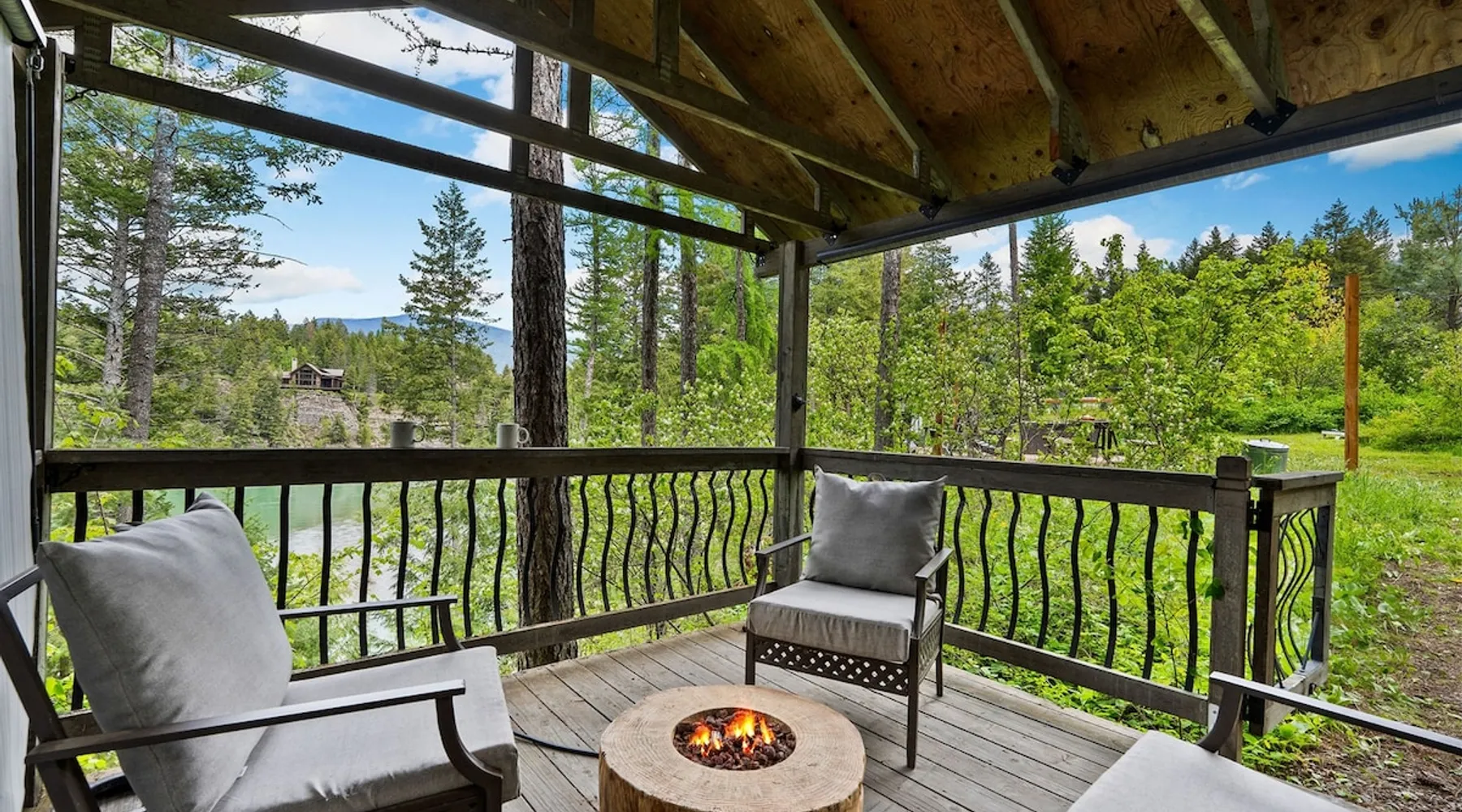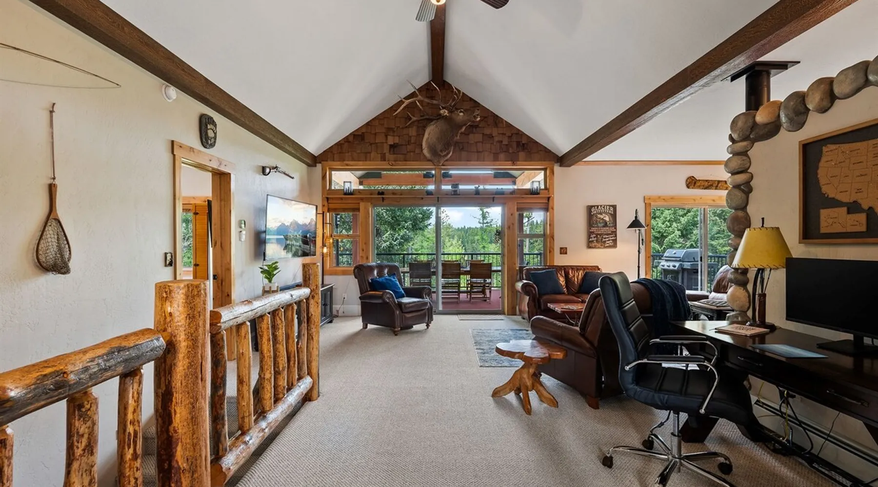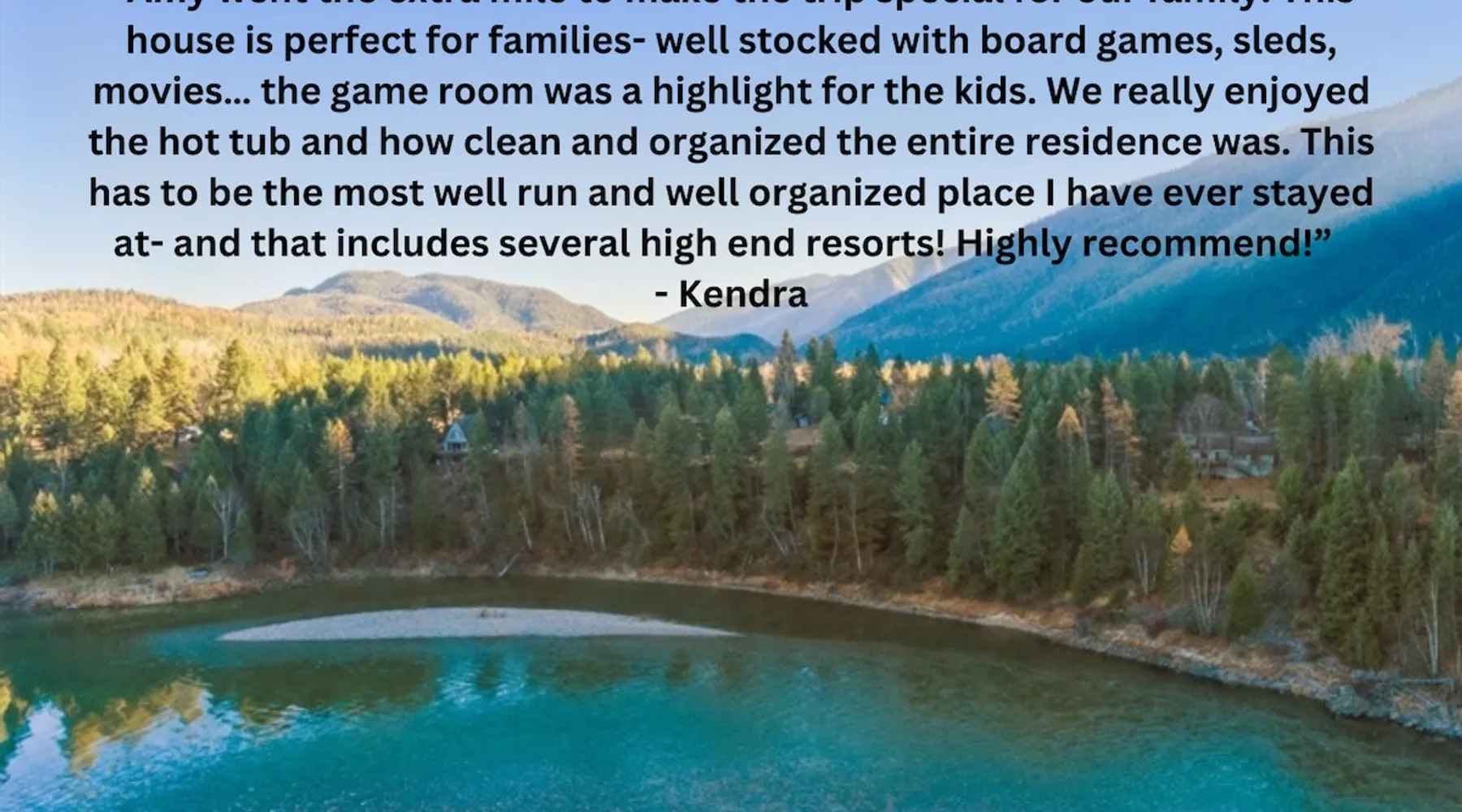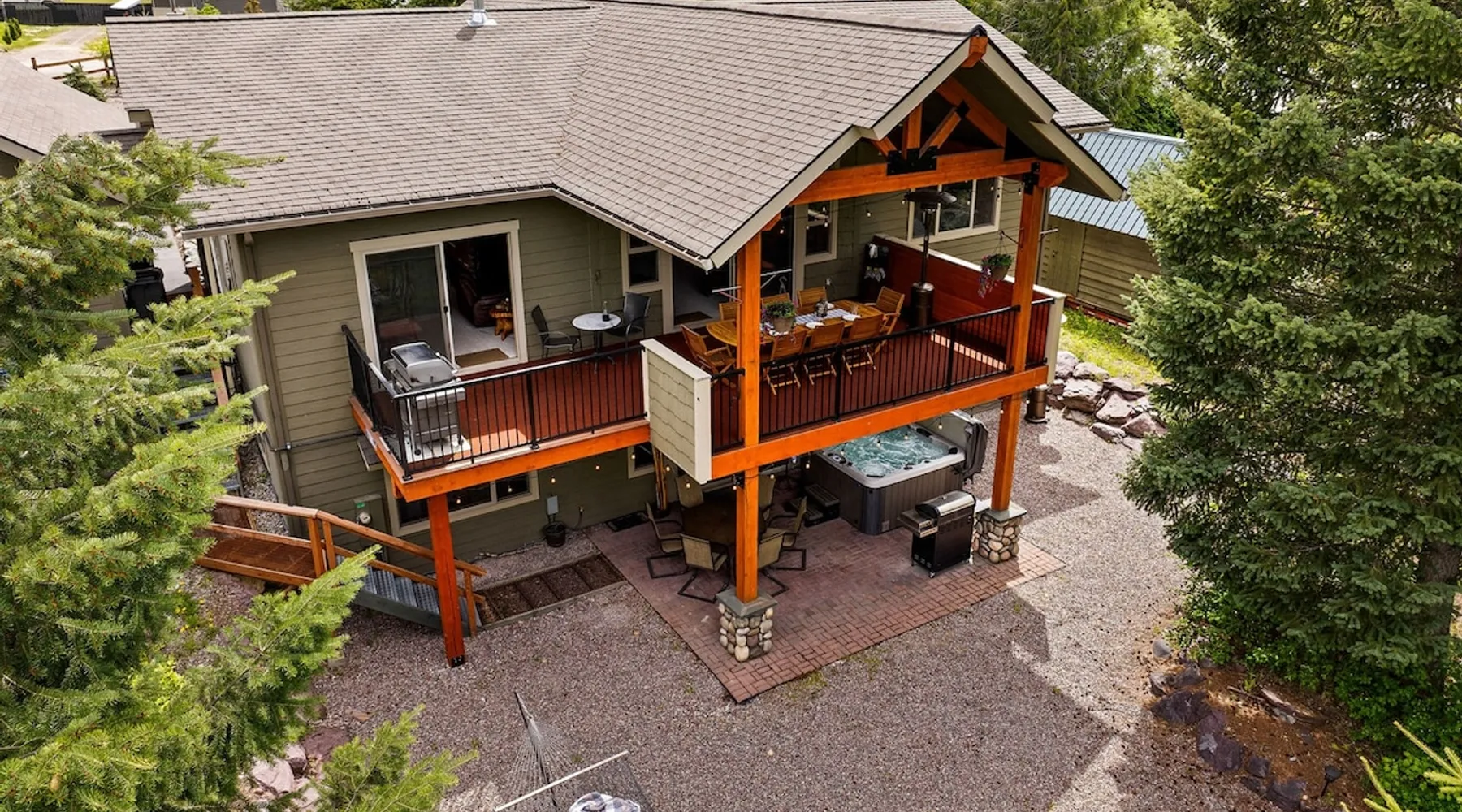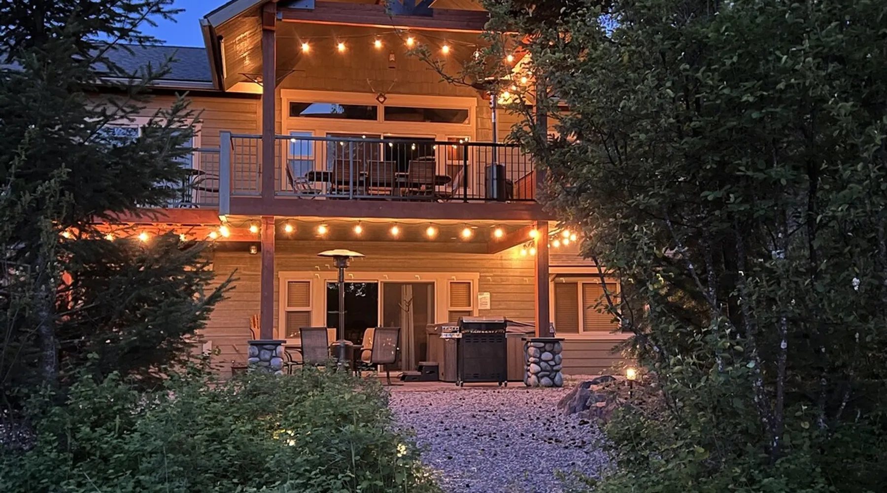 The perfect location to experience it all! Just 10 min from the West entrance of Glacier National Park, 29 miles from Flathead Lake (the largest natural lake in the west), 6 minutes away from two different ziplines and aerial parks, 4 minutes to mini golf, 10 minutes to water slides, along with ample opportunities for white-water rafting, horse-back riding, hiking, fishing, boating, skiing, biking and many other activities. Just 23 mi from Big Mountain, with 3000 acres of World class skiing! The space After a full day of adventure, come home and curl up by the fire or soak away your sore muscles in the large, 6 person hot tub. Enjoy amazing views of the river and mountains from the waterfront gazebo and secluded backyard or treat yourself to a family-style BBQ on the upper deck! There's plenty of space to unwind and relax with family and friends! Conveniently located within walking distance to groceries, fuel and dining and only 14 miles from Glacier International Airport. ☆☆ LUXURY AMENITIES ☆☆ This custom 3200 sq. ft. home combines rustic charm with five-star amenities for an incredible retreat! It offers 3 bedrooms, 3.5 bathrooms, spacious living areas, a well-stocked kitchen and sweeping balconies to help you relax while surrounded by natural beauty with river and mountain views. This home sleeps 10-12 and has been stocked with everything you'll need for an unforgettable vacation! With 43" 4K Smart TVs in every bedroom, a 60" Smart TV in each living room, a 6 person hot tub, stainless steel appliances, pine log beds with luxury mattresses, a fireplace, a fully-stocked kitchen including spices, coffee and tea supplies, a ping-pong table, foosball table, double shot basketball, corn hole, old fashioned popcorn maker, and much more! It even has three refrigerators and two dishwashers for those wanting to do their own meal prep, and a washer and dryer for your convenience. ☆☆ BEDROOMS & SLEEPING ARRANGEMENTS ☆☆ On the upper level you'll find a master suite (nicknamed the Eagle's Nest) with a luxury King size bed and ensuite bathroom including an infrared sauna, with large windows that look over the wooded back yard. On the lower level there is a second master suite (the Bear's Den) with a luxury King size bed and ensuite bathroom, the third bedroom (Moose Hollow) with a Queen size bed, each located conveniently right off the additional kitchenette, living room & bathroom. There is also a brand new sleeper sofa in the downstairs lounge area (Goat Mountain) and 2 rollaway beds and 2 blow up queen sized air mattresses available for extra guests. ☆☆ BATHROOMS ☆☆ This home is perfect for groups of 10-12 for many reasons, and one is because it has 3.5 updated bathrooms. The master bathroom has a gorgeous tiled walk in shower with rain shower features, two sinks with expansive counter space, huge walk-in closet, separate toilet room and designer finishes. The second ensuite bathroom has a walk in shower behind glass doors, rain shower features and double sinks with ample counter space and a large walk-in closet. The third bathroom features a tub/shower combo and a single sink with adequate counter space, while the half bathroom is conveniently located between the dining room and game room. Plush hotel quality towels are provided throughout. ☆☆ KITCHEN & LOUNGE ☆☆ Designed for entertaining groups, this home features multiple lounge spaces indoors and out and a fully stocked, galley style gourmet kitchen. The main living room has a wall of windows that overlook the shady patio and lush green, wooded property. The designer finishes and decor bring the beauty of nature indoors, and the luxury furniture makes this open space the perfect place to get together. Relax in the leather recliners or matching sofa and watch your favorite shows on the sleek 65" flat-screen TV. The gourmet kitchen sits right off the living room and dining room areas. There's room to keep your groceries in the cabinets and any one of the three stainless steel fridges, use the gas range to make homemade meals from scratch or heat leftovers in the microwave. Enjoy using the coffee maker for freshly brewed coffee, the toaster, blender, InstaPot, or any other gadgets to make your family's favorite meals and treats. The formal dining room sits in a sunny alcove of windows and offers comfortable seating for 8. Downstairs, there is even more room to hang out. A kitchenette with a fridge, dishwasher, microwave and slow drip and Kuerig coffee equipment and supplies, making it easy to whip up a quick snack or drink to enjoy in the adjacent secondary lounge area. Sit at the custom log bar with your snacks or set up your laptop here and get some work done. The lounge has a comfortable sofa in front of an electric fireplace, 65" flat screen TV, and sliding glass doors that lead out to the covered patio and hot tub. The final lounge area is a place the kids won't want to leave! Check out the brand new Infinity Game Table with games for all ages! Also features a large sofa/chaise lounger in a carpeted area for watching TV or playing your favorite PS4 game with an old fashioned movie theatre style popcorn popper. It also has an Infinity Game table, ping pong table, foosball table, and large connect four. This area is located in the detached, heated garage which is perfect for keeping the noise down in the main living areas. ☆☆ OUTSIDE SPACE ☆☆ Nothing beats feeling the crisp mountain air on your cheeks, hearing the chirp of a passing robin, the breeze as it ruffles the aspen leaves, and the sound of the river as it traverses down the canyon while sitting in the comfort of your own private deck in solitude. What a feeling of peace and freedom and exhilaration as you experience relaxation like never before! This nature lover's oasis offers multiple ways to enjoy the outdoors. There are two private patios, one on each level of the home. The main patio has soaring wood-paneled ceilings, outdoor lounge furni