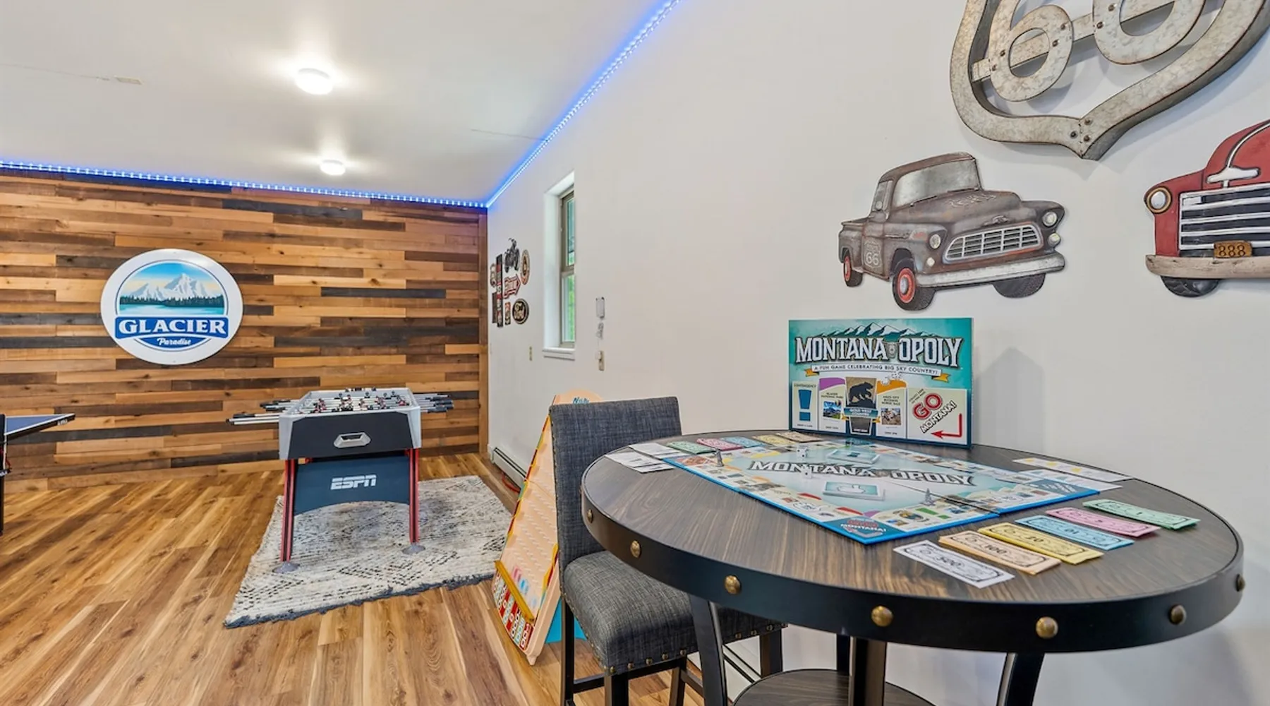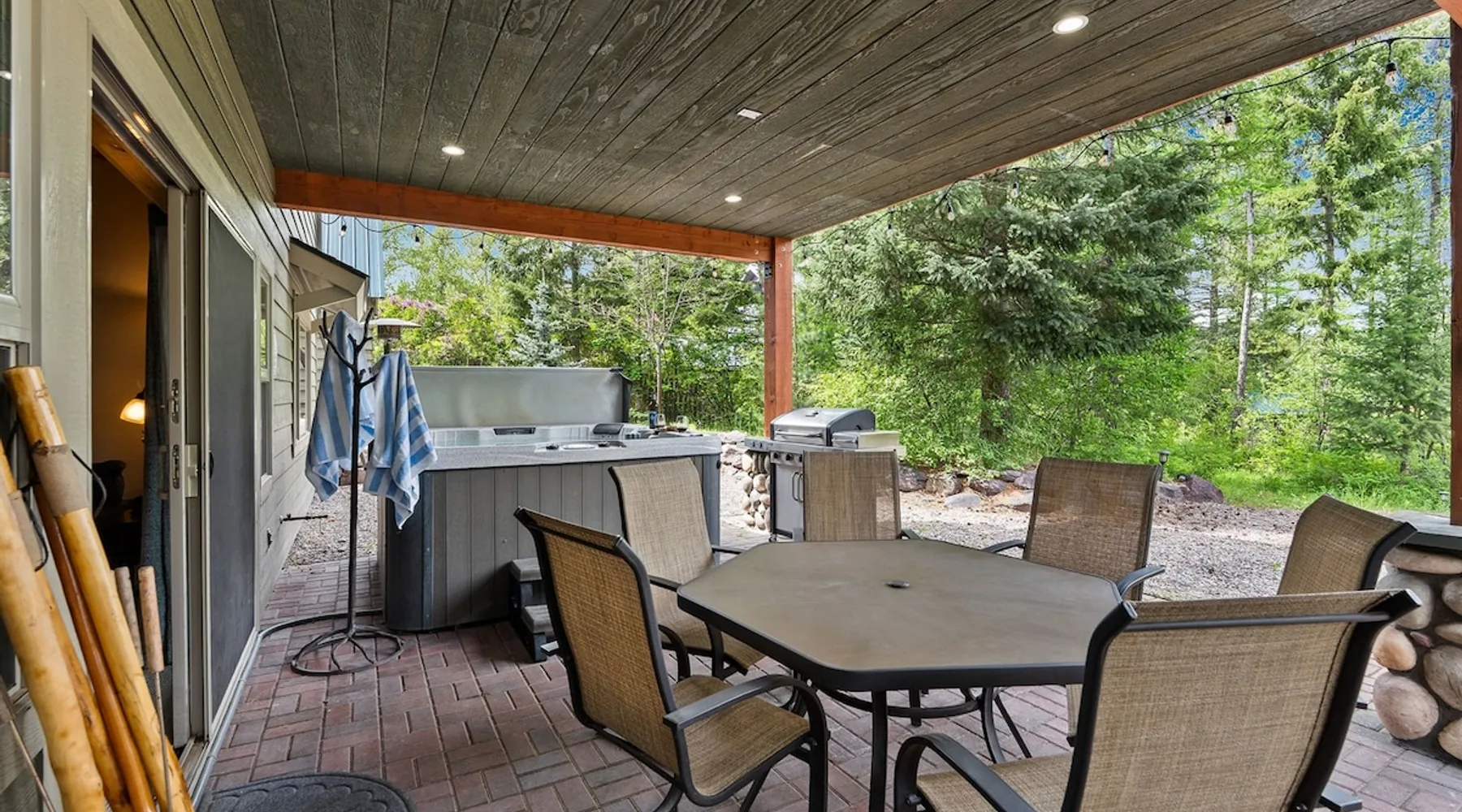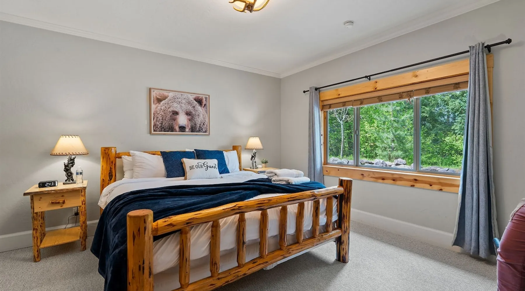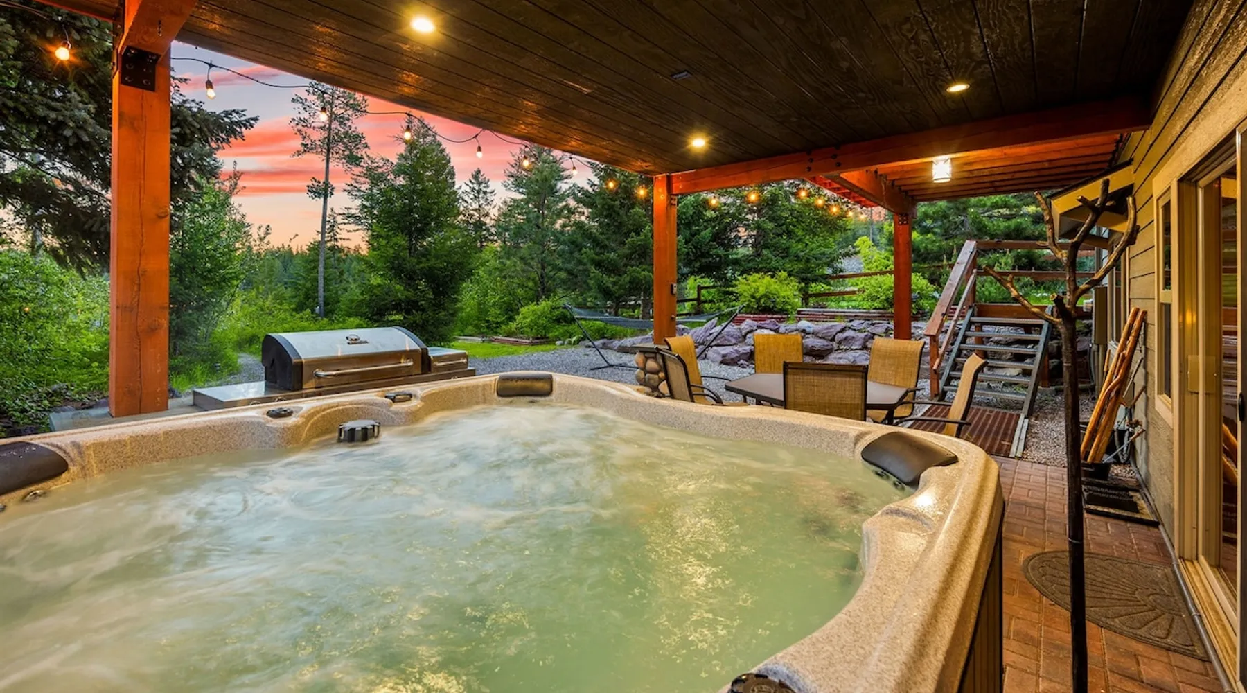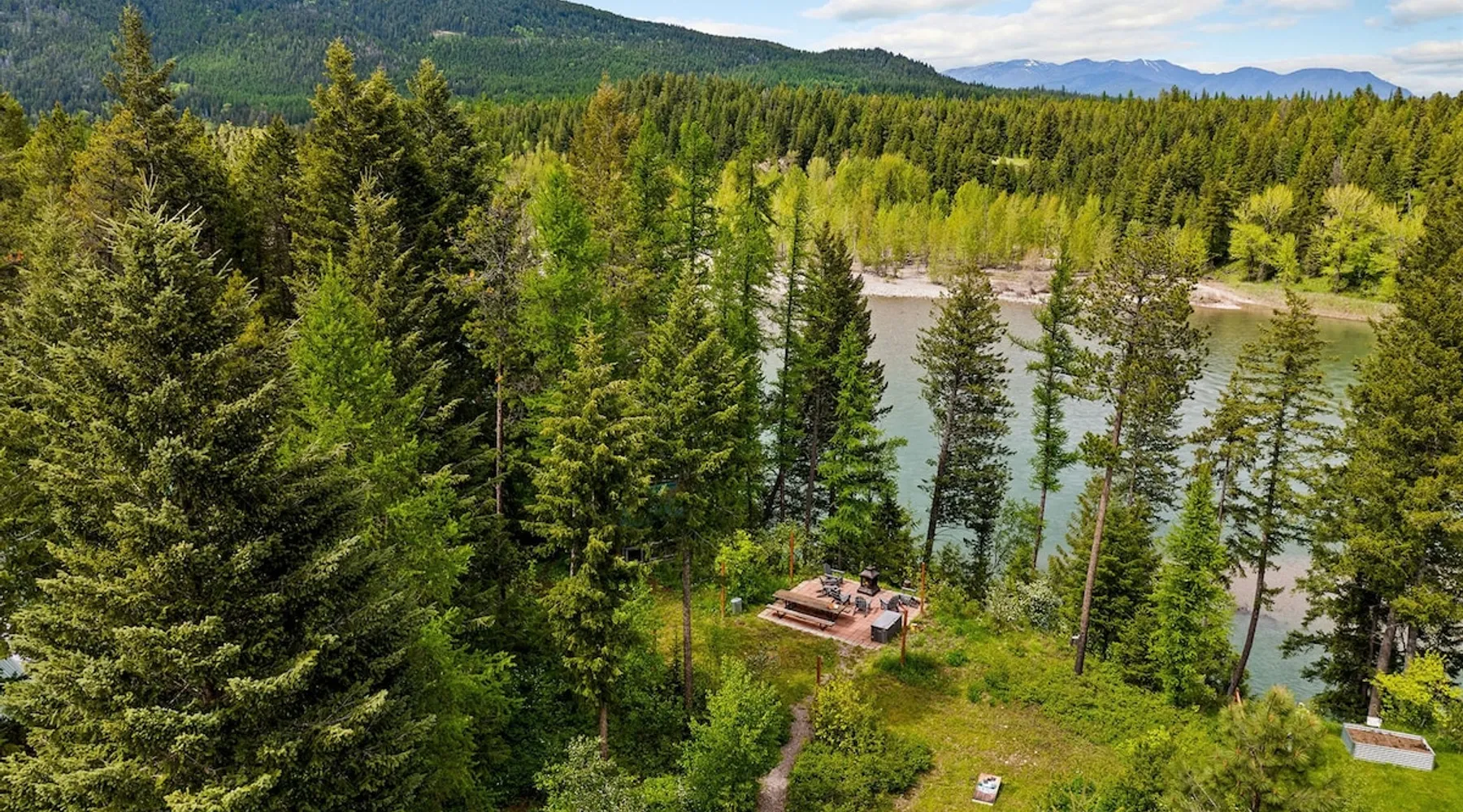 The perfect location to experience it all! Just 10 min from the West entrance of Glacier National Park, 29 miles from Flathead Lake (the largest natural lake in the west), 6 minutes away from two different ziplines and aerial parks, 4 minutes to mini golf, 10 minutes to water slides, along with ample opportunities for white-water rafting, horse-back riding, hiking, fishing, boating, skiing, biking and many other activities. Just 23 mi from Big Mountain, with 3000 acres of World class skiing! The space After a full day of adventure, come home and curl up by the fire or soak away your sore muscles in the large, 6 person hot tub. Enjoy amazing views of the river and mountains from the waterfront gazebo and secluded backyard or treat yourself to a family-style BBQ on the upper deck! There's plenty of space to unwind and relax with family and friends! Conveniently located within walking distance to groceries, fuel and dining and only 14 miles from Glacier International Airport. ☆☆ LUXURY AMENITIES ☆☆ This custom 3200 sq. ft. home combines rustic charm with five-star amenities for an incredible retreat! It offers 3 bedrooms, 3.5 bathrooms, spacious living areas, a well-stocked kitchen and sweeping balconies to help you relax while surrounded by natural beauty with river and mountain views. This home sleeps 10-12 and has been stocked with everything you'll need for an unforgettable vacation! With 43" 4K Smart TVs in every bedroom, a 60" Smart TV in each living room, a 6 person hot tub, stainless steel appliances, pine log beds with luxury mattresses, a fireplace, a fully-stocked kitchen including spices, coffee and tea supplies, a ping-pong table, foosball table, double shot basketball, corn hole, old fashioned popcorn maker, and much more! It even has three refrigerators and two dishwashers for those wanting to do their own meal prep, and a washer and dryer for your convenience. ☆☆ BEDROOMS & SLEEPING ARRANGEMENTS ☆☆ On the upper level you'll find a master suite (nicknamed the Eagle's Nest) with a luxury King size bed and ensuite bathroom including an infrared sauna, with large windows that look over the wooded back yard. On the lower level there is a second master suite (the Bear's Den) with a luxury King size bed and ensuite bathroom, the third bedroom (Moose Hollow) with a Queen size bed, each located conveniently right off the additional kitchenette, living room & bathroom. There is also a brand new sleeper sofa in the downstairs lounge area (Goat Mountain) and 2 rollaway beds and 2 blow up queen sized air mattresses available for extra guests. ☆☆ BATHROOMS ☆☆ This home is perfect for groups of 10-12 for many reasons, and one is because it has 3.5 updated bathrooms. The master bathroom has a gorgeous tiled walk in shower with rain shower features, two sinks with expansive counter space, huge walk-in closet, separate toilet room and designer finishes. The second ensuite bathroom has a walk in shower behind glass doors, rain shower features and double sinks with ample counter space and a large walk-in closet. The third bathroom features a tub/shower combo and a single sink with adequate counter space, while the half bathroom is conveniently located between the dining room and game room. Plush hotel quality towels are provided throughout. ☆☆ KITCHEN & LOUNGE ☆☆ Designed for entertaining groups, this home features multiple lounge spaces indoors and out and a fully stocked, galley style gourmet kitchen. The main living room has a wall of windows that overlook the shady patio and lush green, wooded property. The designer finishes and decor bring the beauty of nature indoors, and the luxury furniture makes this open space the perfect place to get together. Relax in the leather recliners or matching sofa and watch your favorite shows on the sleek 65" flat-screen TV. The gourmet kitchen sits right off the living room and dining room areas. There's room to keep your groceries in the cabinets and any one of the three stainless steel fridges, use the gas range to make homemade meals from scratch or heat leftovers in the microwave. Enjoy using the coffee maker for freshly brewed coffee, the toaster, blender, InstaPot, or any other gadgets to make your family's favorite meals and treats. The formal dining room sits in a sunny alcove of windows and offers comfortable seating for 8. Downstairs, there is even more room to hang out. A kitchenette with a fridge, dishwasher, microwave and slow drip and Kuerig coffee equipment and supplies, making it easy to whip up a quick snack or drink to enjoy in the adjacent secondary lounge area. Sit at the custom log bar with your snacks or set up your laptop here and get some work done. The lounge has a comfortable sofa in front of an electric fireplace, 65" flat screen TV, and sliding glass doors that lead out to the covered patio and hot tub. The final lounge area is a place the kids won't want to leave! Check out the brand new Infinity Game Table with games for all ages! Also features a large sofa/chaise lounger in a carpeted area for watching TV or playing your favorite PS4 game with an old fashioned movie theatre style popcorn popper. It also has an Infinity Game table, ping pong table, foosball table, and large connect four. This area is located in the detached, heated garage which is perfect for keeping the noise down in the main living areas. ☆☆ OUTSIDE SPACE ☆☆ Nothing beats feeling the crisp mountain air on your cheeks, hearing the chirp of a passing robin, the breeze as it ruffles the aspen leaves, and the sound of the river as it traverses down the canyon while sitting in the comfort of your own private deck in solitude. What a feeling of peace and freedom and exhilaration as you experience relaxation like never before! This nature lover's oasis offers multiple ways to enjoy the outdoors. There are two private patios, one on each level of the home. The main patio has soaring wood-paneled ceilings, outdoor lounge furni