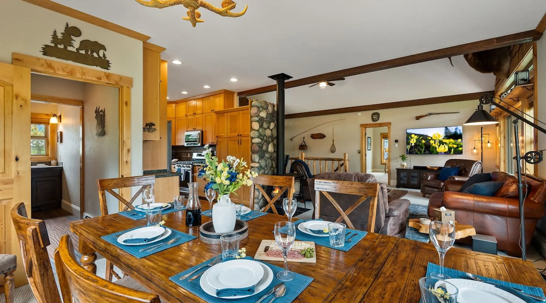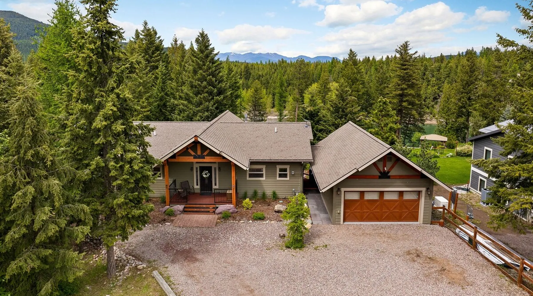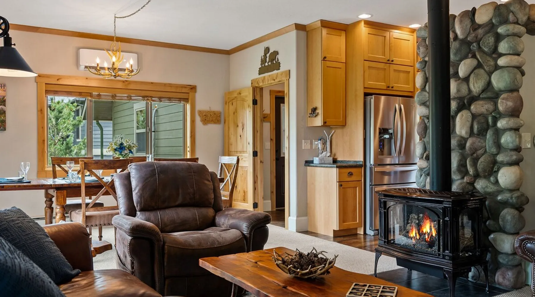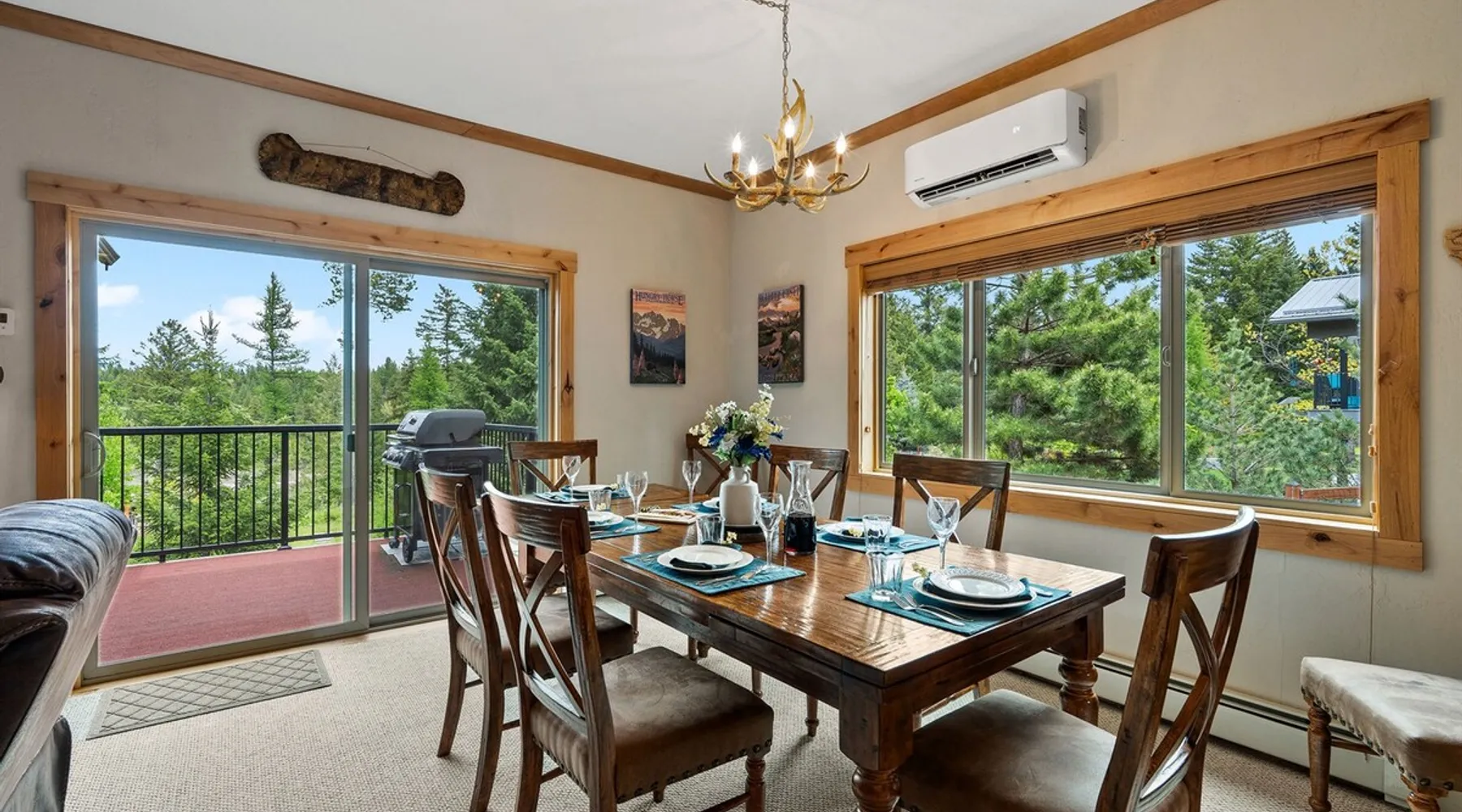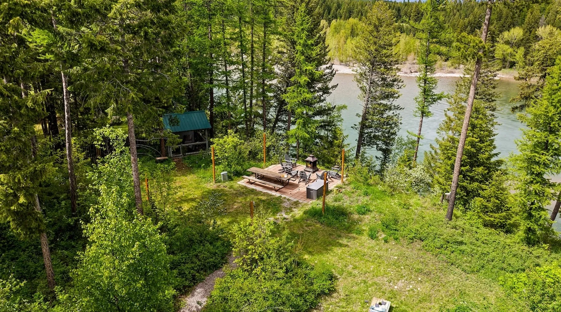 The perfect location to experience it all! Just 10 min from the West entrance of Glacier National Park, 29 miles from Flathead Lake (the largest natural lake in the west), 6 minutes away from two different ziplines and aerial parks, 4 minutes to mini golf, 10 minutes to water slides, along with ample opportunities for white-water rafting, horse-back riding, hiking, fishing, boating, skiing, biking and many other activities. Just 23 mi from Big Mountain, with 3000 acres of World class skiing! The space After a full day of adventure, come home and curl up by the fire or soak away your sore muscles in the large, 6 person hot tub. Enjoy amazing views of the river and mountains from the waterfront gazebo and secluded backyard or treat yourself to a family-style BBQ on the upper deck! There's plenty of space to unwind and relax with family and friends! Conveniently located within walking distance to groceries, fuel and dining and only 14 miles from Glacier International Airport. ☆☆ LUXURY AMENITIES ☆☆ This custom 3200 sq. ft. home combines rustic charm with five-star amenities for an incredible retreat! It offers 3 bedrooms, 3.5 bathrooms, spacious living areas, a well-stocked kitchen and sweeping balconies to help you relax while surrounded by natural beauty with river and mountain views. This home sleeps 10-12 and has been stocked with everything you'll need for an unforgettable vacation! With 43" 4K Smart TVs in every bedroom, a 60" Smart TV in each living room, a 6 person hot tub, stainless steel appliances, pine log beds with luxury mattresses, a fireplace, a fully-stocked kitchen including spices, coffee and tea supplies, a ping-pong table, foosball table, double shot basketball, corn hole, old fashioned popcorn maker, and much more! It even has three refrigerators and two dishwashers for those wanting to do their own meal prep, and a washer and dryer for your convenience. ☆☆ BEDROOMS & SLEEPING ARRANGEMENTS ☆☆ On the upper level you'll find a master suite (nicknamed the Eagle's Nest) with a luxury King size bed and ensuite bathroom including an infrared sauna, with large windows that look over the wooded back yard. On the lower level there is a second master suite (the Bear's Den) with a luxury King size bed and ensuite bathroom, the third bedroom (Moose Hollow) with a Queen size bed, each located conveniently right off the additional kitchenette, living room & bathroom. There is also a brand new sleeper sofa in the downstairs lounge area (Goat Mountain) and 2 rollaway beds and 2 blow up queen sized air mattresses available for extra guests. ☆☆ BATHROOMS ☆☆ This home is perfect for groups of 10-12 for many reasons, and one is because it has 3.5 updated bathrooms. The master bathroom has a gorgeous tiled walk in shower with rain shower features, two sinks with expansive counter space, huge walk-in closet, separate toilet room and designer finishes. The second ensuite bathroom has a walk in shower behind glass doors, rain shower features and double sinks with ample counter space and a large walk-in closet. The third bathroom features a tub/shower combo and a single sink with adequate counter space, while the half bathroom is conveniently located between the dining room and game room. Plush hotel quality towels are provided throughout. ☆☆ KITCHEN & LOUNGE ☆☆ Designed for entertaining groups, this home features multiple lounge spaces indoors and out and a fully stocked, galley style gourmet kitchen. The main living room has a wall of windows that overlook the shady patio and lush green, wooded property. The designer finishes and decor bring the beauty of nature indoors, and the luxury furniture makes this open space the perfect place to get together. Relax in the leather recliners or matching sofa and watch your favorite shows on the sleek 65" flat-screen TV. The gourmet kitchen sits right off the living room and dining room areas. There's room to keep your groceries in the cabinets and any one of the three stainless steel fridges, use the gas range to make homemade meals from scratch or heat leftovers in the microwave. Enjoy using the coffee maker for freshly brewed coffee, the toaster, blender, InstaPot, or any other gadgets to make your family's favorite meals and treats. The formal dining room sits in a sunny alcove of windows and offers comfortable seating for 8. Downstairs, there is even more room to hang out. A kitchenette with a fridge, dishwasher, microwave and slow drip and Kuerig coffee equipment and supplies, making it easy to whip up a quick snack or drink to enjoy in the adjacent secondary lounge area. Sit at the custom log bar with your snacks or set up your laptop here and get some work done. The lounge has a comfortable sofa in front of an electric fireplace, 65" flat screen TV, and sliding glass doors that lead out to the covered patio and hot tub. The final lounge area is a place the kids won't want to leave! Check out the brand new Infinity Game Table with games for all ages! Also features a large sofa/chaise lounger in a carpeted area for watching TV or playing your favorite PS4 game with an old fashioned movie theatre style popcorn popper. It also has an Infinity Game table, ping pong table, foosball table, and large connect four. This area is located in the detached, heated garage which is perfect for keeping the noise down in the main living areas. ☆☆ OUTSIDE SPACE ☆☆ Nothing beats feeling the crisp mountain air on your cheeks, hearing the chirp of a passing robin, the breeze as it ruffles the aspen leaves, and the sound of the river as it traverses down the canyon while sitting in the comfort of your own private deck in solitude. What a feeling of peace and freedom and exhilaration as you experience relaxation like never before! This nature lover's oasis offers multiple ways to enjoy the outdoors. There are two private patios, one on each level of the home. The main patio has soaring wood-paneled ceilings, outdoor lounge furni
