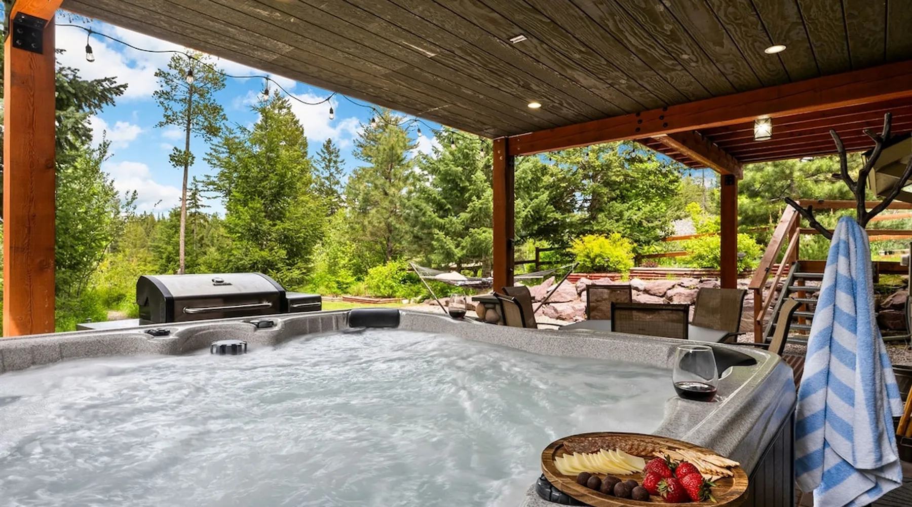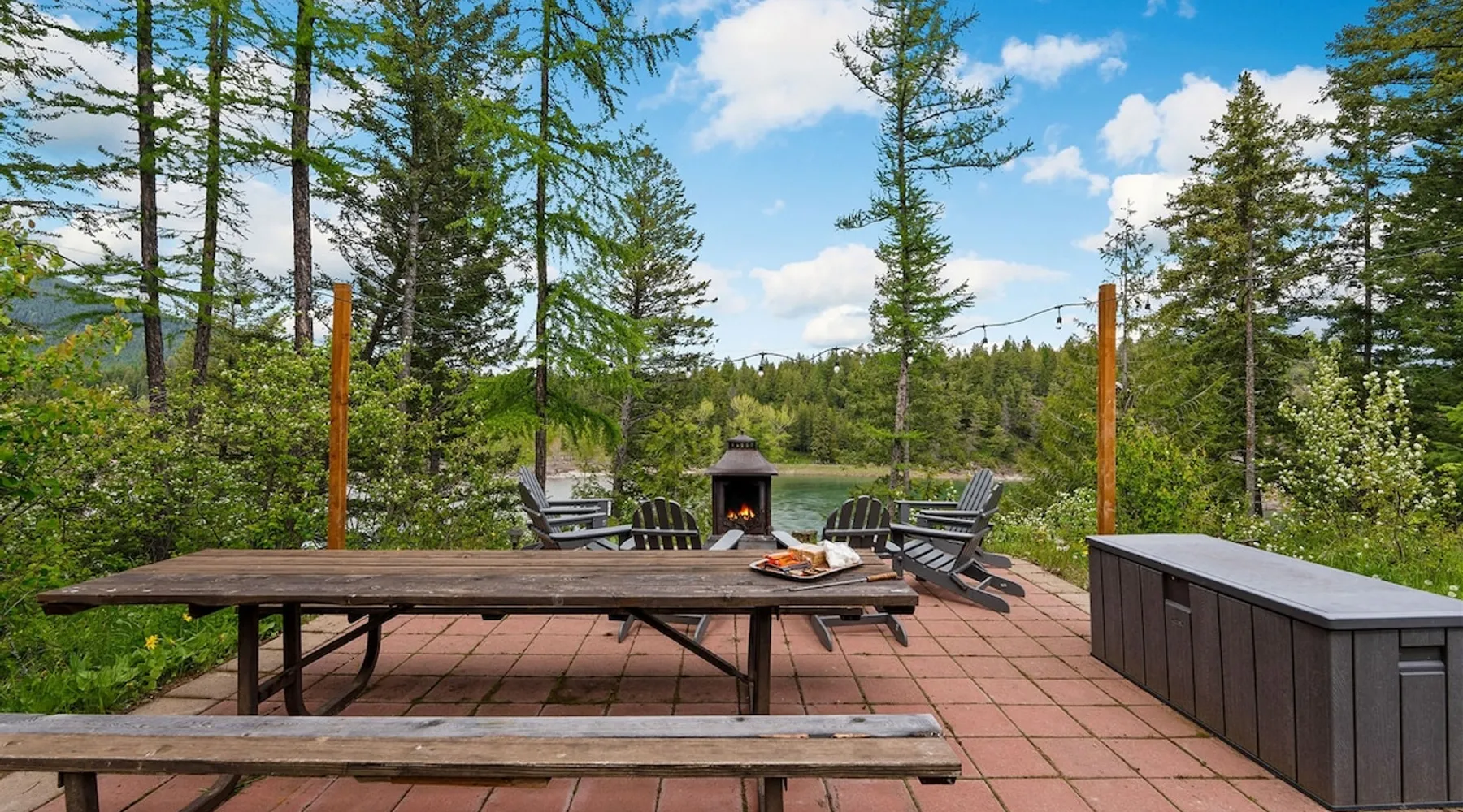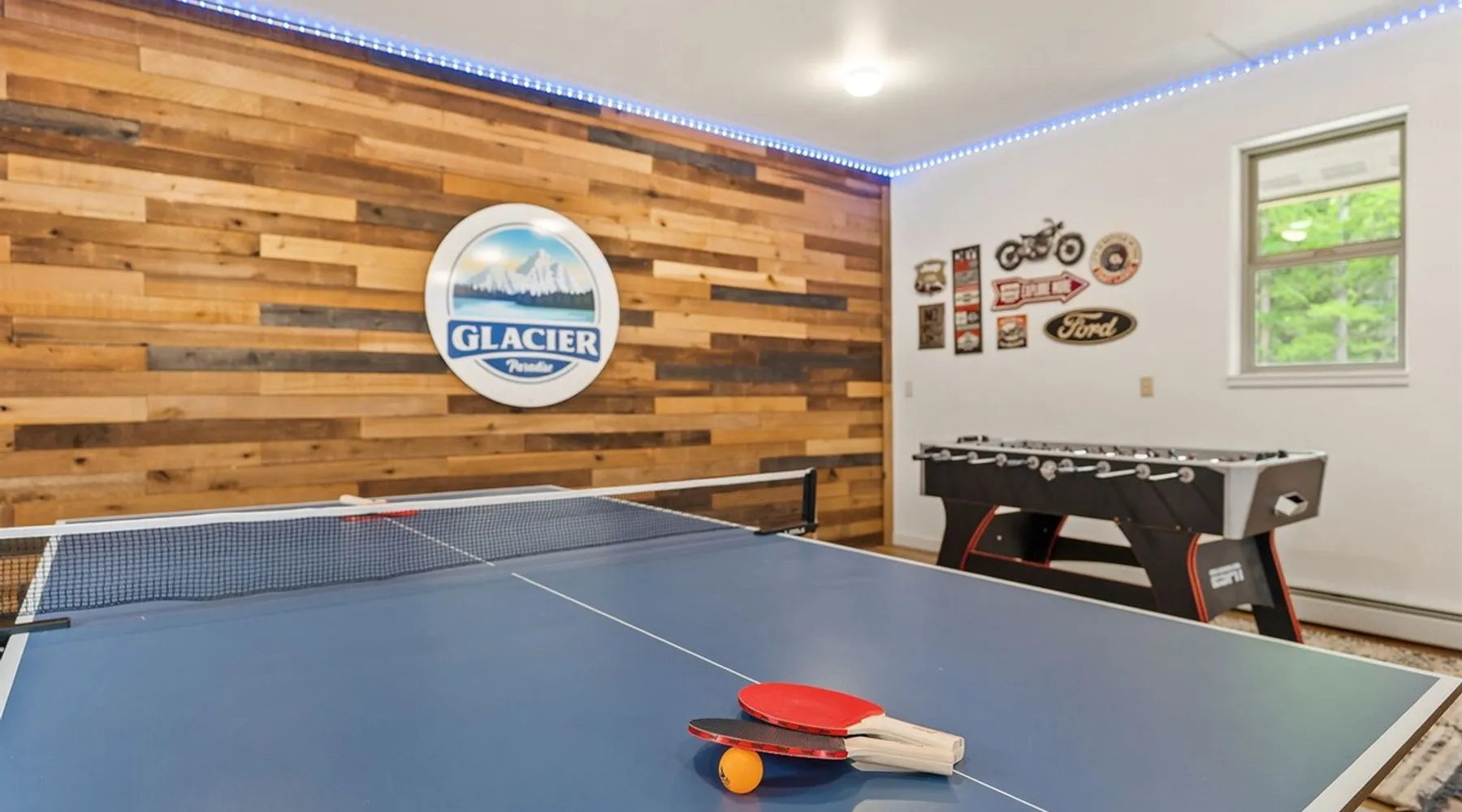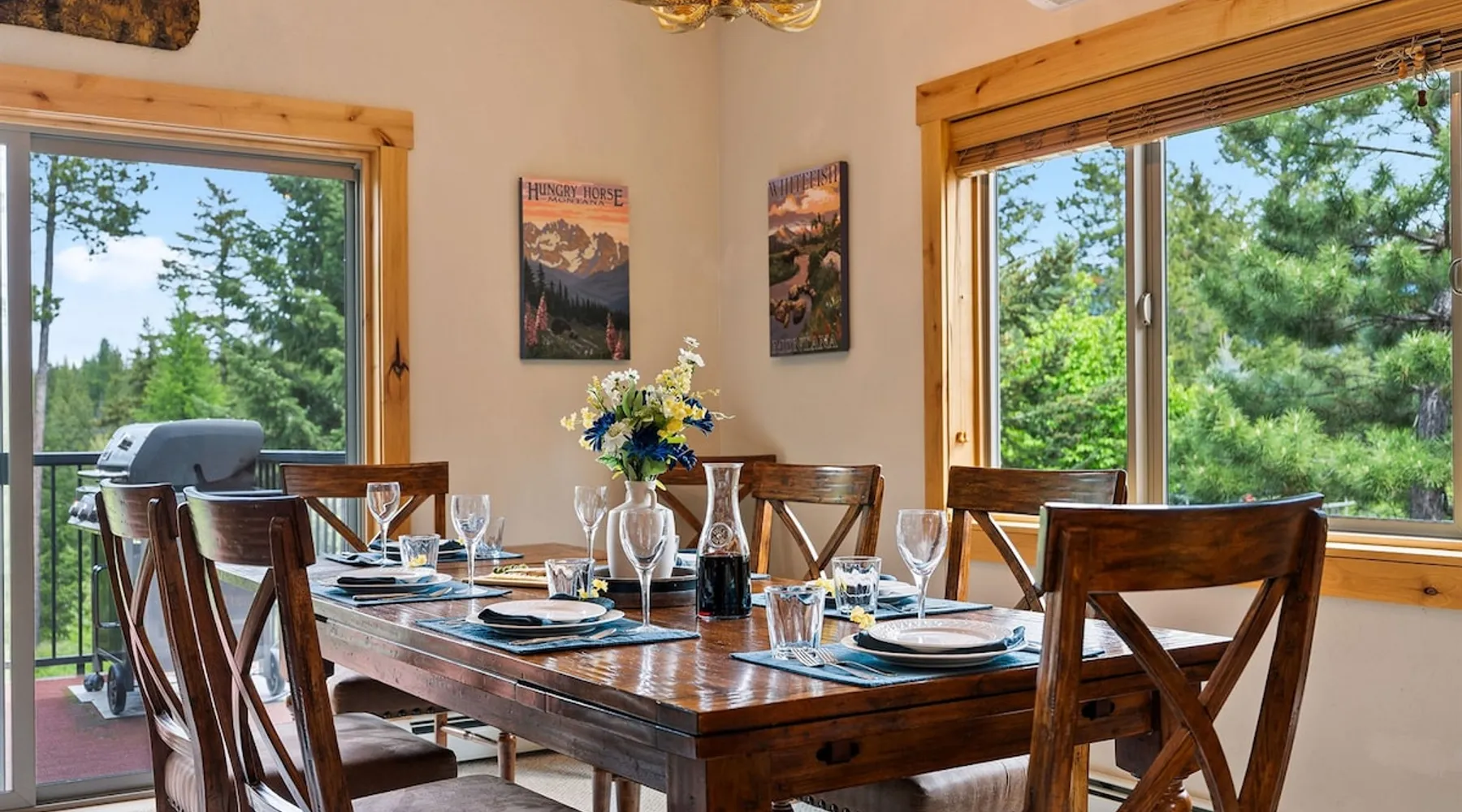 The perfect location to experience it all! Just 10 min from the West entrance of Glacier National Park, 29 miles from Flathead Lake (the largest natural lake in the west), 6 minutes away from two different ziplines and aerial parks, 4 minutes to mini golf, 10 minutes to water slides, along with ample opportunities for white-water rafting, horse-back riding, hiking, fishing, boating, skiing, biking and many other activities. Just 23 mi from Big Mountain, with 3000 acres of World class skiing! The space After a full day of adventure, come home and curl up by the fire or soak away your sore muscles in the large, 6 person hot tub. Enjoy amazing views of the river and mountains from the waterfront gazebo and secluded backyard or treat yourself to a family-style BBQ on the upper deck! There's plenty of space to unwind and relax with family and friends! Conveniently located within walking distance to groceries, fuel and dining and only 14 miles from Glacier International Airport. ☆☆ LUXURY AMENITIES ☆☆ This custom 3200 sq. ft. home combines rustic charm with five-star amenities for an incredible retreat! It offers 3 bedrooms, 3.5 bathrooms, spacious living areas, a well-stocked kitchen and sweeping balconies to help you relax while surrounded by natural beauty with river and mountain views. This home sleeps 10-12 and has been stocked with everything you'll need for an unforgettable vacation! With 43" 4K Smart TVs in every bedroom, a 60" Smart TV in each living room, a 6 person hot tub, stainless steel appliances, pine log beds with luxury mattresses, a fireplace, a fully-stocked kitchen including spices, coffee and tea supplies, a ping-pong table, foosball table, double shot basketball, corn hole, old fashioned popcorn maker, and much more! It even has three refrigerators and two dishwashers for those wanting to do their own meal prep, and a washer and dryer for your convenience. ☆☆ BEDROOMS & SLEEPING ARRANGEMENTS ☆☆ On the upper level you'll find a master suite (nicknamed the Eagle's Nest) with a luxury King size bed and ensuite bathroom including an infrared sauna, with large windows that look over the wooded back yard. On the lower level there is a second master suite (the Bear's Den) with a luxury King size bed and ensuite bathroom, the third bedroom (Moose Hollow) with a Queen size bed, each located conveniently right off the additional kitchenette, living room & bathroom. There is also a brand new sleeper sofa in the downstairs lounge area (Goat Mountain) and 2 rollaway beds and 2 blow up queen sized air mattresses available for extra guests. ☆☆ BATHROOMS ☆☆ This home is perfect for groups of 10-12 for many reasons, and one is because it has 3.5 updated bathrooms. The master bathroom has a gorgeous tiled walk in shower with rain shower features, two sinks with expansive counter space, huge walk-in closet, separate toilet room and designer finishes. The second ensuite bathroom has a walk in shower behind glass doors, rain shower features and double sinks with ample counter space and a large walk-in closet. The third bathroom features a tub/shower combo and a single sink with adequate counter space, while the half bathroom is conveniently located between the dining room and game room. Plush hotel quality towels are provided throughout. ☆☆ KITCHEN & LOUNGE ☆☆ Designed for entertaining groups, this home features multiple lounge spaces indoors and out and a fully stocked, galley style gourmet kitchen. The main living room has a wall of windows that overlook the shady patio and lush green, wooded property. The designer finishes and decor bring the beauty of nature indoors, and the luxury furniture makes this open space the perfect place to get together. Relax in the leather recliners or matching sofa and watch your favorite shows on the sleek 65" flat-screen TV. The gourmet kitchen sits right off the living room and dining room areas. There's room to keep your groceries in the cabinets and any one of the three stainless steel fridges, use the gas range to make homemade meals from scratch or heat leftovers in the microwave. Enjoy using the coffee maker for freshly brewed coffee, the toaster, blender, InstaPot, or any other gadgets to make your family's favorite meals and treats. The formal dining room sits in a sunny alcove of windows and offers comfortable seating for 8. Downstairs, there is even more room to hang out. A kitchenette with a fridge, dishwasher, microwave and slow drip and Kuerig coffee equipment and supplies, making it easy to whip up a quick snack or drink to enjoy in the adjacent secondary lounge area. Sit at the custom log bar with your snacks or set up your laptop here and get some work done. The lounge has a comfortable sofa in front of an electric fireplace, 65" flat screen TV, and sliding glass doors that lead out to the covered patio and hot tub. The final lounge area is a place the kids won't want to leave! Check out the brand new Infinity Game Table with games for all ages! Also features a large sofa/chaise lounger in a carpeted area for watching TV or playing your favorite PS4 game with an old fashioned movie theatre style popcorn popper. It also has an Infinity Game table, ping pong table, foosball table, and large connect four. This area is located in the detached, heated garage which is perfect for keeping the noise down in the main living areas. ☆☆ OUTSIDE SPACE ☆☆ Nothing beats feeling the crisp mountain air on your cheeks, hearing the chirp of a passing robin, the breeze as it ruffles the aspen leaves, and the sound of the river as it traverses down the canyon while sitting in the comfort of your own private deck in solitude. What a feeling of peace and freedom and exhilaration as you experience relaxation like never before! This nature lover's oasis offers multiple ways to enjoy the outdoors. There are two private patios, one on each level of the home. The main patio has soaring wood-paneled ceilings, outdoor lounge furni